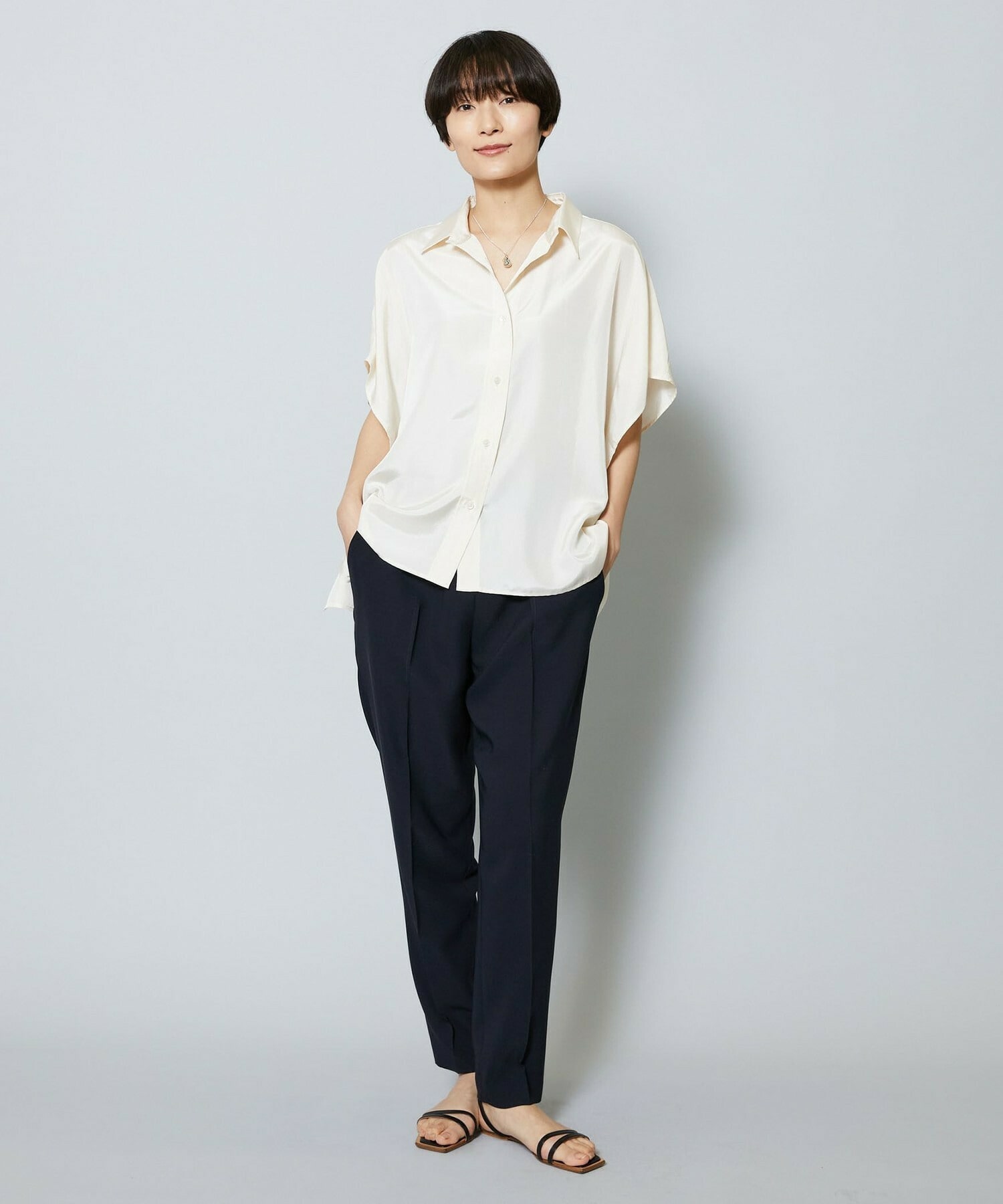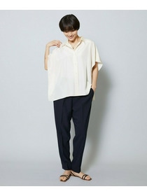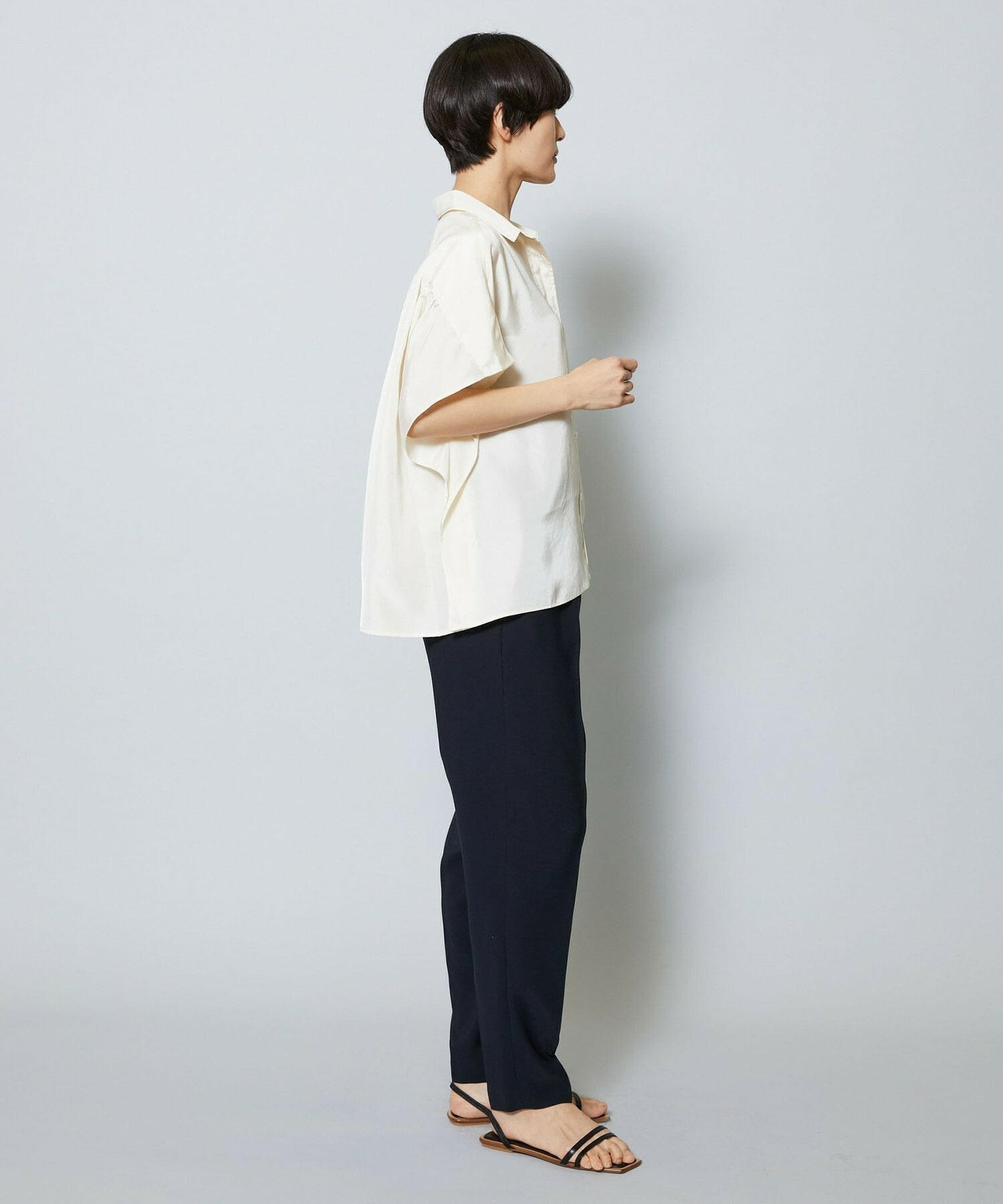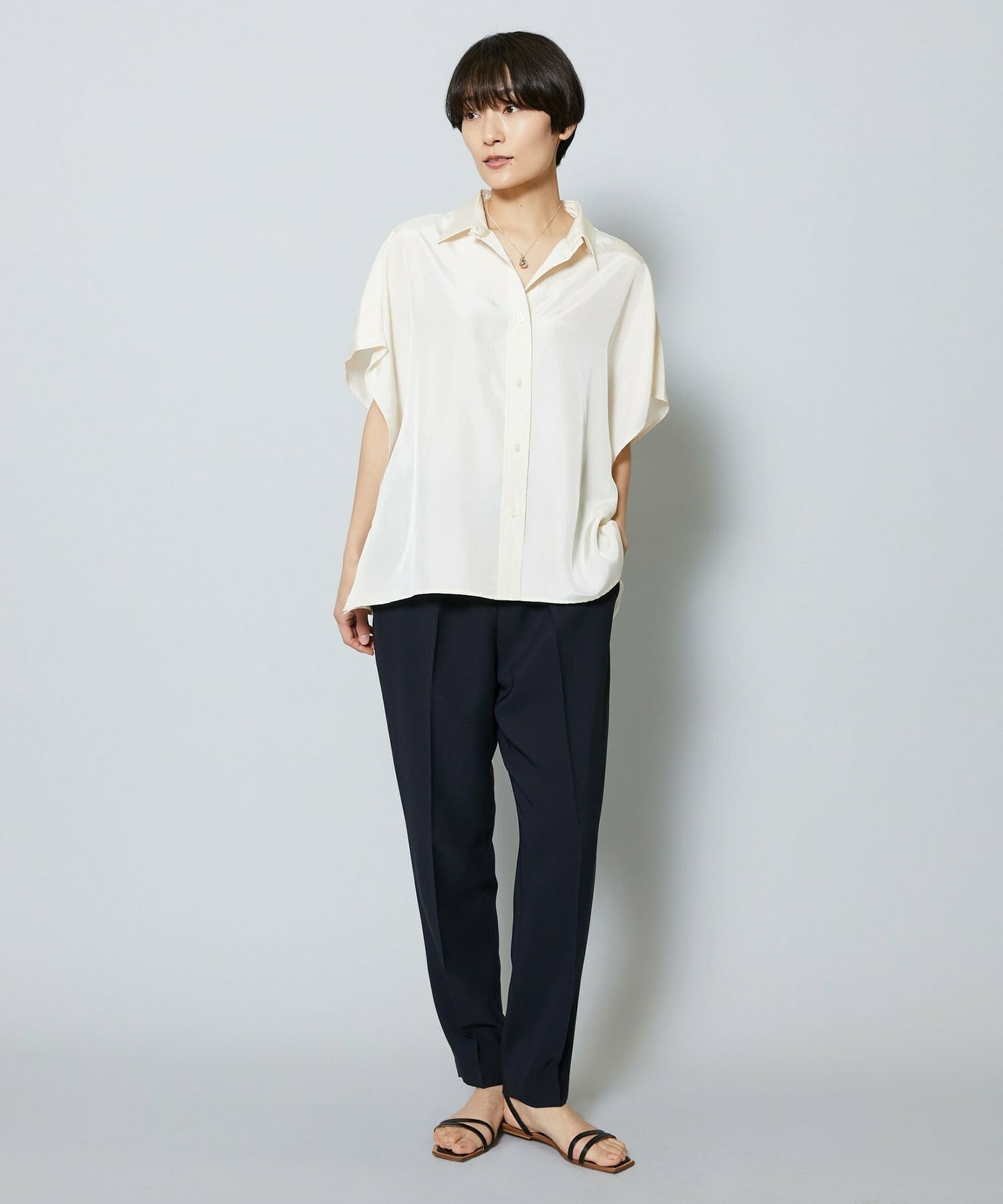 1枚着で映えるケープシャツです。暑い日にはサラッと羽織っていただけるアイテムです。二の腕を強調しないデザインになっており、アームホールがない設計なので汗染みも気になりにくいです。サイドにはケープならではのドレープ感がアクセントに。襟や前立てはしっかり決めているので、緩くなりすぎないキレイめな見え方です。