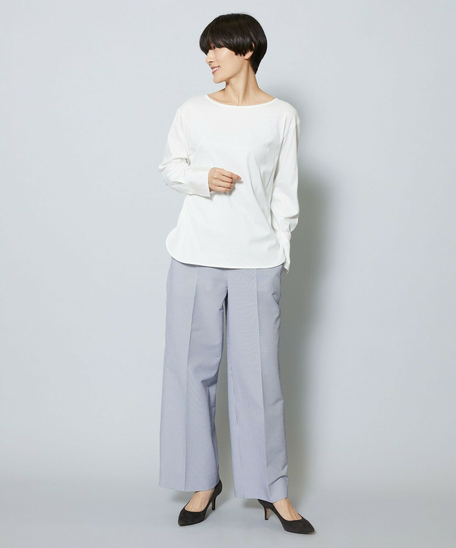 シーズンを問わないロングスリーブカットソーにシャツカフスのデザインを取り入れ、こちらも緩くなりすぎず、キレイめなアクセントになっています。1枚でも、もちろんジャケットやブルゾンを合わせてもらっても、袖口から覗くカフスが、きちんと感を演出します。
