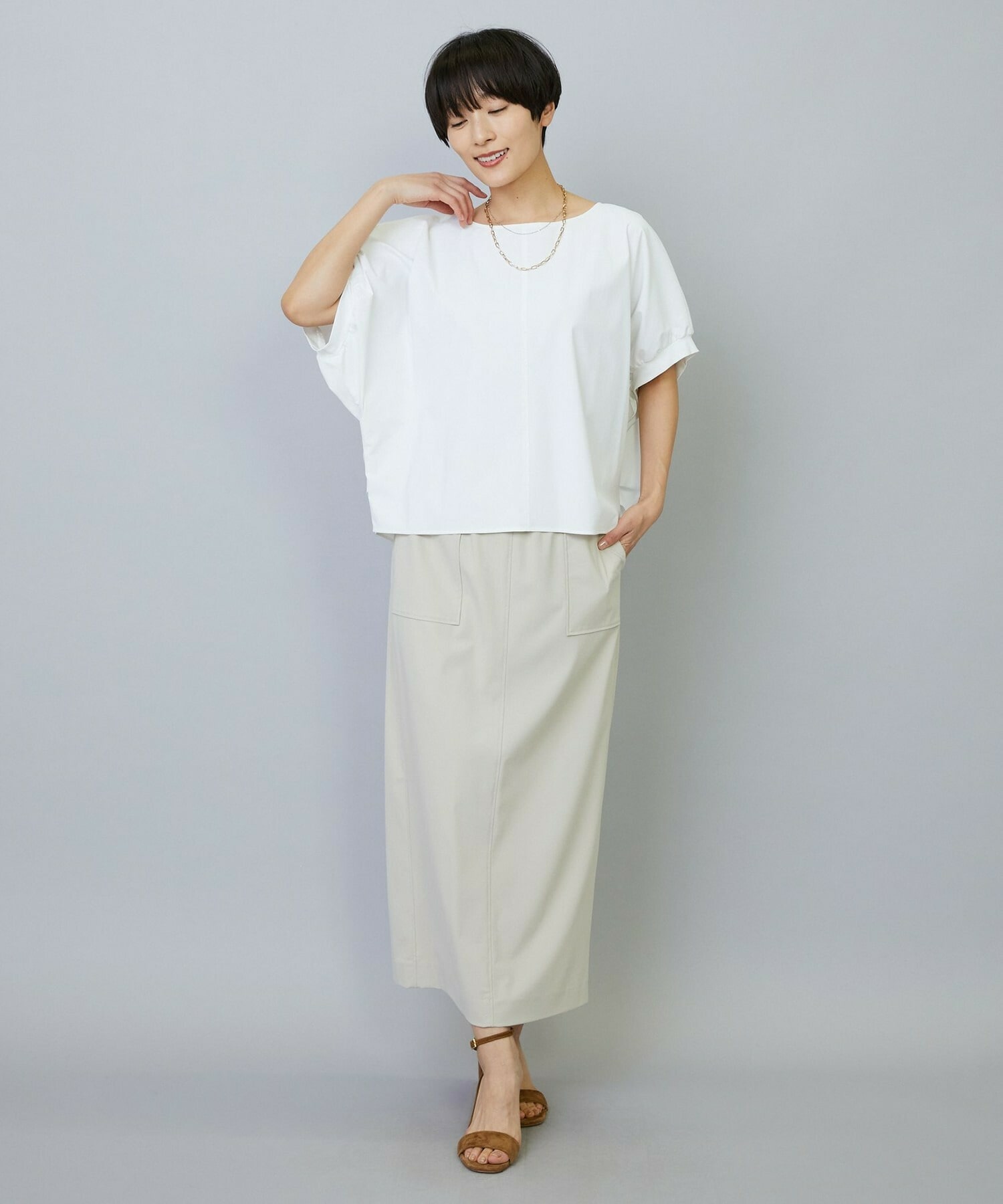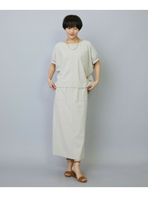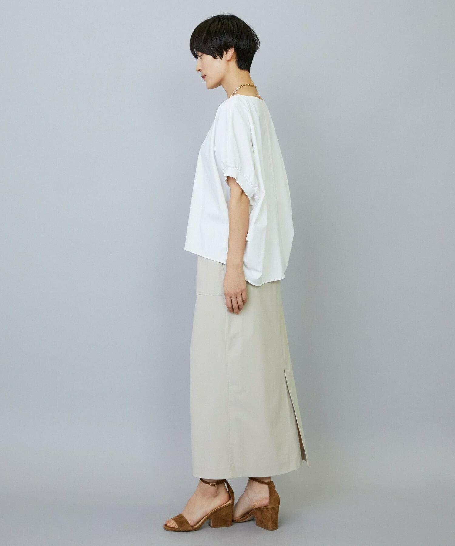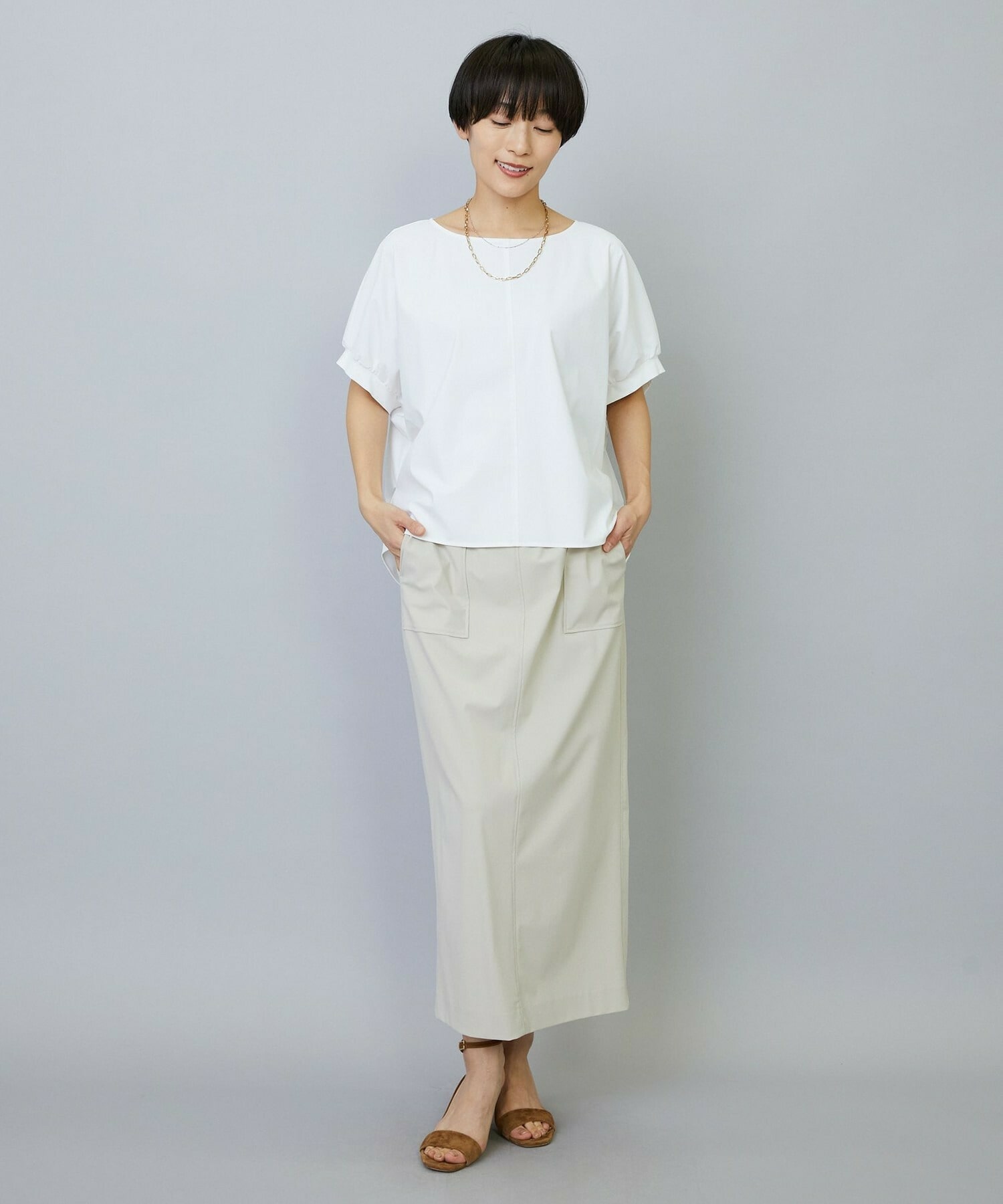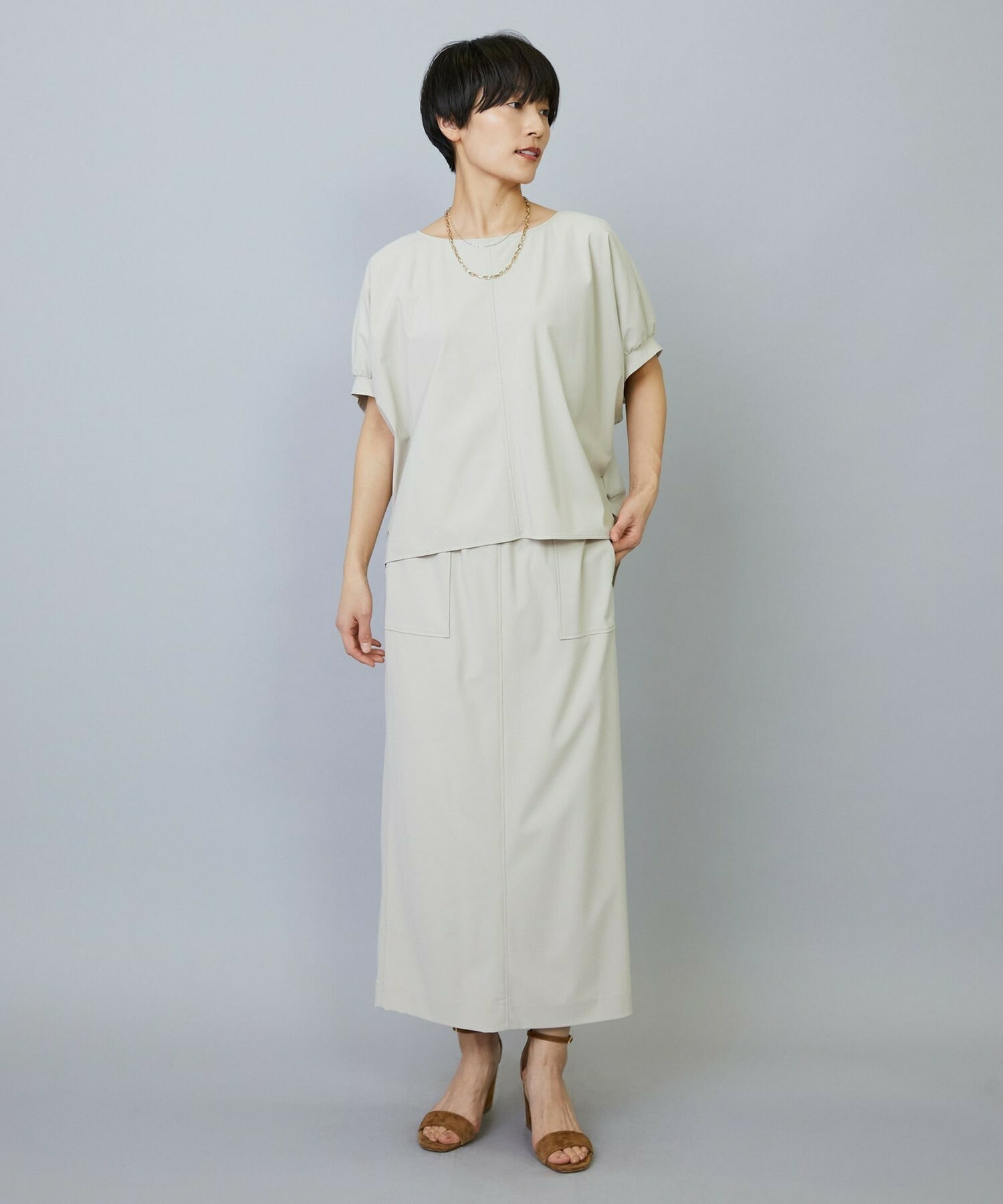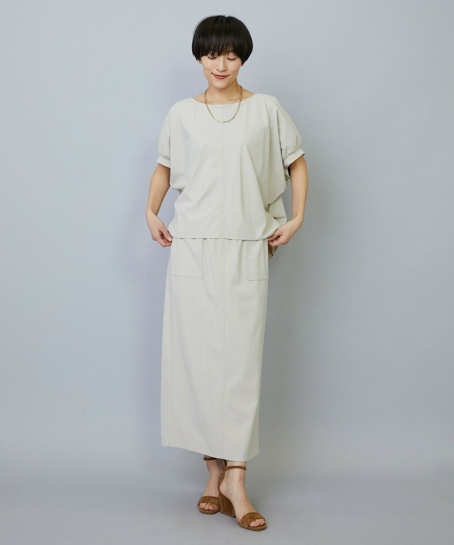 アウトポケットとステッチでディティールとアクセントを加えたタイトなIラインスカート。スッキリとしたラインなので同素材のショートトップスのボリューム感とバランスよく着ていただけます。