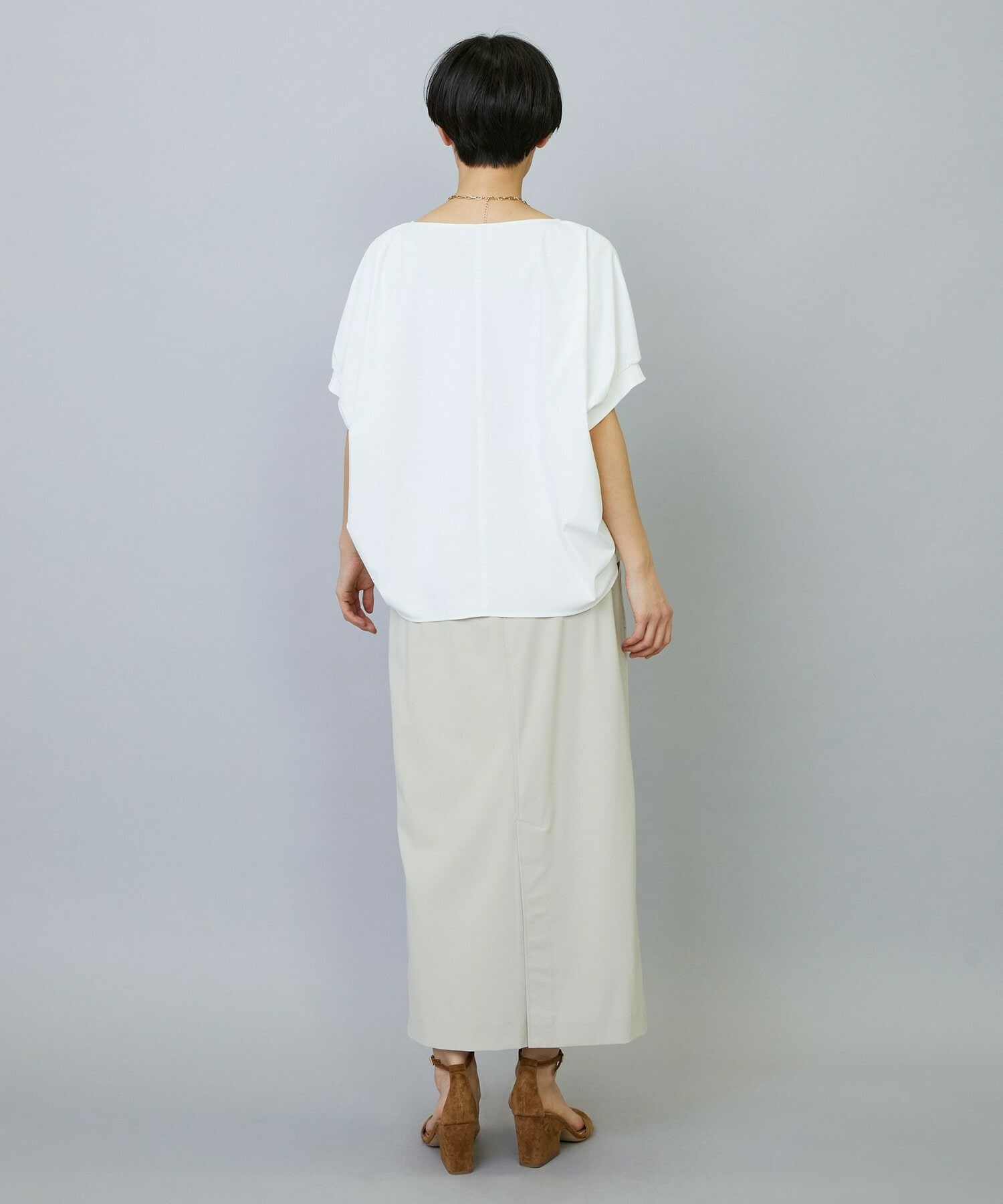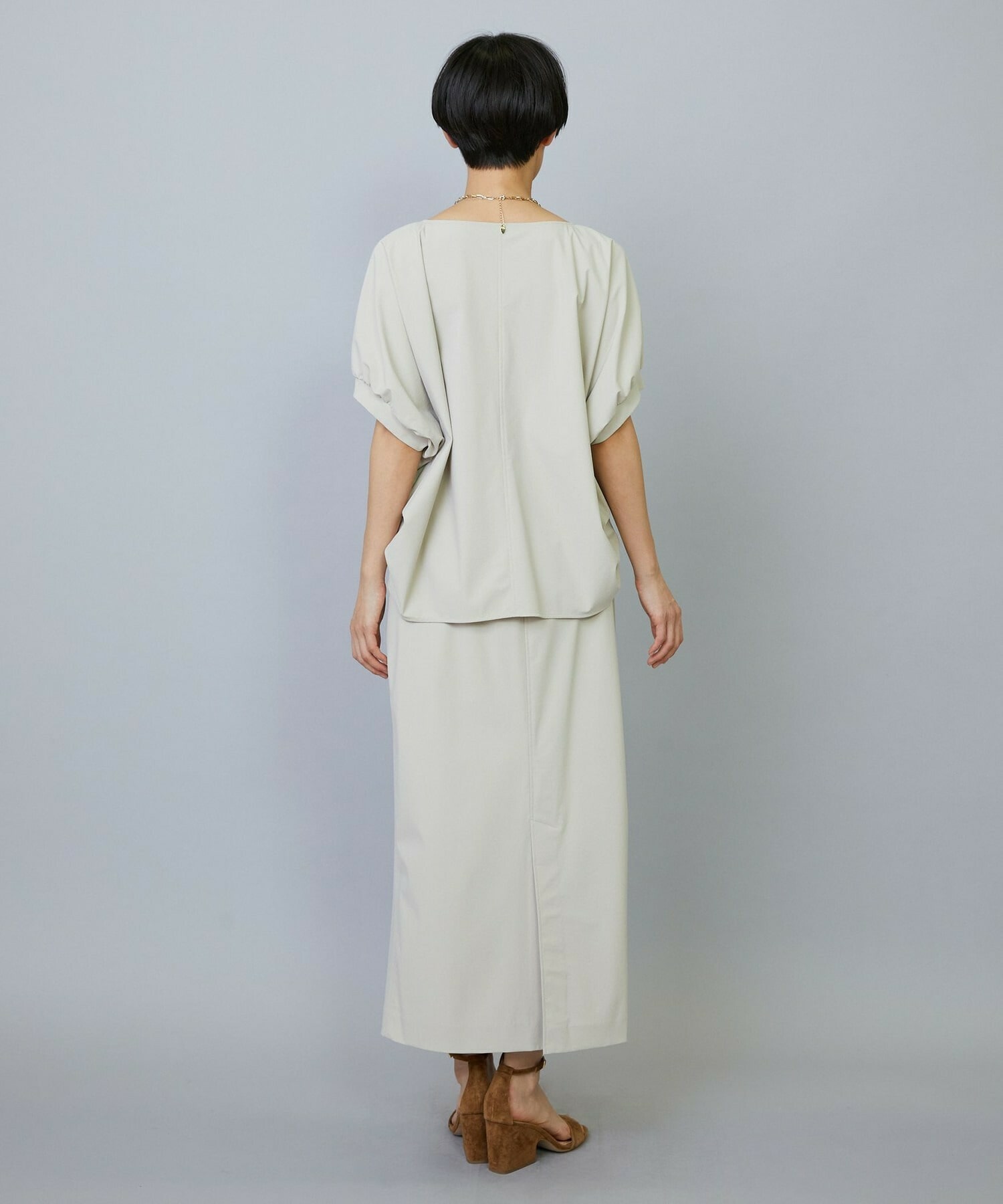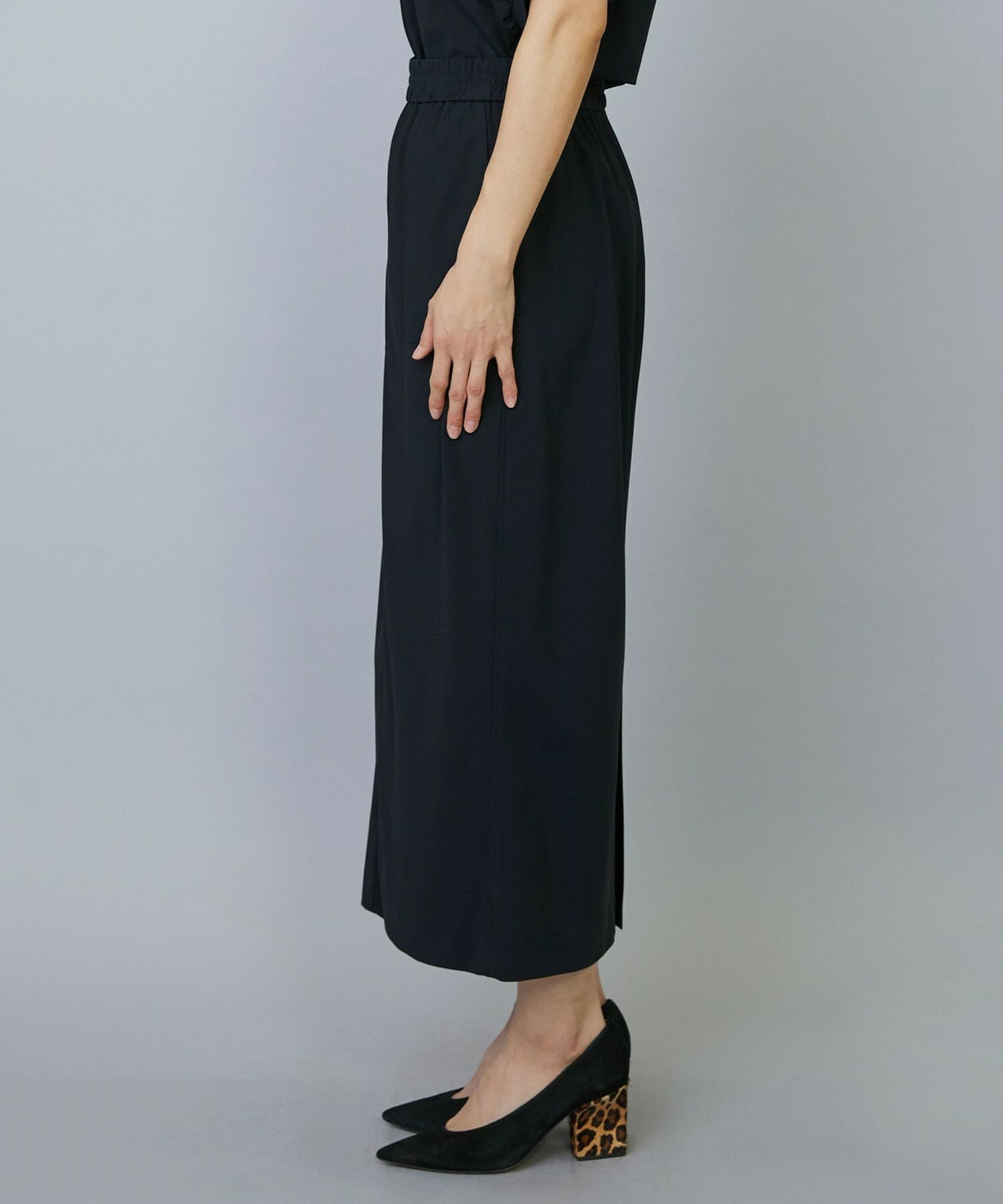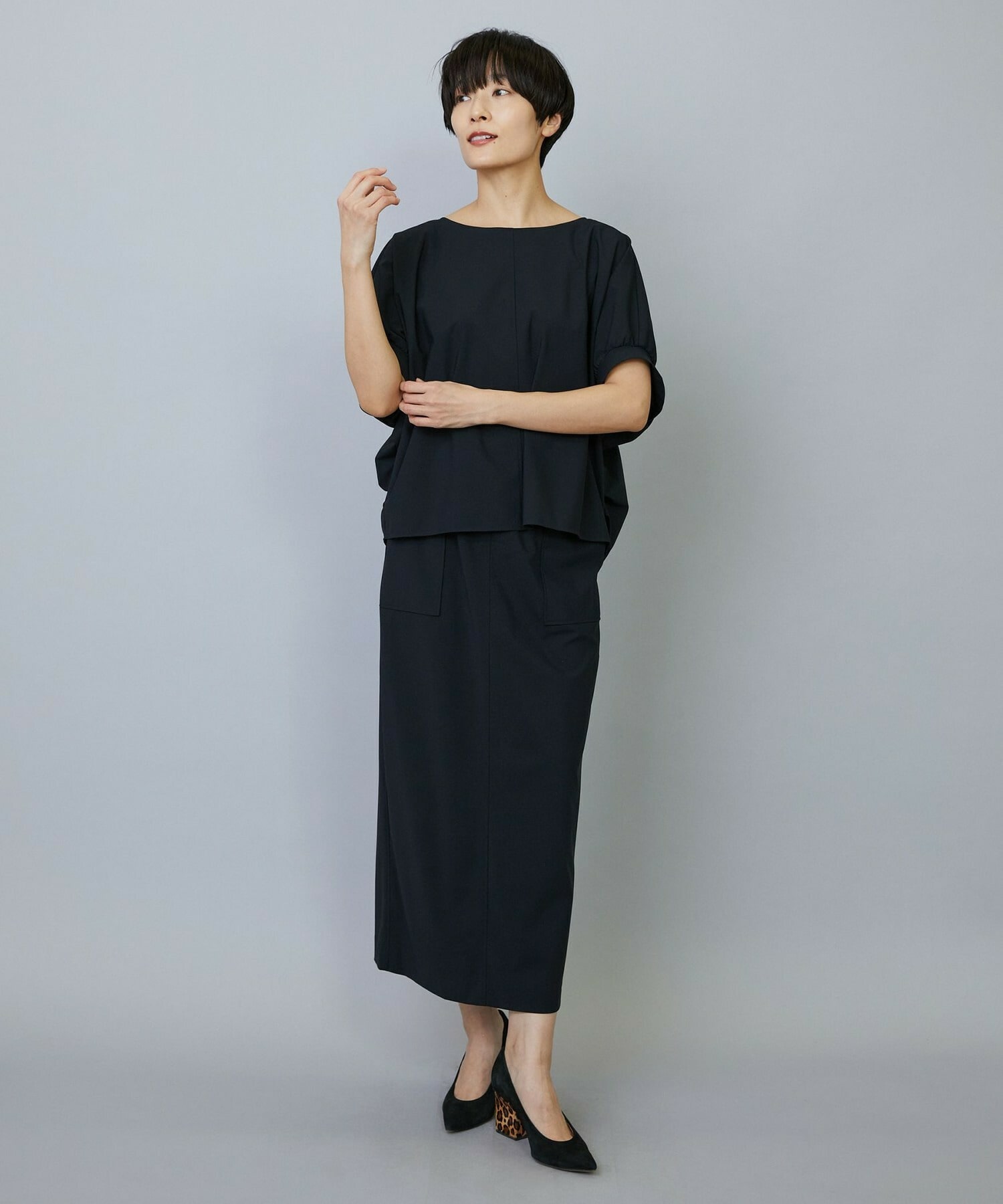 アウトポケットとステッチでディティールとアクセントを加えたタイトなIラインスカート。スッキリとしたラインなので同素材のショートトップスのボリューム感とバランスよく着ていただけます。