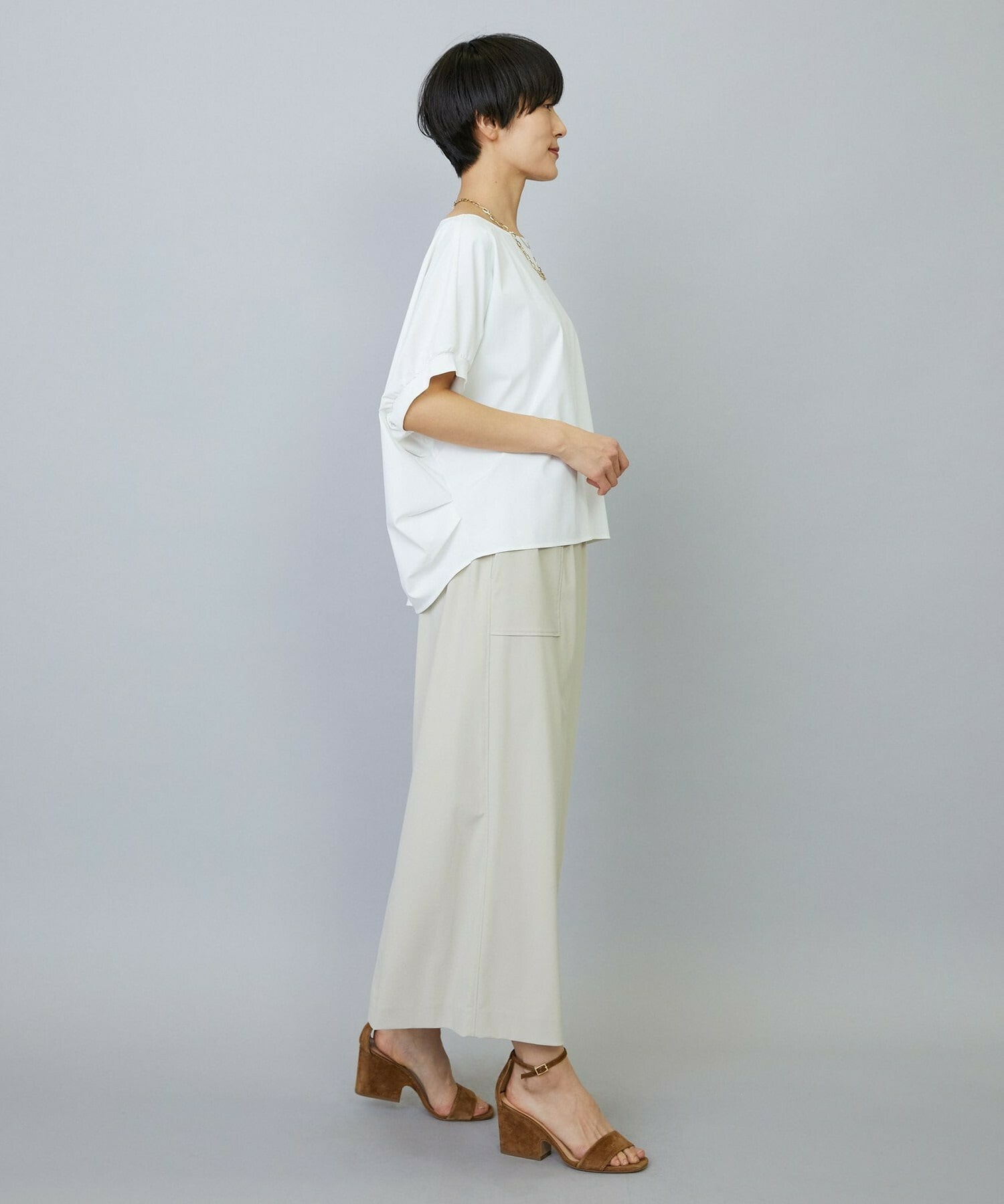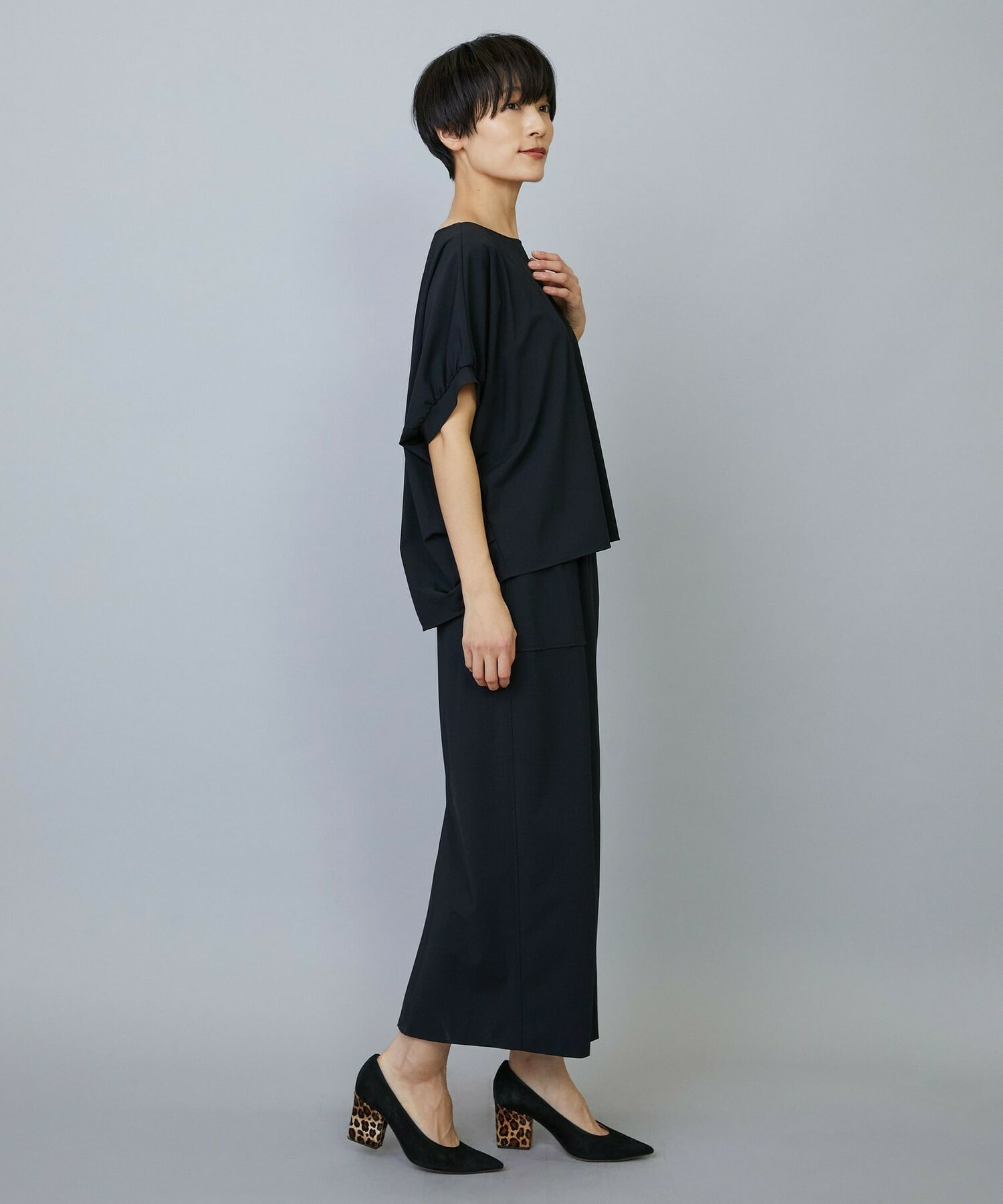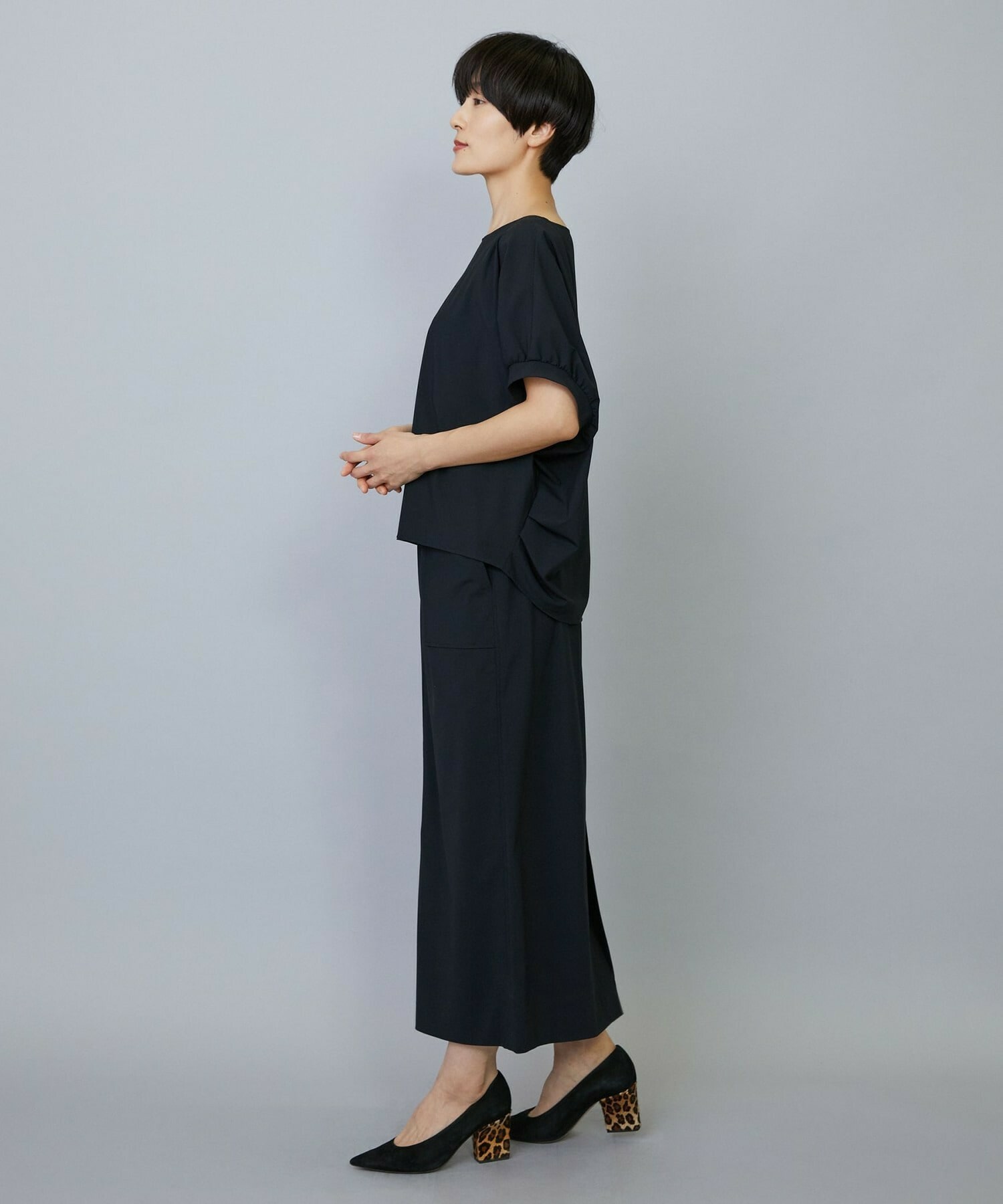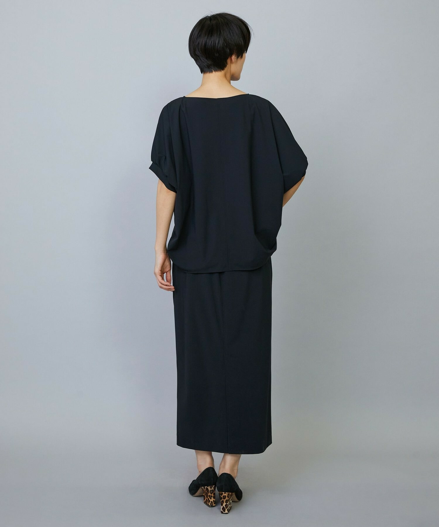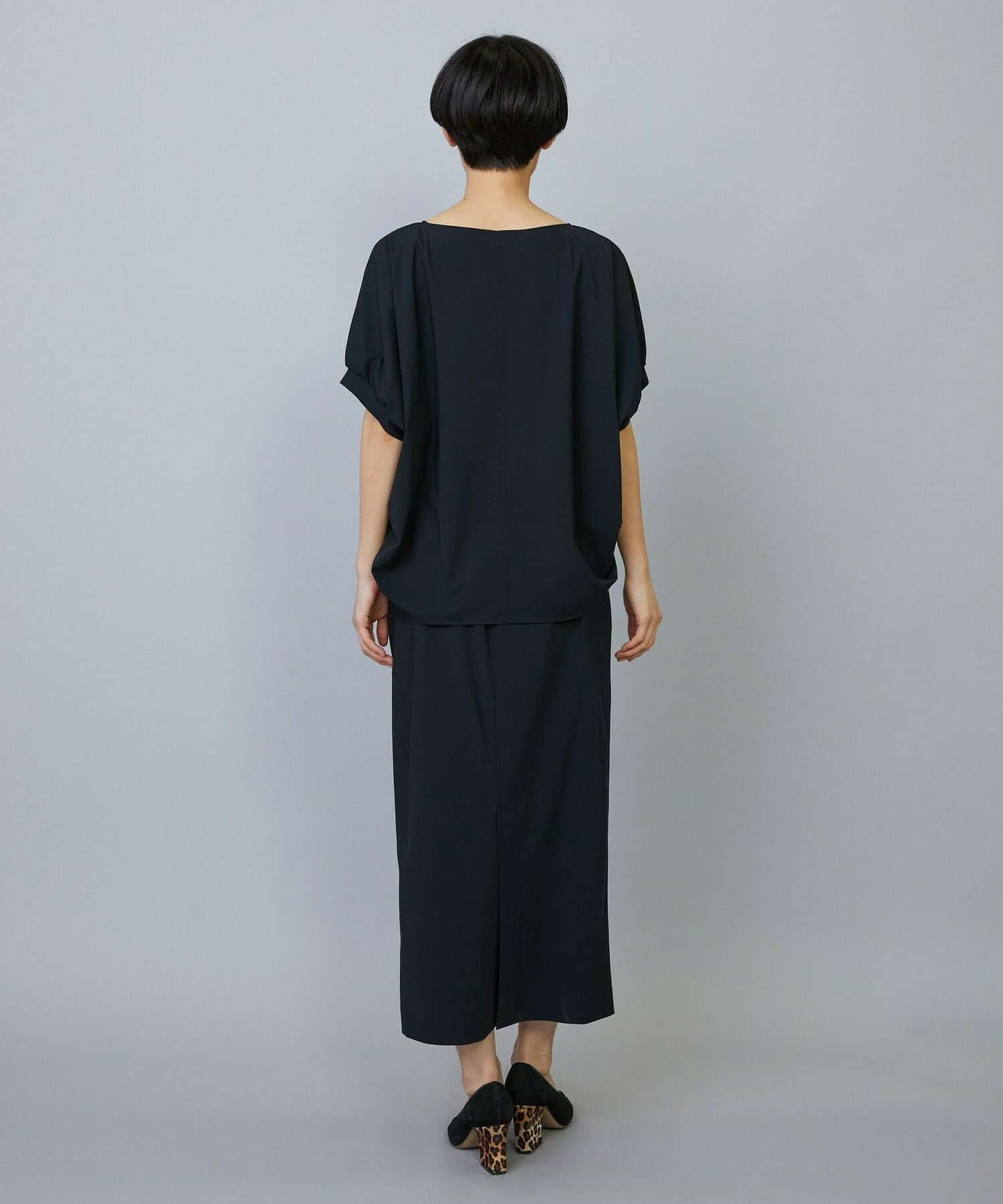 アウトポケットとステッチでディティールとアクセントを加えたタイトなIラインスカート。スッキリとしたラインなので同素材のショートトップスのボリューム感とバランスよく着ていただけます。