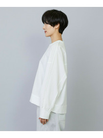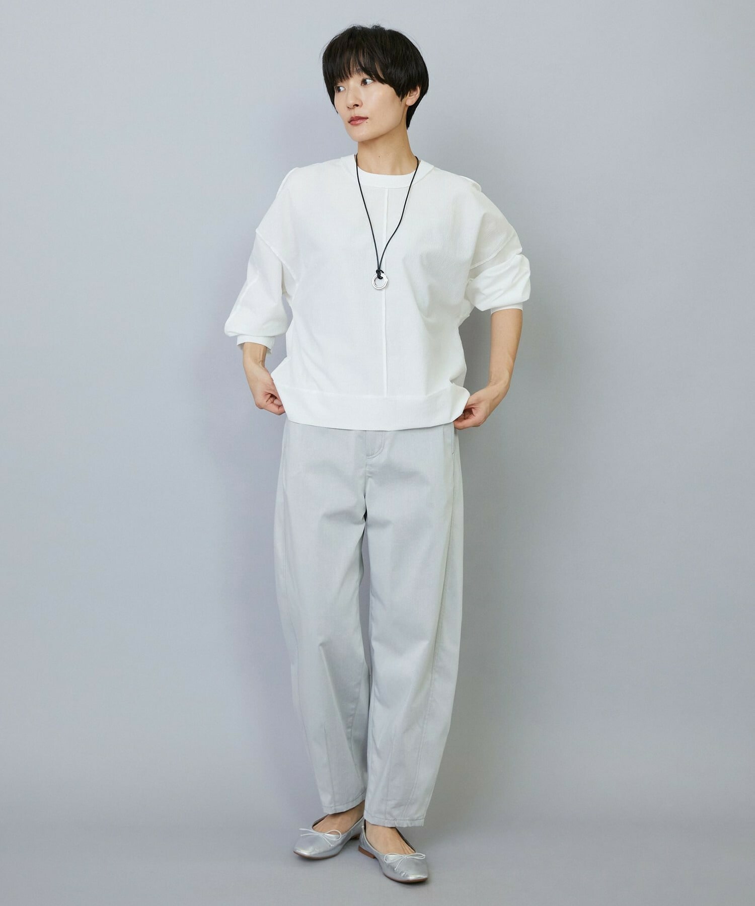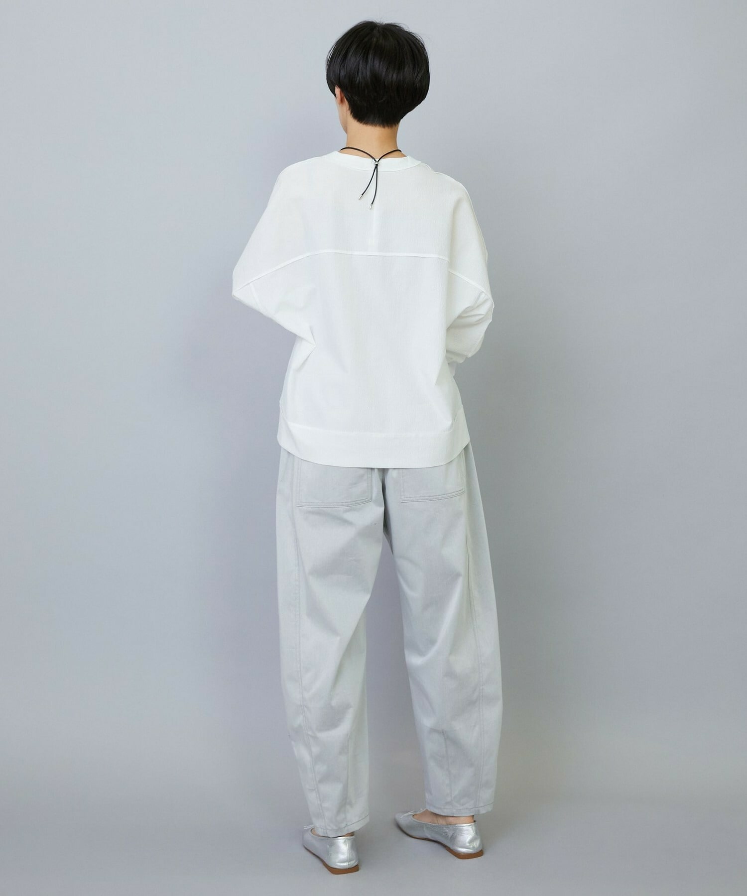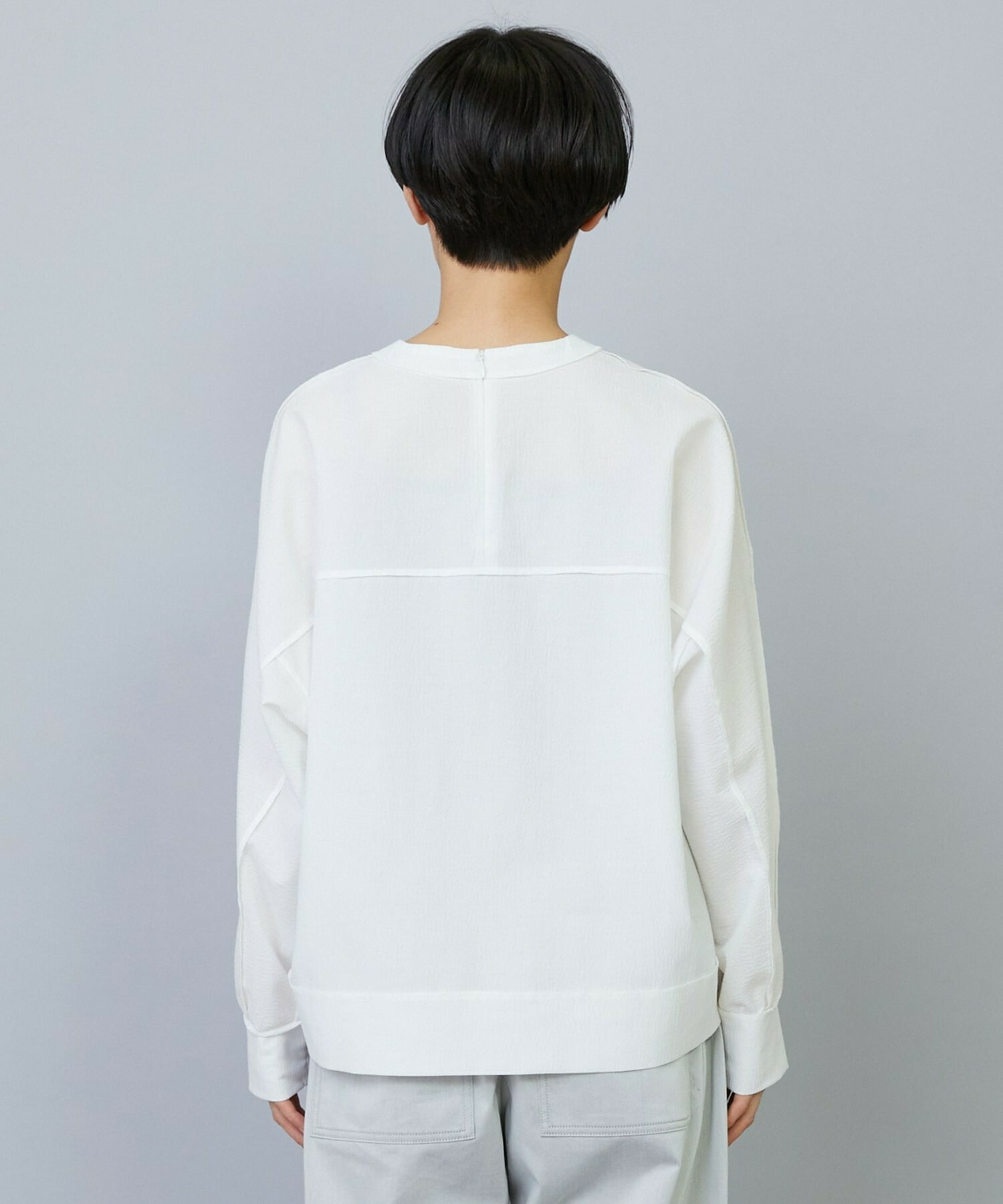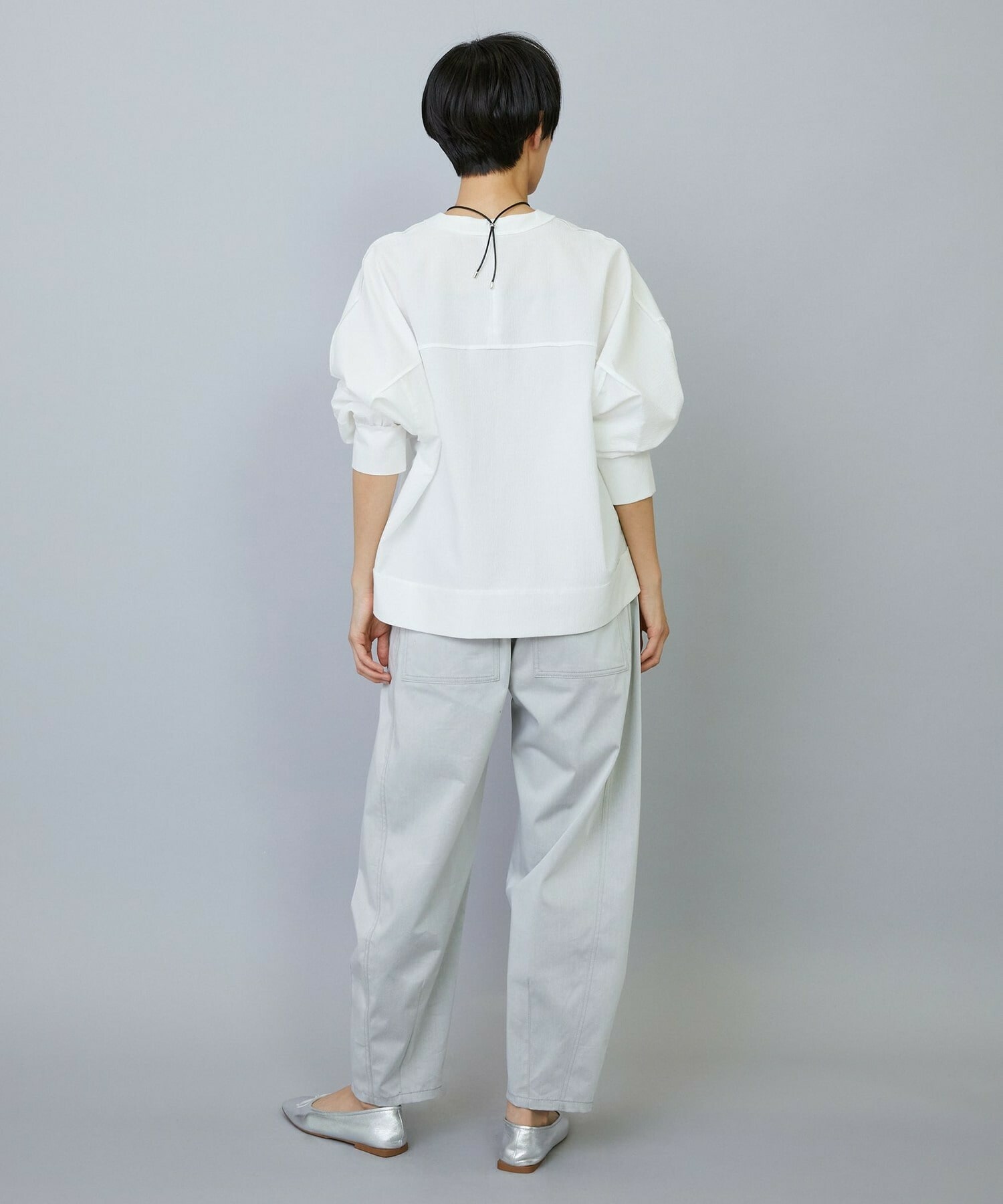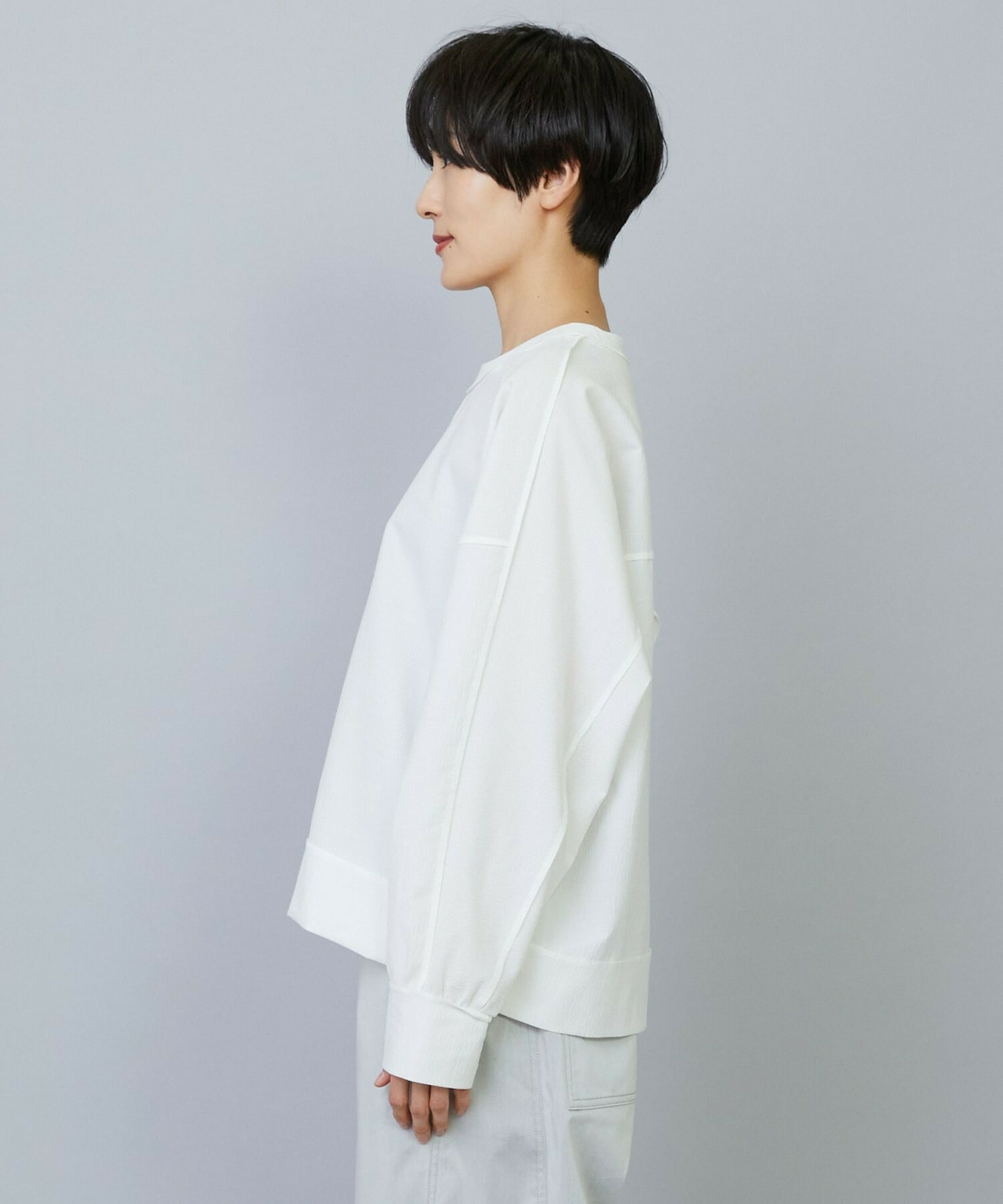 切り替え部分の縫い代をあえて表に出し、飾りステッチでアクセントを効かせたフォルムトップス。後ろのドルマンラインから袖に変形の切り替えを入れ、バックフォルムを出しています。パンツにもスカートにも合わせやすい万能トップスです。