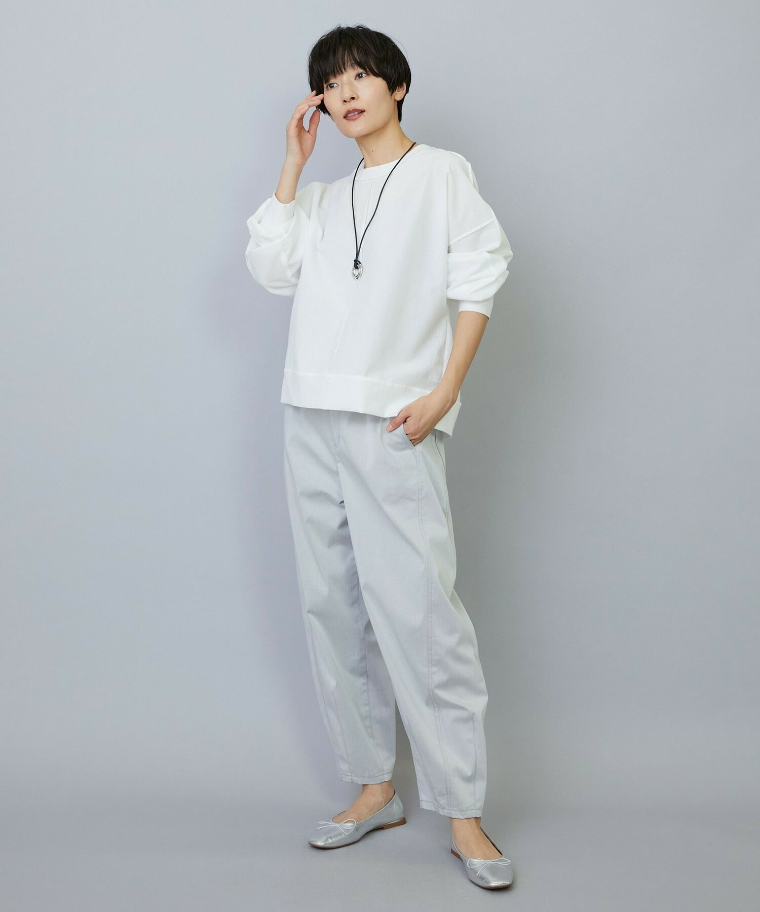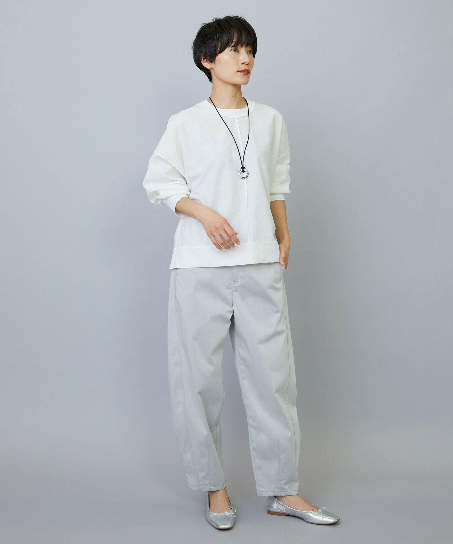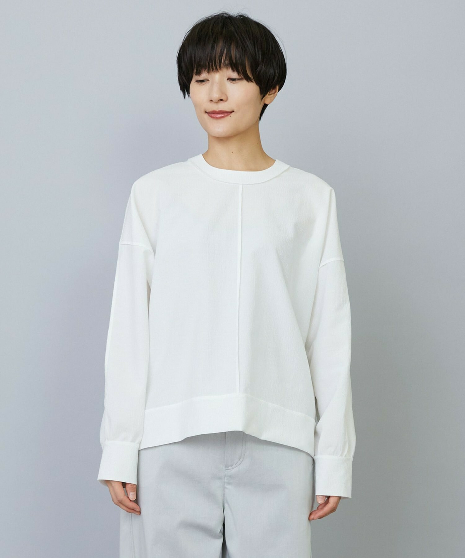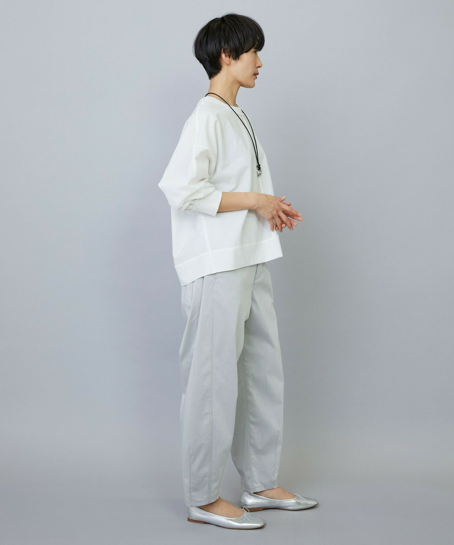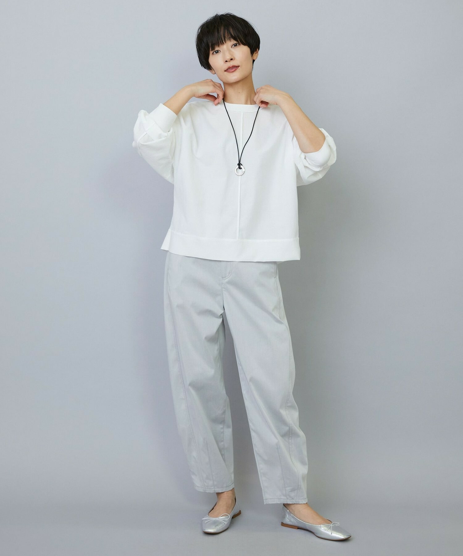 切り替え部分の縫い代をあえて表に出し、飾りステッチでアクセントを効かせたフォルムトップス。後ろのドルマンラインから袖に変形の切り替えを入れ、バックフォルムを出しています。パンツにもスカートにも合わせやすい万能トップスです。