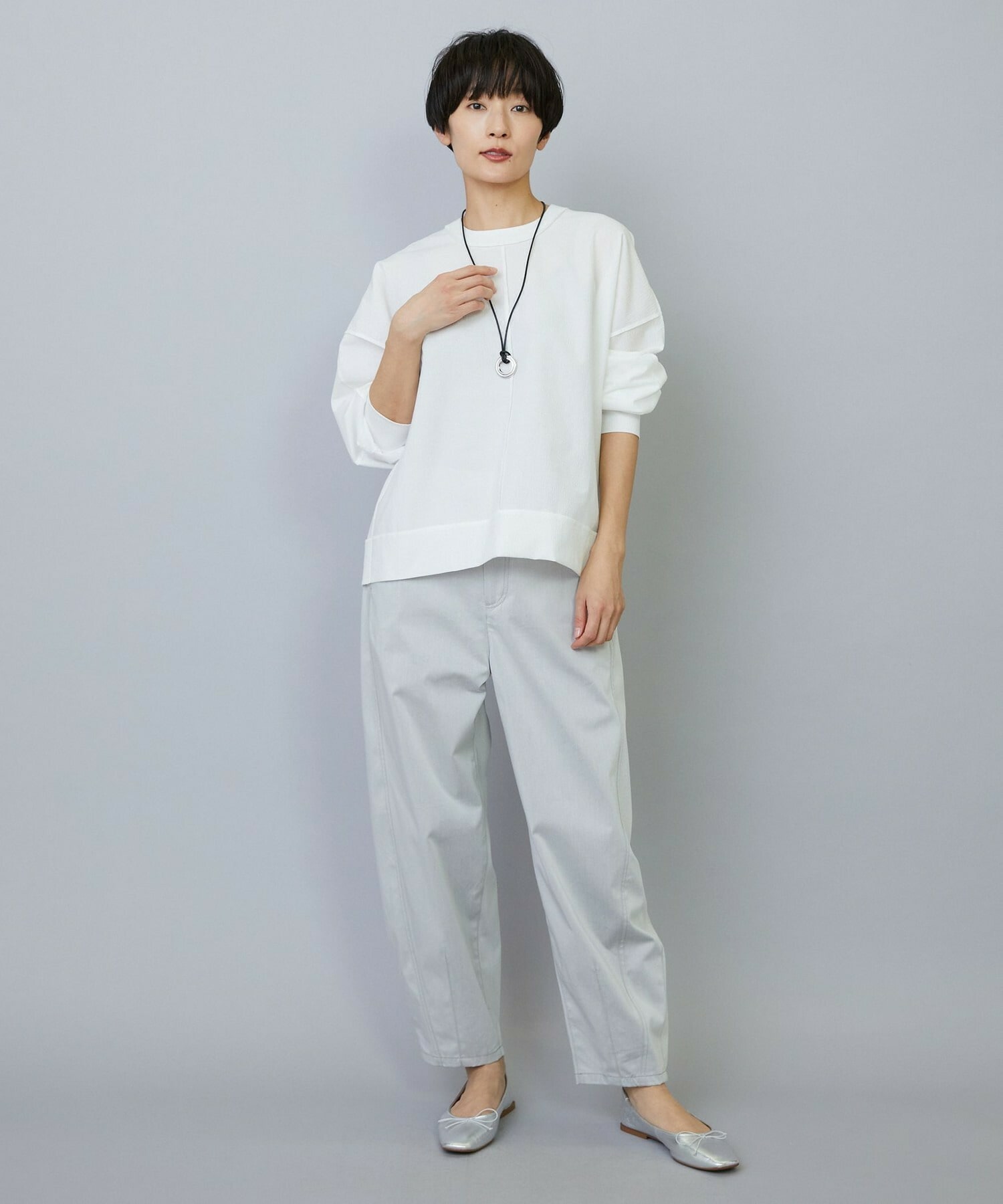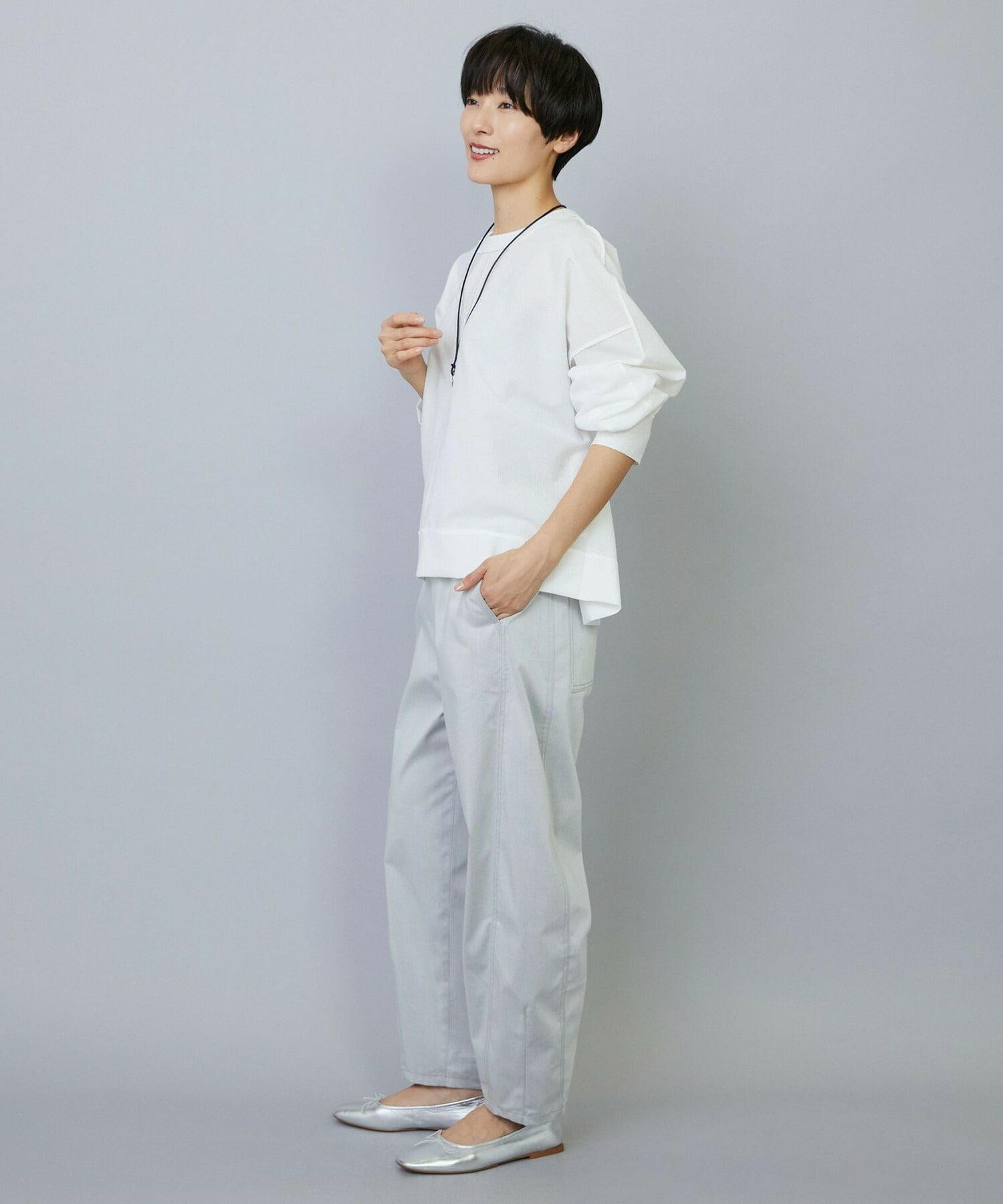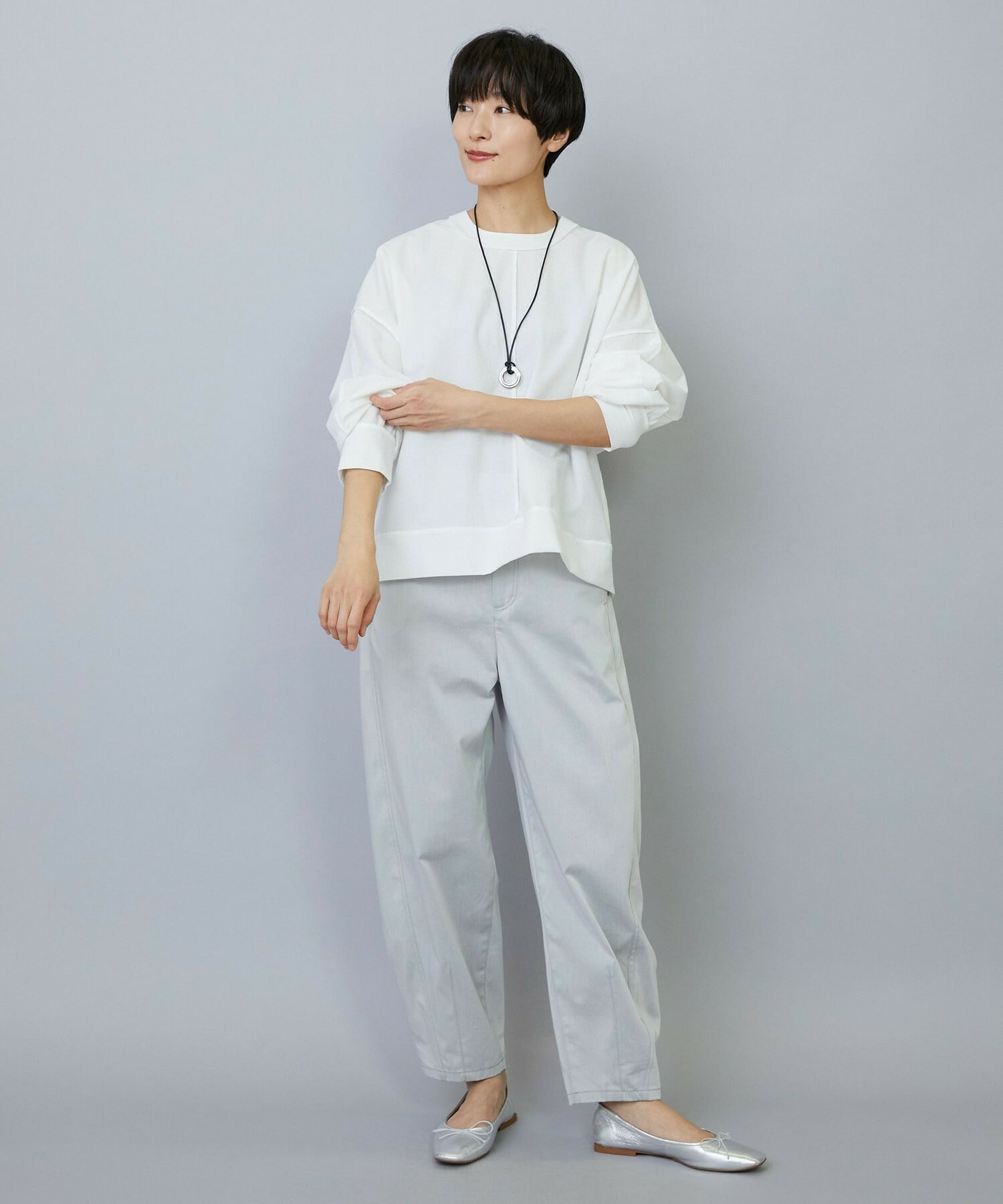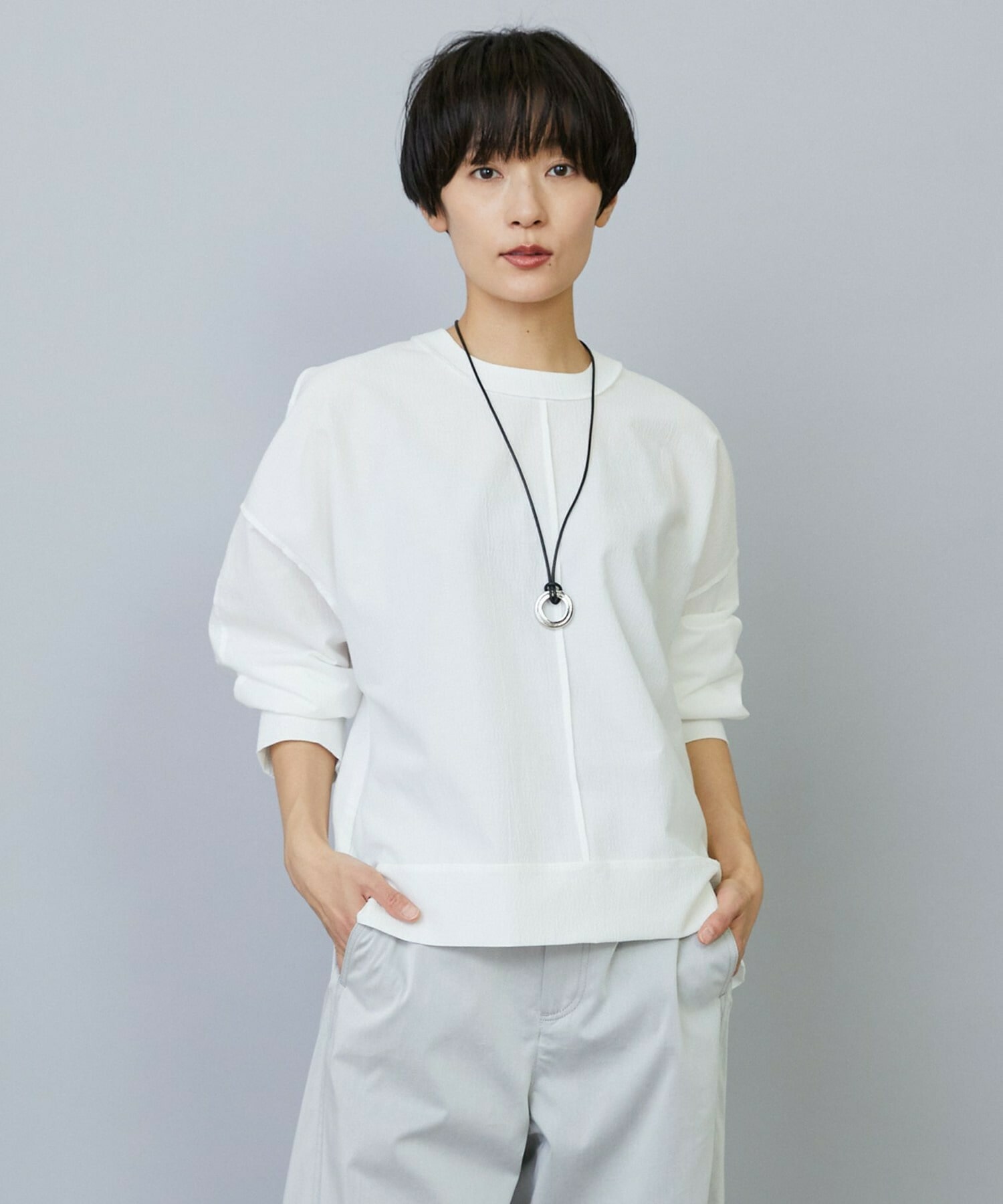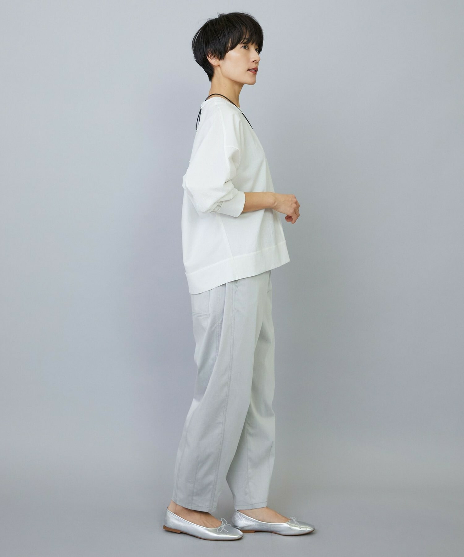 切り替え部分の縫い代をあえて表に出し、飾りステッチでアクセントを効かせたフォルムトップス。後ろのドルマンラインから袖に変形の切り替えを入れ、バックフォルムを出しています。パンツにもスカートにも合わせやすい万能トップスです。