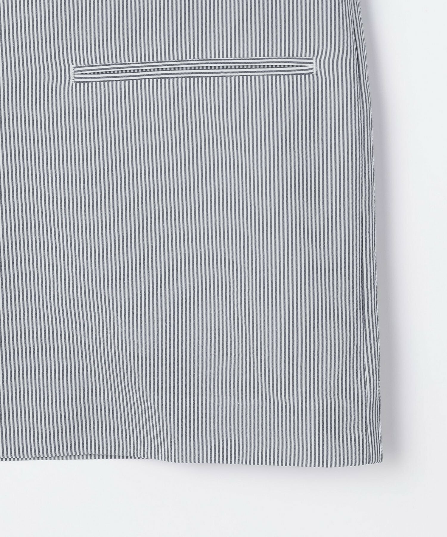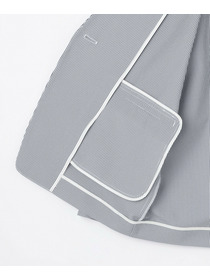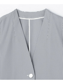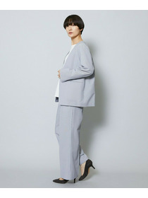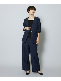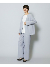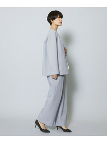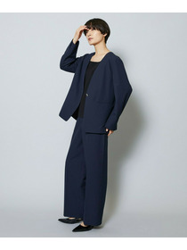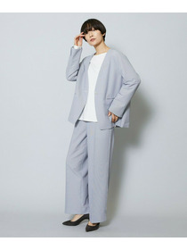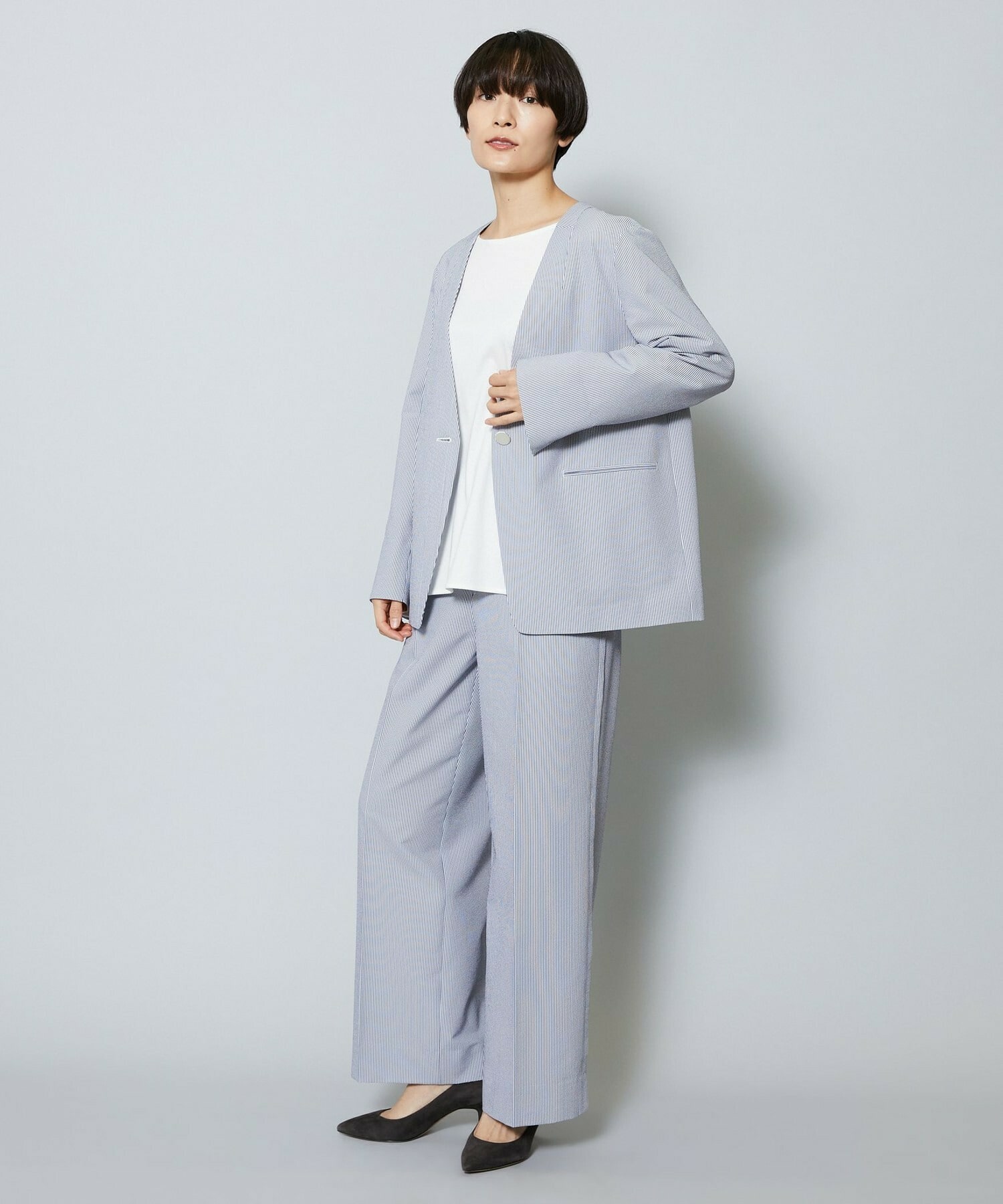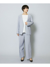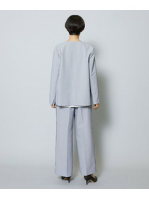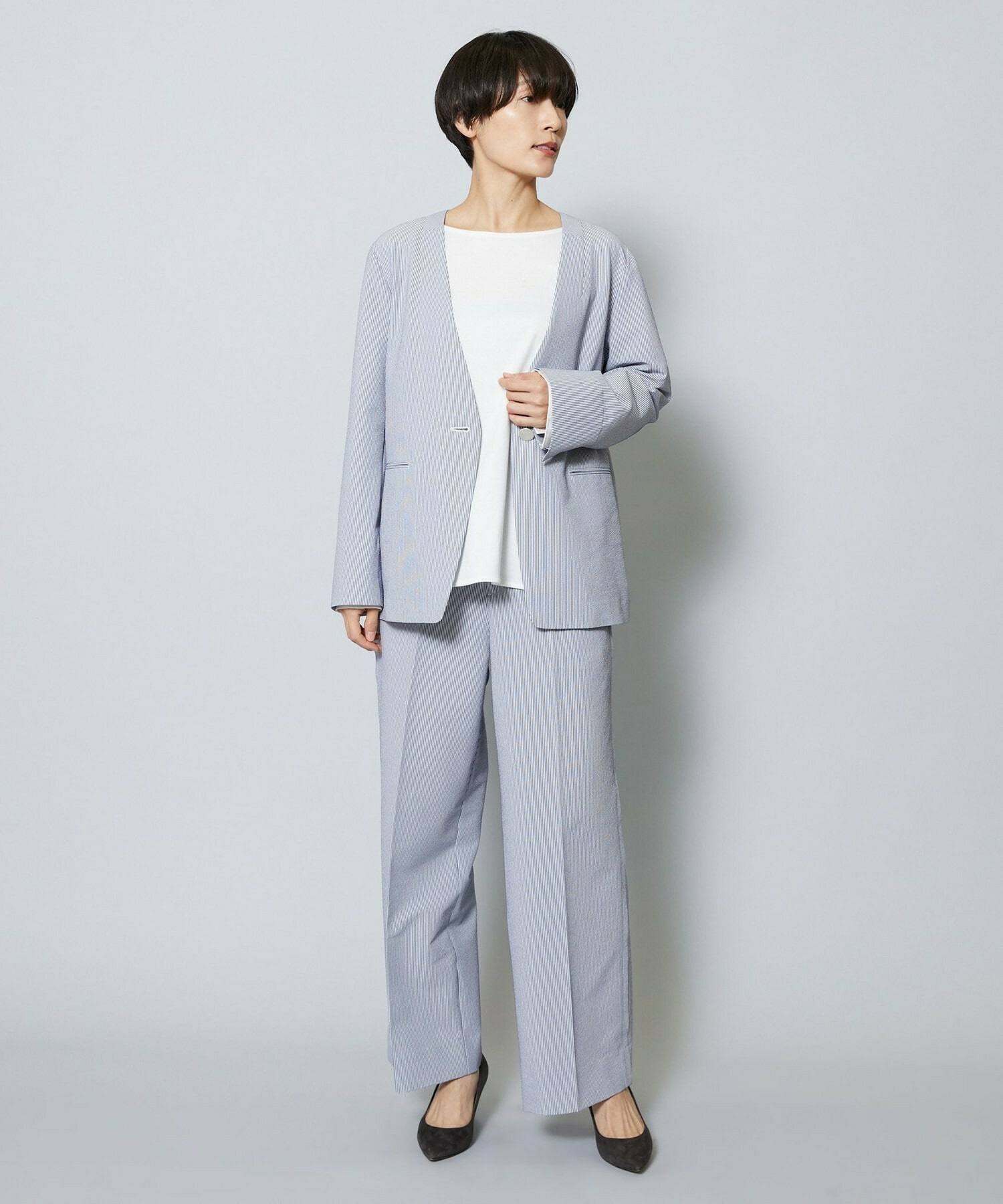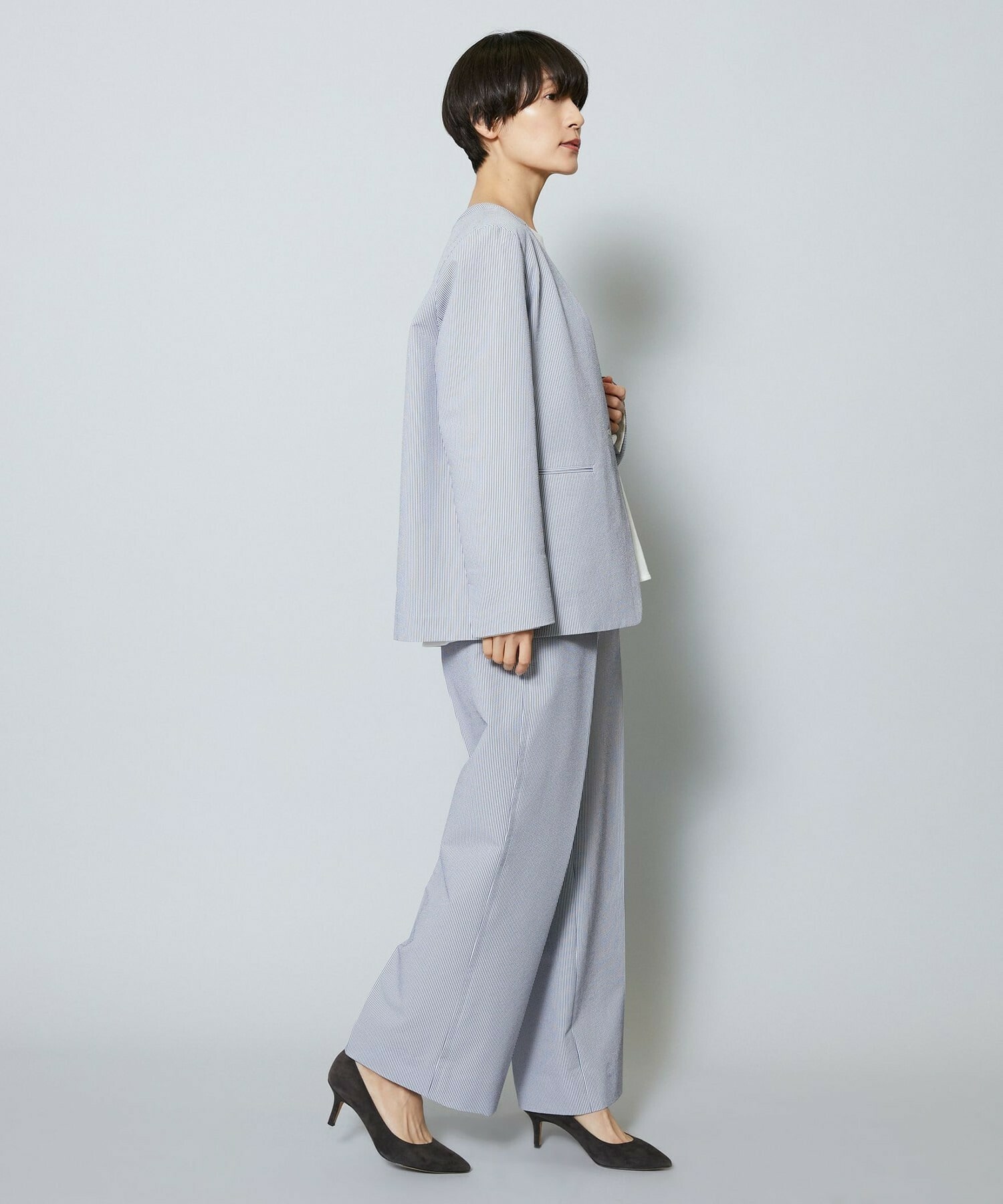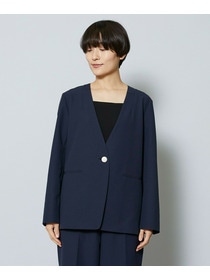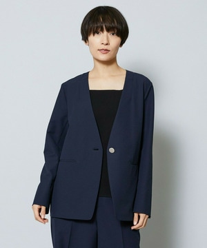 スッキリとしたノーカラーのジャケットは、生地の柄感を活かした衿元の切り替えとダーツで変化を付けています。程良く体離れするボックスシルエットで、Tシャツやタンクなどの軽めのカットソーとの合わせでラフに着用していただくのがオススメです。