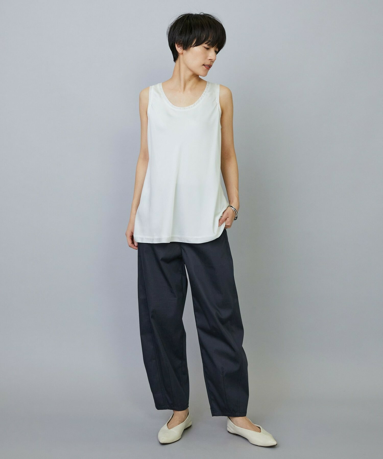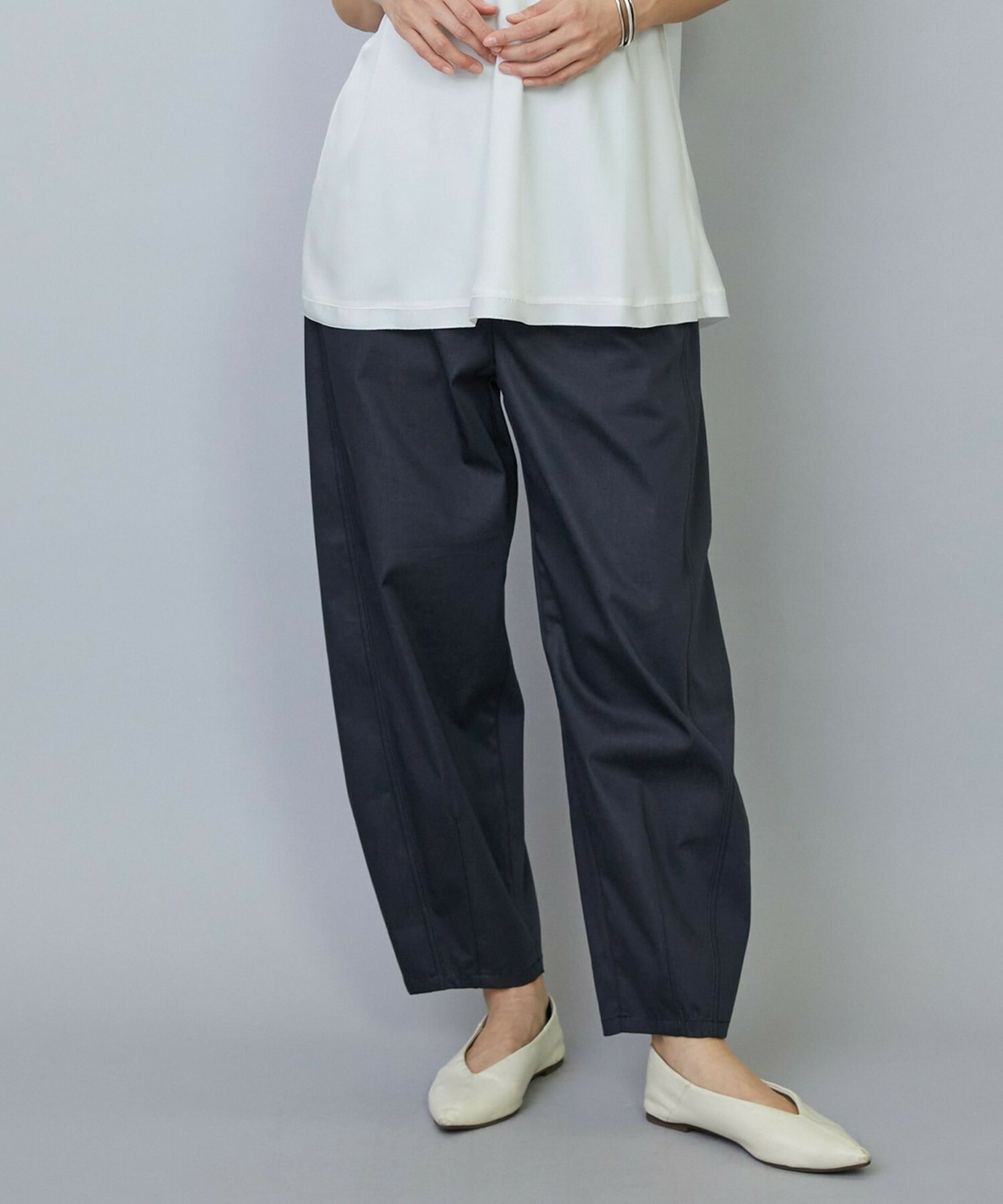 今シーズン提案型のバレルシルエットのパンツ。