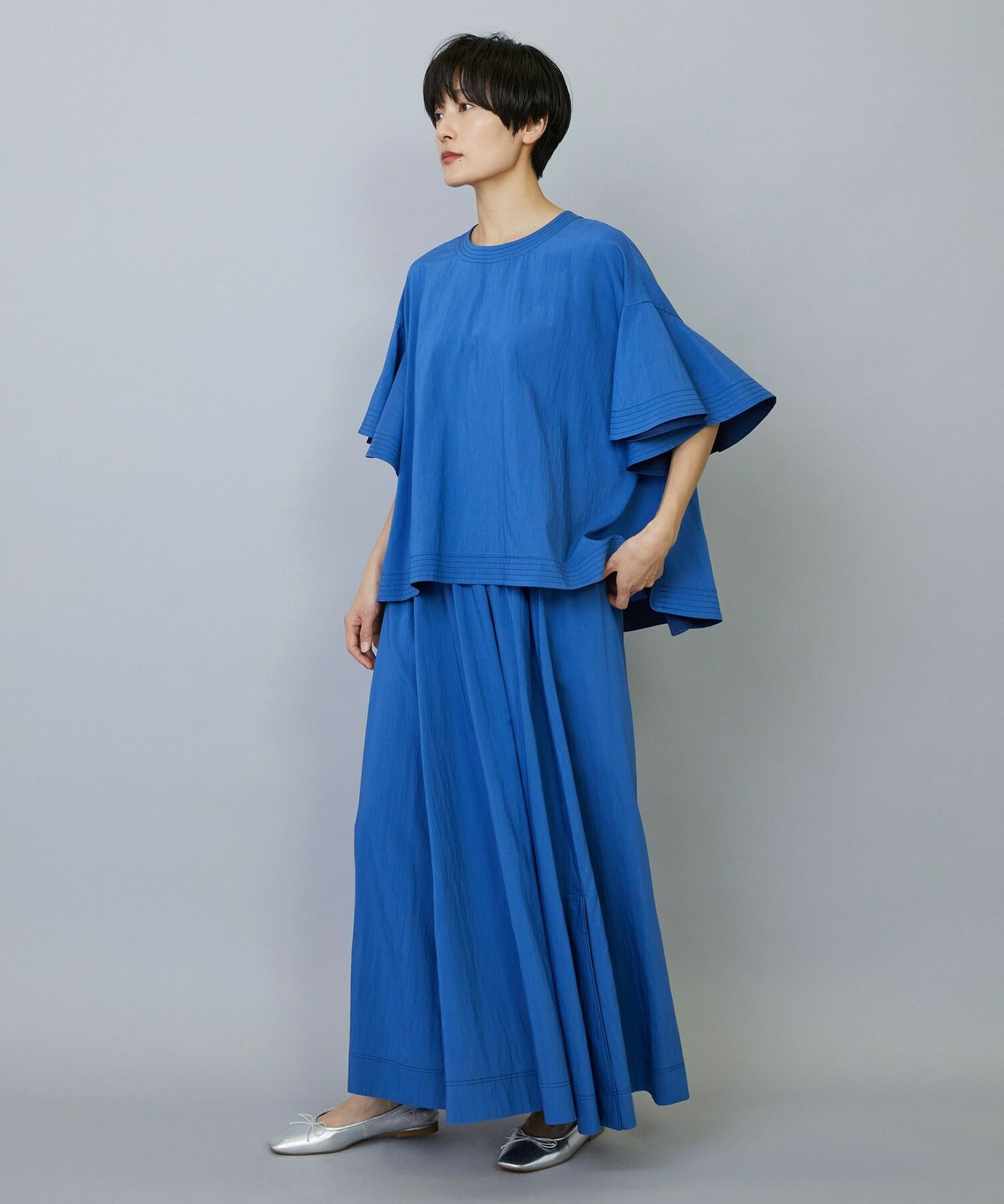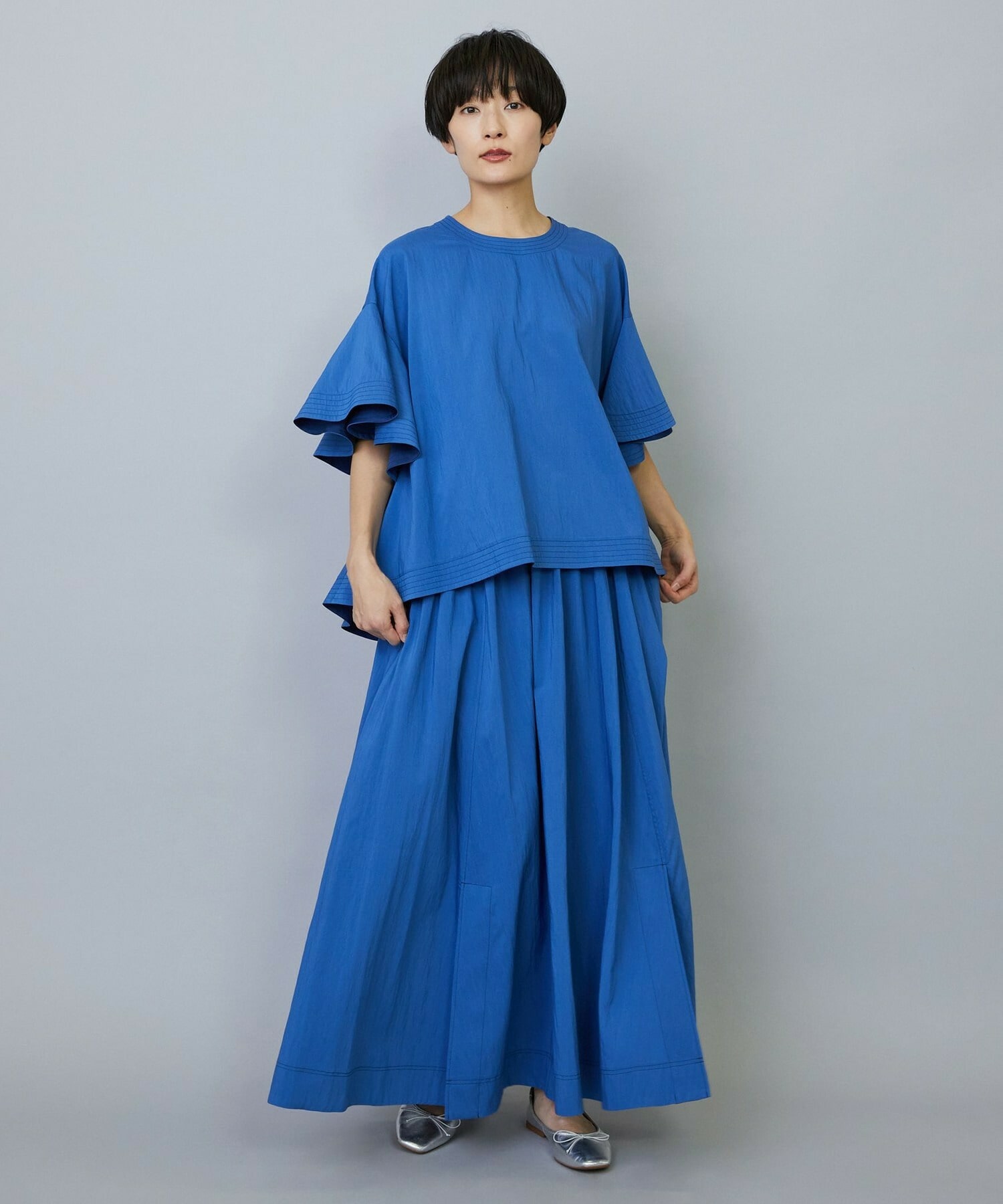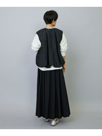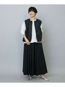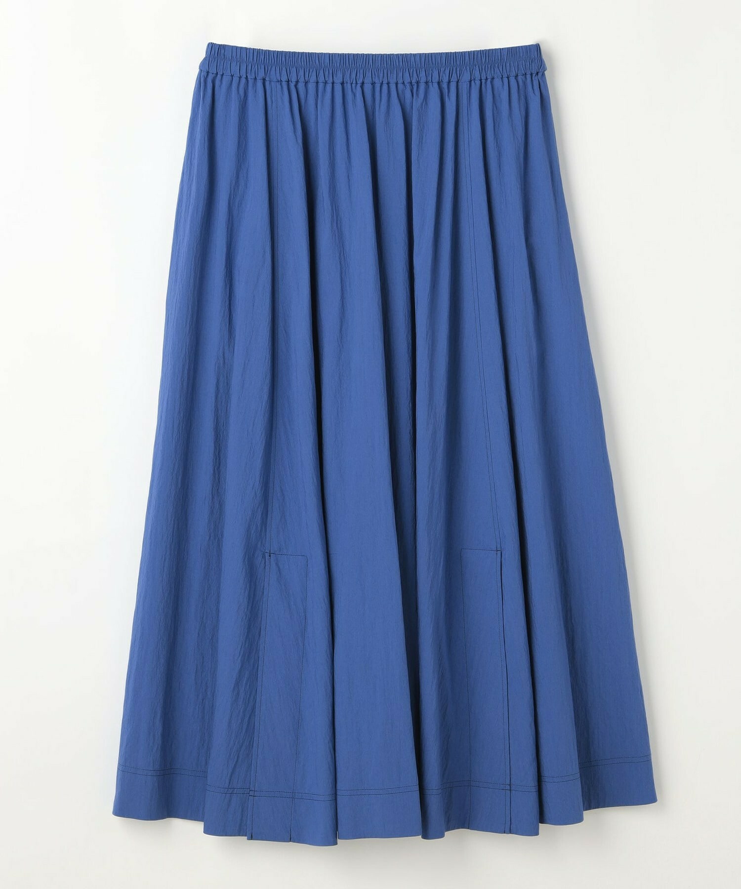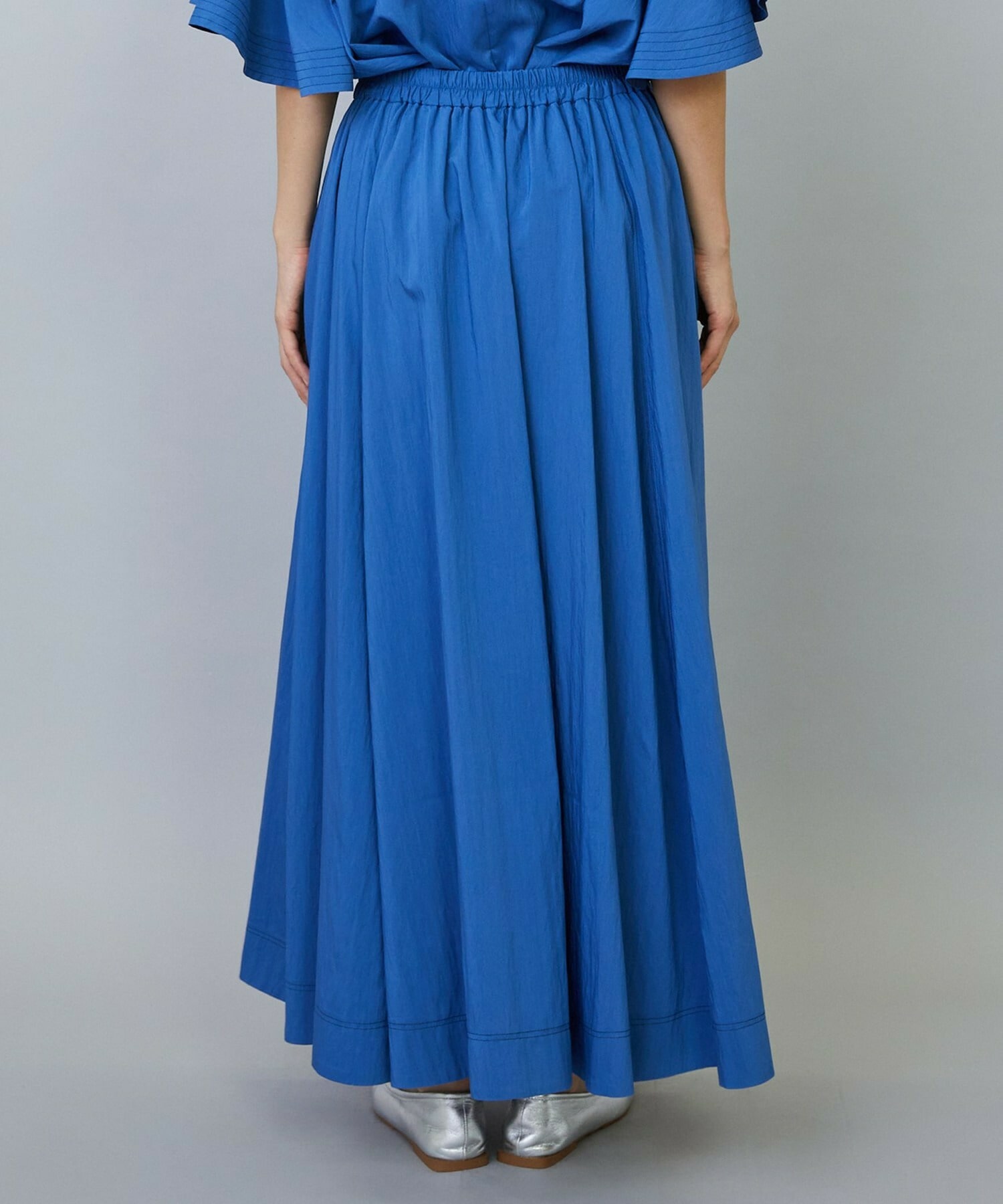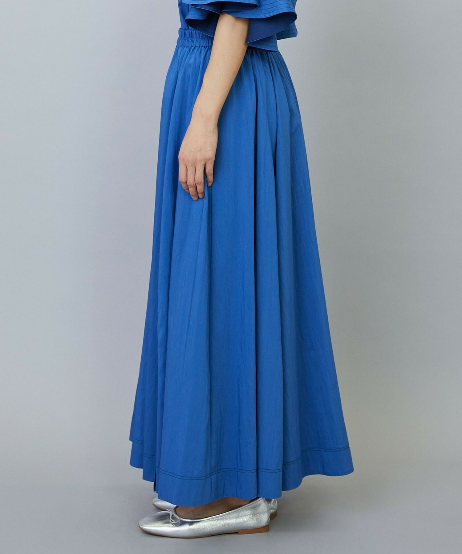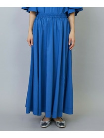 ウエストからギャザーと裾に向けてたっぷり入ったフレアー分量がしなやかで女性らしいロングスカート。