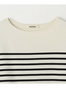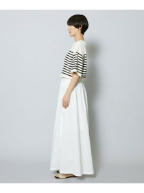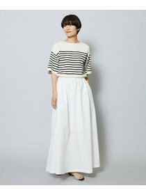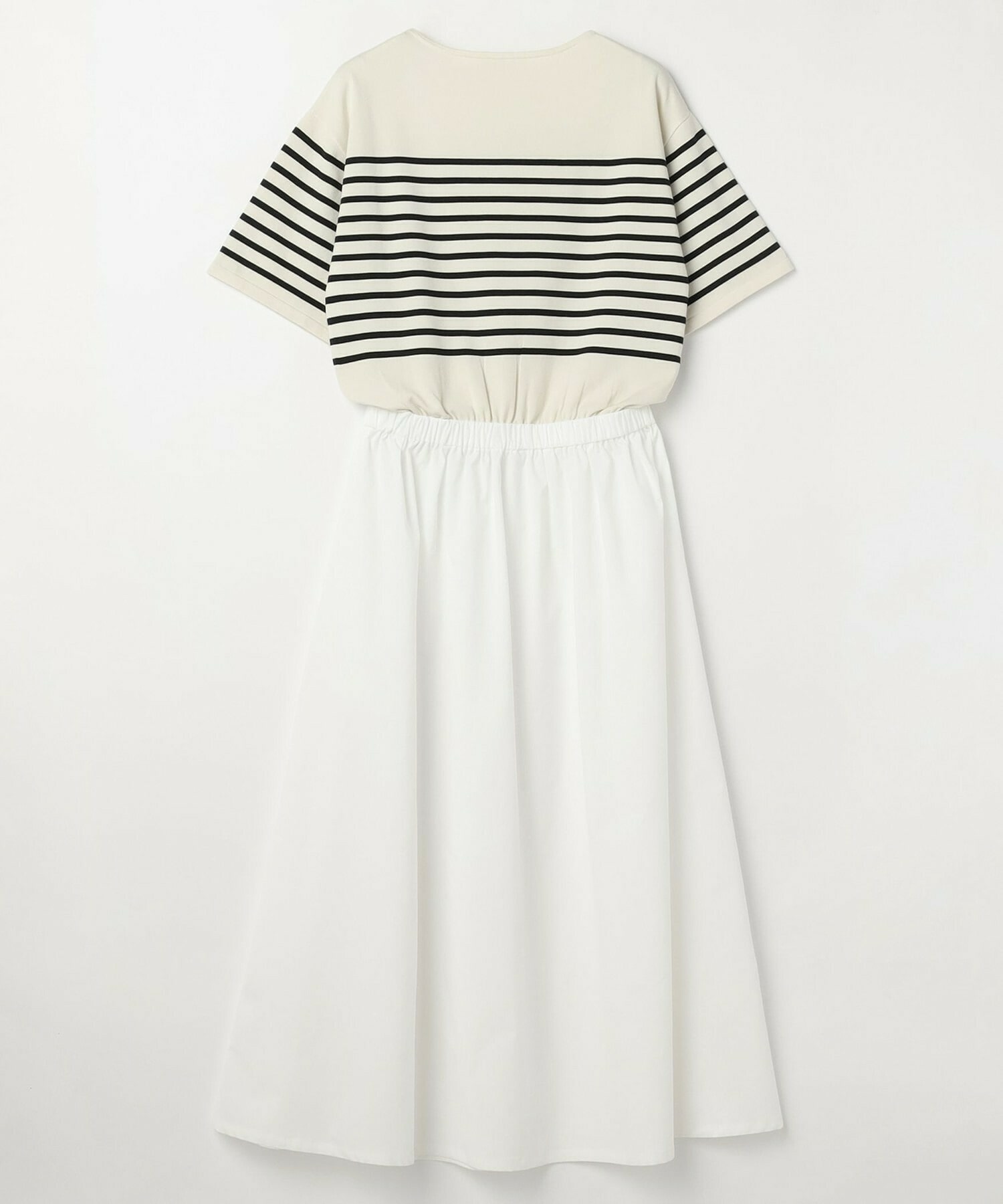 爽やかなボートネックのボーダーニットと布帛素材のスカートをコンビにしたワンピース。