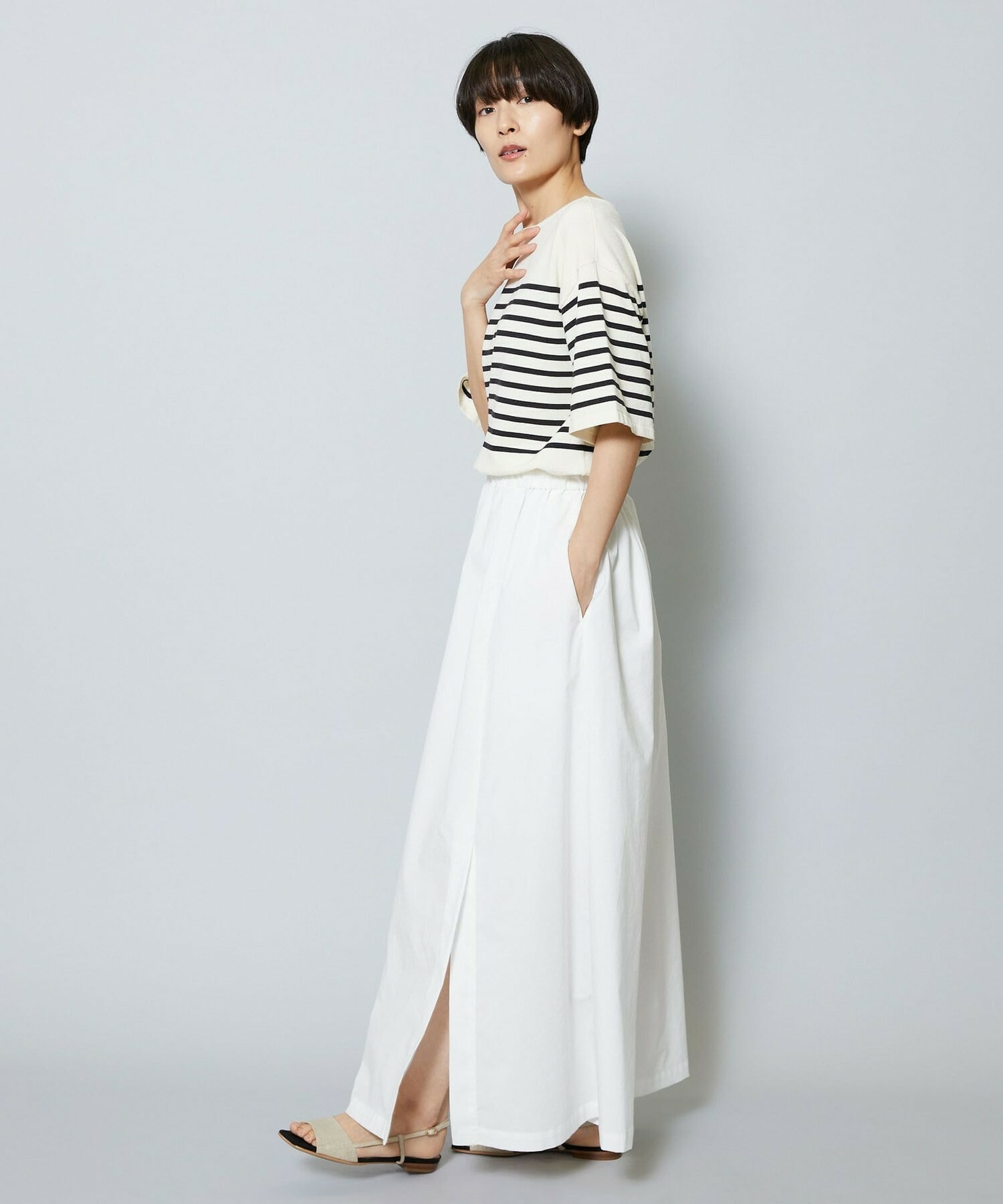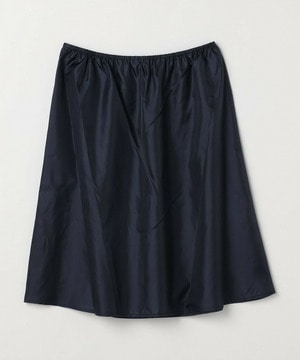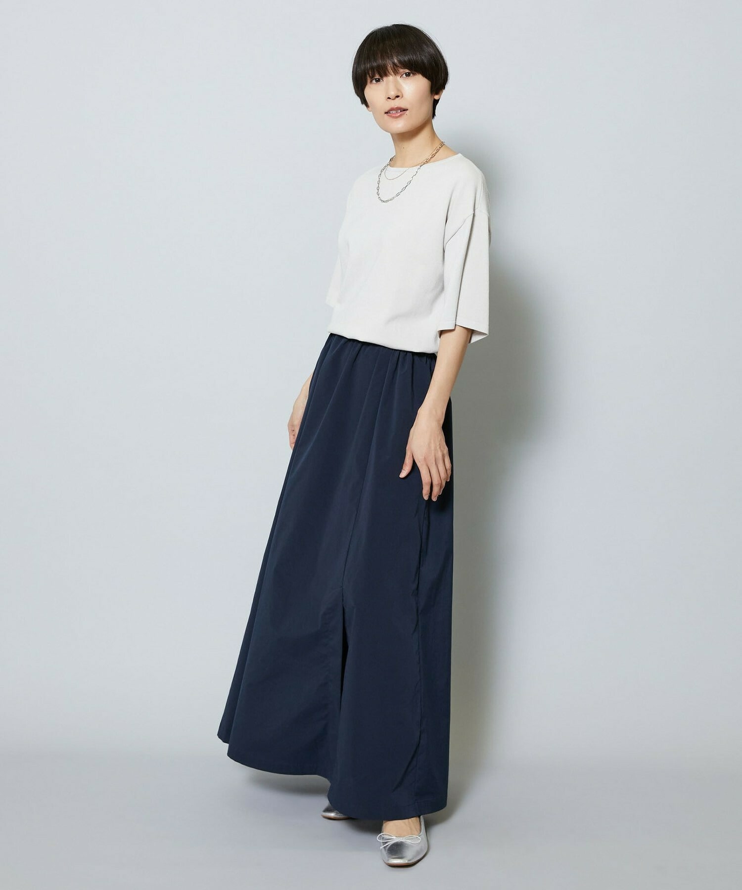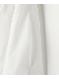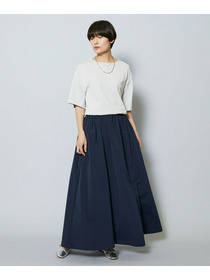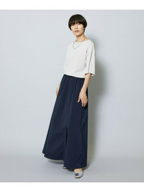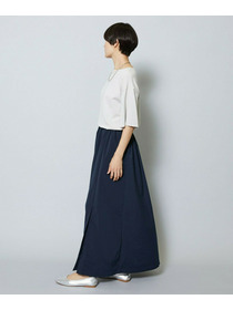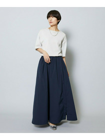長めのスカートの片サイドにベンツスリットをあけて動きにアクセントをつけています。ウエストに入れたタックとスカートの分量感も着用のシルエットがスッキリめに美しく見えるように仕上げています。
