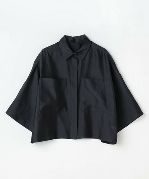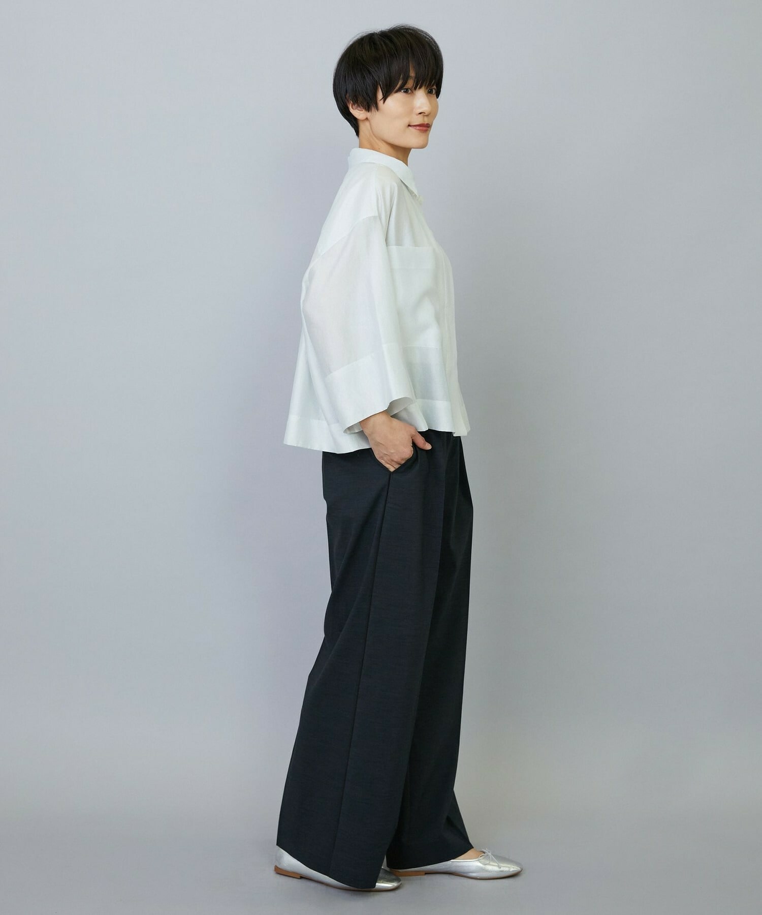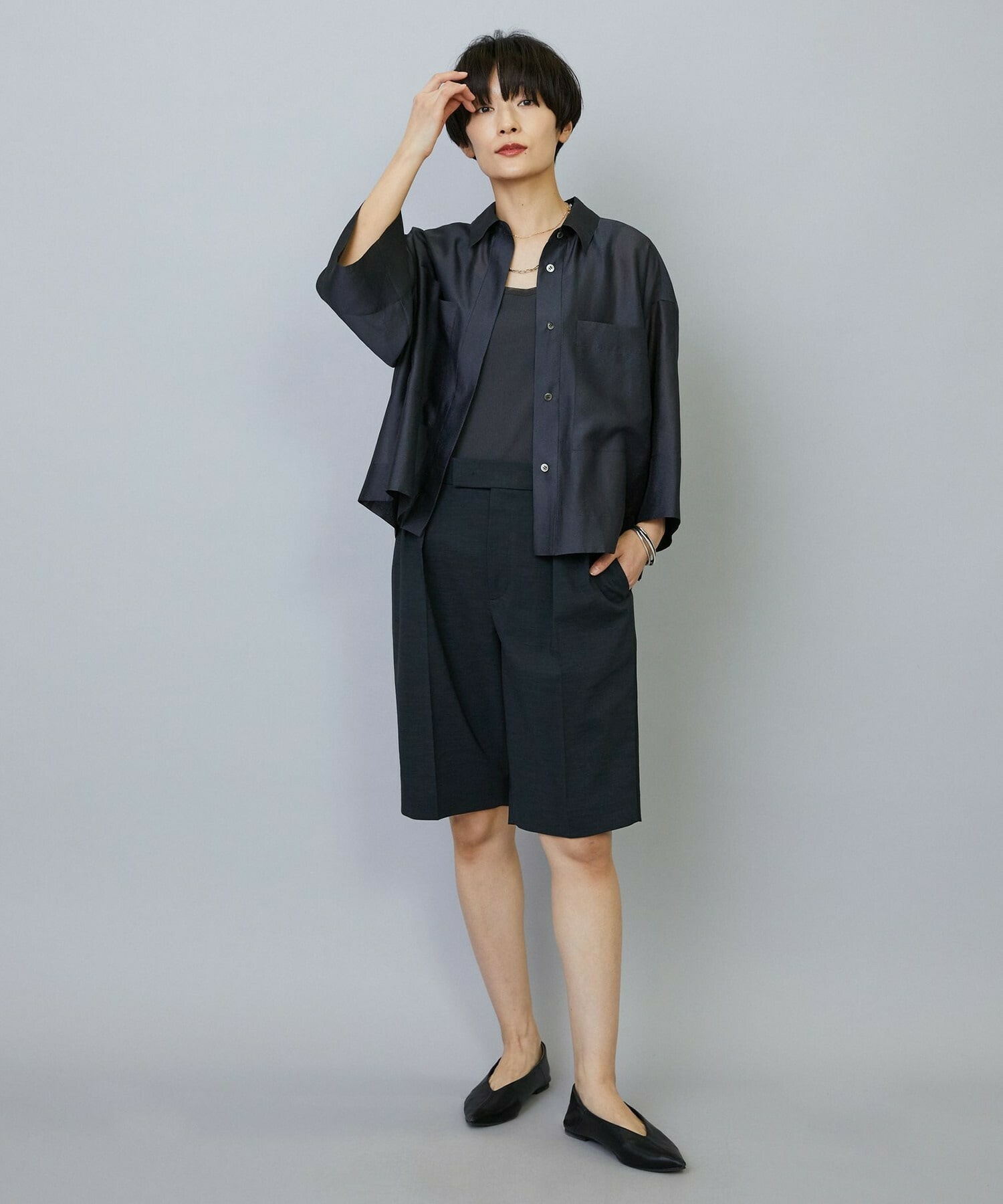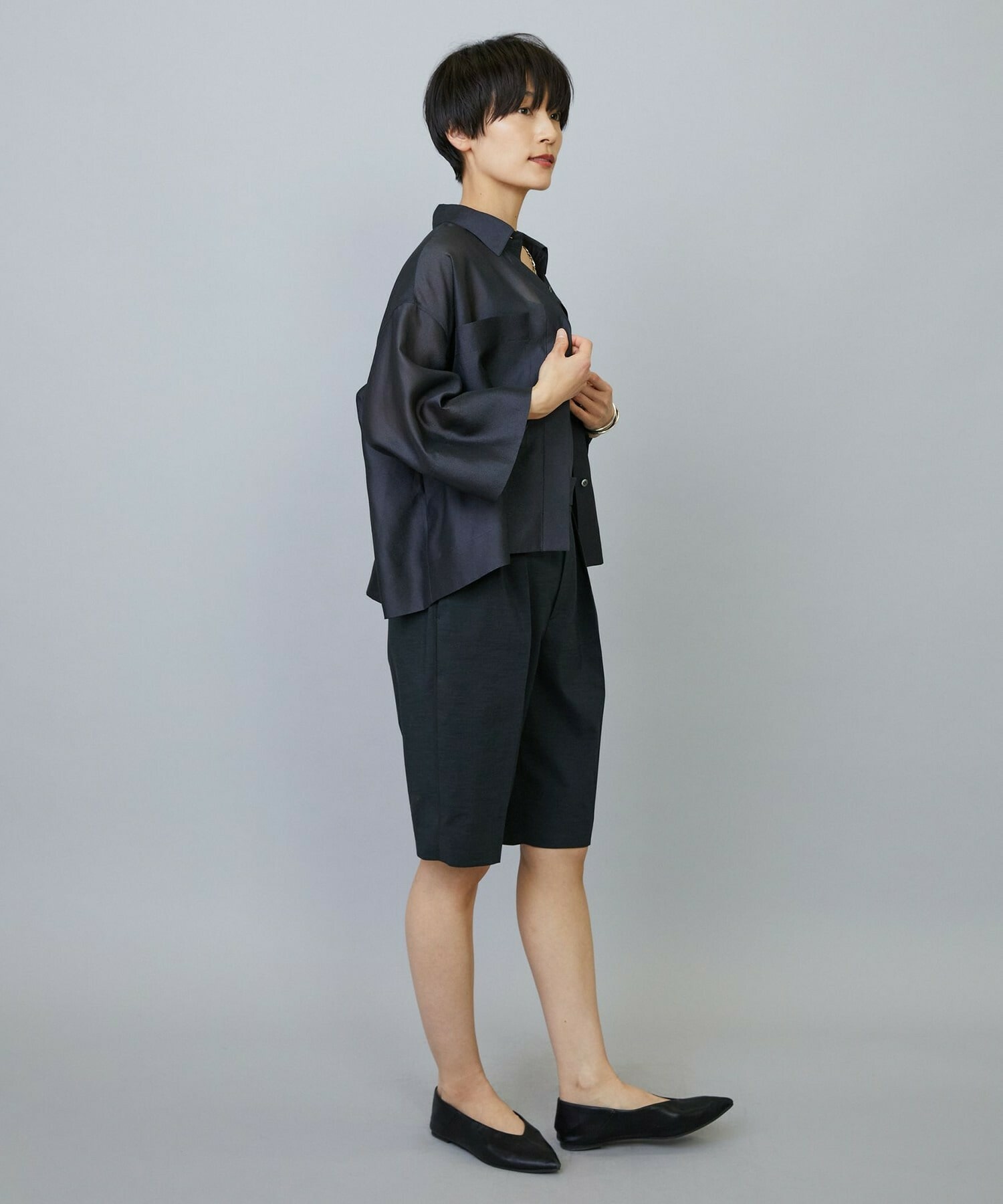 光沢のあるシアー感と、さらっとドライな素材感が暑さの続く時期に長く着用していただけるブラウスてす。