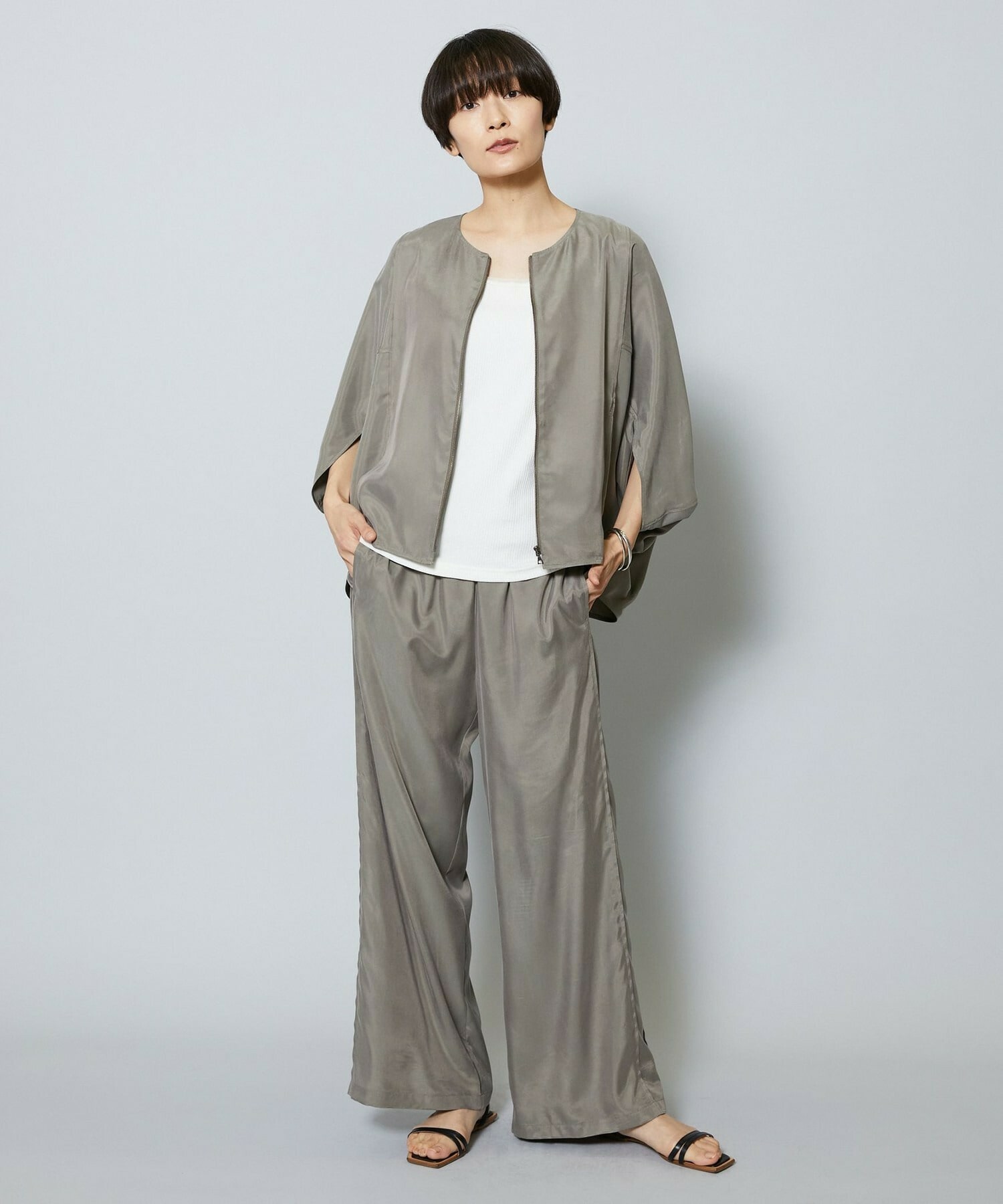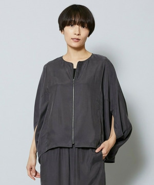 ポンチョのようなリラックスムードのある軽羽織。袖の開きを前にズラした変形のドルマンが袖下にもニュアンスを出してくれます。後ろは立体感のあるコクーンシルエットで前後差を付け、パンツにも合わせやすくなっています。切り替えにはステッチを効かせポイントに。前ファスナーを少し開いて衿ぐりを抜いて、キーネックのワントップスのようにも着ていただけます。同素材のワイドパンツとセットアップとしてコーディネートも可能です。