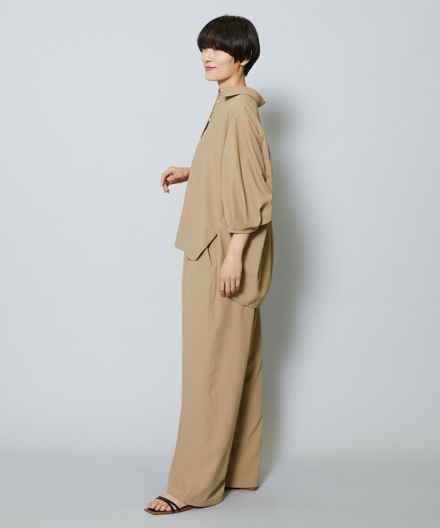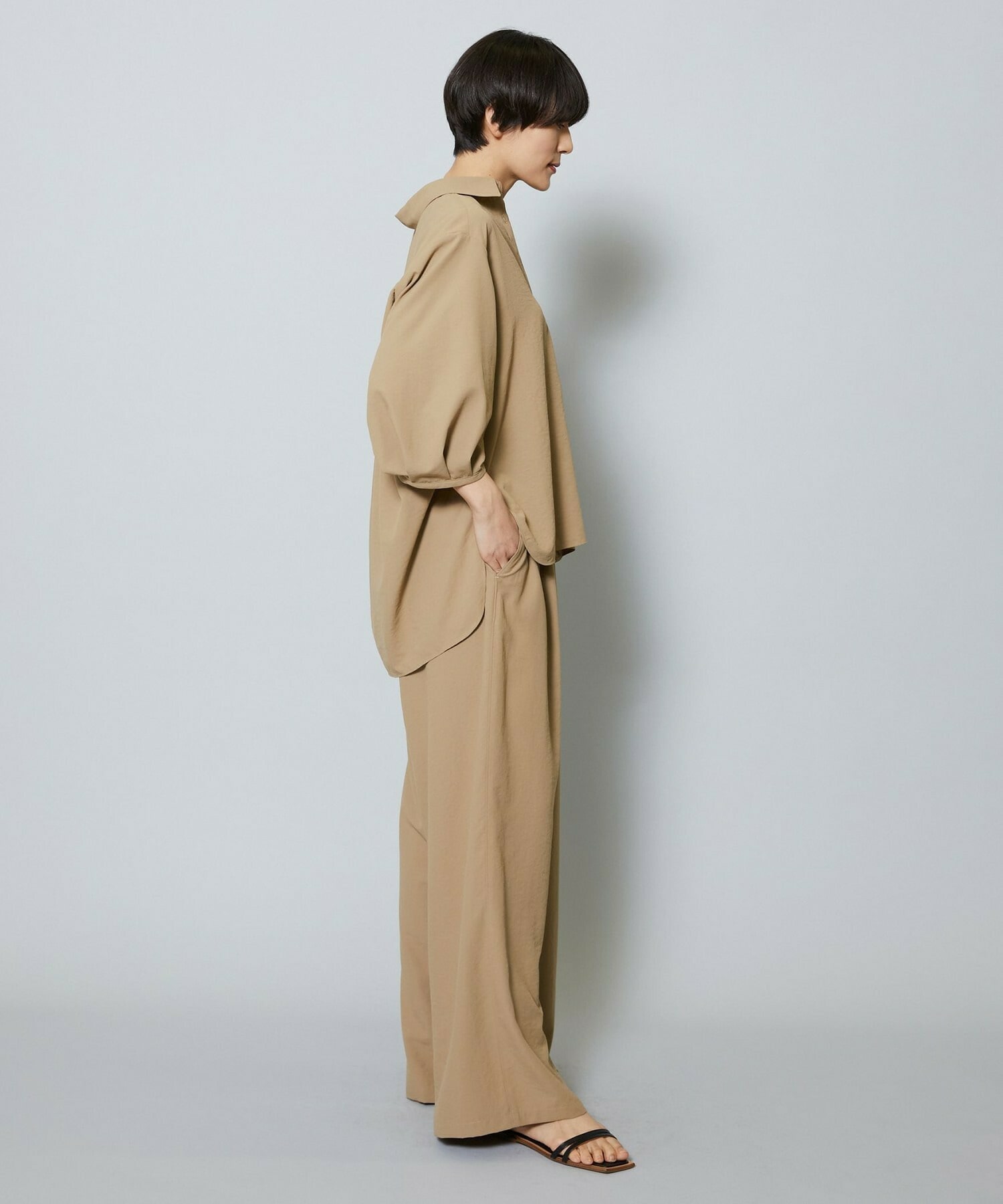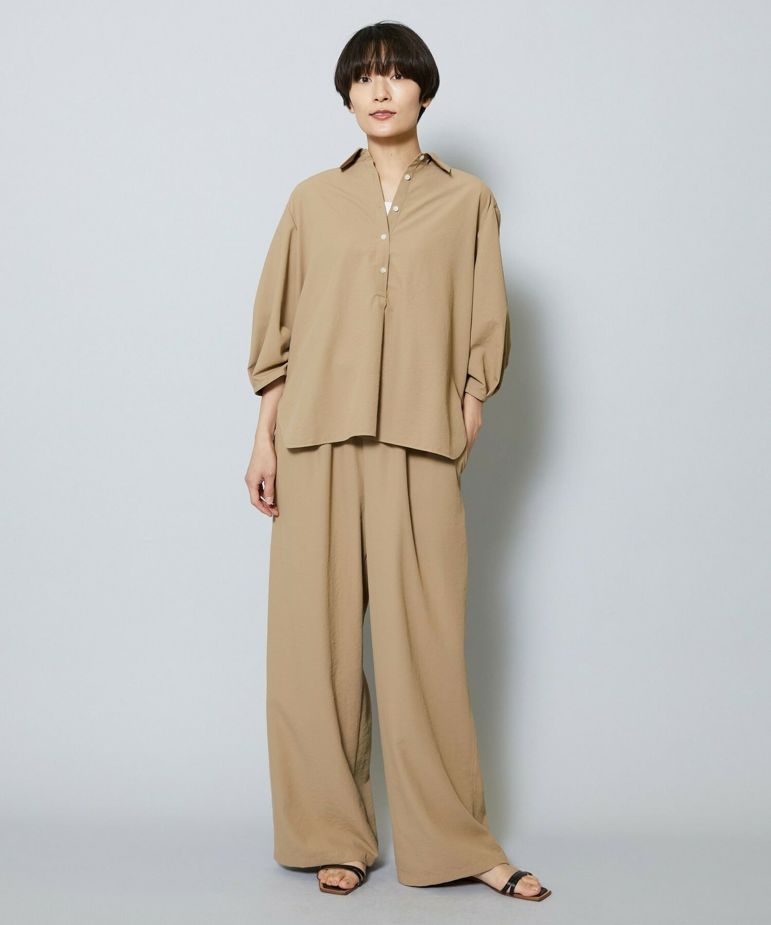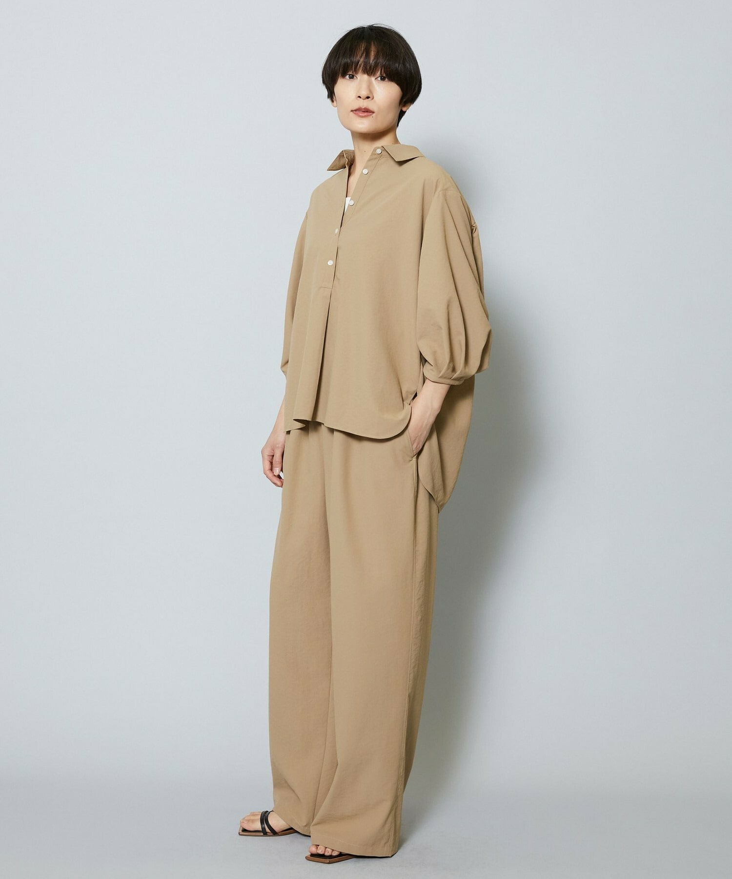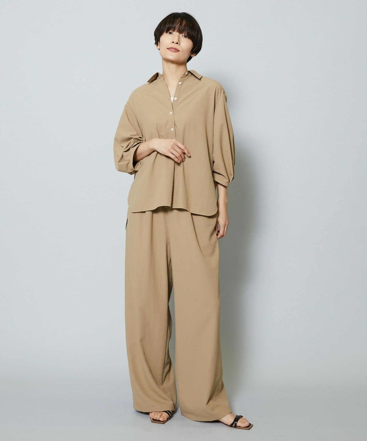 リサイクルポリエステルを使用した生地。コットンライクな風合いの素材にワッシャーを施し、特殊原料を仕様しているためUVカット性にも優れた環境配慮とファッション性を兼ね備えた素材です。