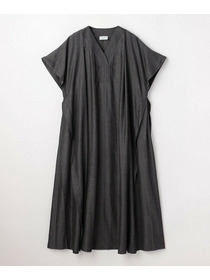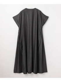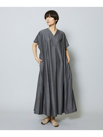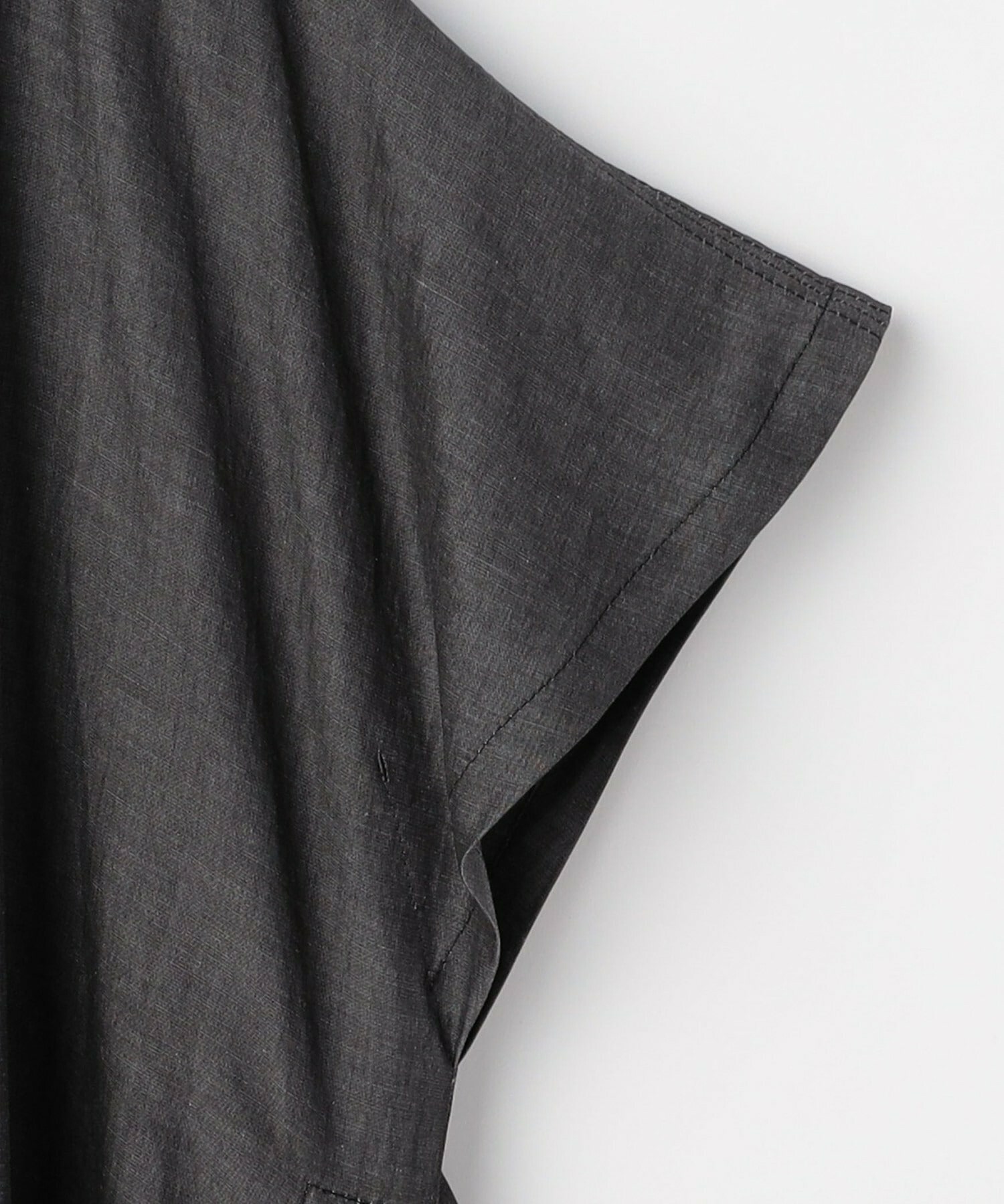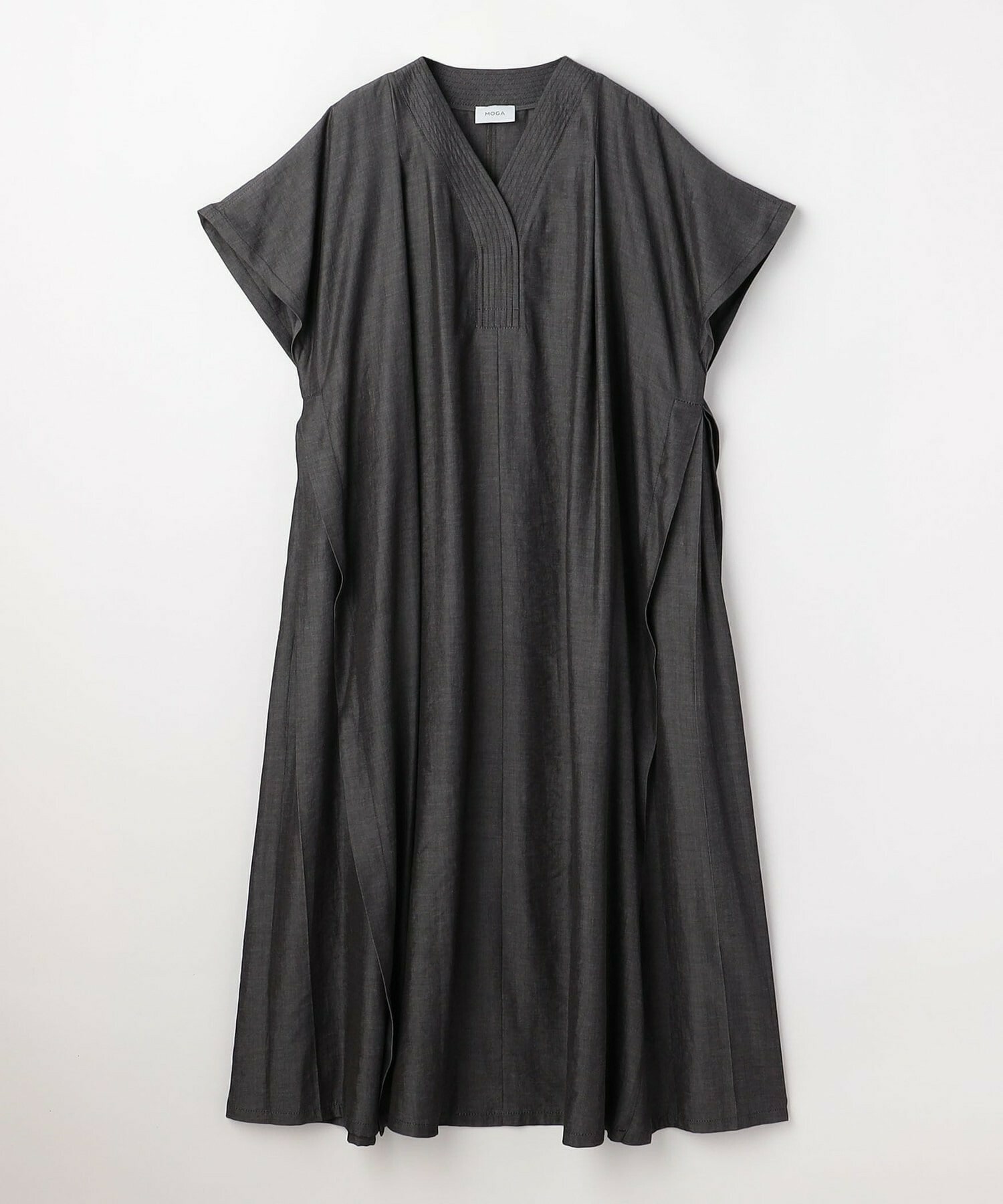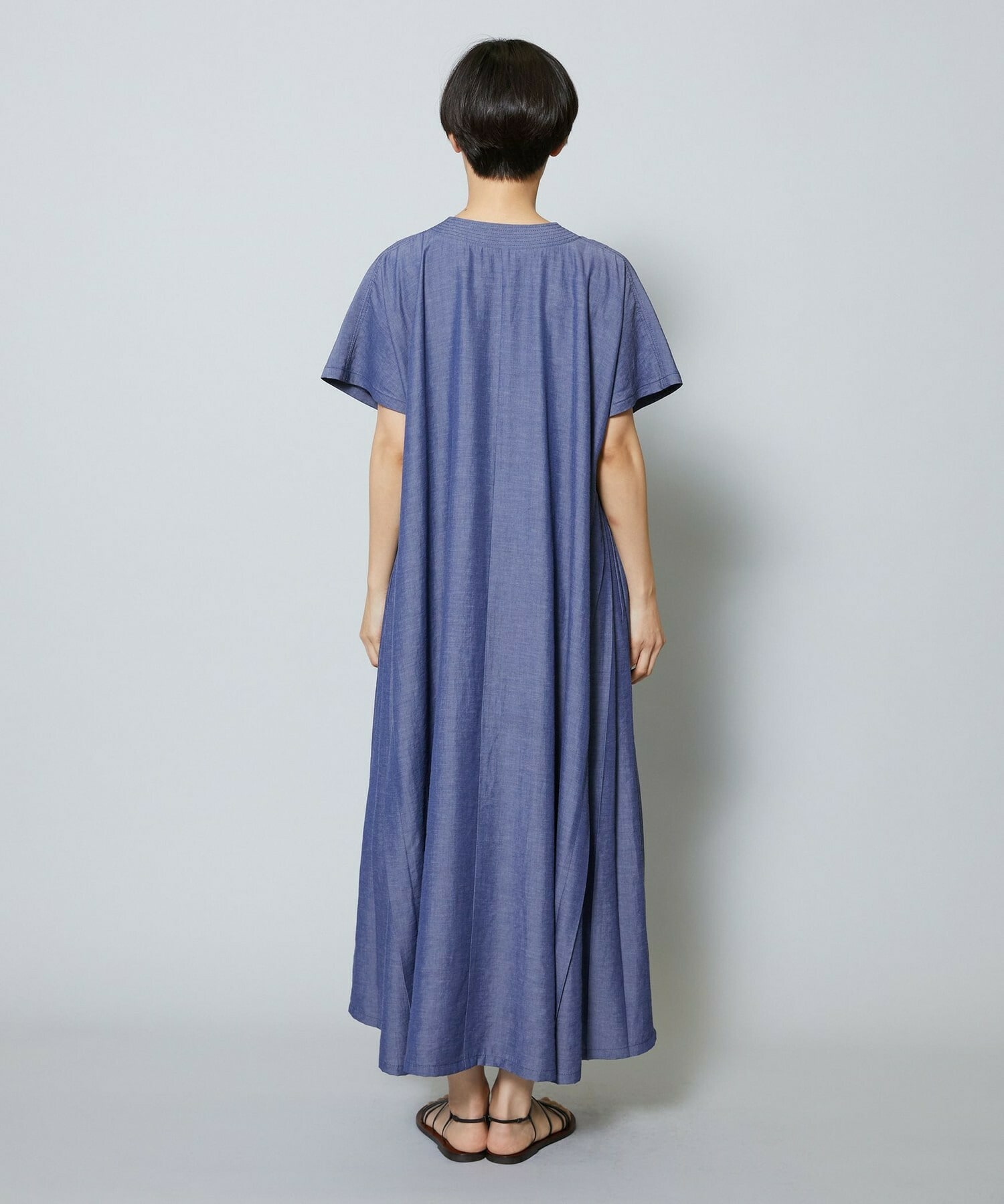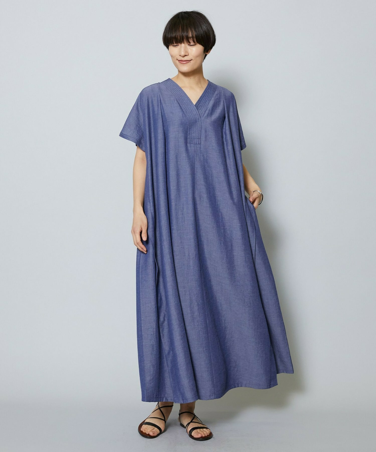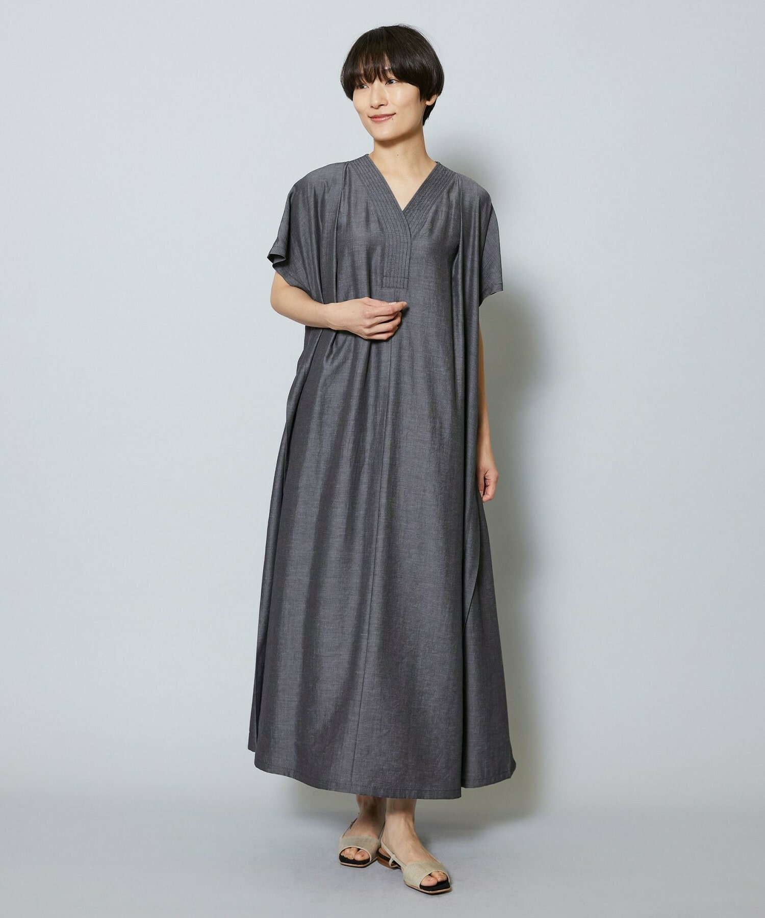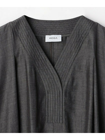 衿元はステッチワークを効かせた変形V襟に仕上げてデザインアクセントにしています。