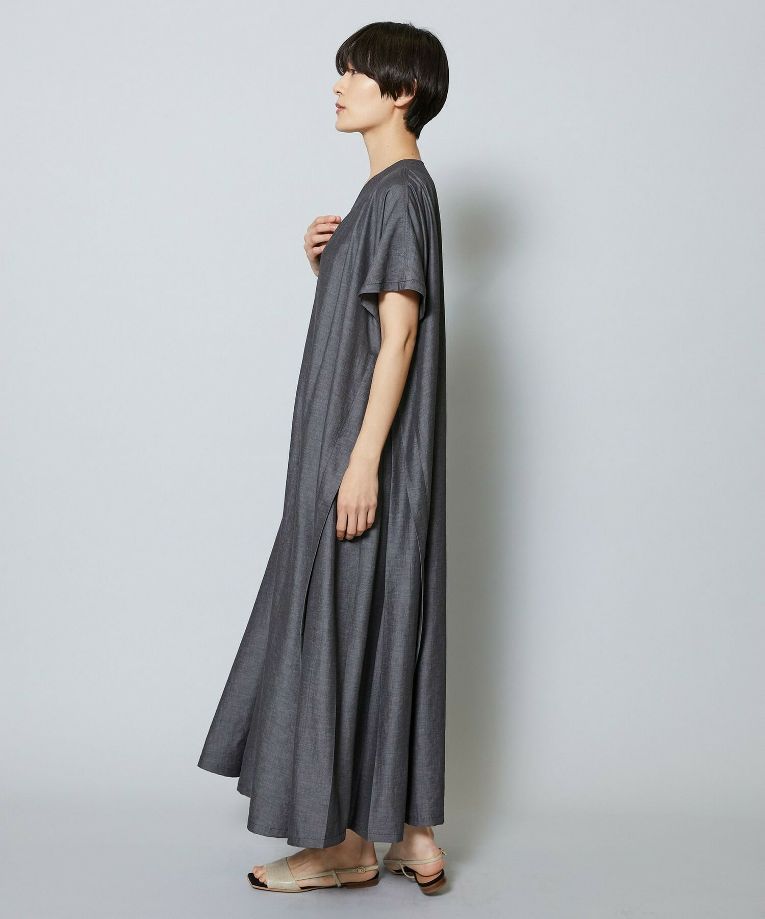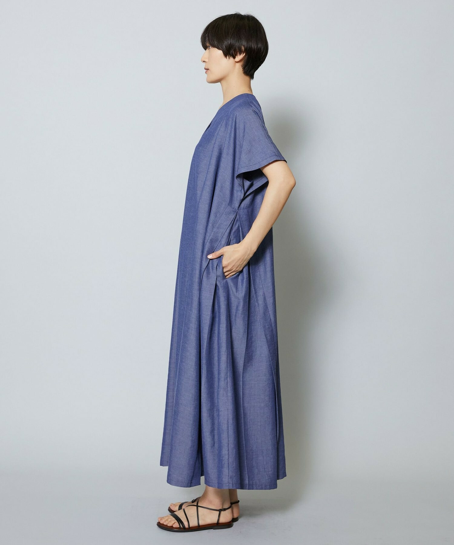 軽量でドライタッチな風合いとナチュラルなタテシワが特徴のシャンブレー生地。糸自体に、接触冷感に吸水速乾が備わっており適度な落ち感と張り感があるためブラウスやシャツなどに適しています。