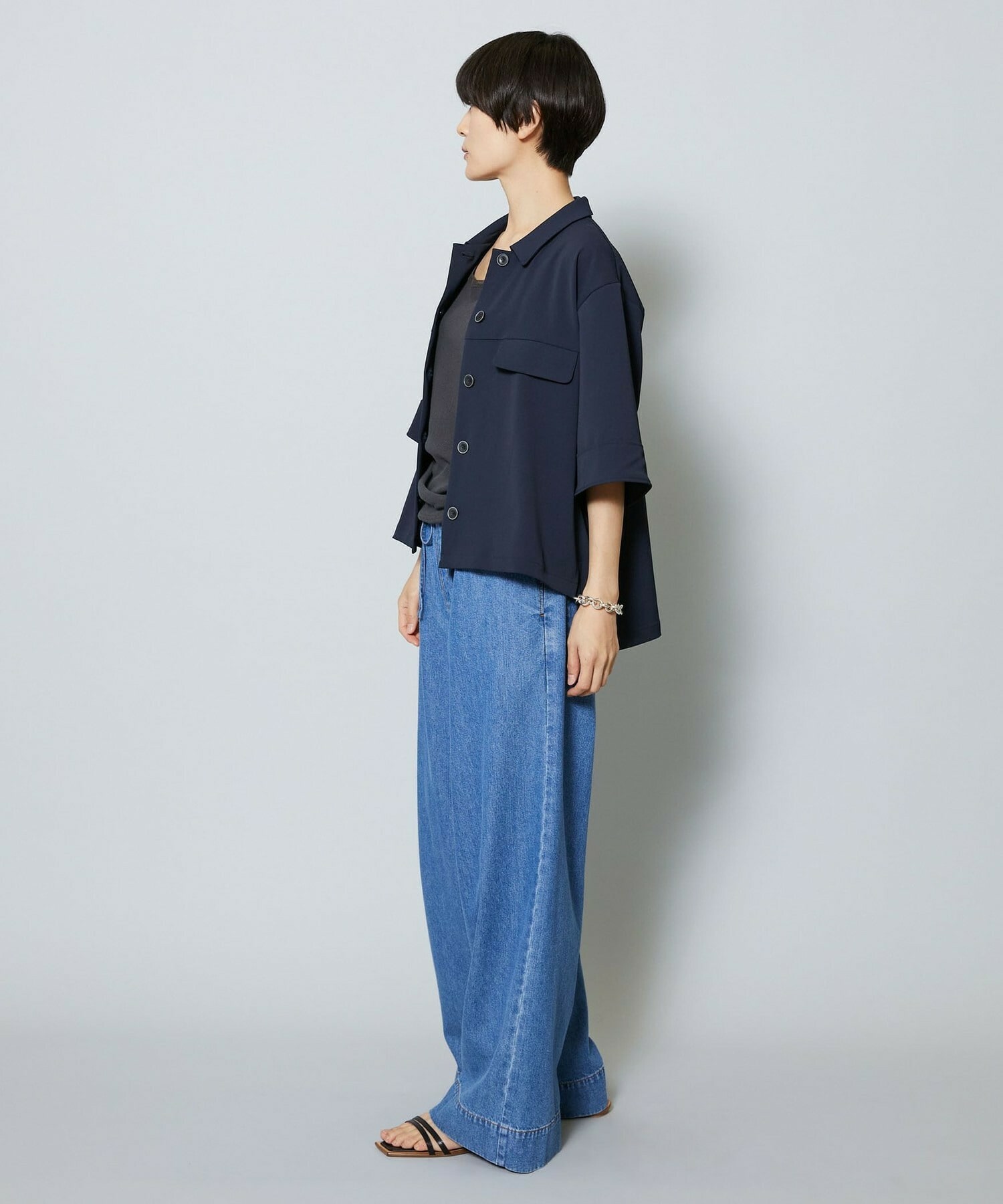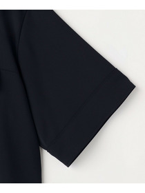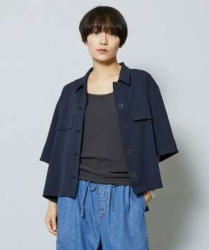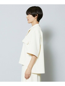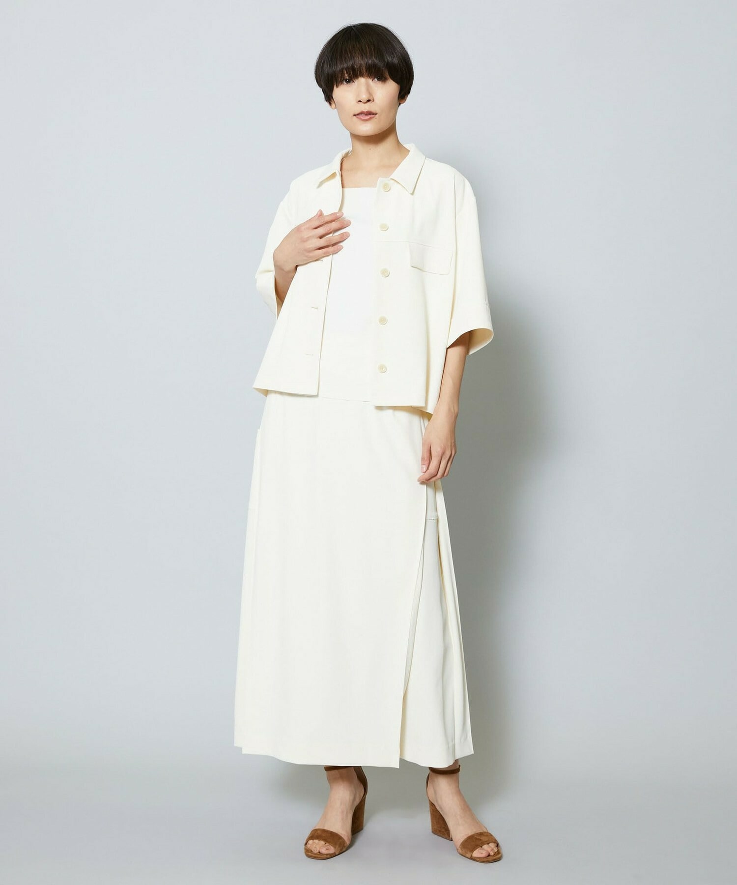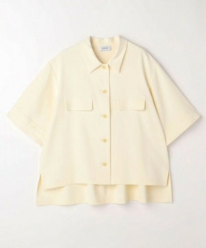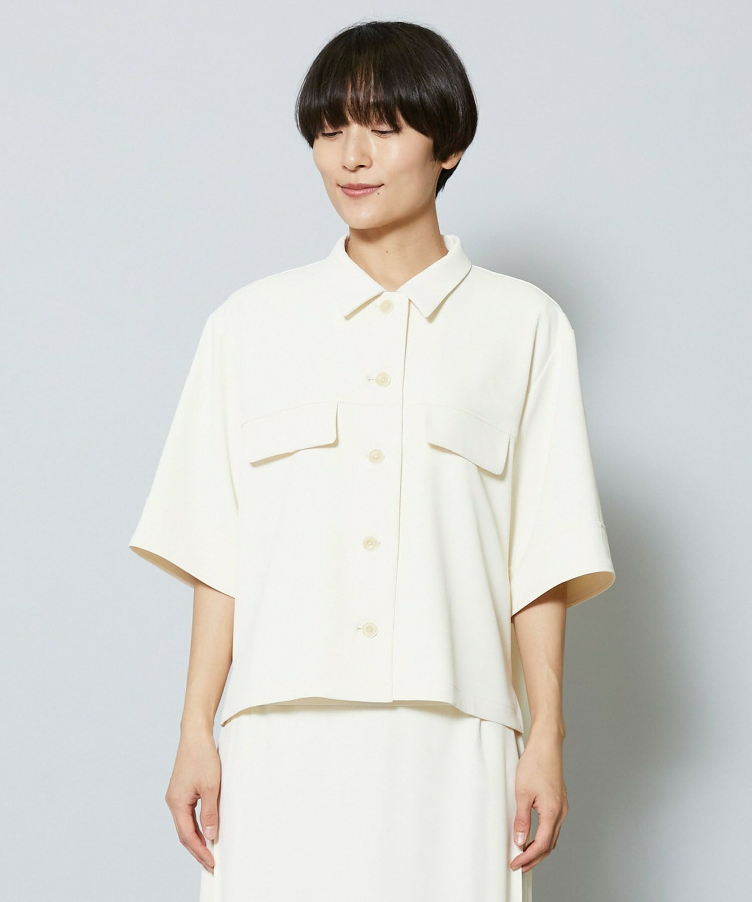 ジャケットライクな半袖シャツです。少し大きめのボタンにフェイクフラップを取り付け、半袖ながらもキレイめな大人な雰囲気のデザインにしました。前だけインしていただいても雰囲気が出るように、前後の着丈に差寸をつけてインしやすいようにスリットも入れています。