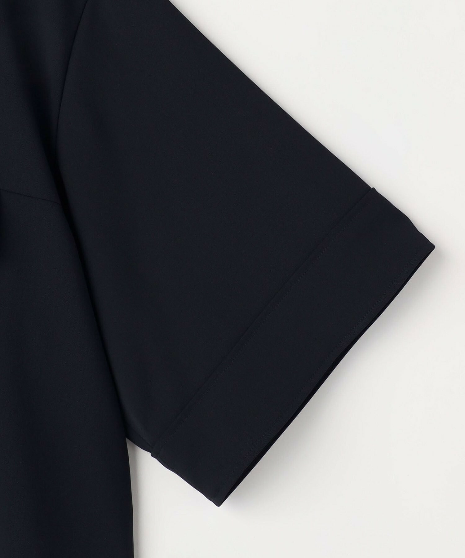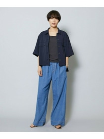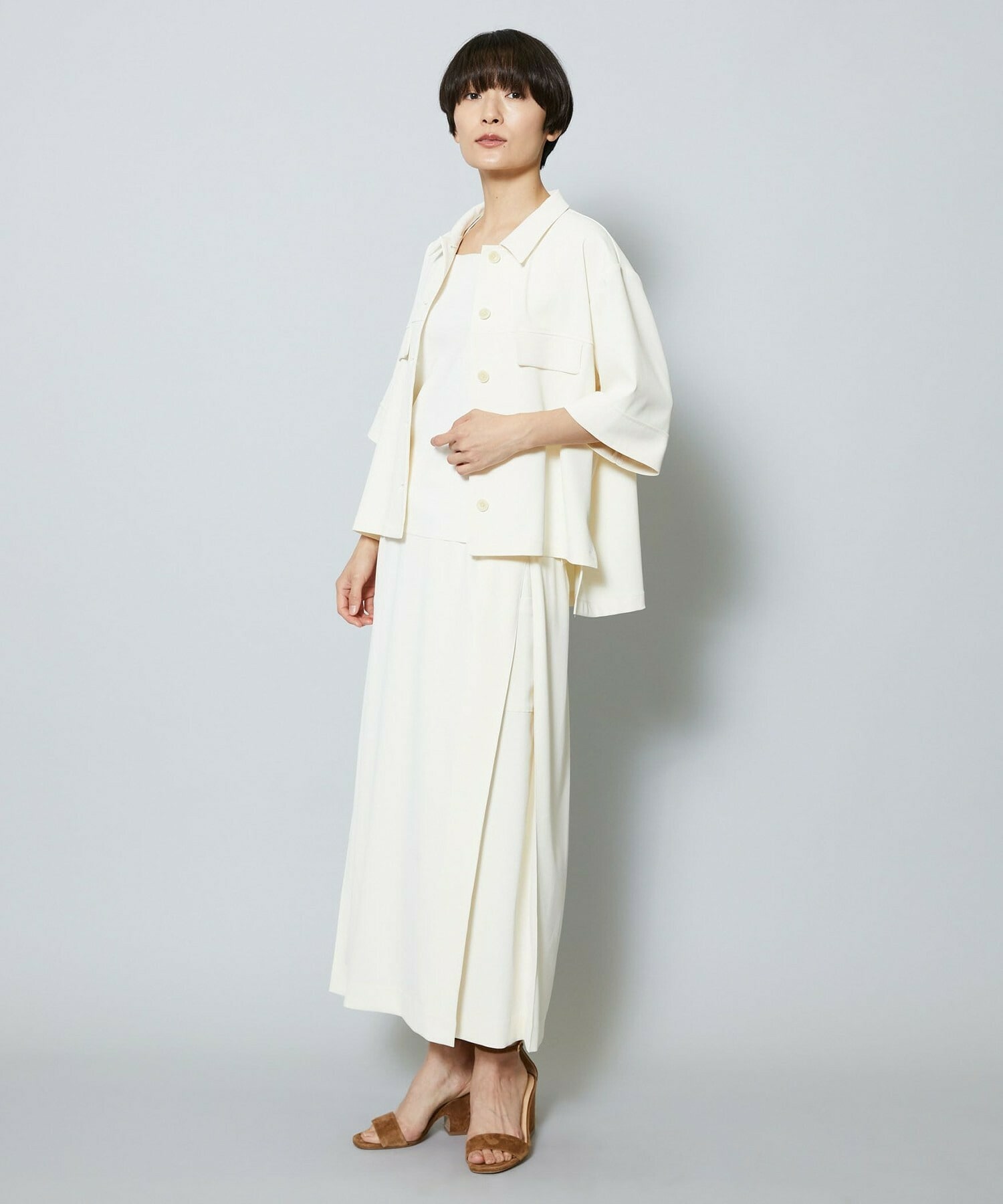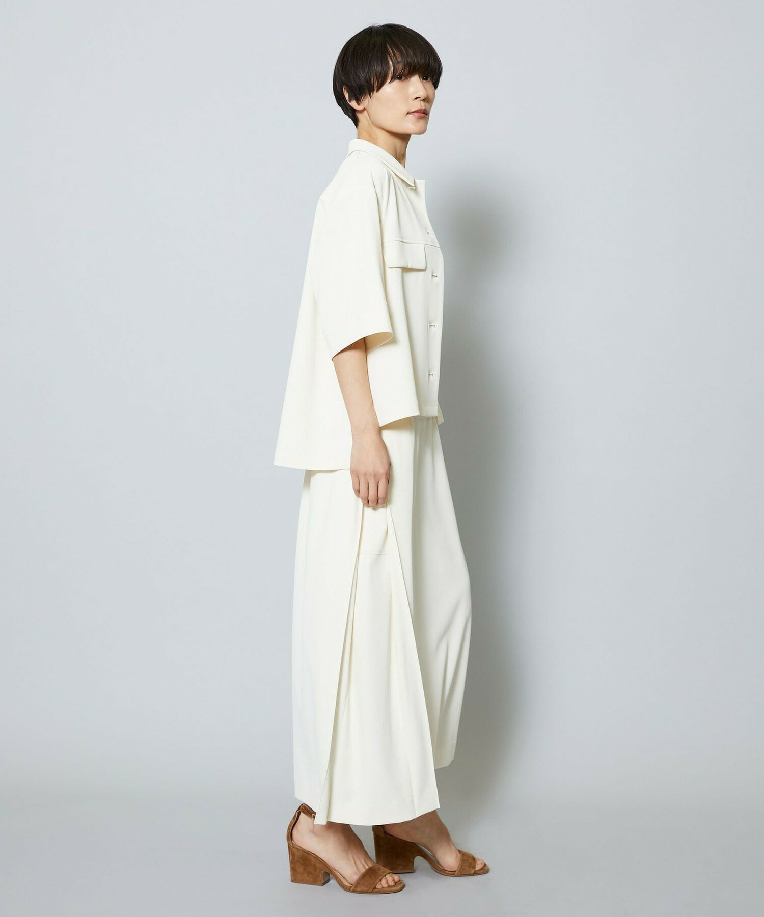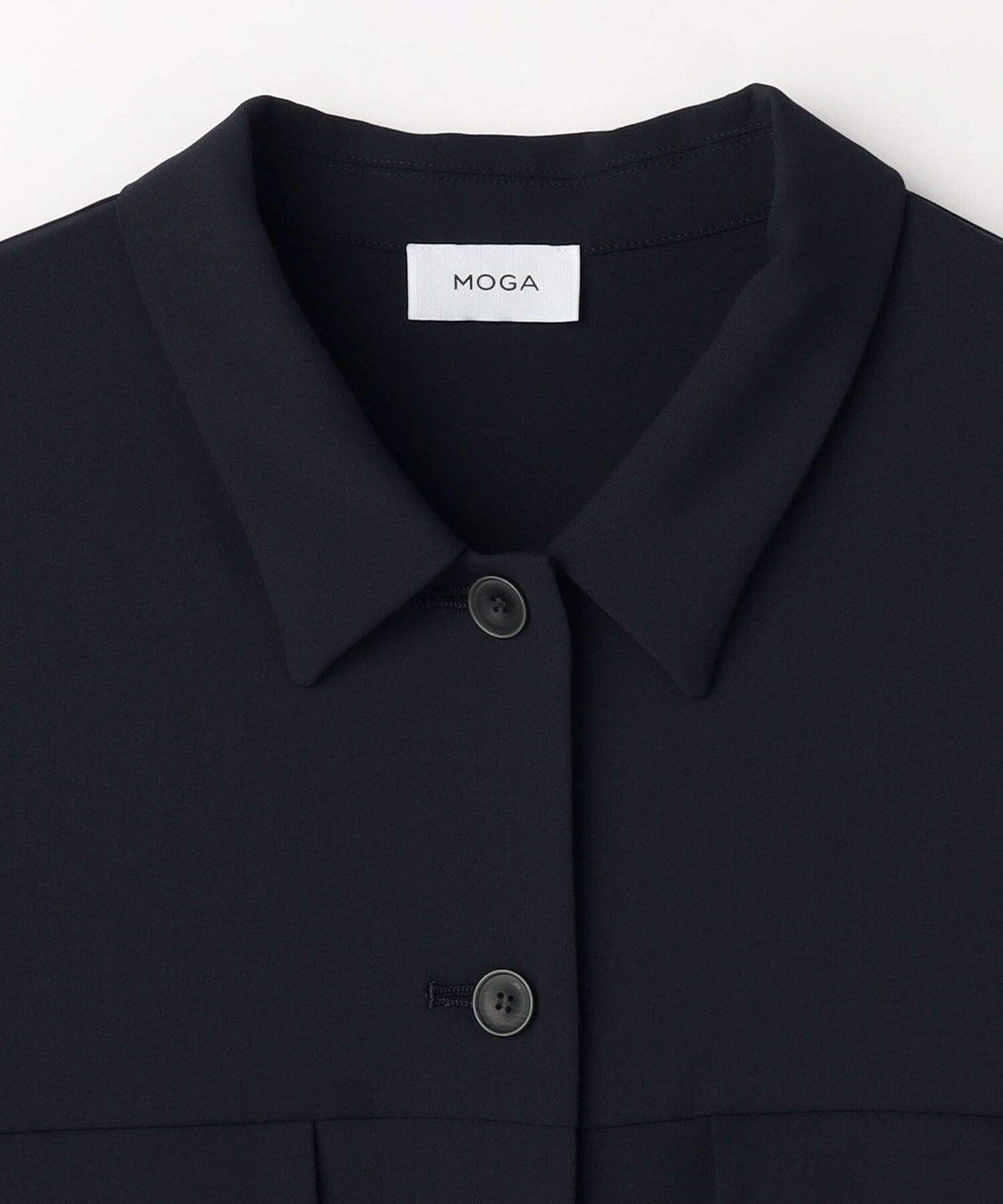 ジャケットライクな半袖シャツです。少し大きめのボタンにフェイクフラップを取り付け、半袖ながらもキレイめな大人な雰囲気のデザインにしました。前だけインしていただいても雰囲気が出るように、前後の着丈に差寸をつけてインしやすいようにスリットも入れています。