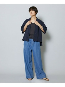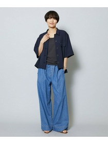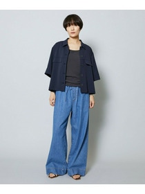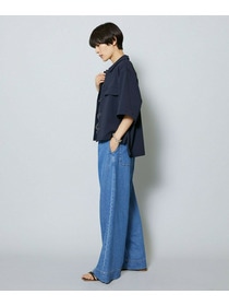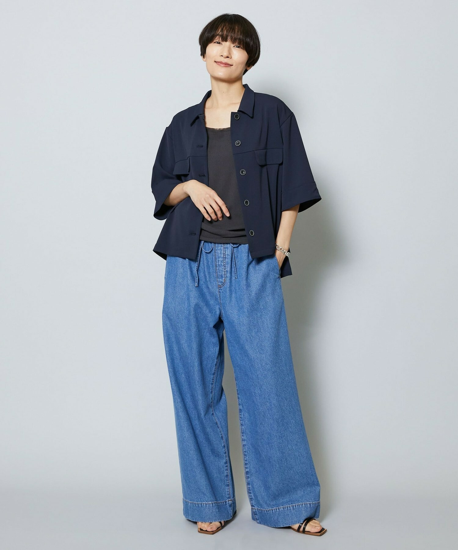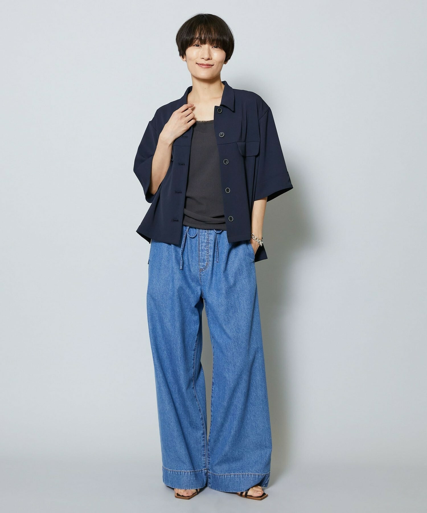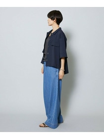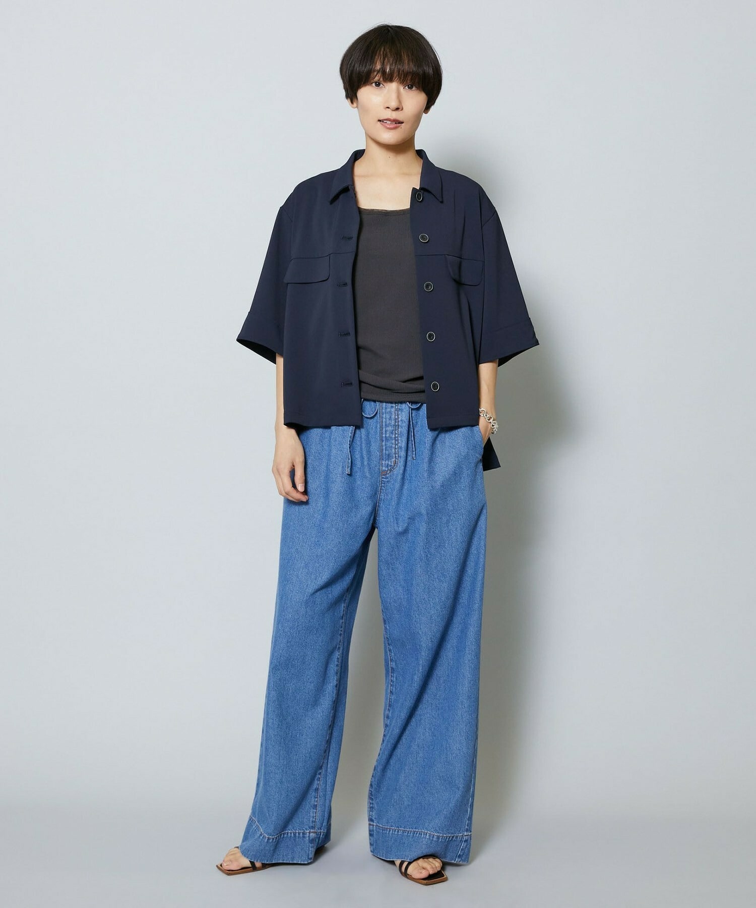 ジャケットライクな半袖シャツです。少し大きめのボタンにフェイクフラップを取り付け、半袖ながらもキレイめな大人な雰囲気のデザインにしました。前だけインしていただいても雰囲気が出るように、前後の着丈に差寸をつけてインしやすいようにスリットも入れています。