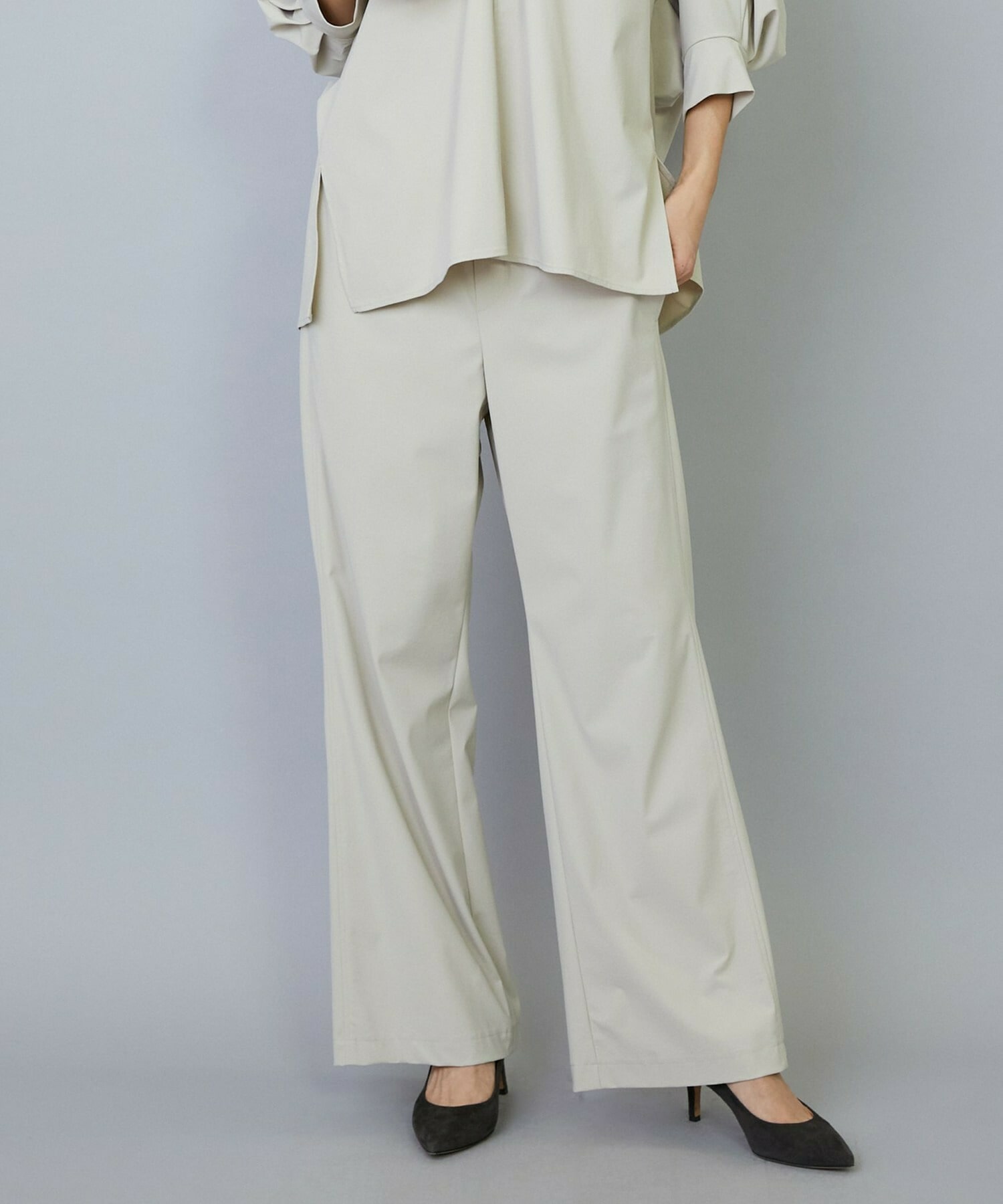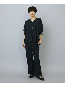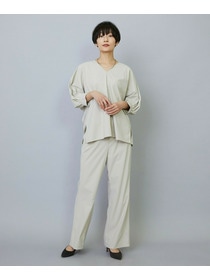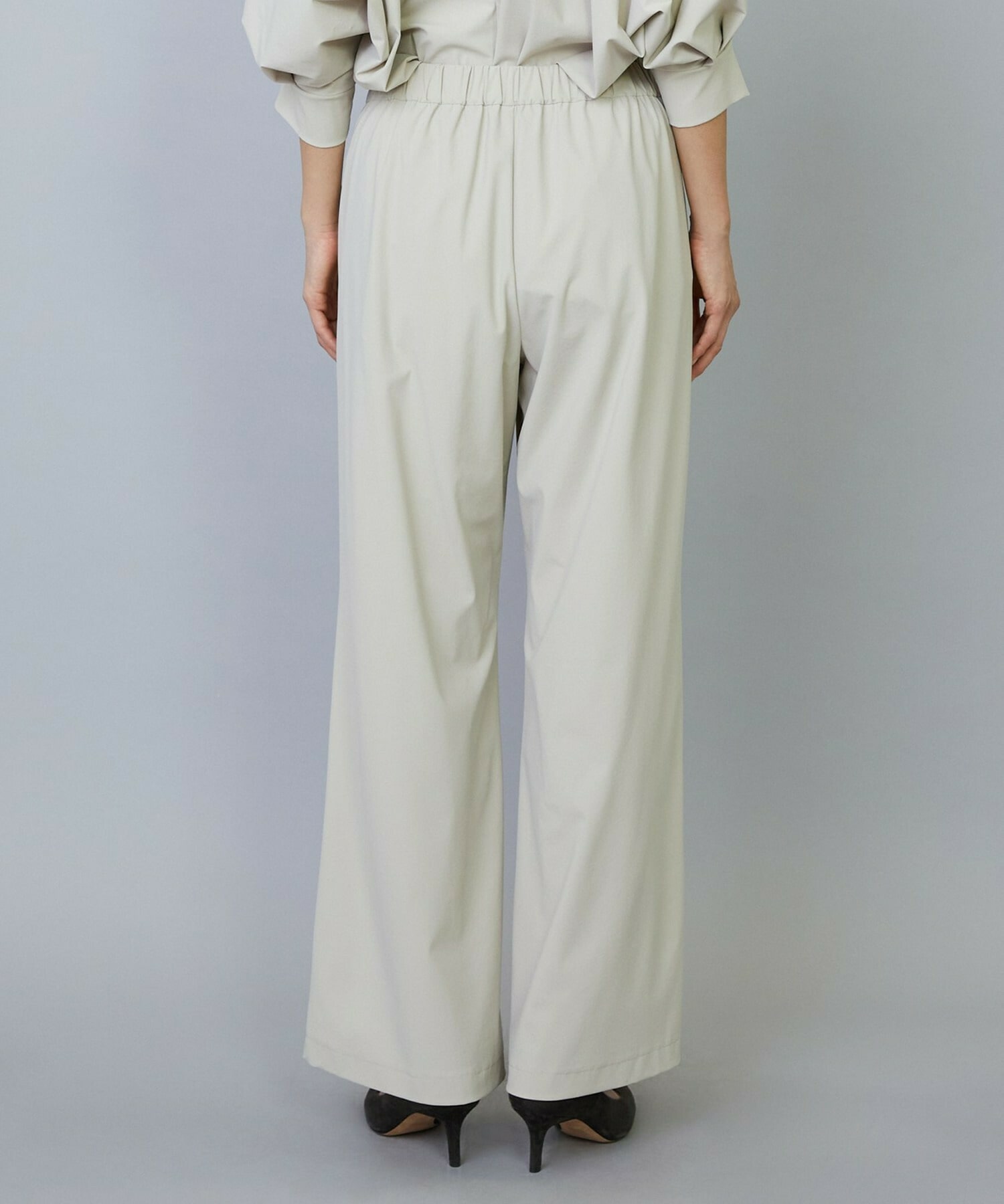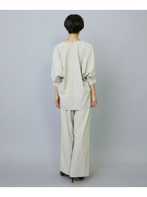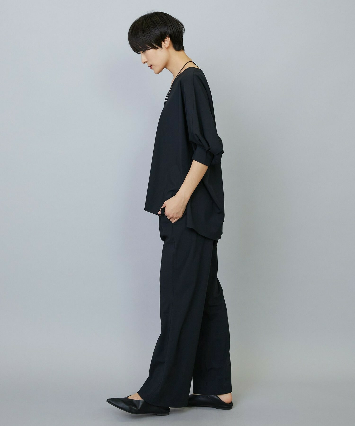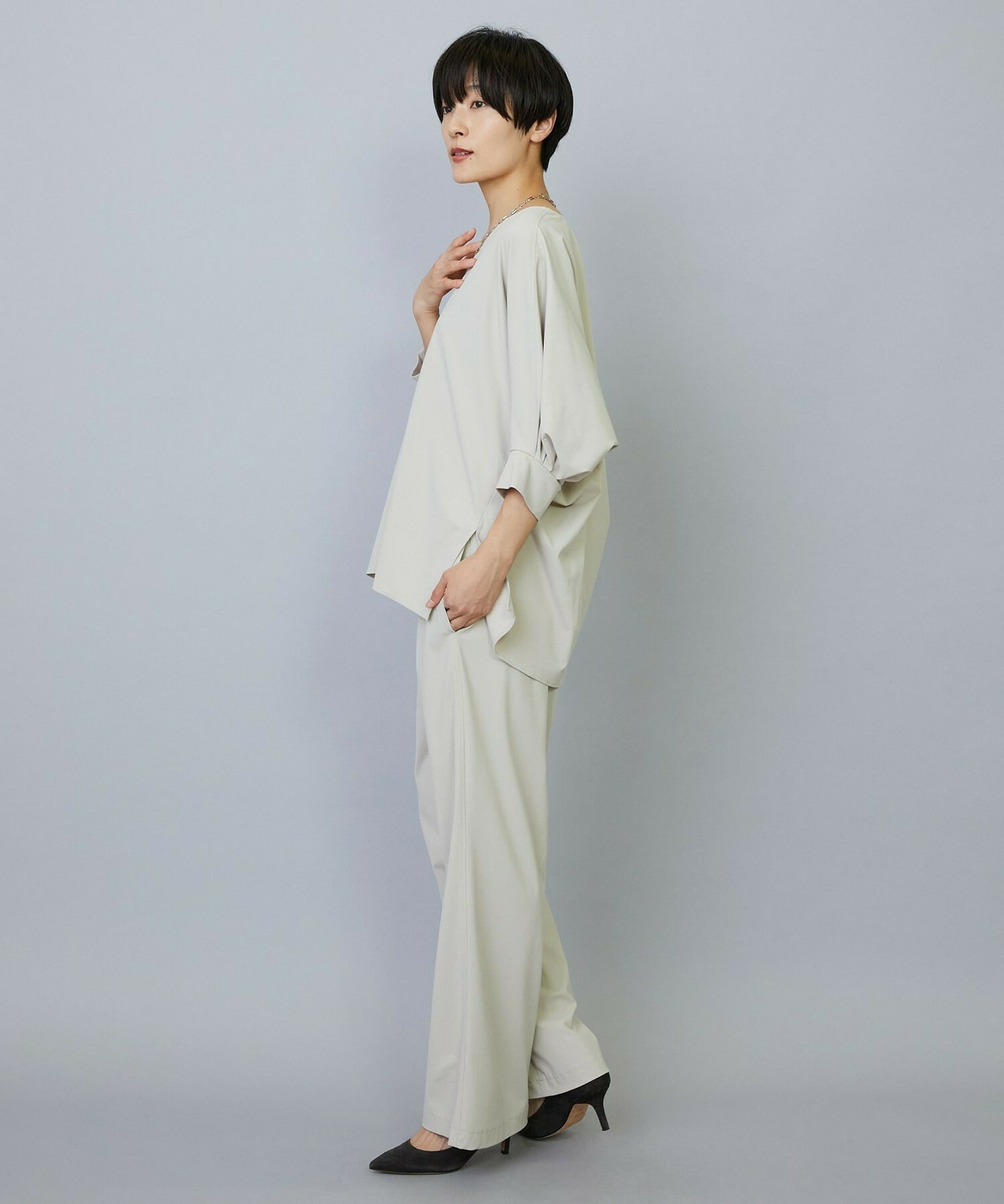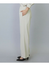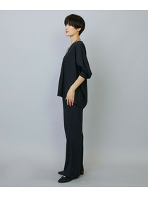 トップスと同様に少し前方にズラした脇線をタックでポイントにしたイージーパンツ。少し高めの膝位置でラインを入れ、スッキリとしたストレートラインに仕上げました。同素材のトップスとのセットアップコーディネートがオススメです。