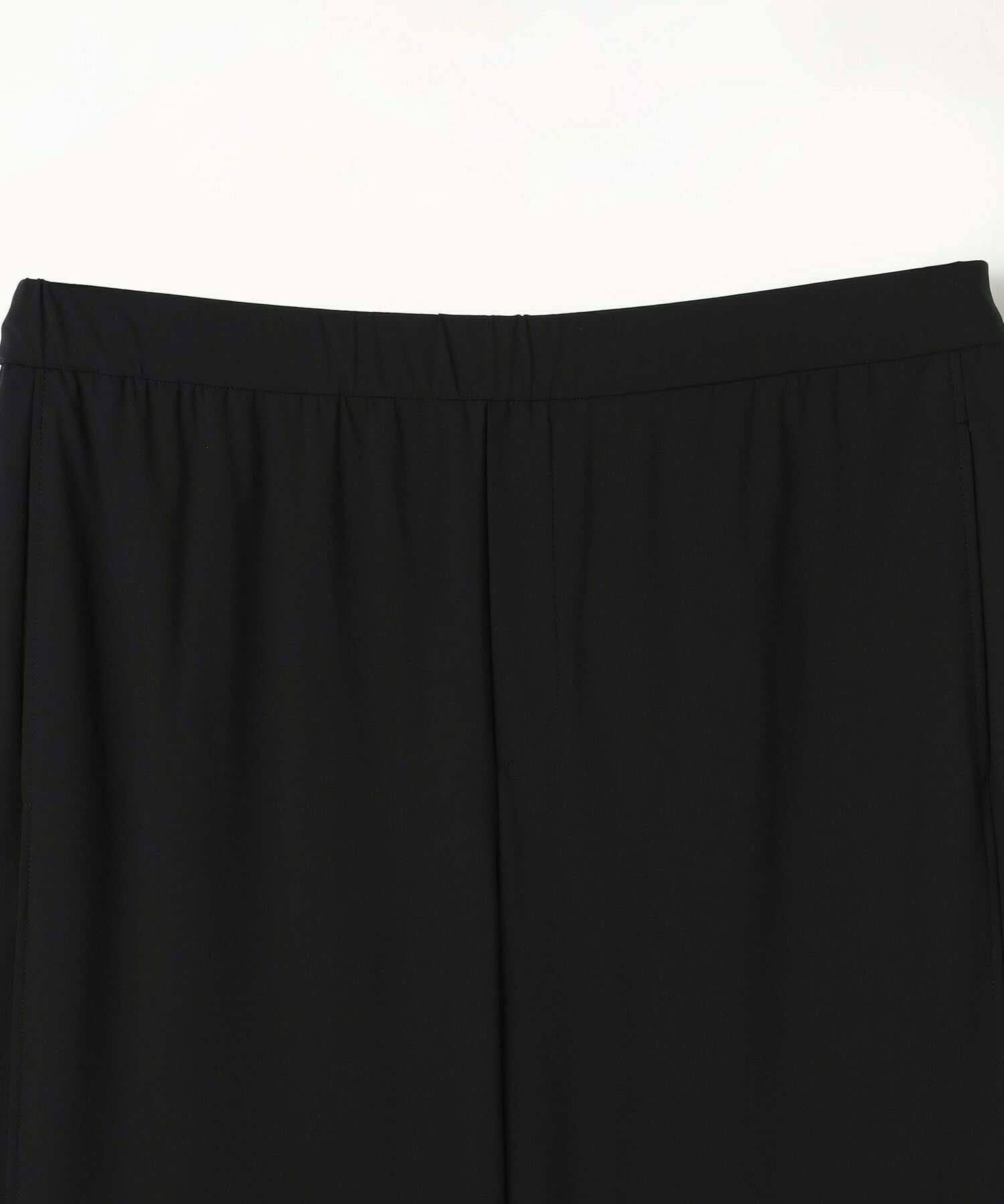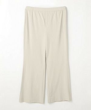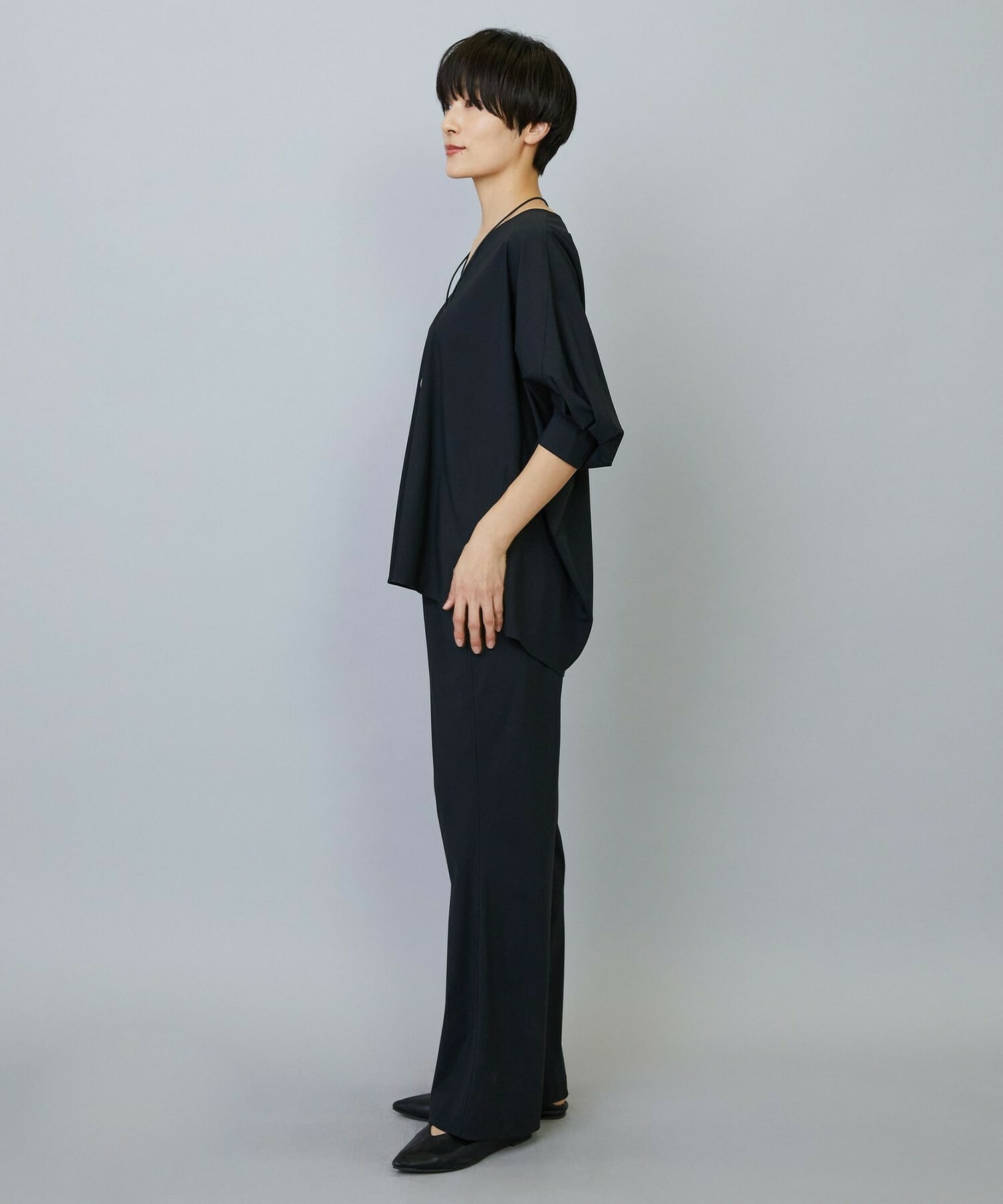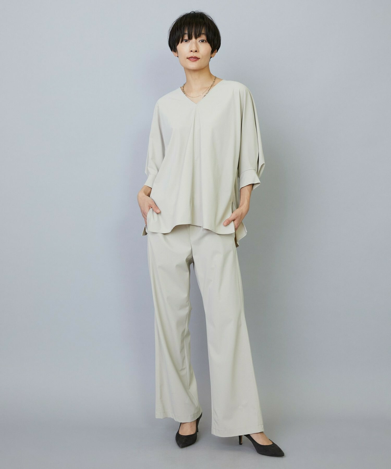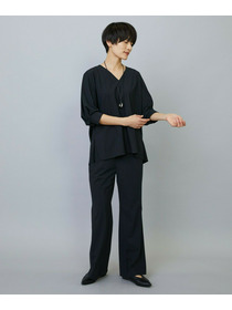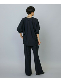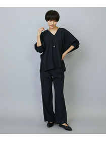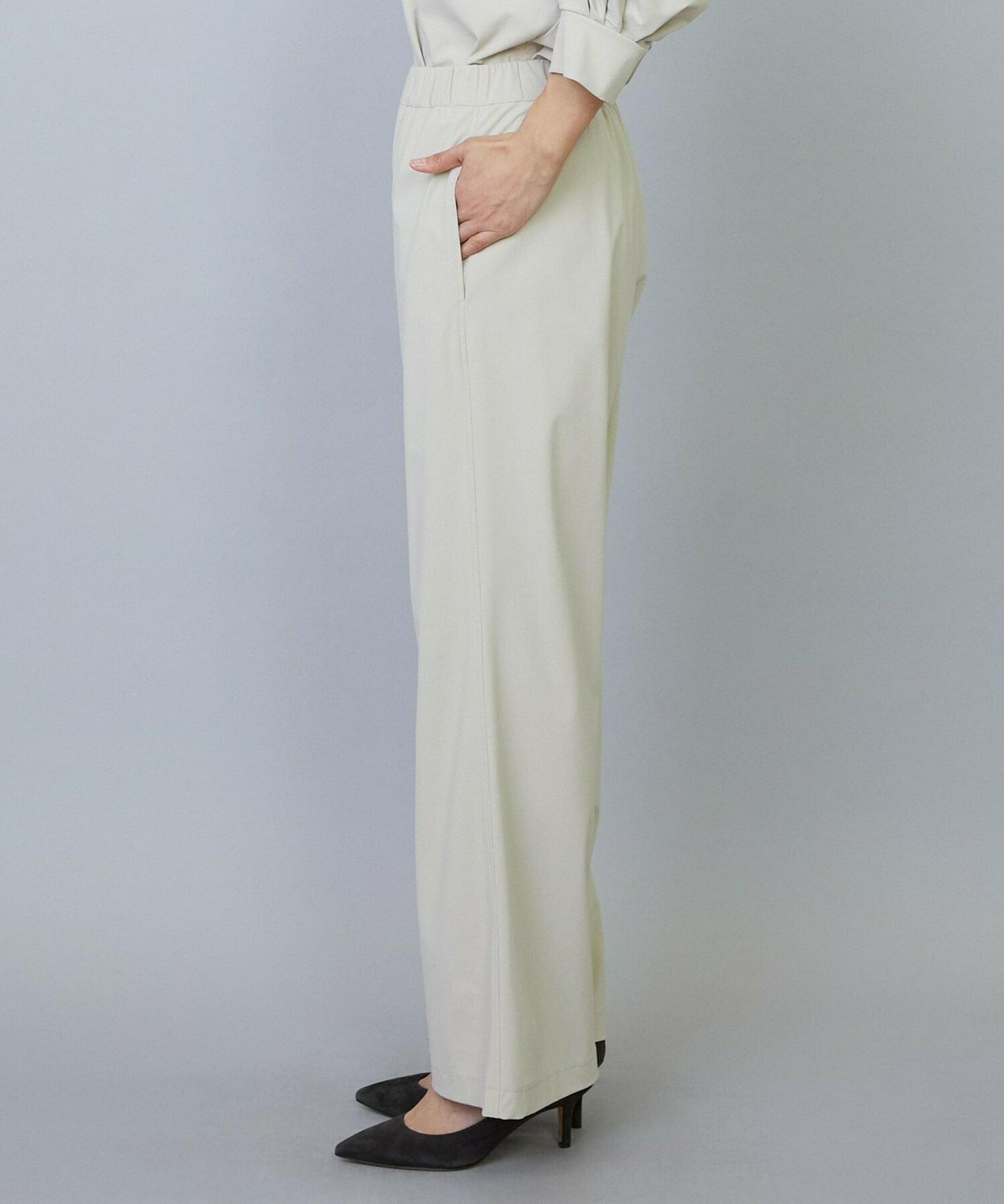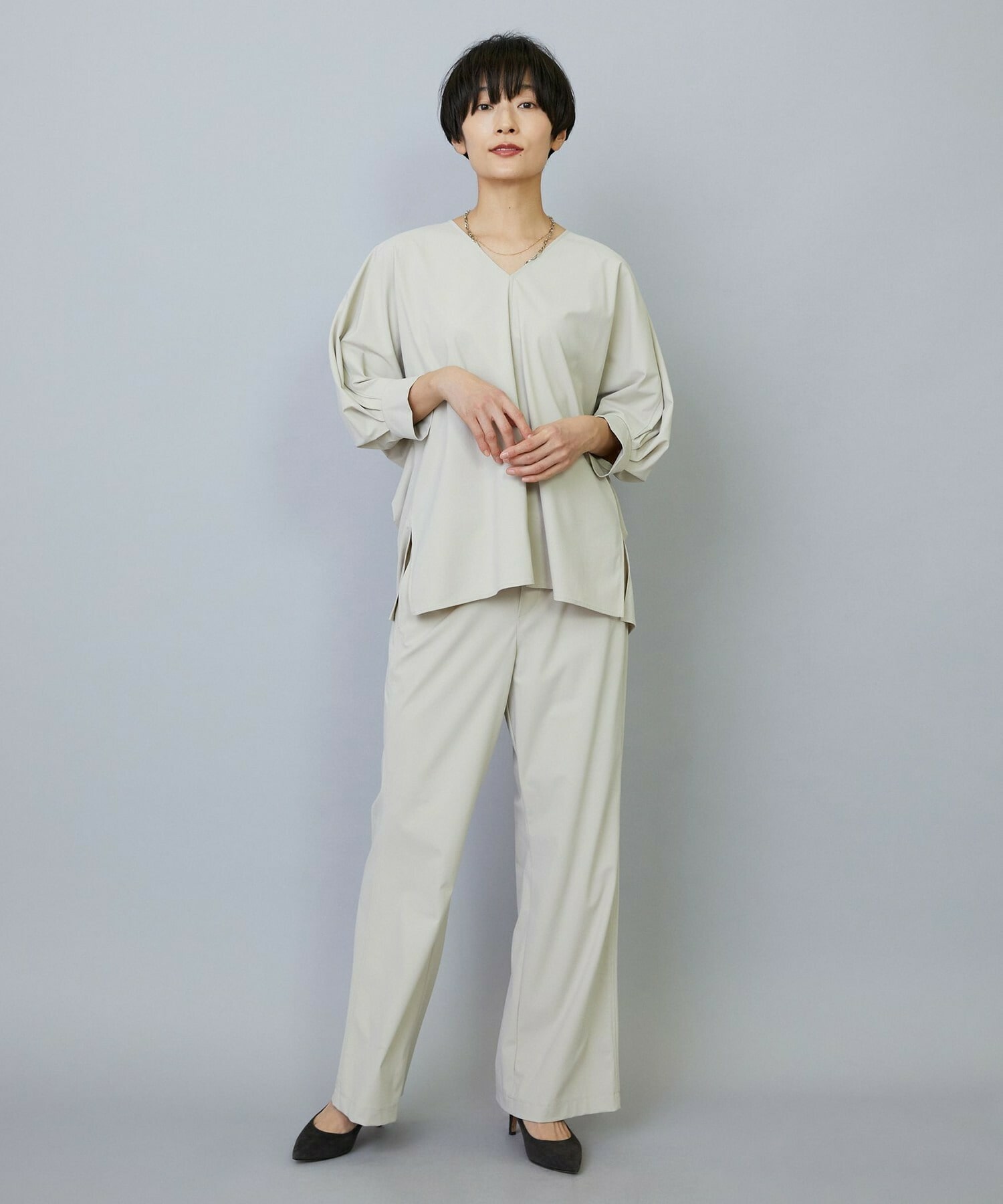トップスと同様に少し前方にズラした脇線をタックでポイントにしたイージーパンツ。少し高めの膝位置でラインを入れ、スッキリとしたストレートラインに仕上げました。同素材のトップスとのセットアップコーディネートがオススメです。