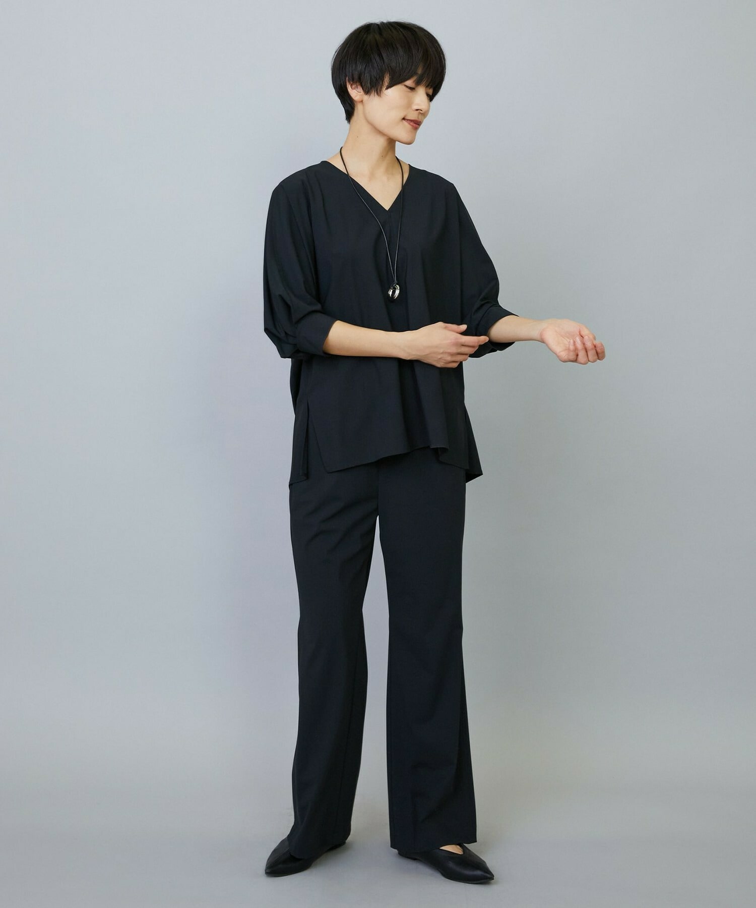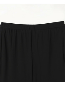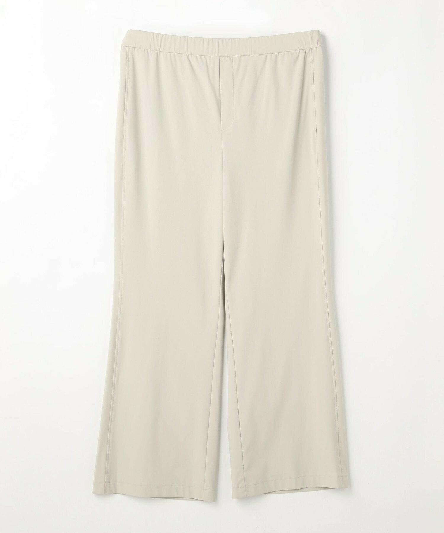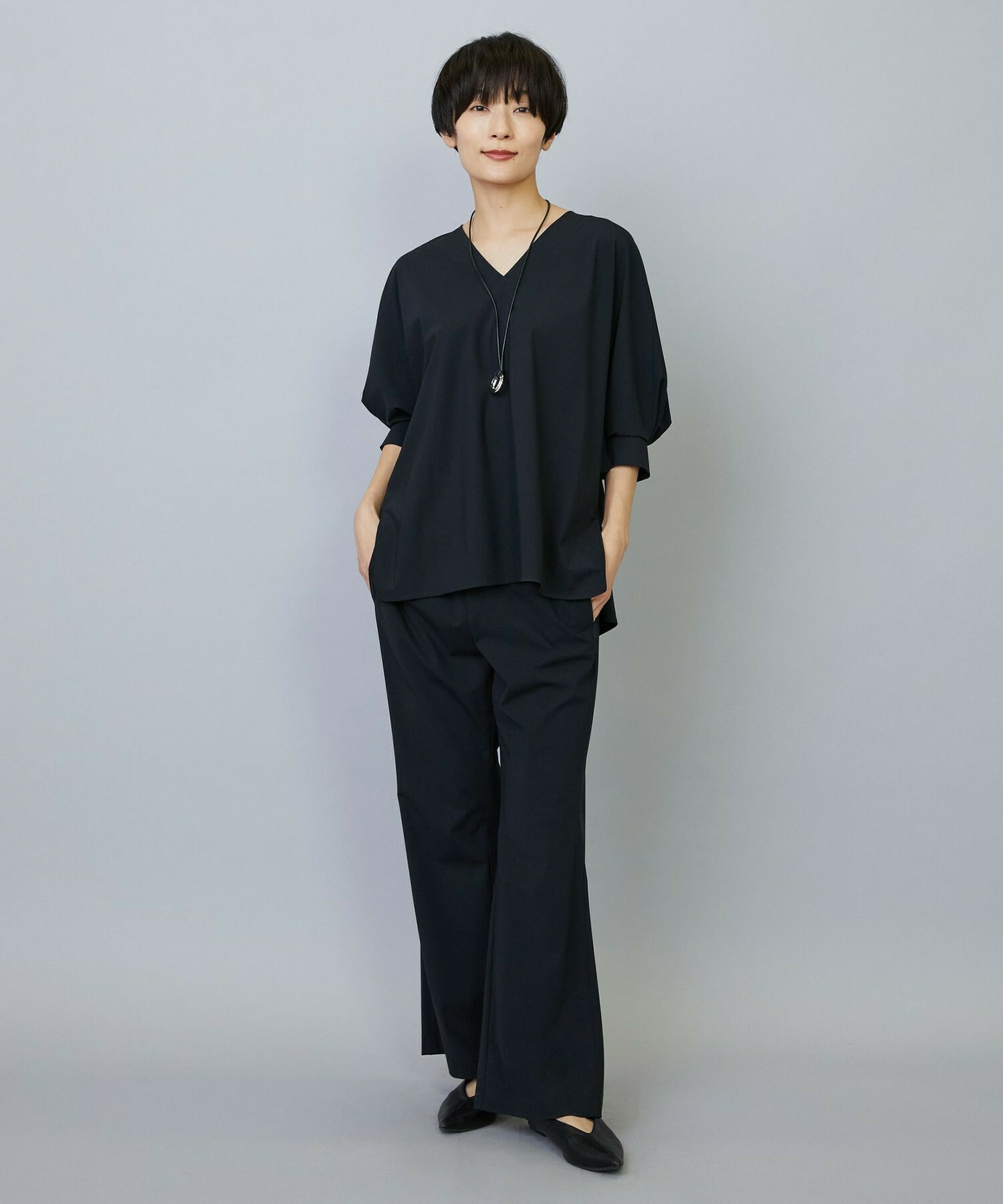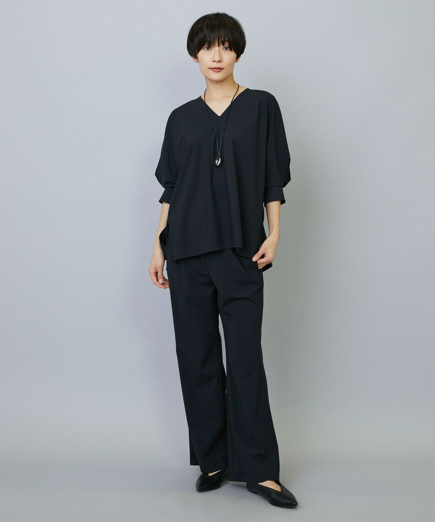 トップスと同様に少し前方にズラした脇線をタックでポイントにしたイージーパンツ。少し高めの膝位置でラインを入れ、スッキリとしたストレートラインに仕上げました。同素材のトップスとのセットアップコーディネートがオススメです。