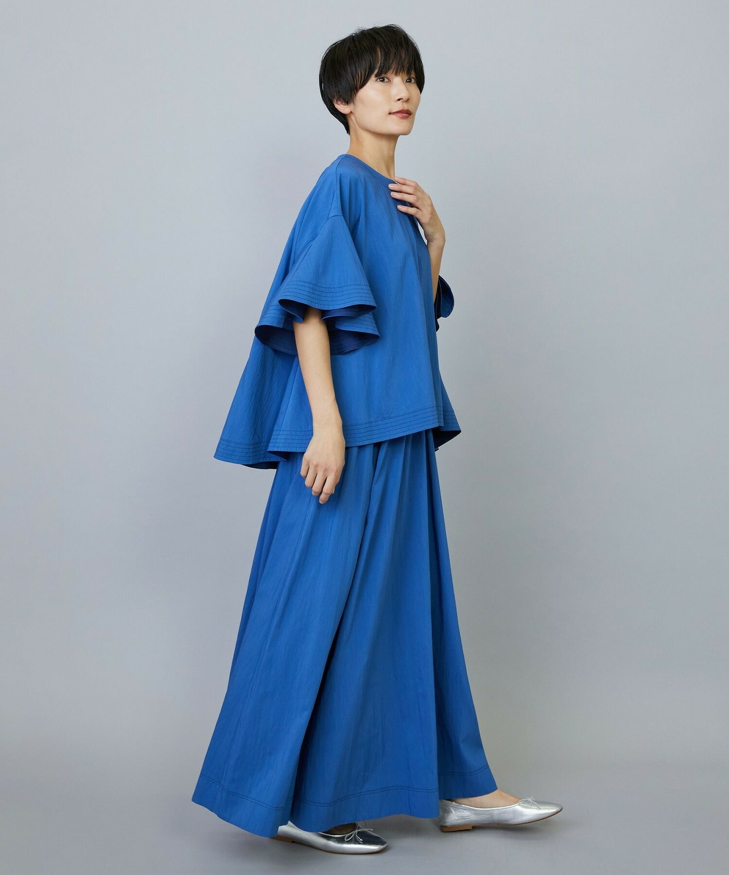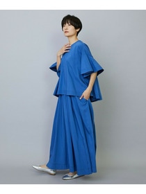 ウエストゴムで快適な仕上がり。トップスに同素材ブラウスで華やかに着ていただけます。