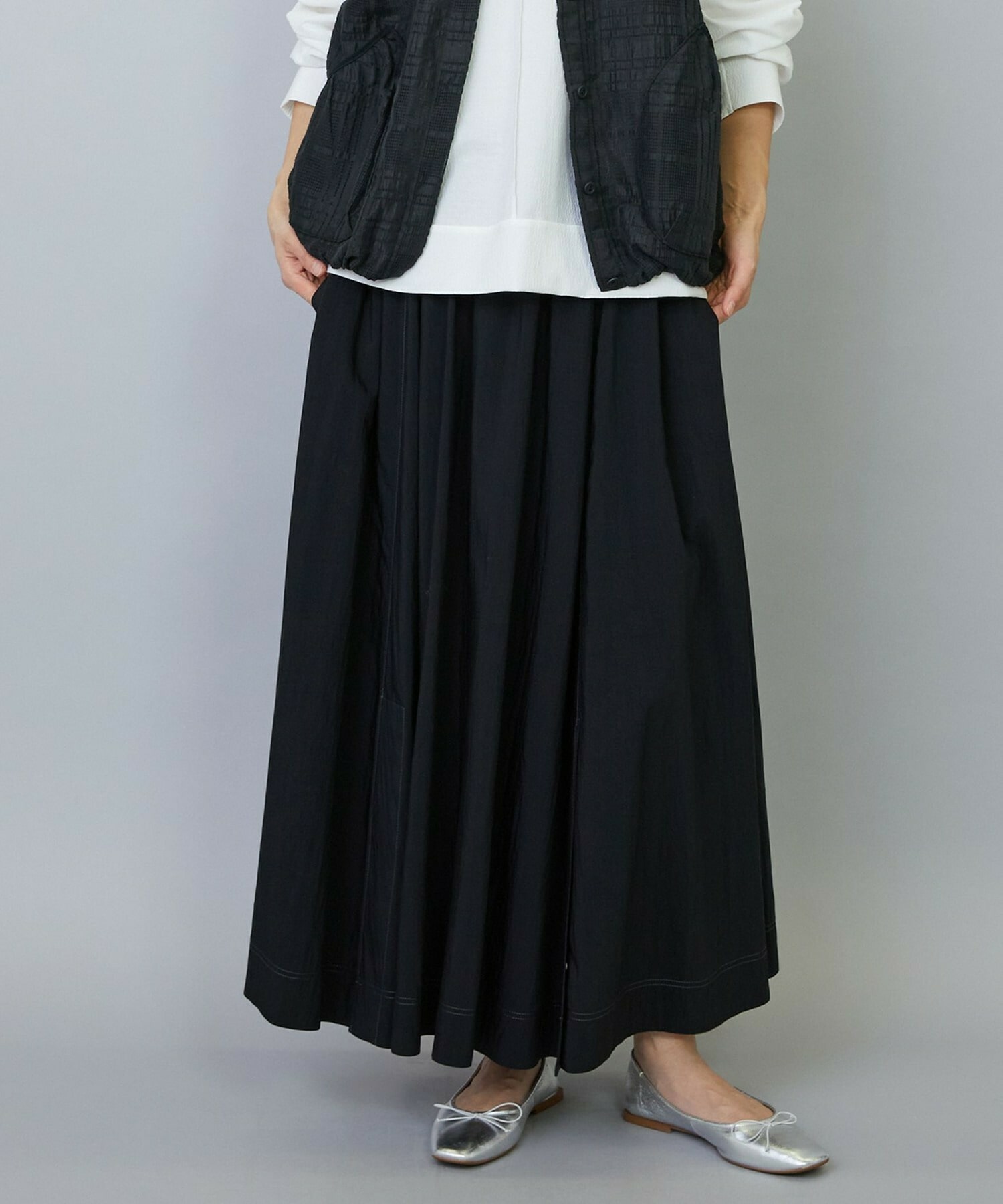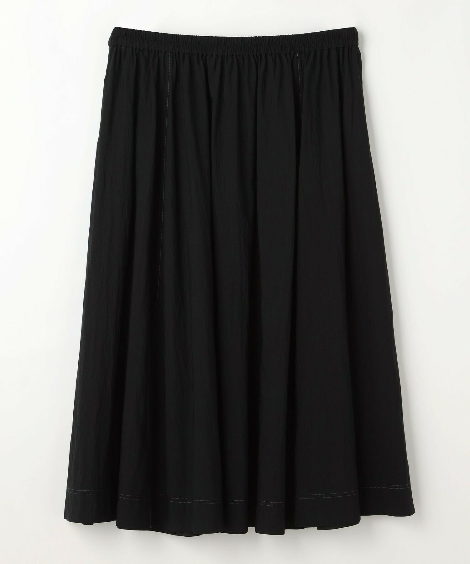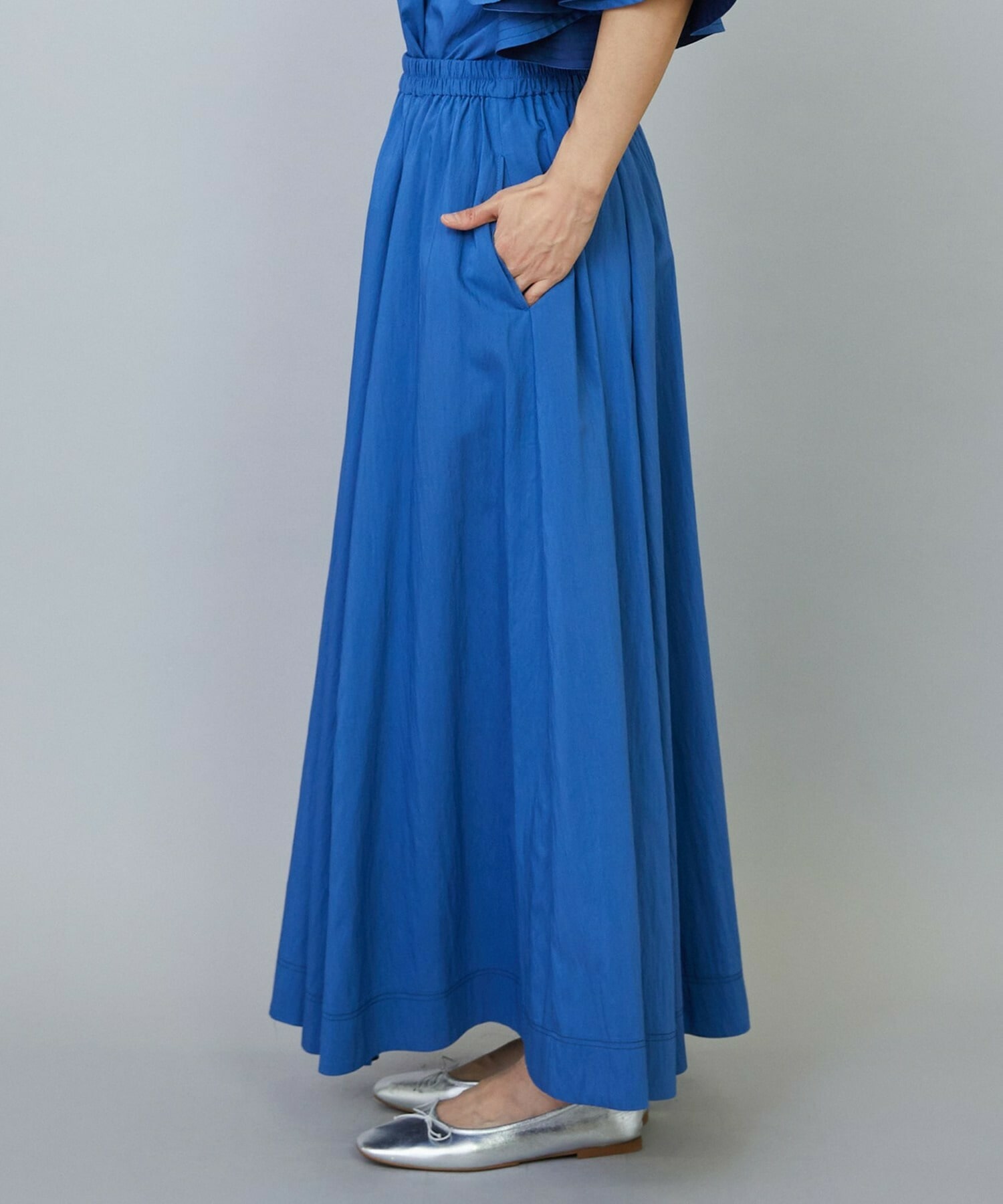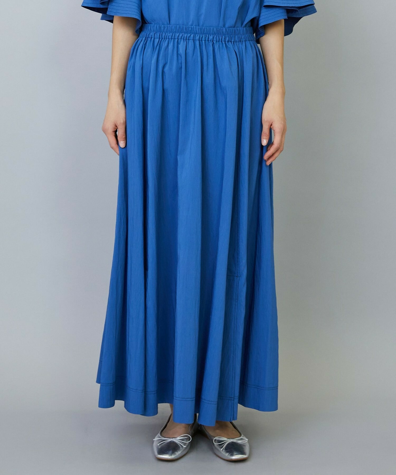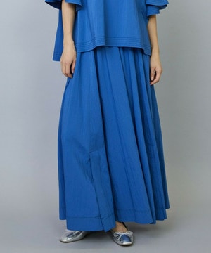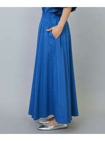 ウエストからギャザーと裾に向けてたっぷり入ったフレアー分量がしなやかで女性らしいロングスカート。