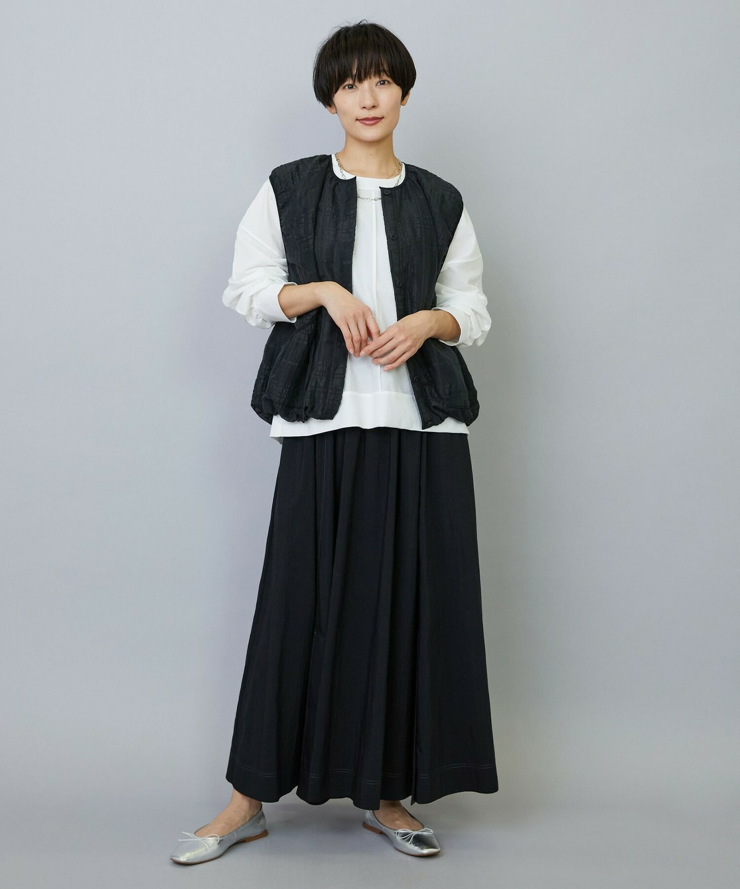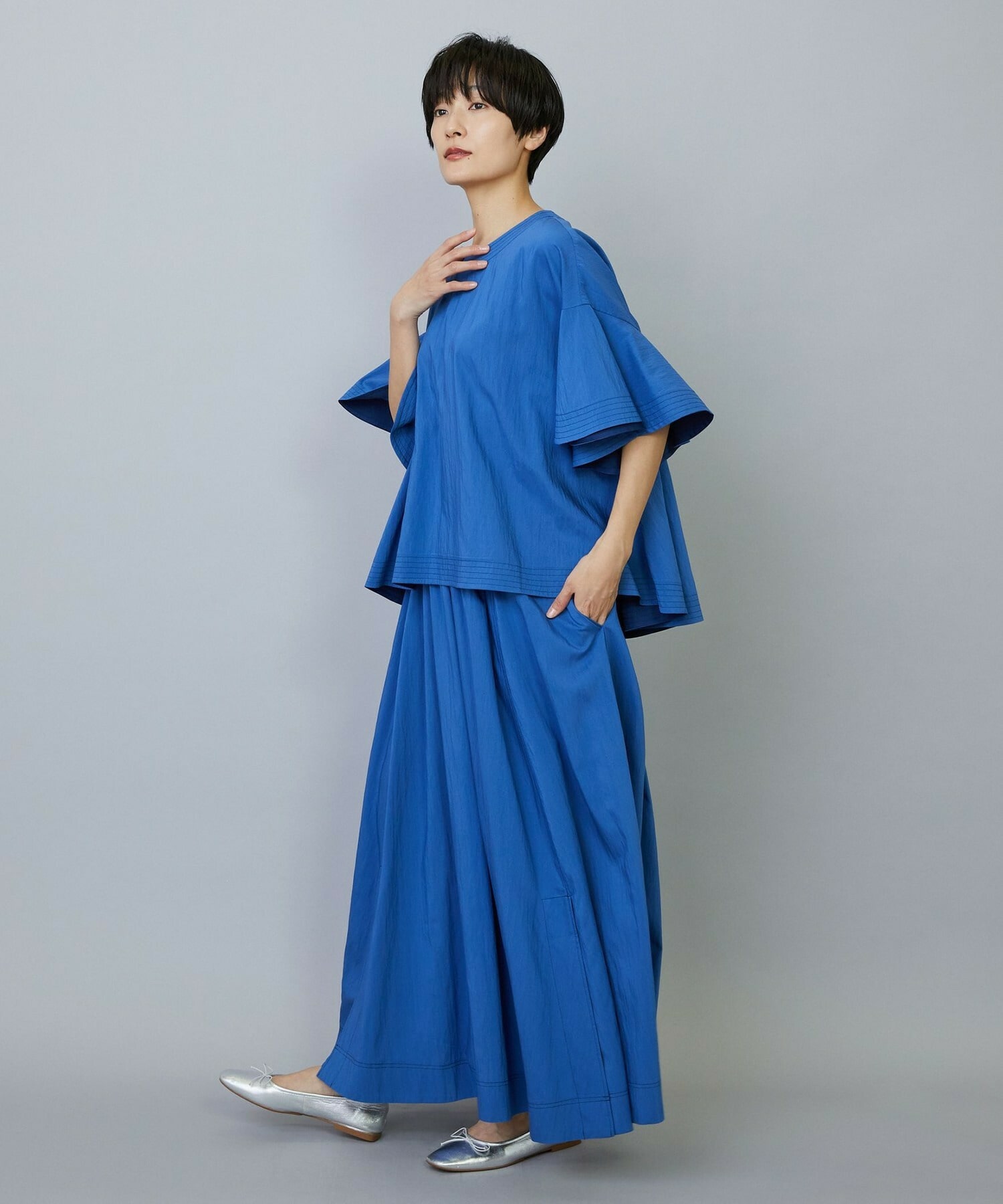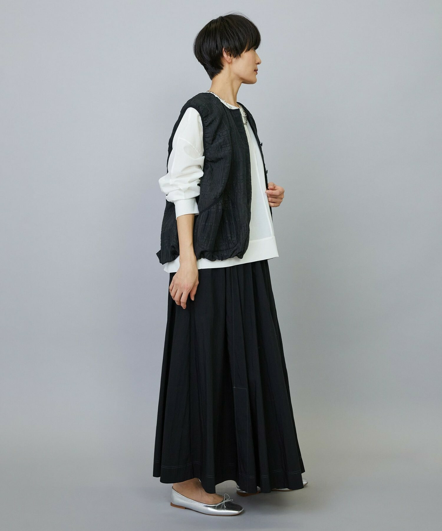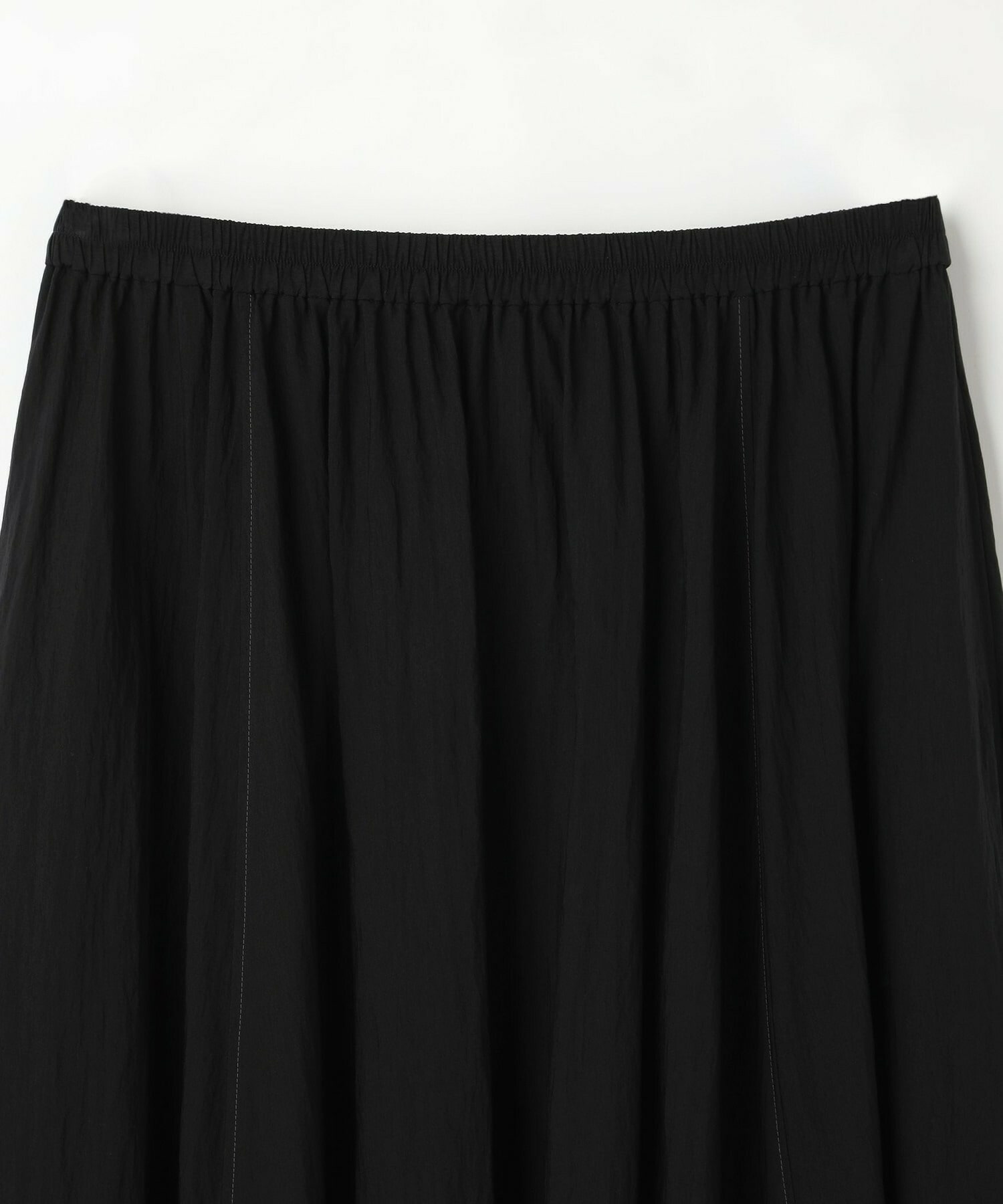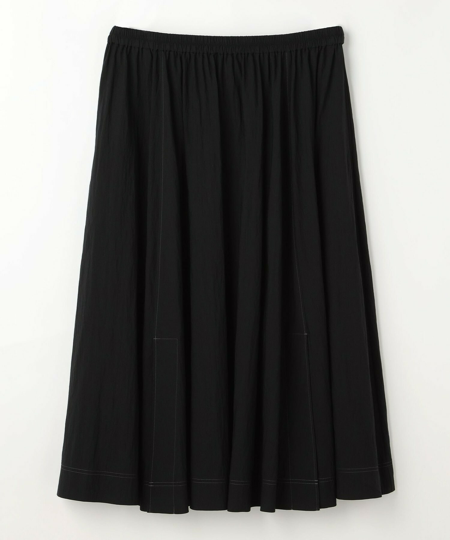 ウエストからギャザーと裾に向けてたっぷり入ったフレアー分量がしなやかで女性らしいロングスカート。