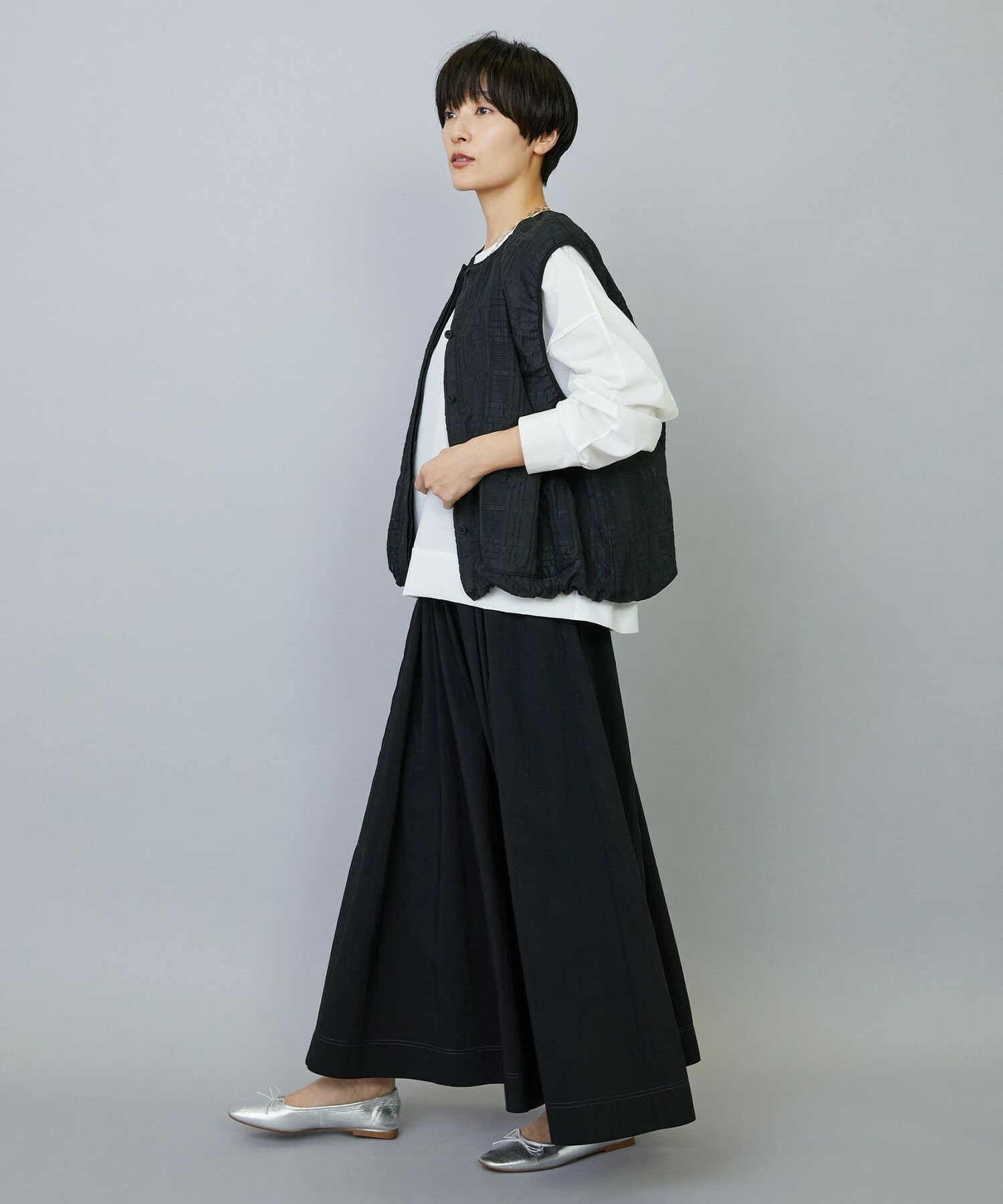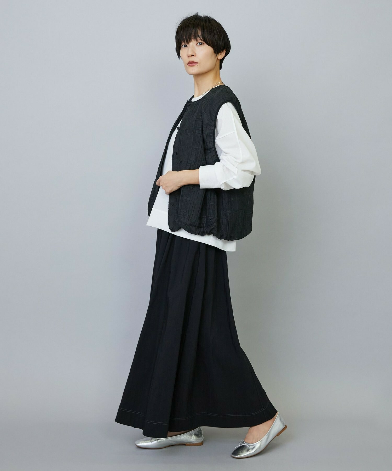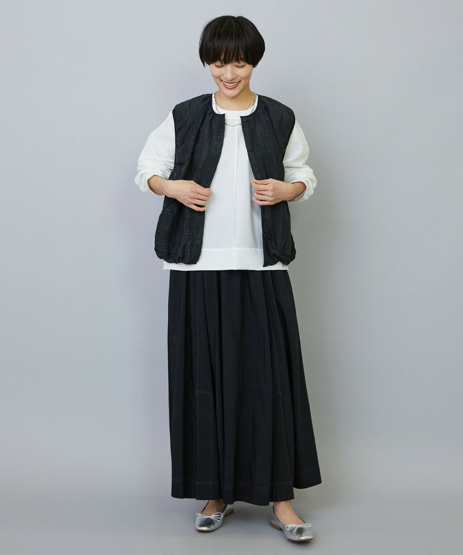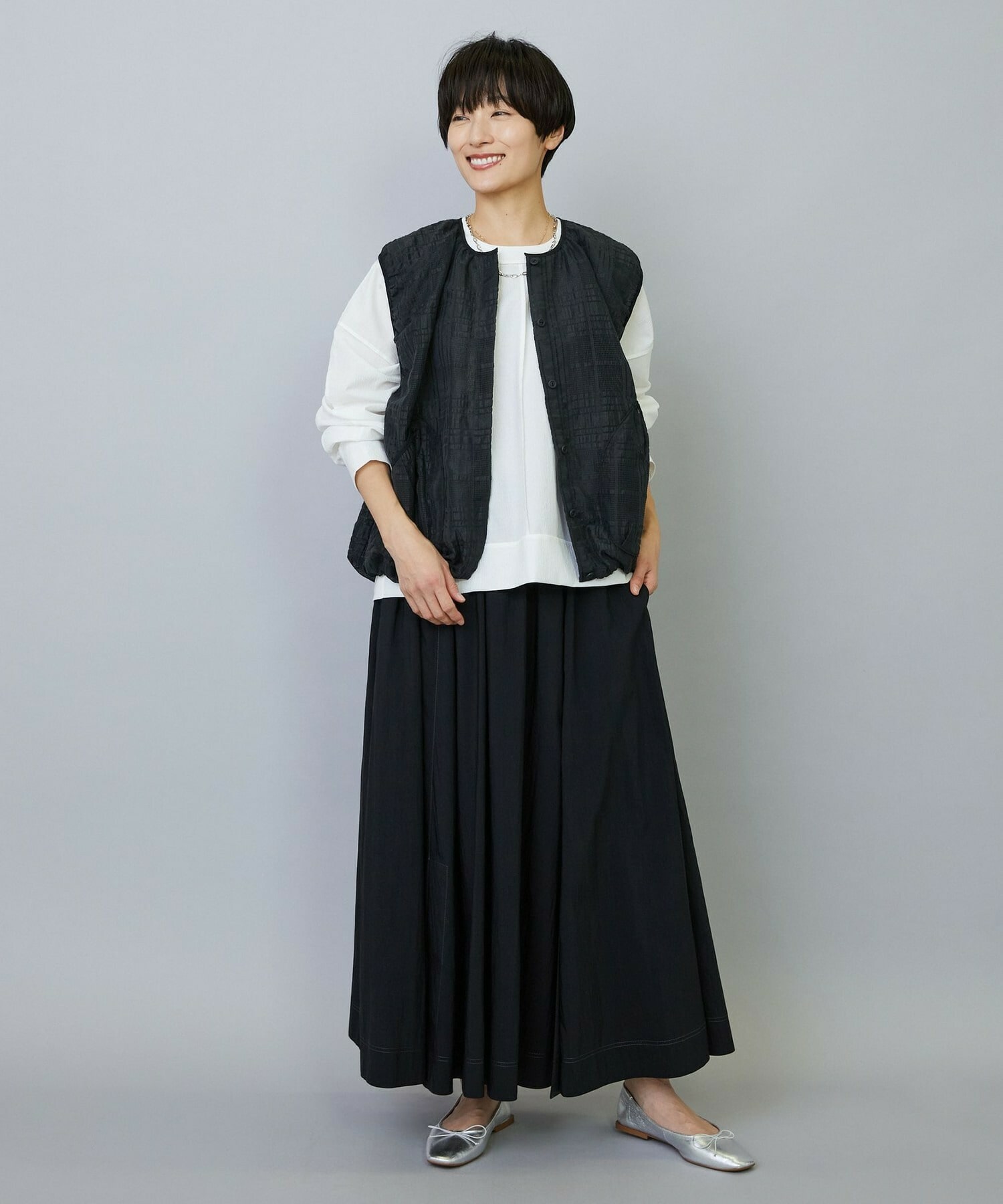 ウエストからギャザーと裾に向けてたっぷり入ったフレアー分量がしなやかで女性らしいロングスカート。