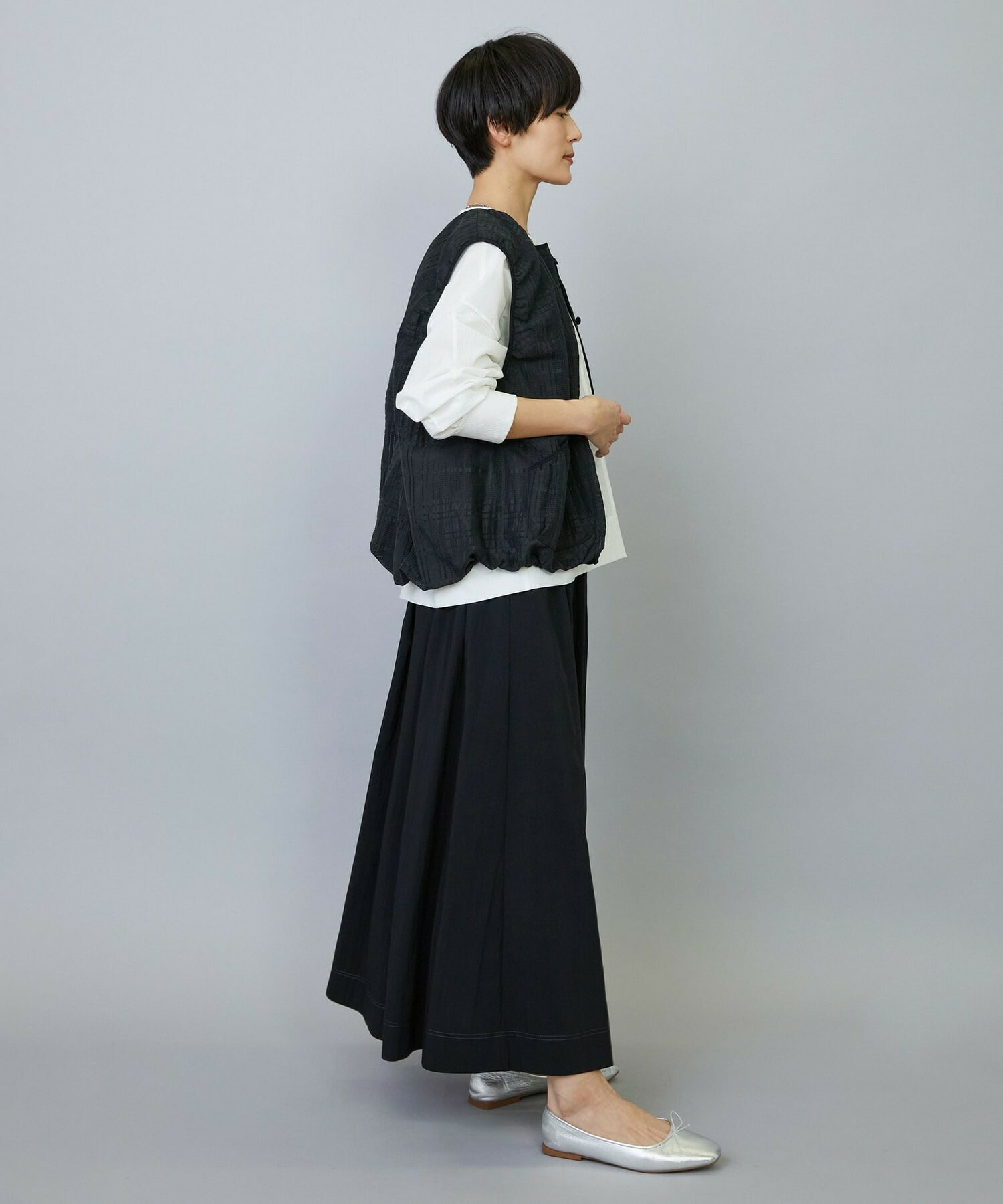 これほどギャザーがありながらウエスト周りがもたつかず美しいシルエットがキープできるように仕上げてますので、苦手意識をお持ちの方でもお薦めです。