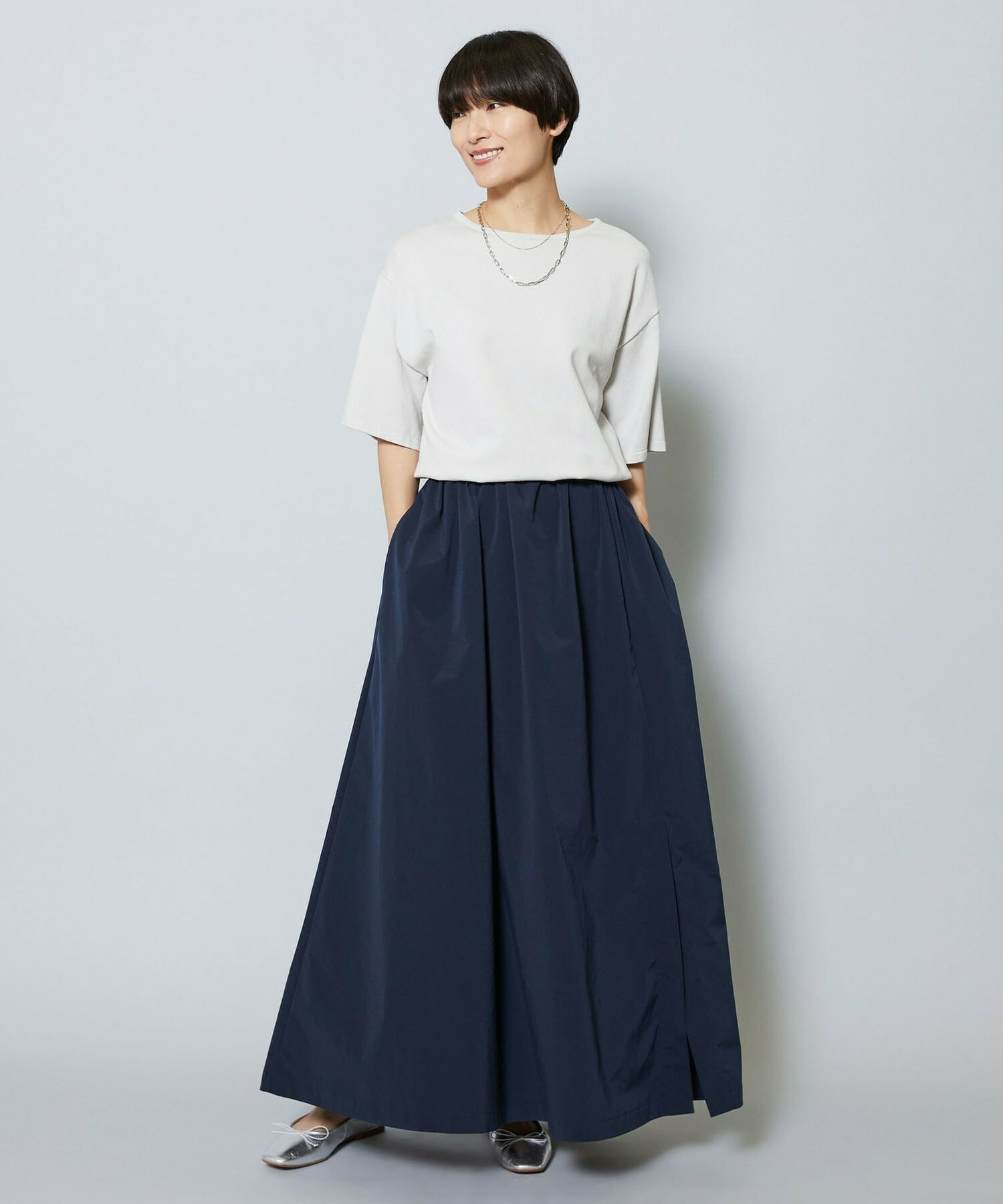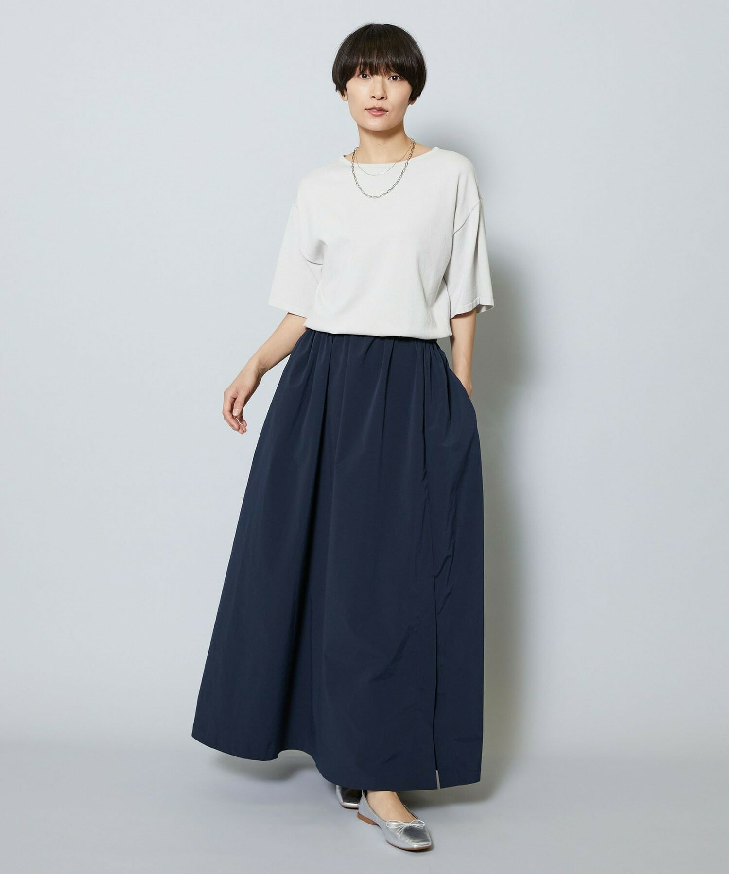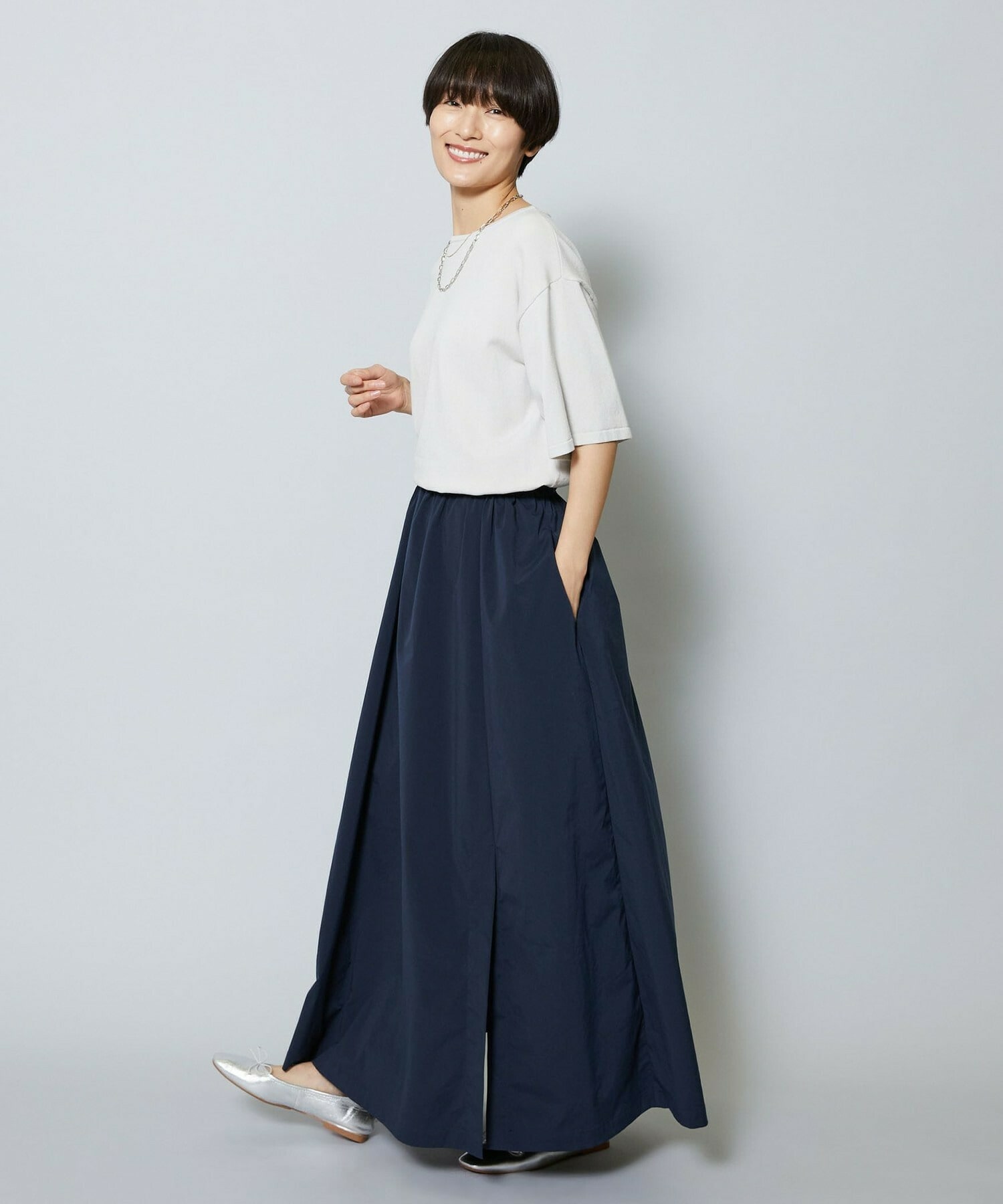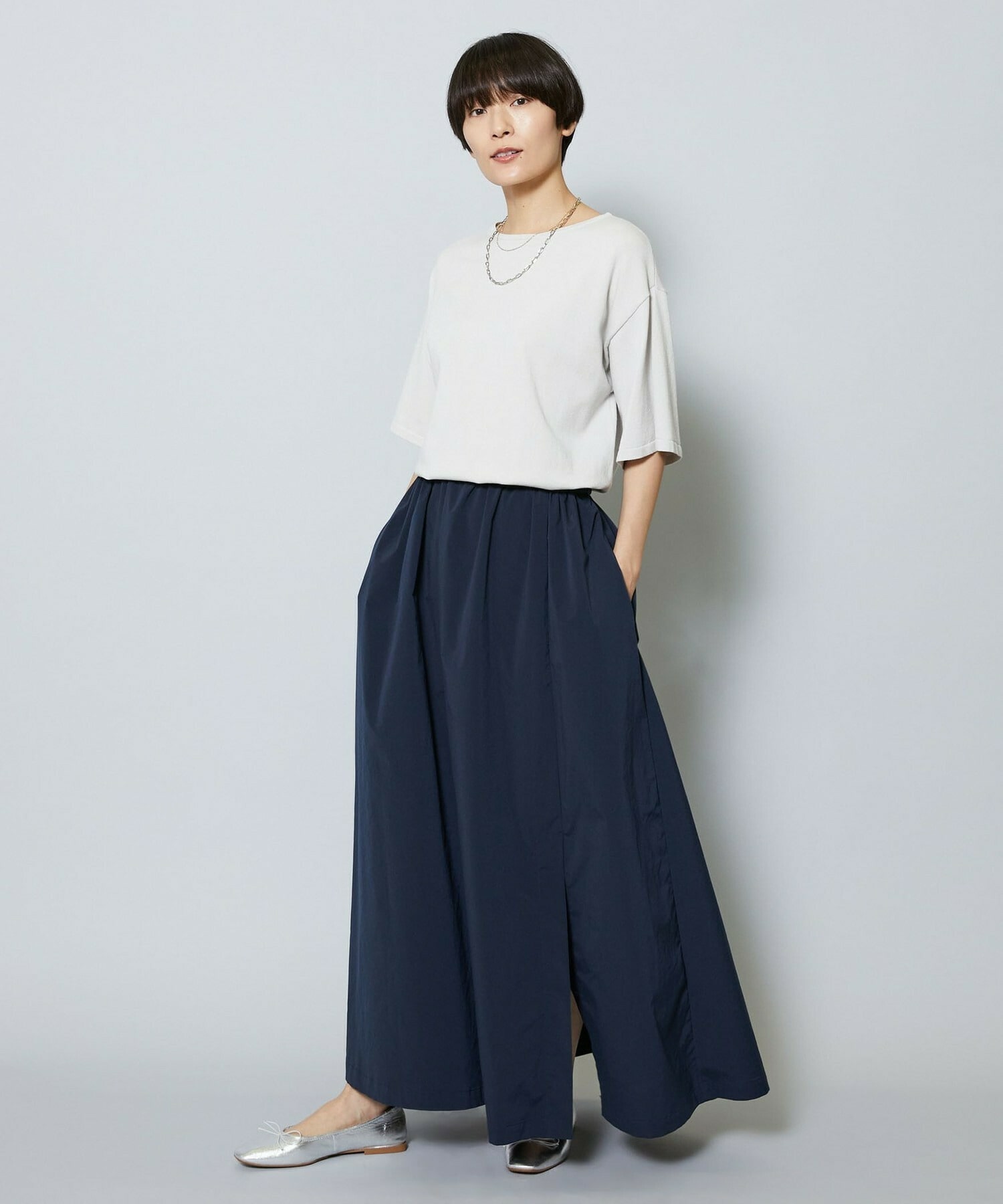 長めのスカートの片サイドにベンツスリットをあけて動きにアクセントをつけています。ウエストに入れたタックとスカートの分量感も着用のシルエットがスッキリめに美しく見えるように仕上げています。