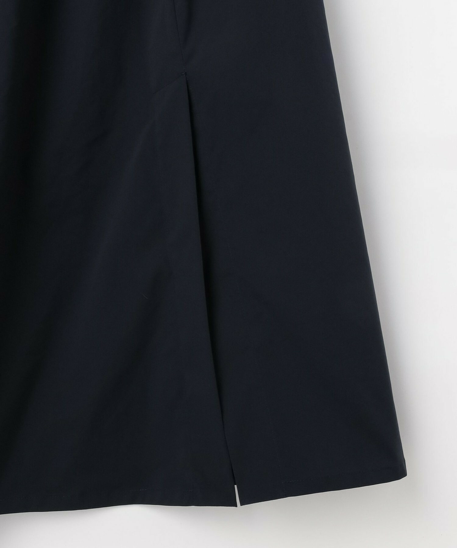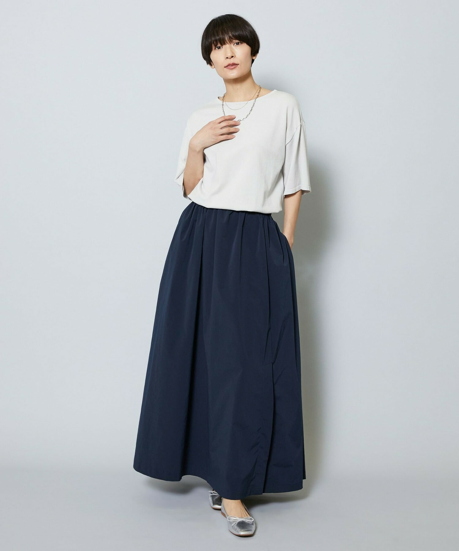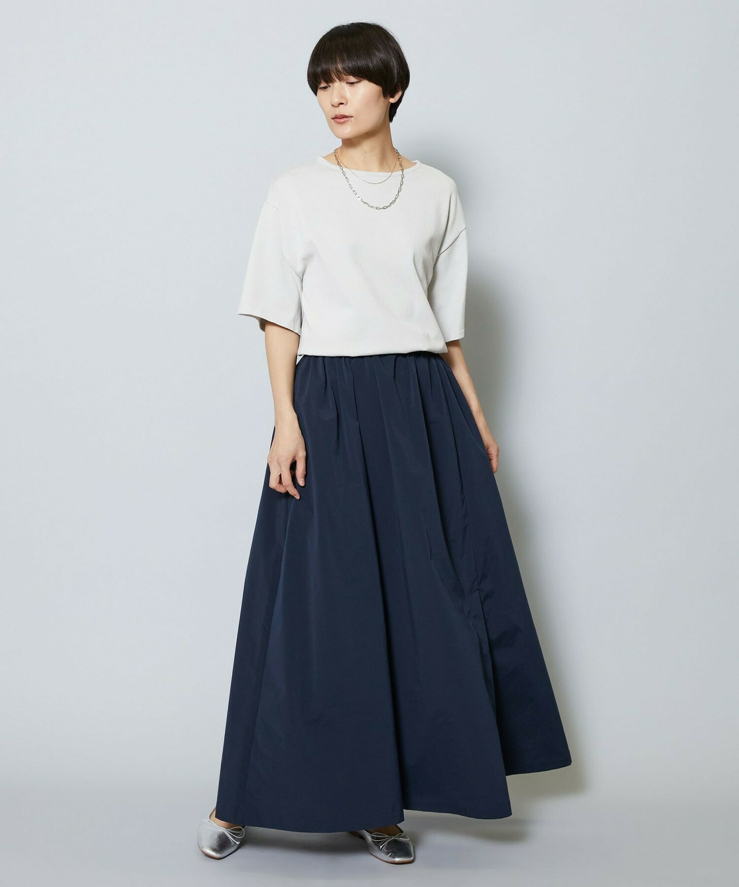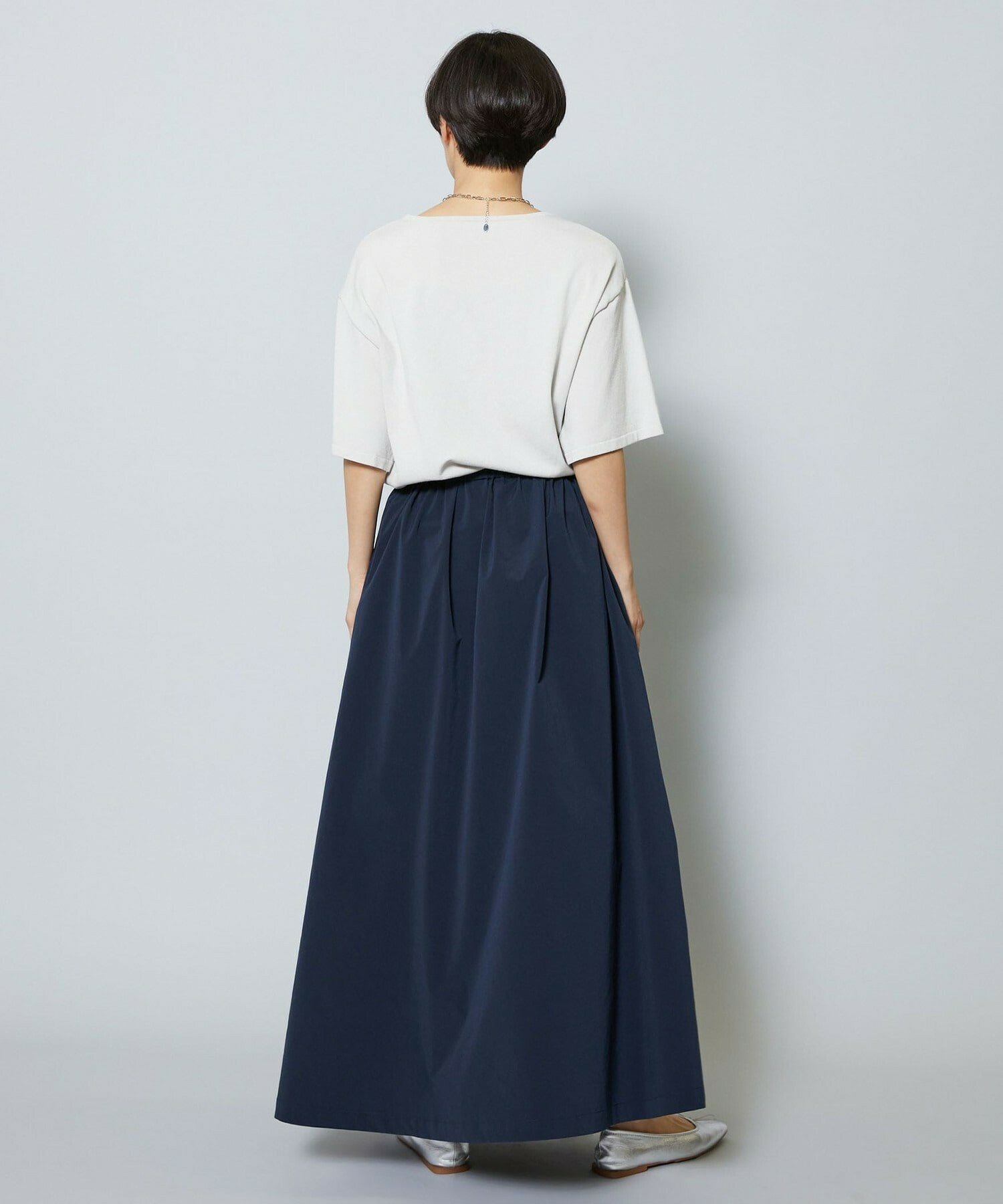 長めのスカートの片サイドにベンツスリットをあけて動きにアクセントをつけています。ウエストに入れたタックとスカートの分量感も着用のシルエットがスッキリめに美しく見えるように仕上げています。