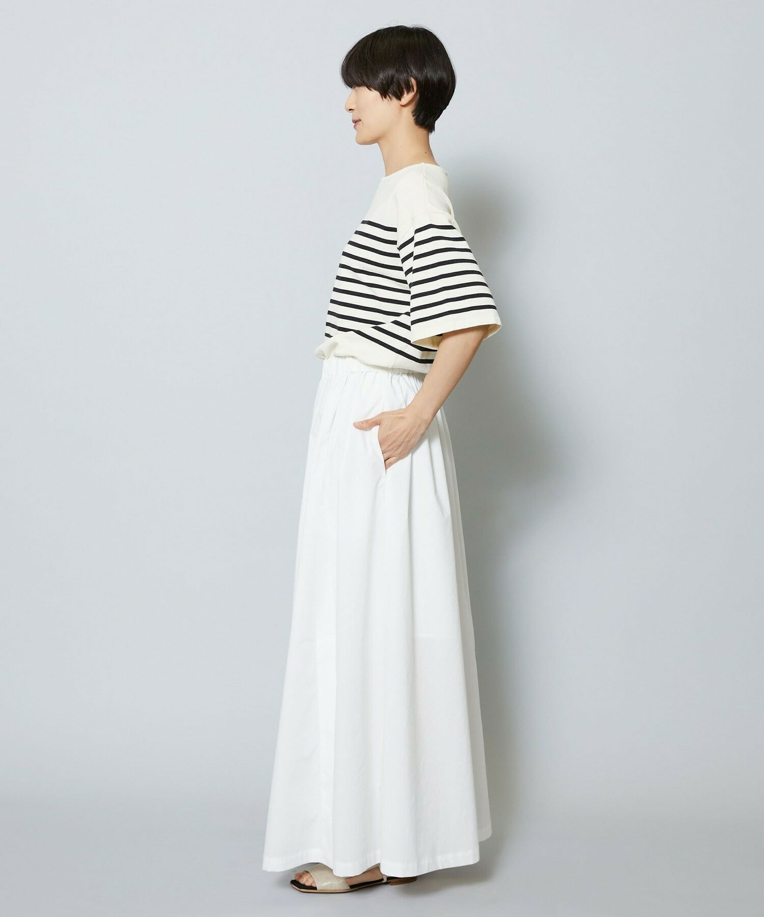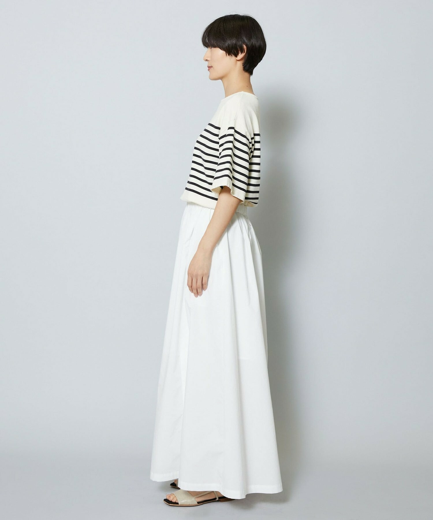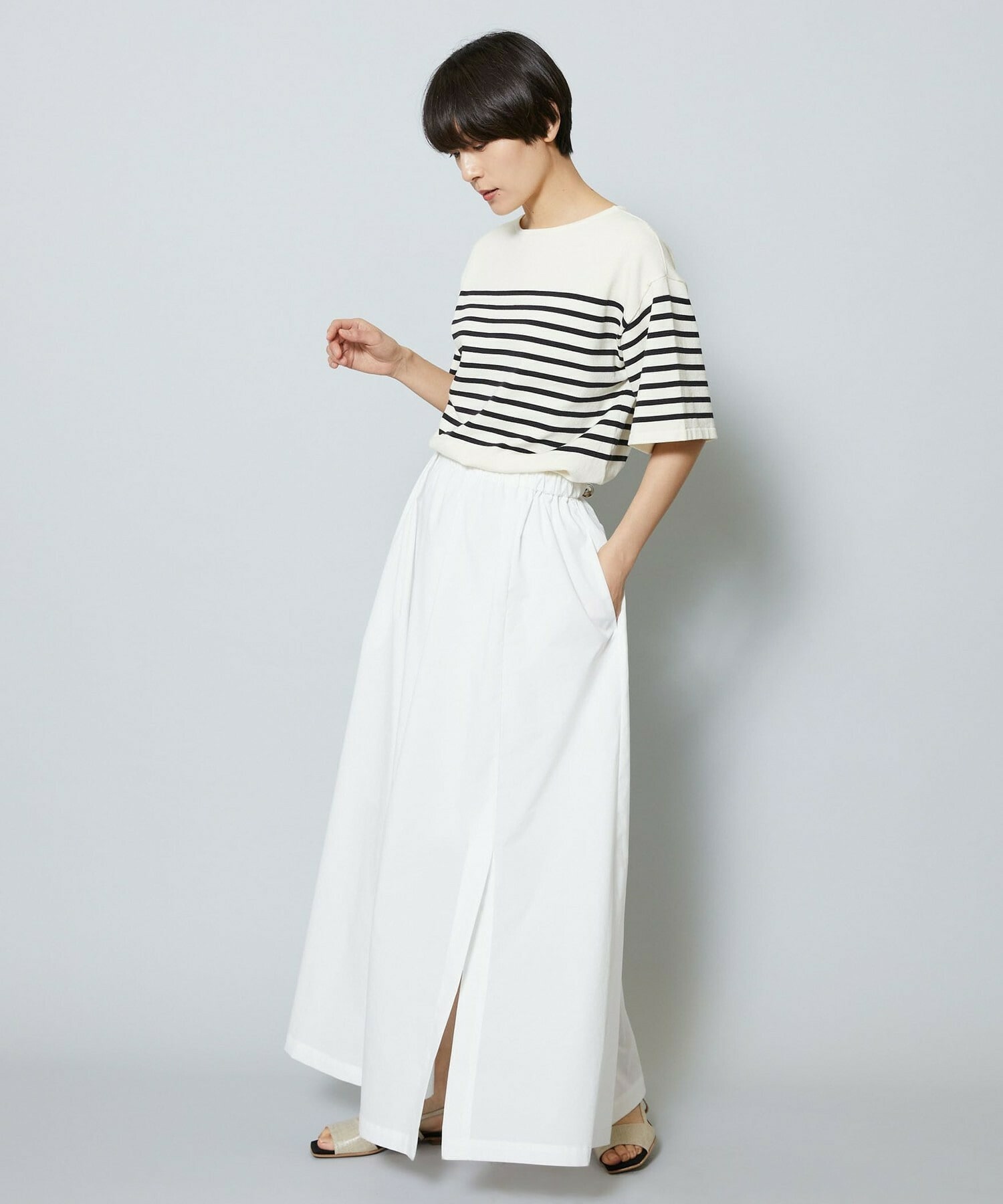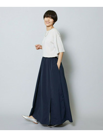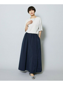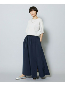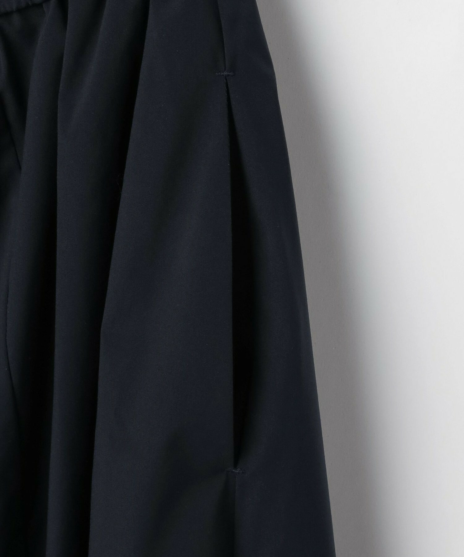 長めのスカートの片サイドにベンツスリットをあけて動きにアクセントをつけています。ウエストに入れたタックとスカートの分量感も着用のシルエットがスッキリめに美しく見えるように仕上げています。
