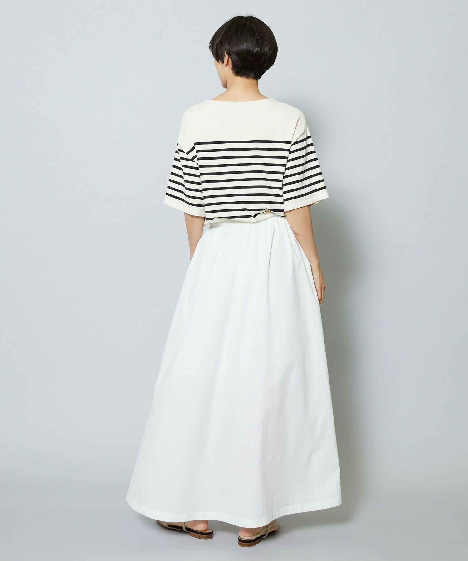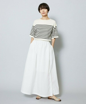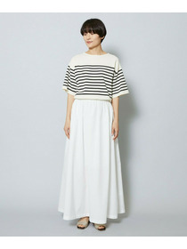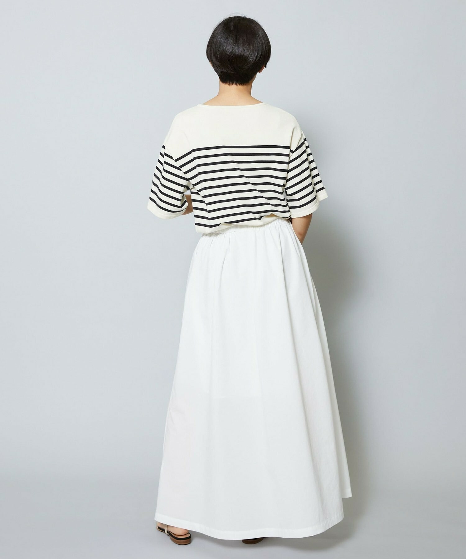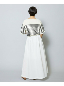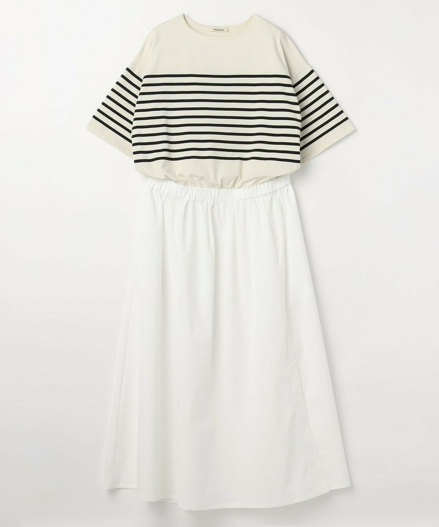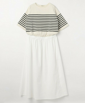 爽やかなボートネックのボーダーニットと布帛素材のスカートをコンビにしたワンピース。