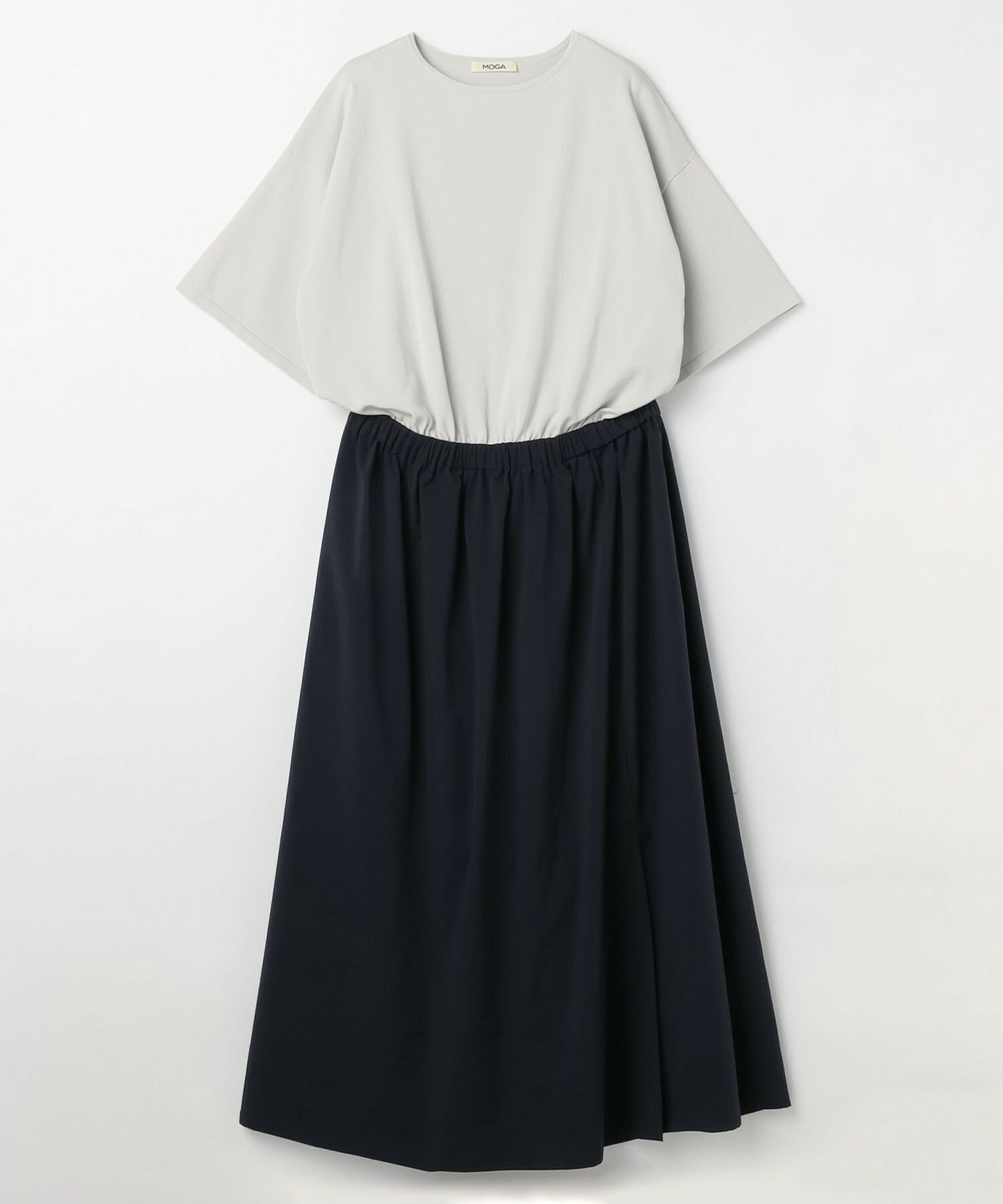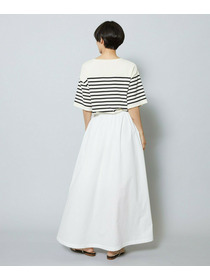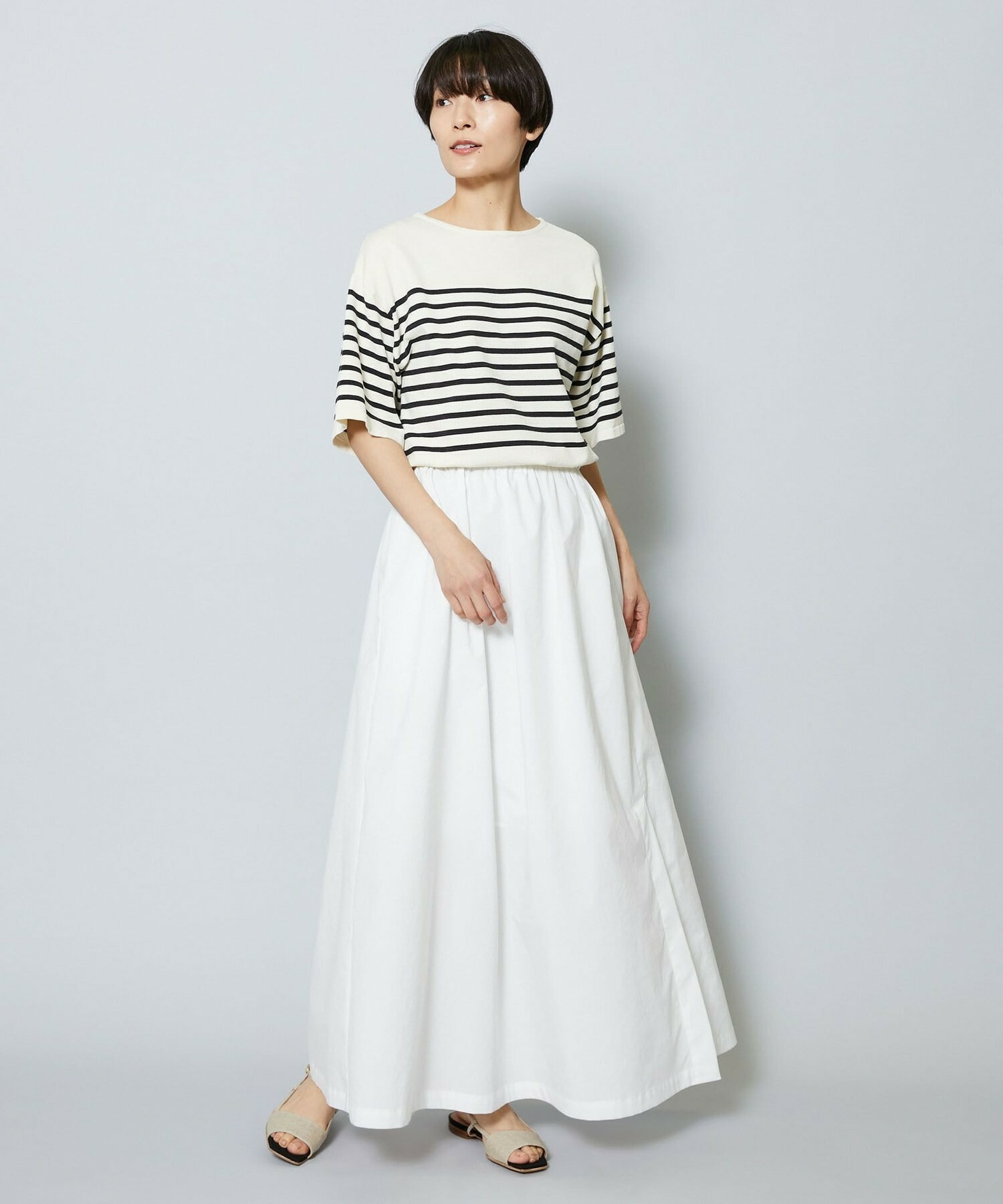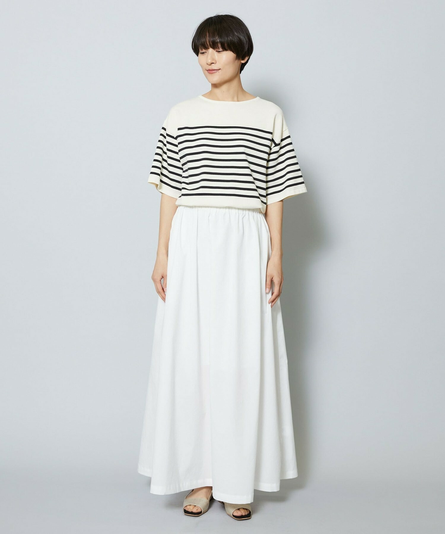 爽やかなボートネックのボーダーニットと布帛素材のスカートをコンビにしたワンピース。