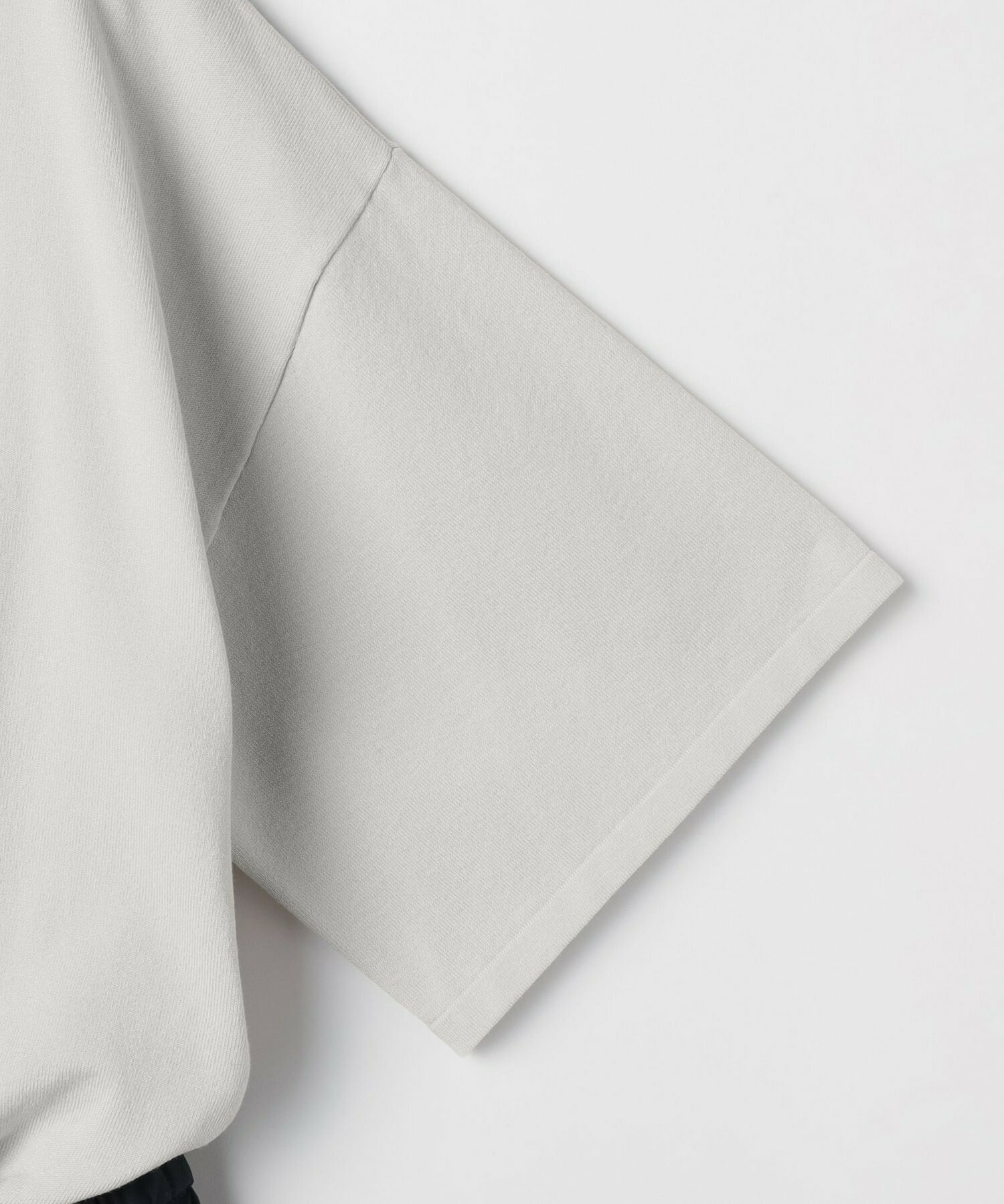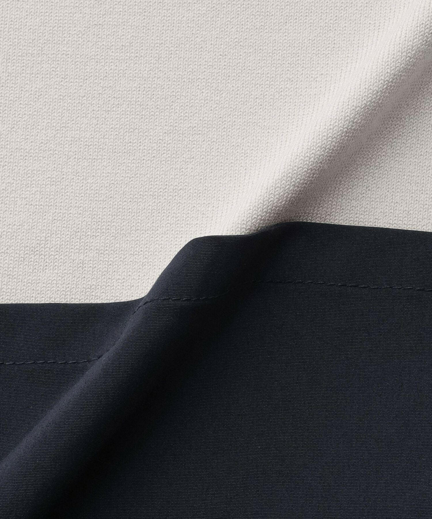 有機栽培で作られた綿花を原料にしたオーガニックコットンと天然の木を主原料としたアセテートの細番手の交撚糸とストレッチ糸を使用して編み立て、形態安定を持たせています。