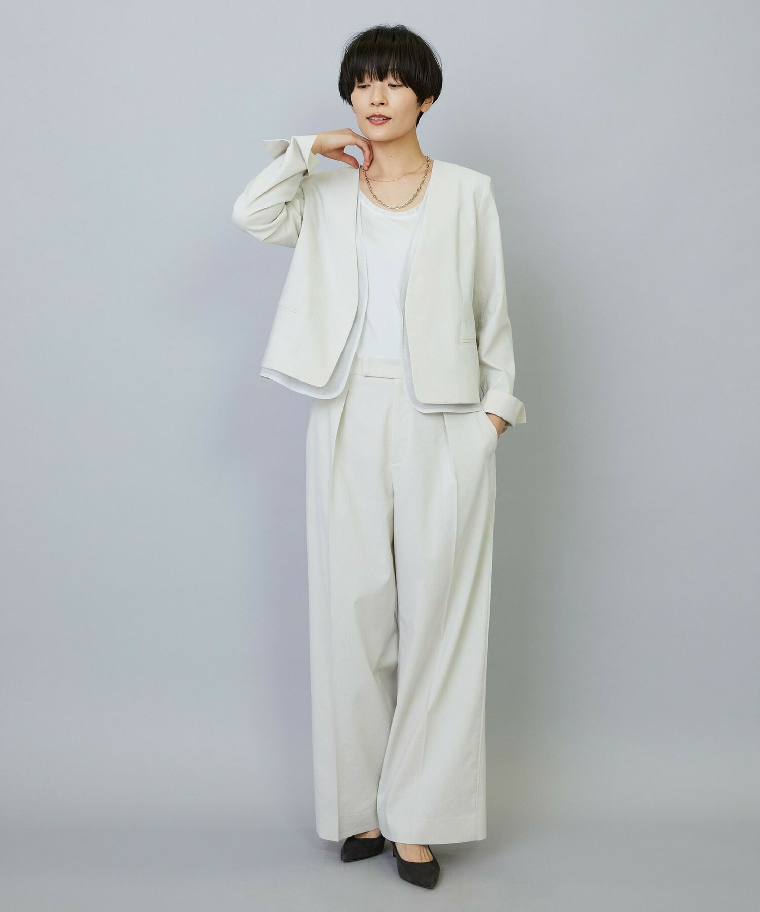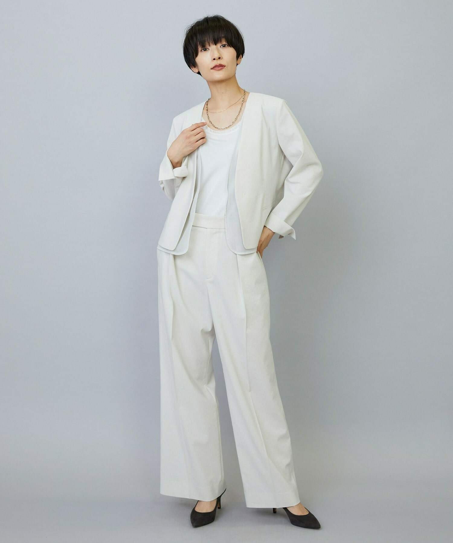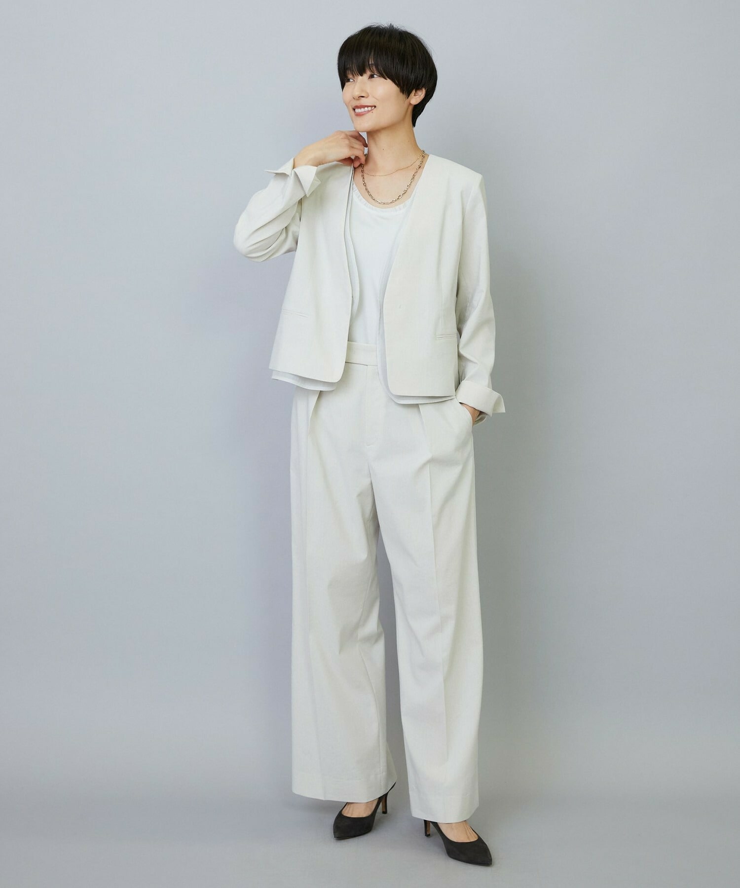 同素材のパンツとセットアップで洗練された大人のスタイルアップを楽しめます。