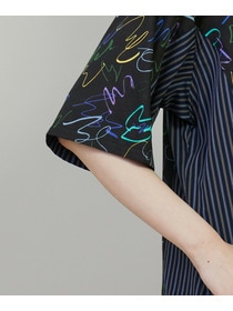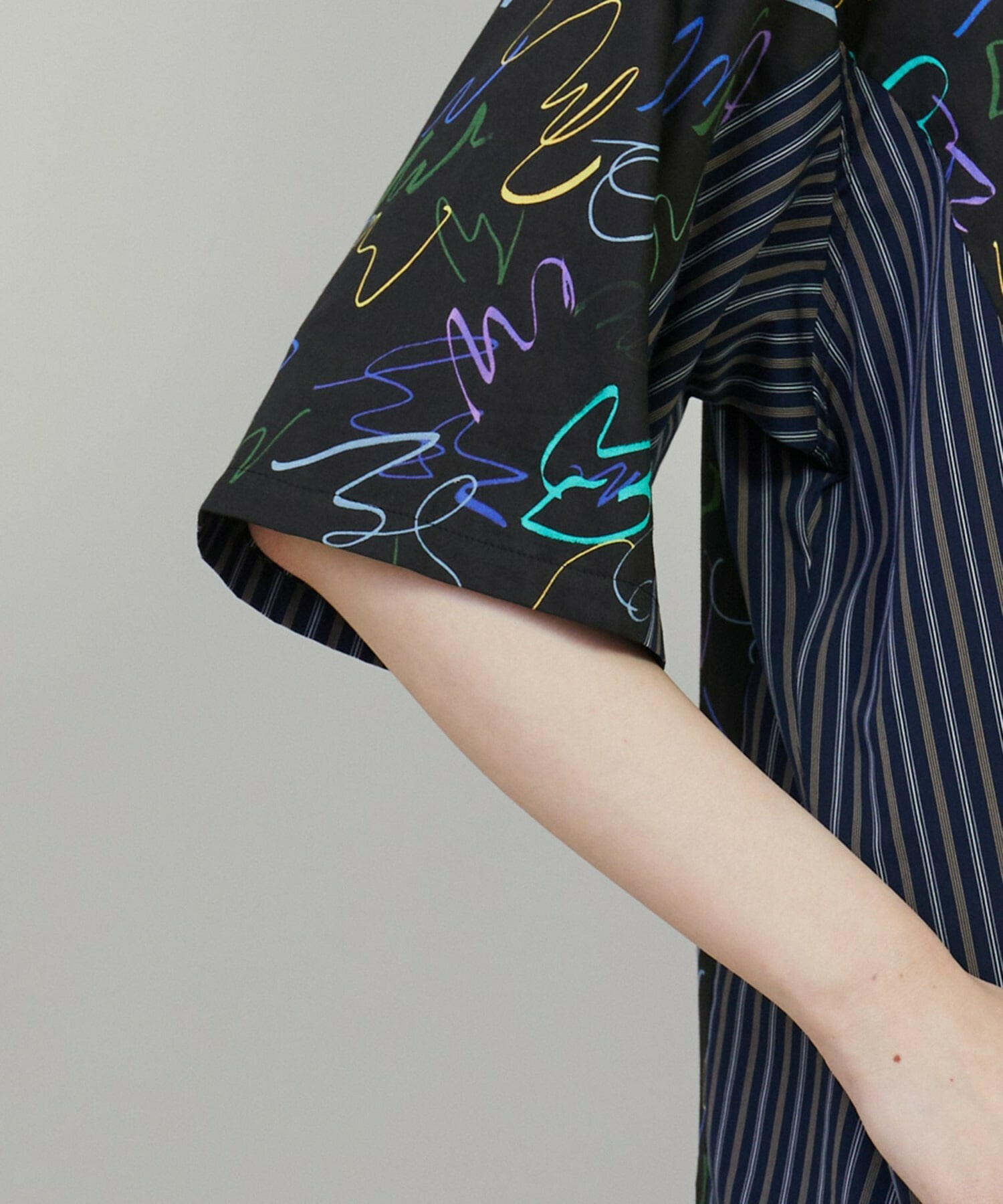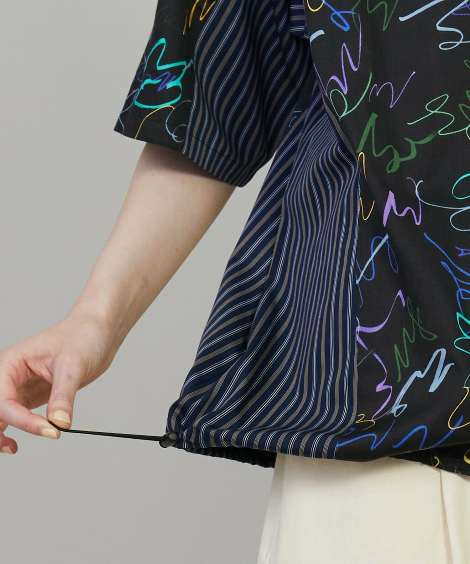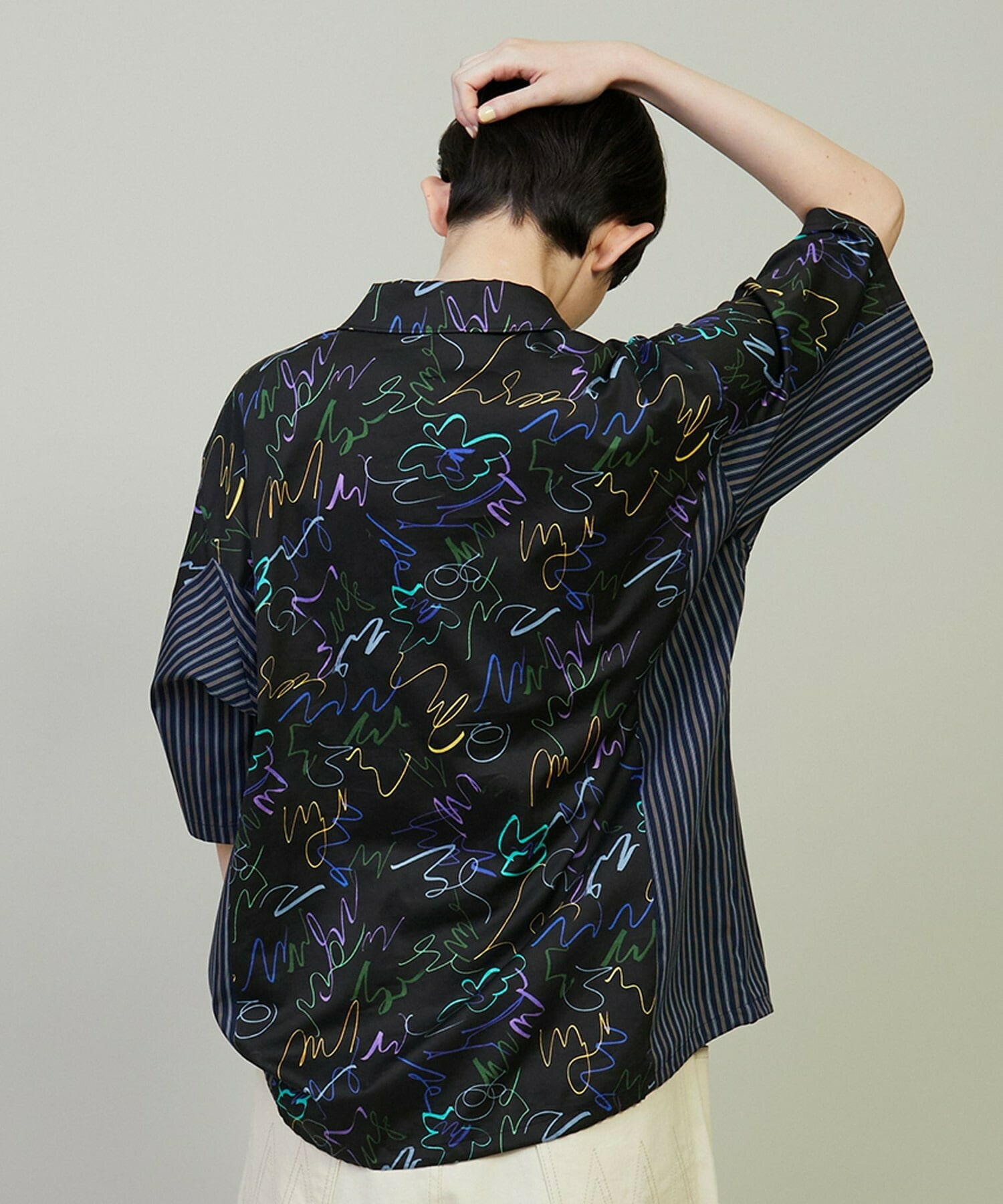カラフルでリズミカルなスケッチ風の抽象的な柄を綿サテンにプリントした柔らかで上品な光沢感の生地とトラッドなストライプの生地を組み合わせています。