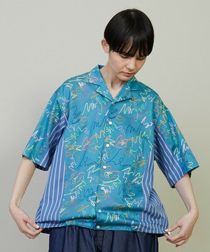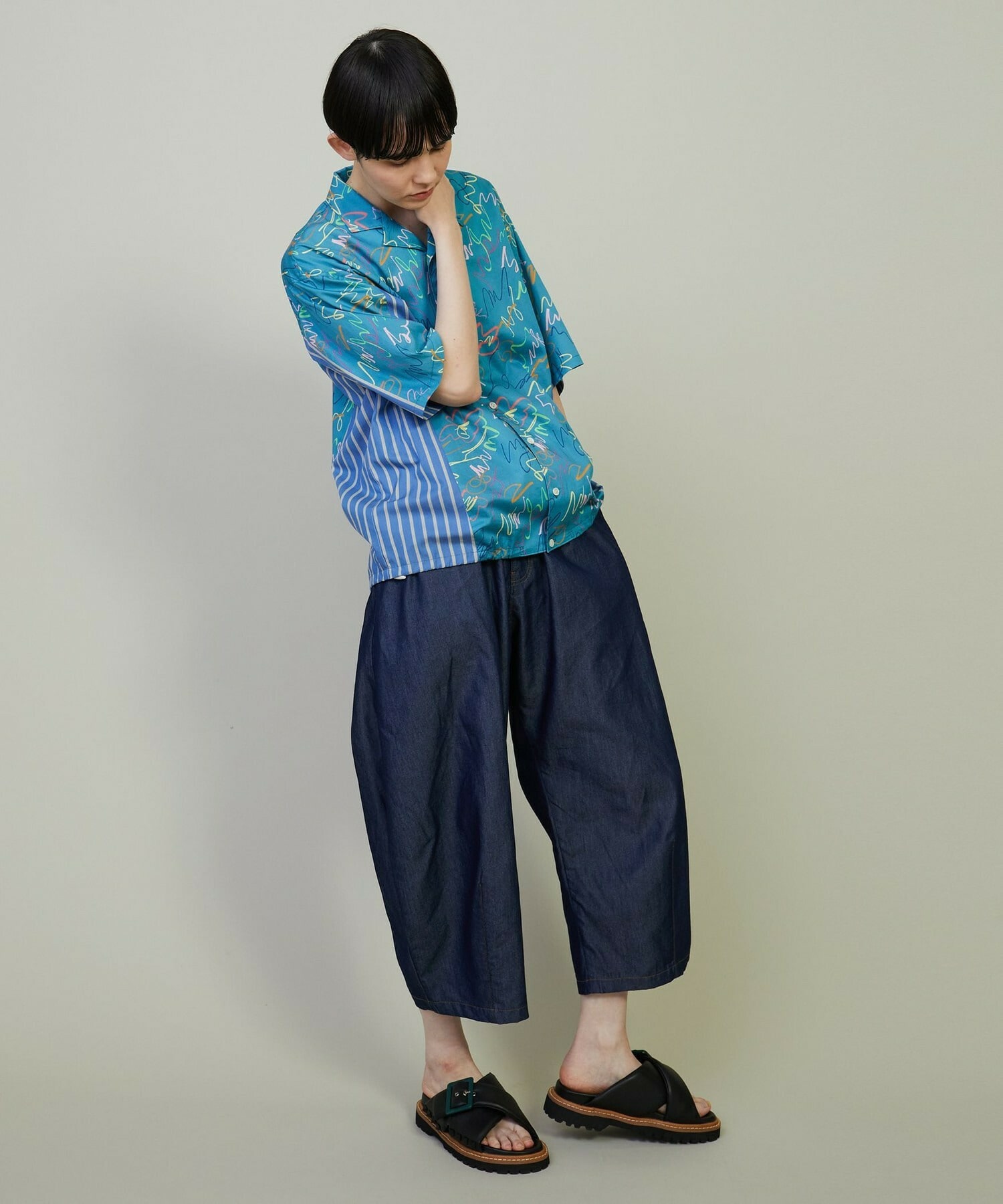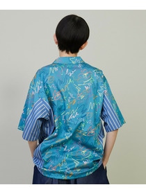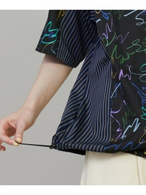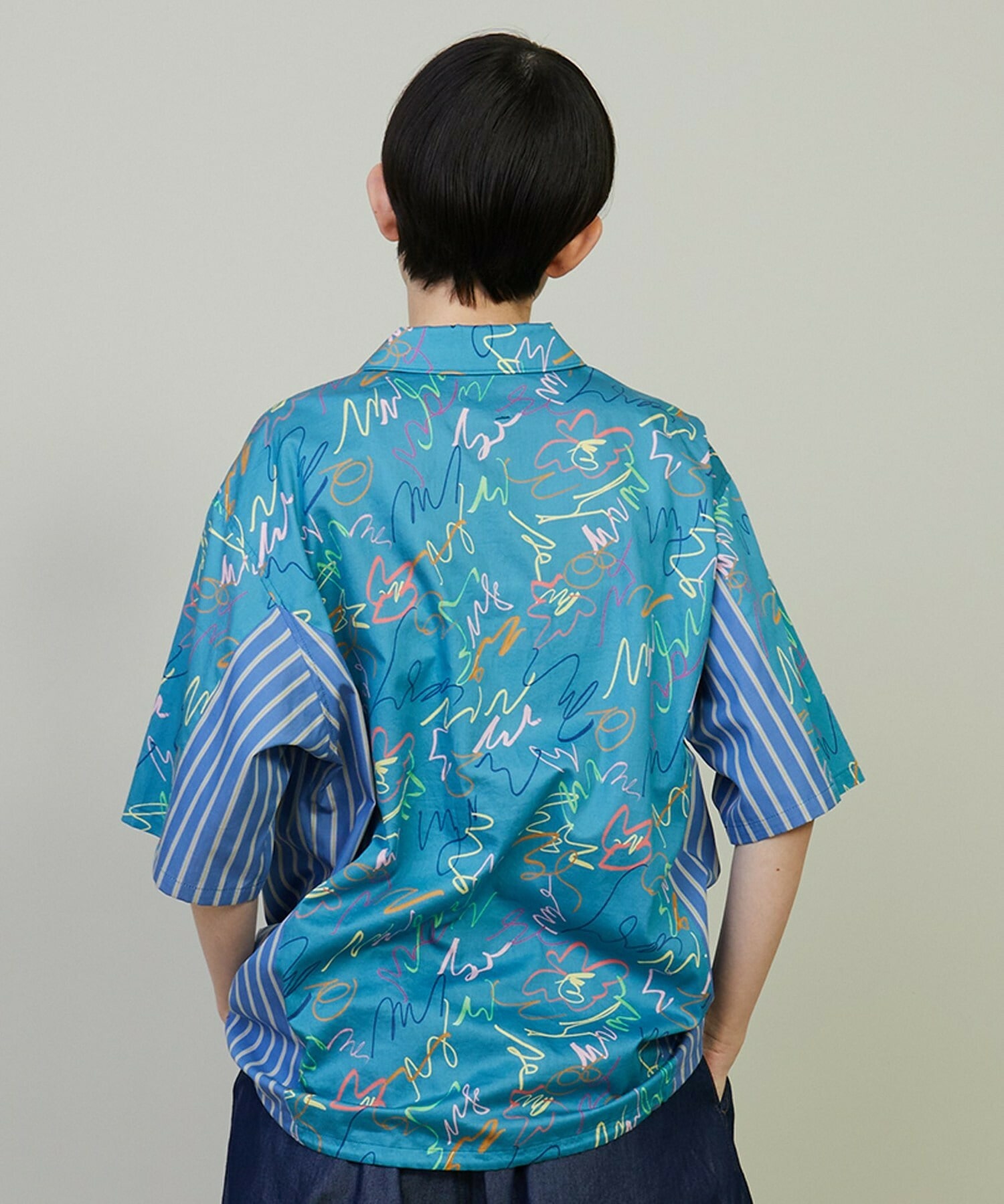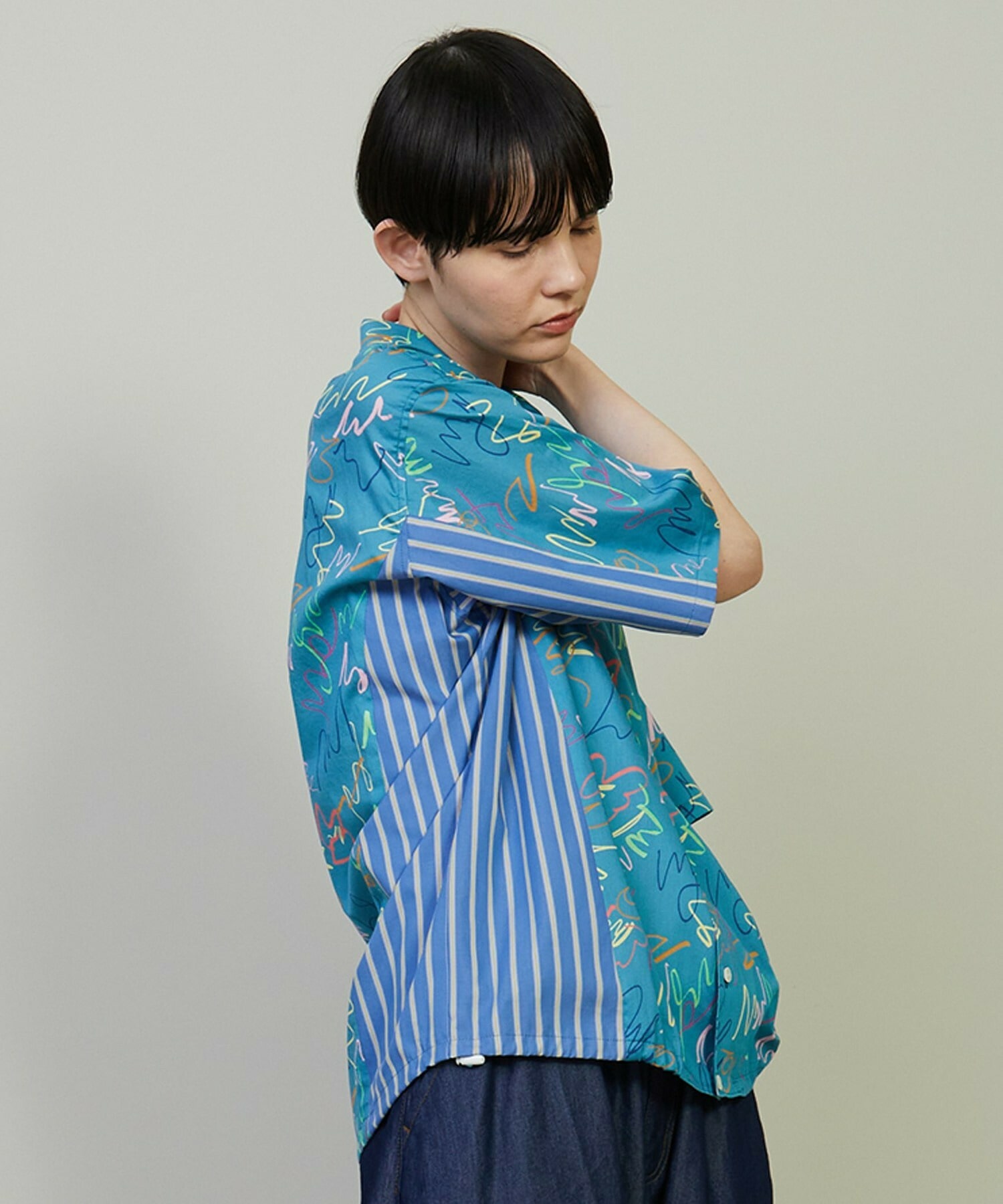 カラフルでリズミカルなスケッチ風の抽象的な柄を綿サテンにプリントした柔らかで上品な光沢感の生地とトラッドなストライプの生地を組み合わせています。