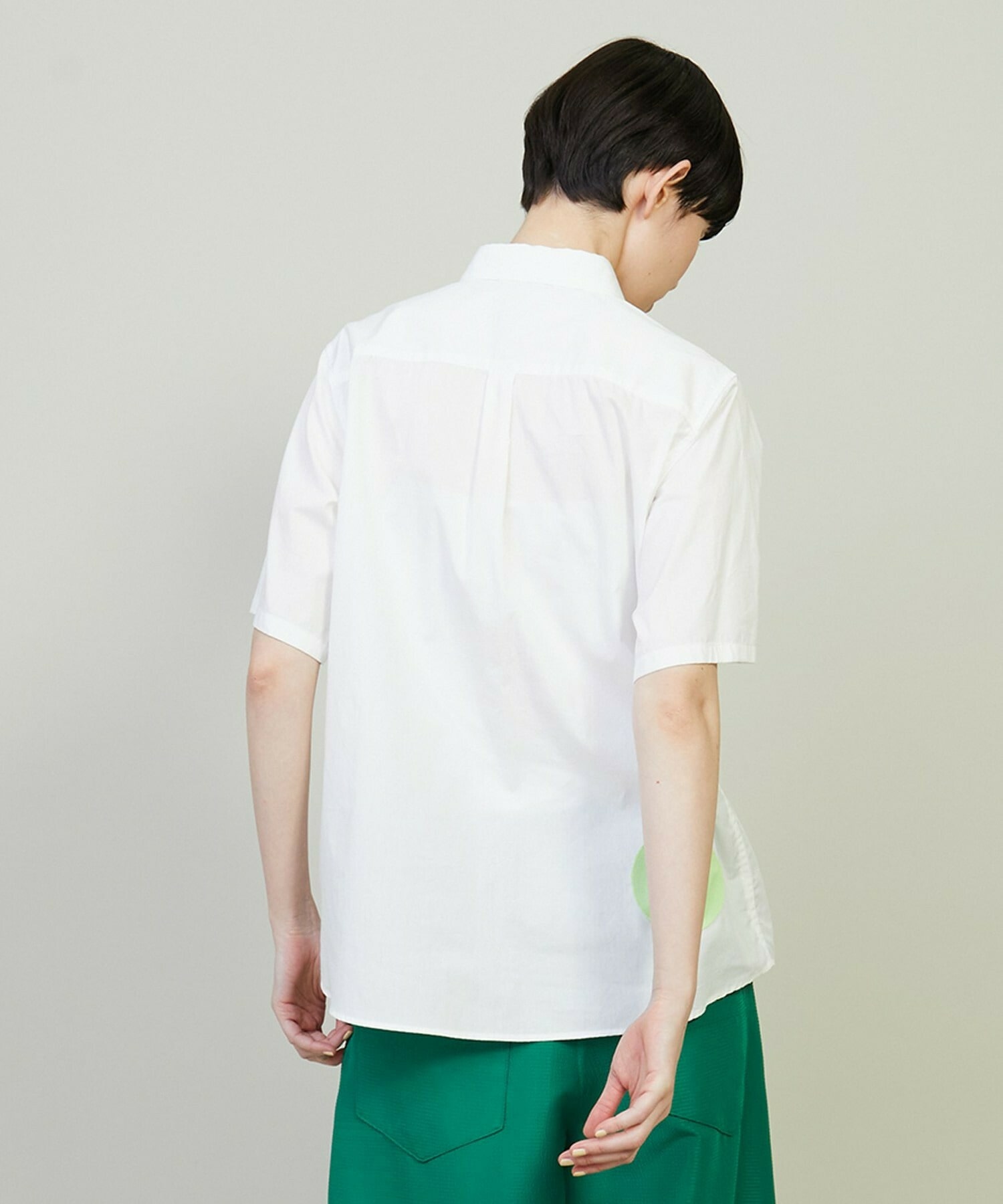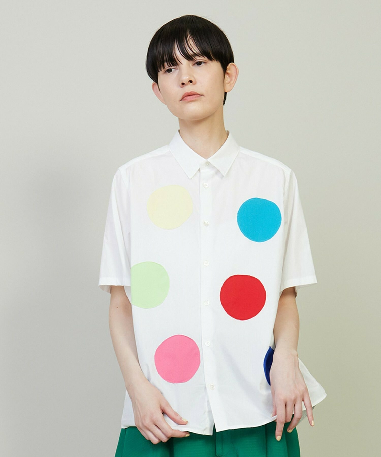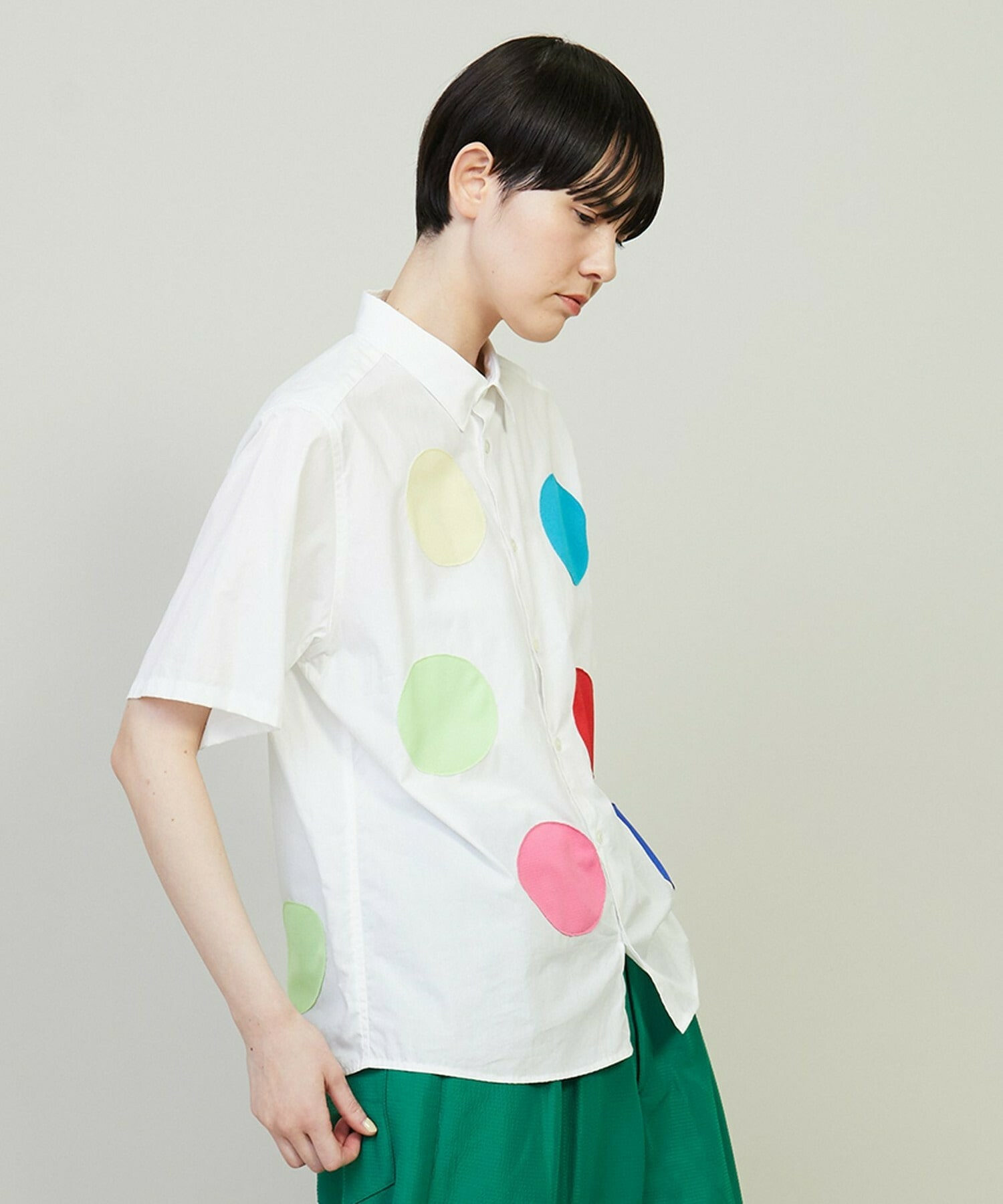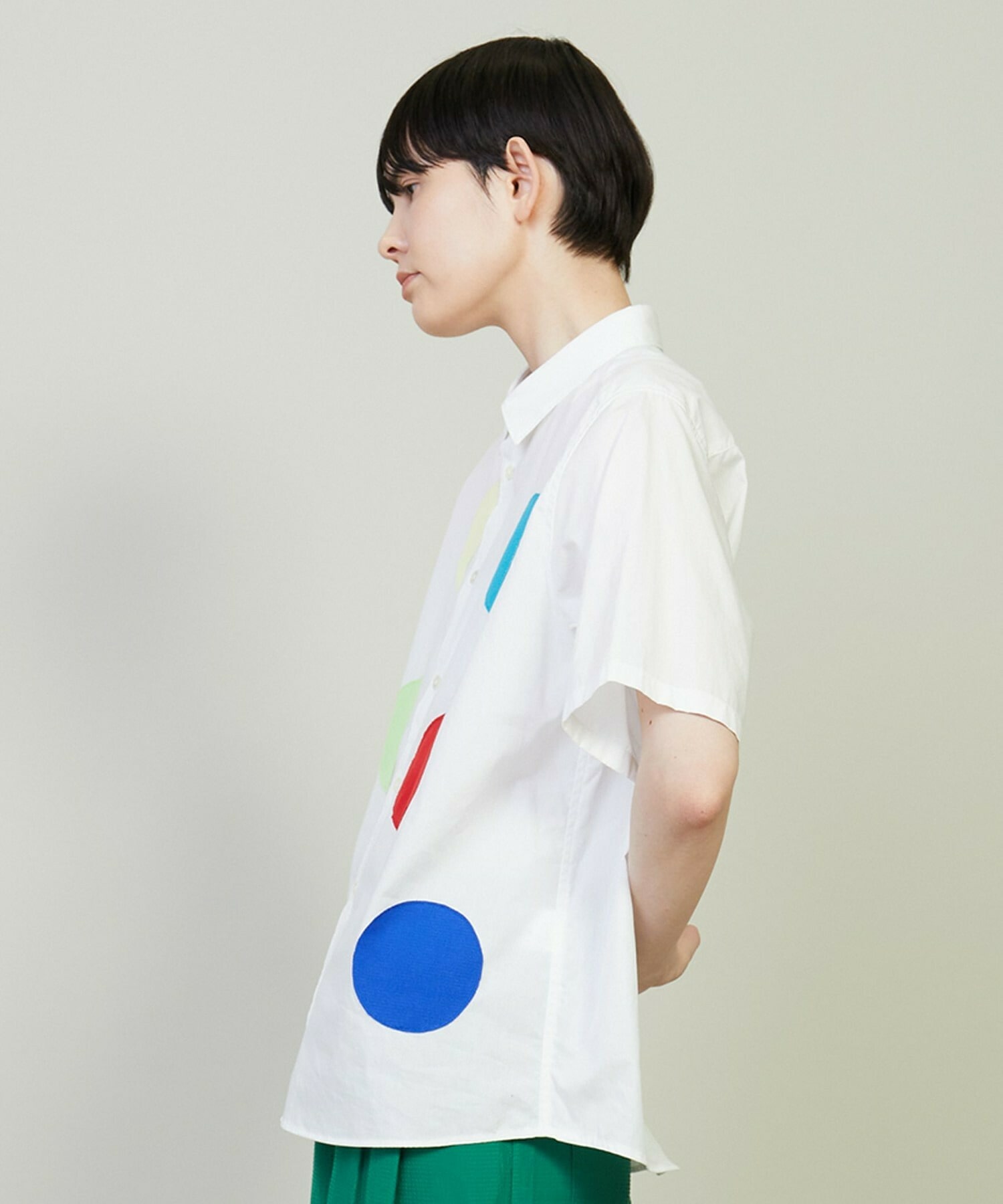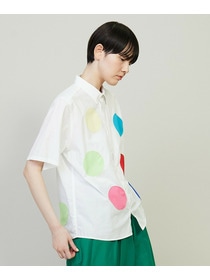 キレイな表面感と適度なハリが特徴の綿のブロードと部分的にカラフルなトリコット素材を組み合わせたシャツブラウス。
