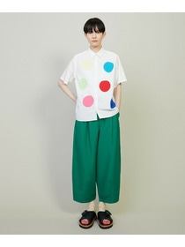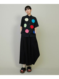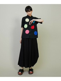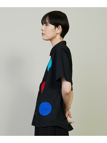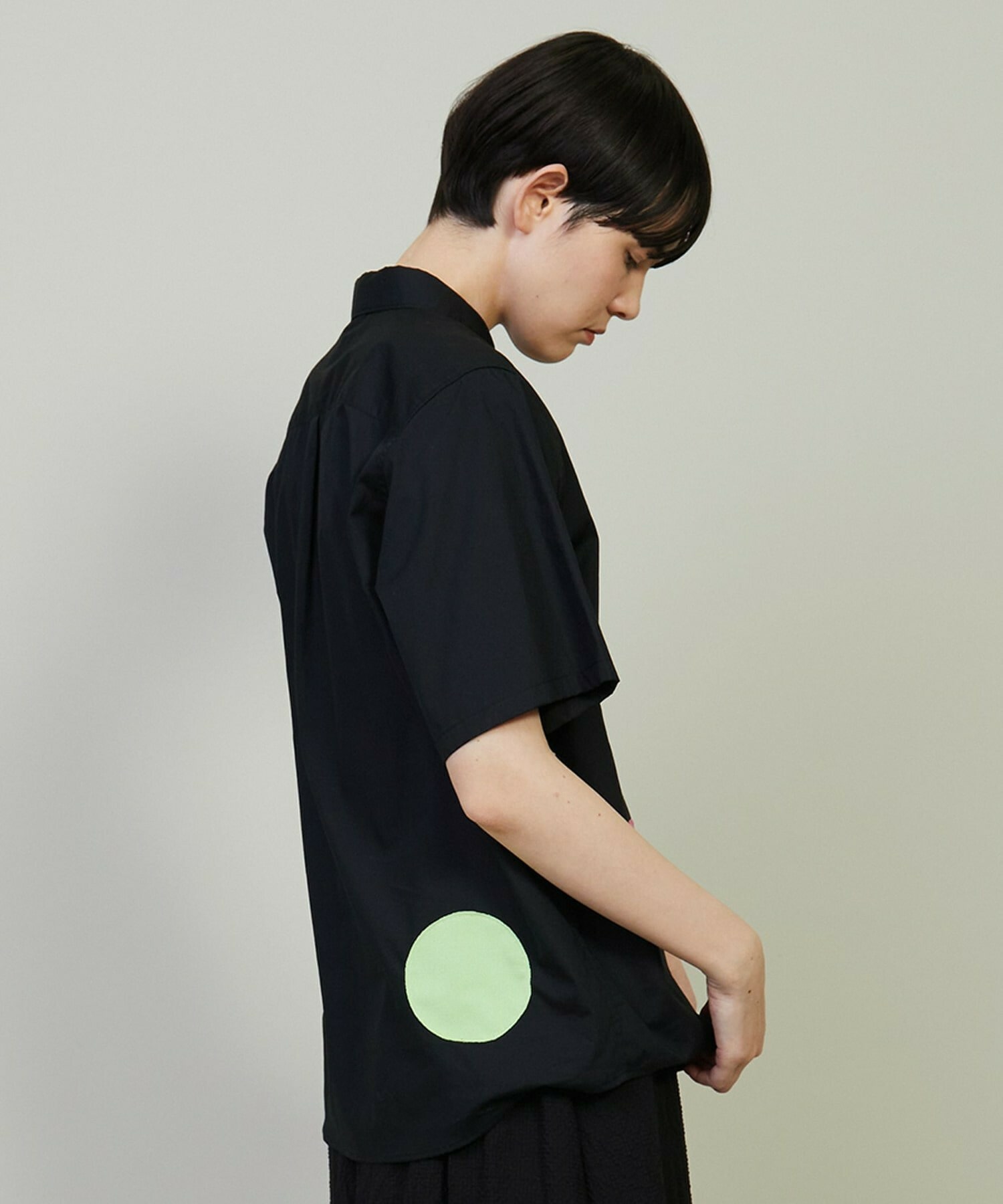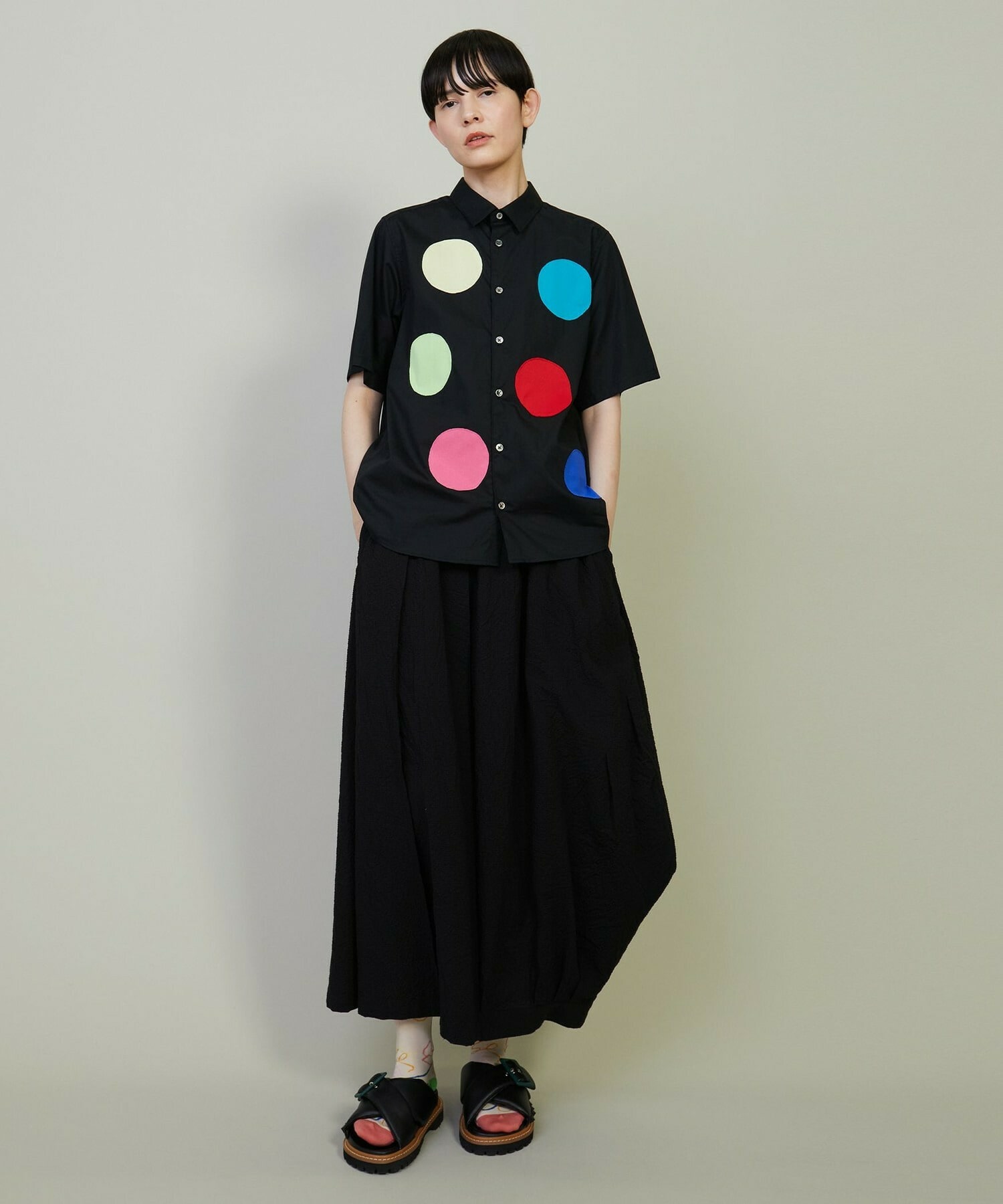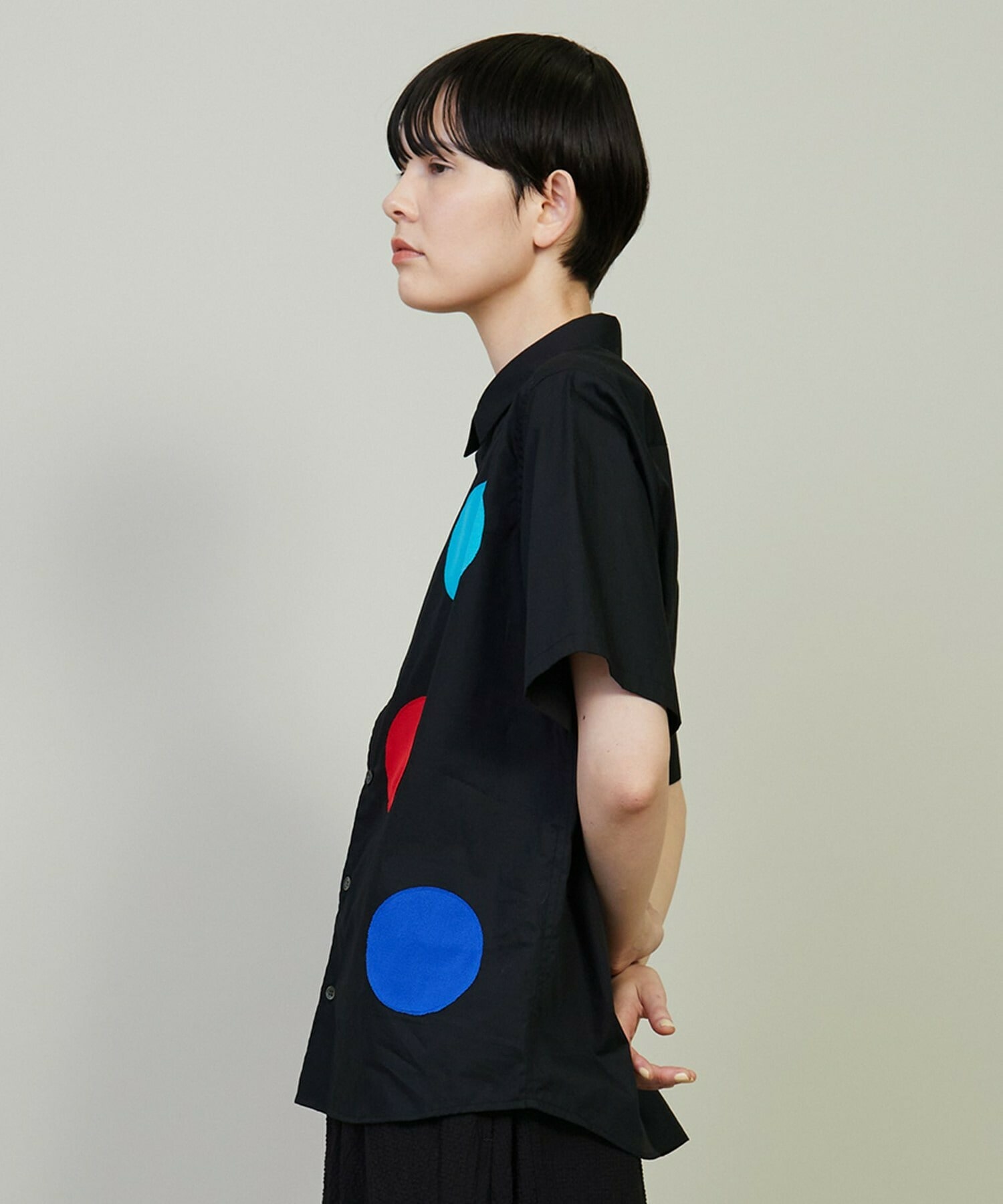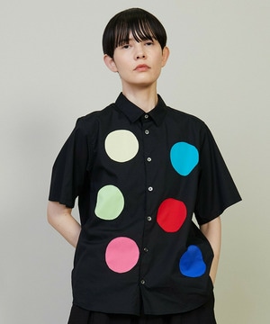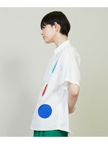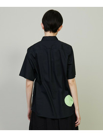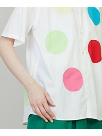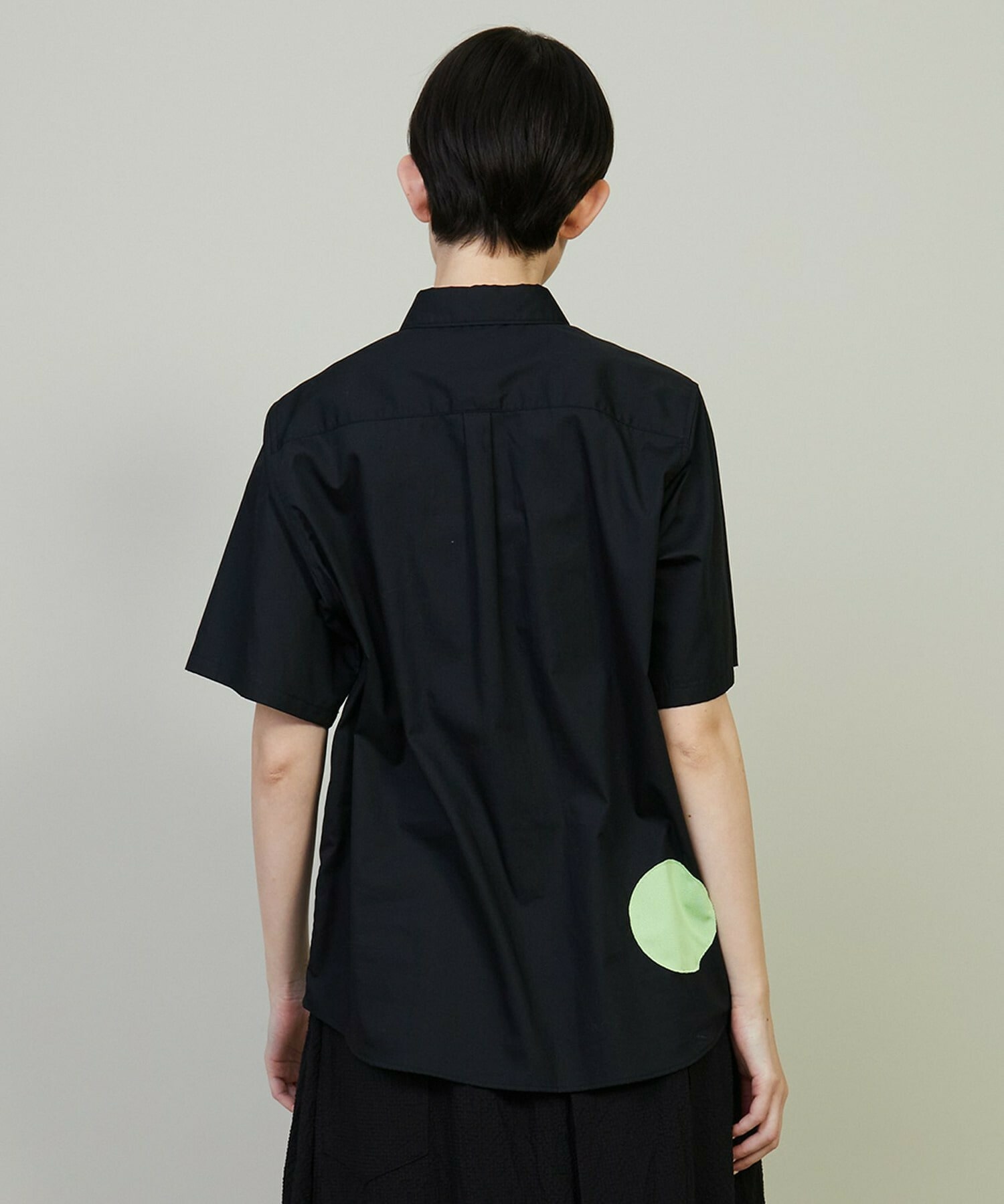 キレイな表面感と適度なハリが特徴の綿のブロードと部分的にカラフルなトリコット素材を組み合わせたシャツブラウス。