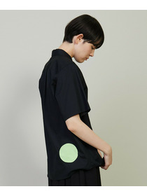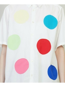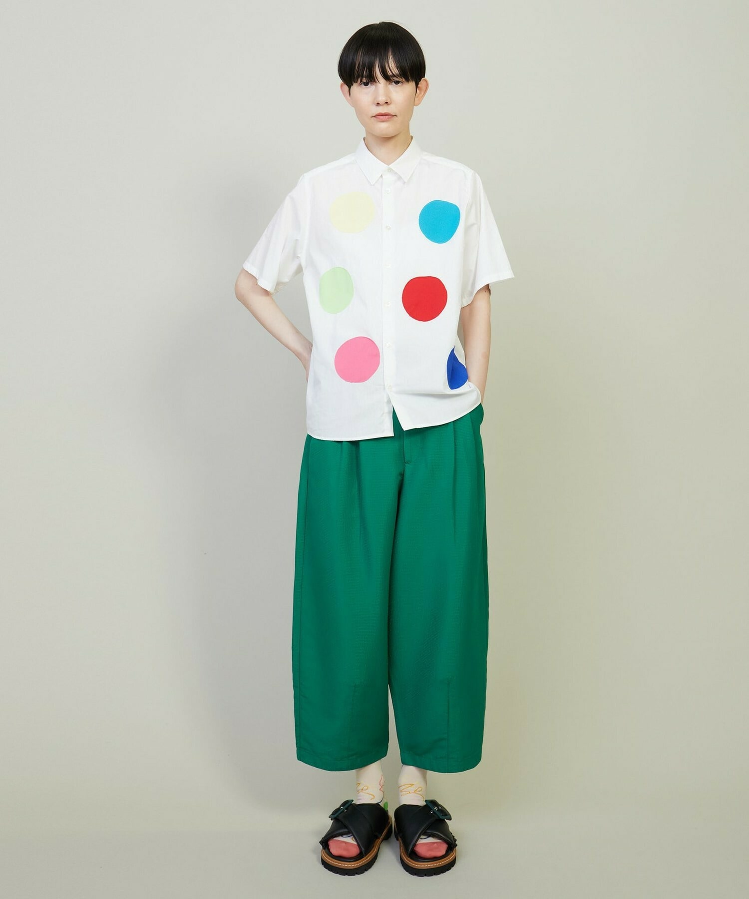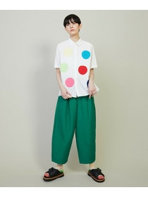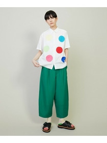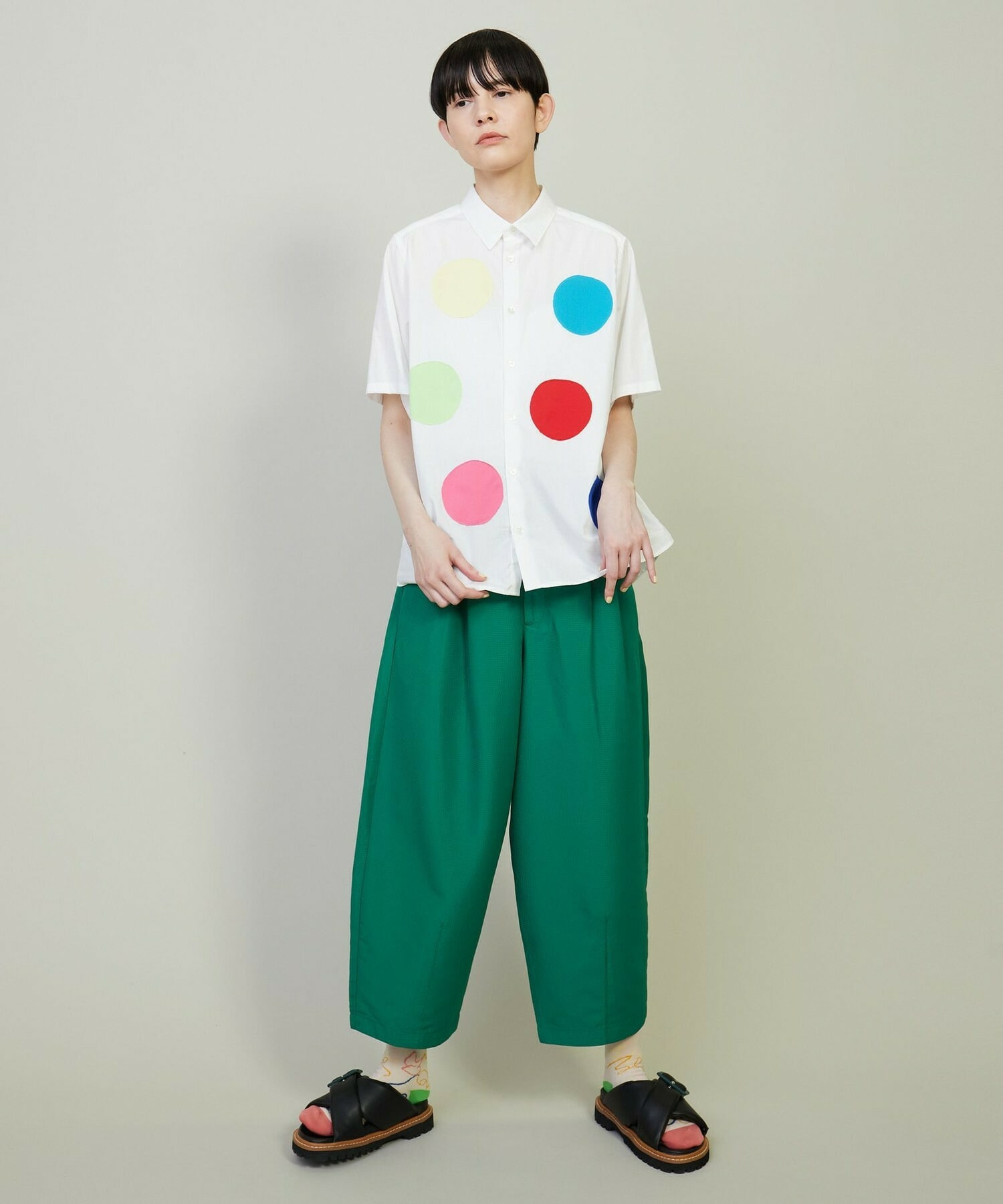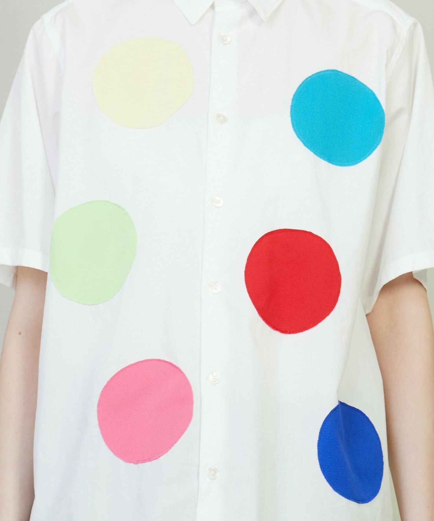 フロントにカラフルなトリコット素材を丸くパーツでくりぬき、それを配置したデザイン。