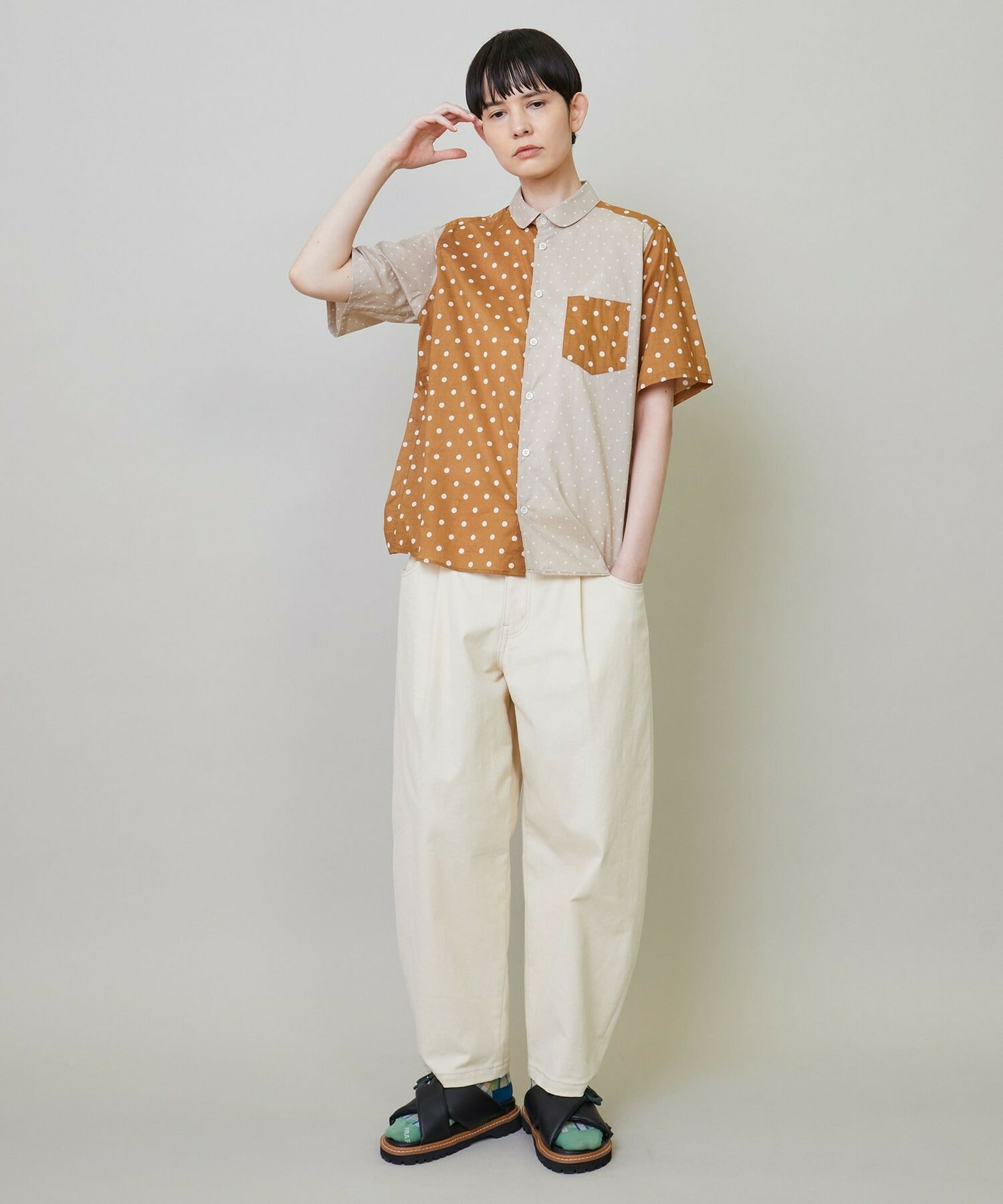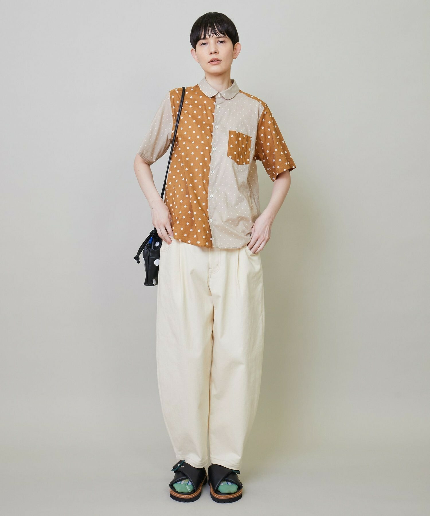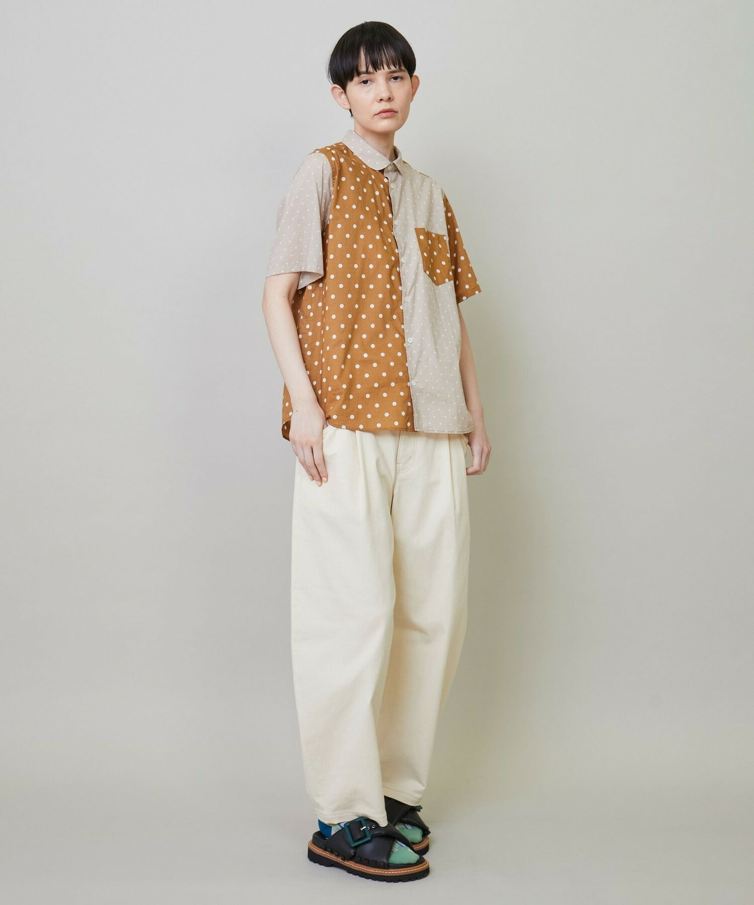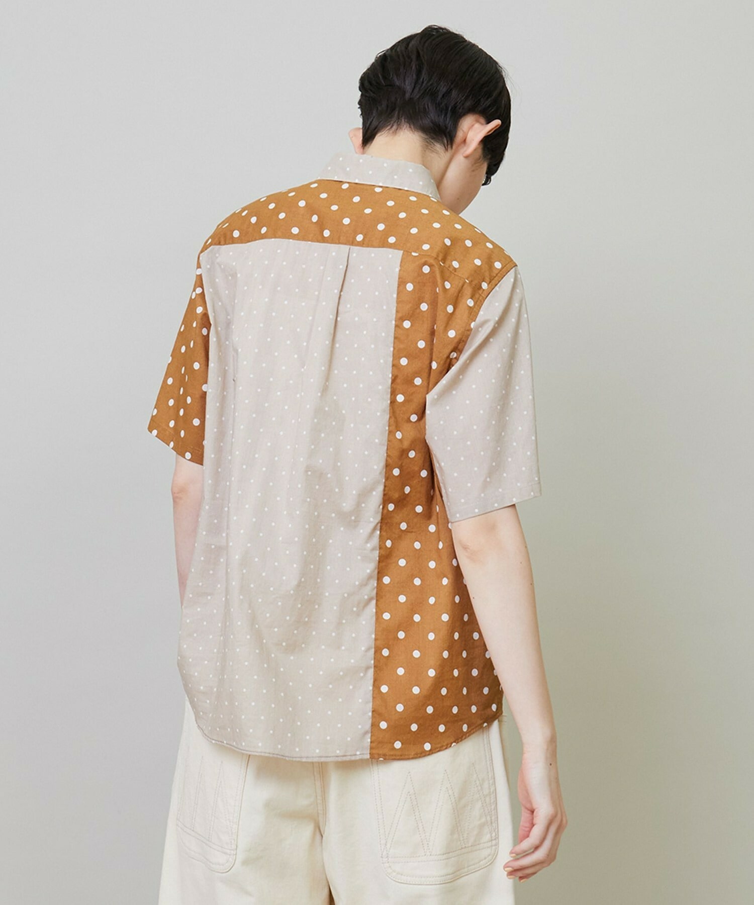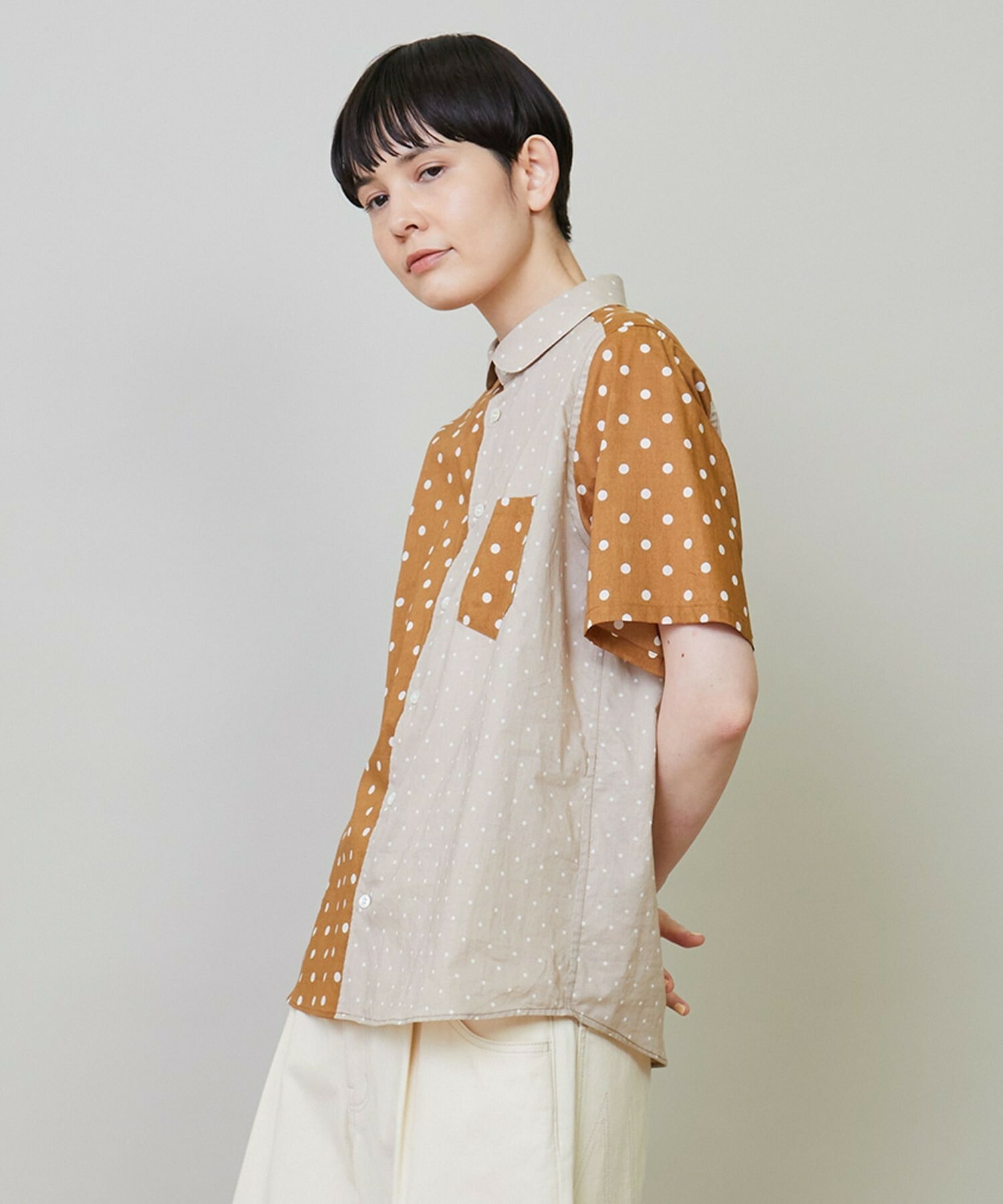 綿特有の肌触りの良さと程よい軽さが特徴の綿ローンをベースに2種類のドット生地を組み合わせています。