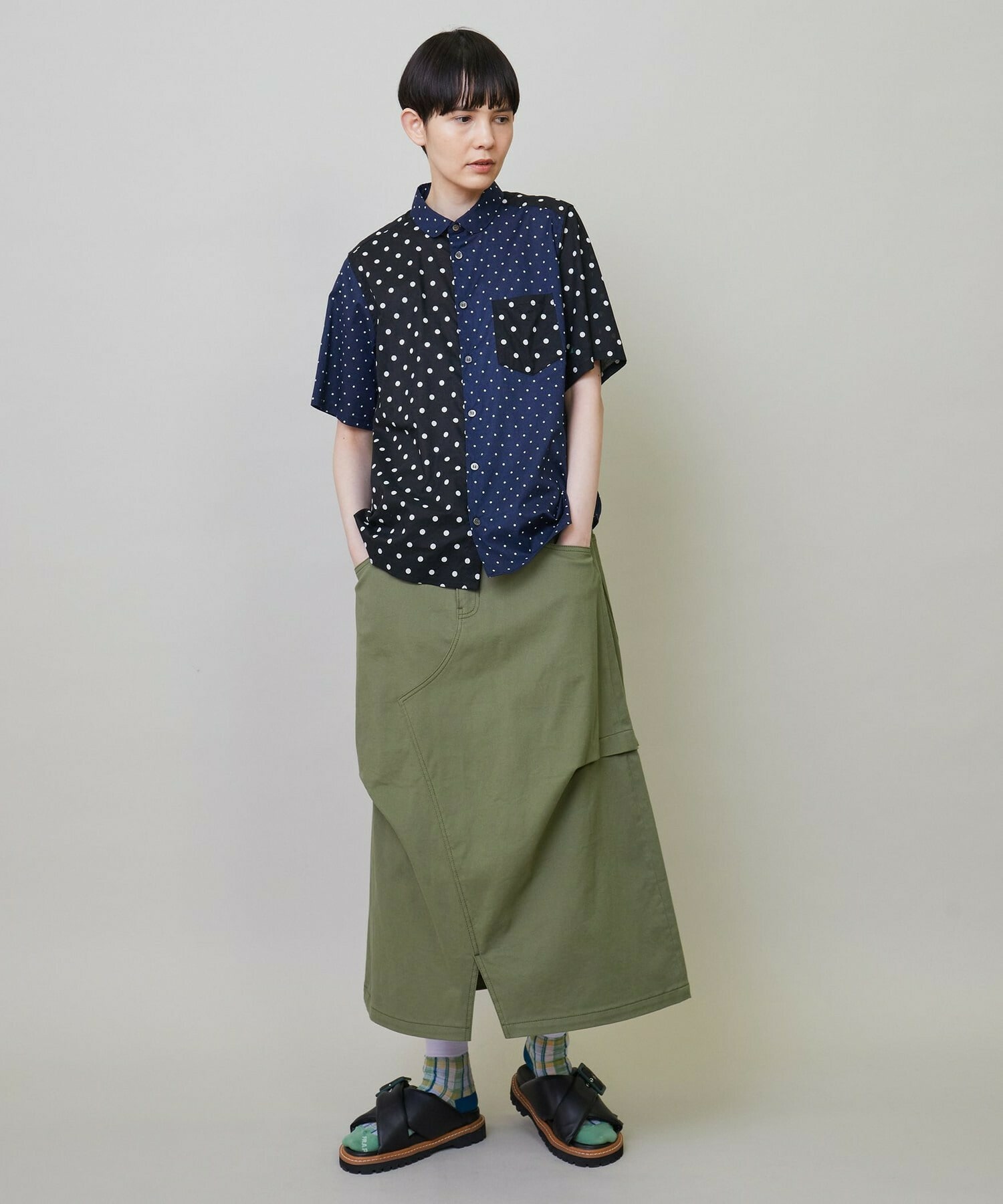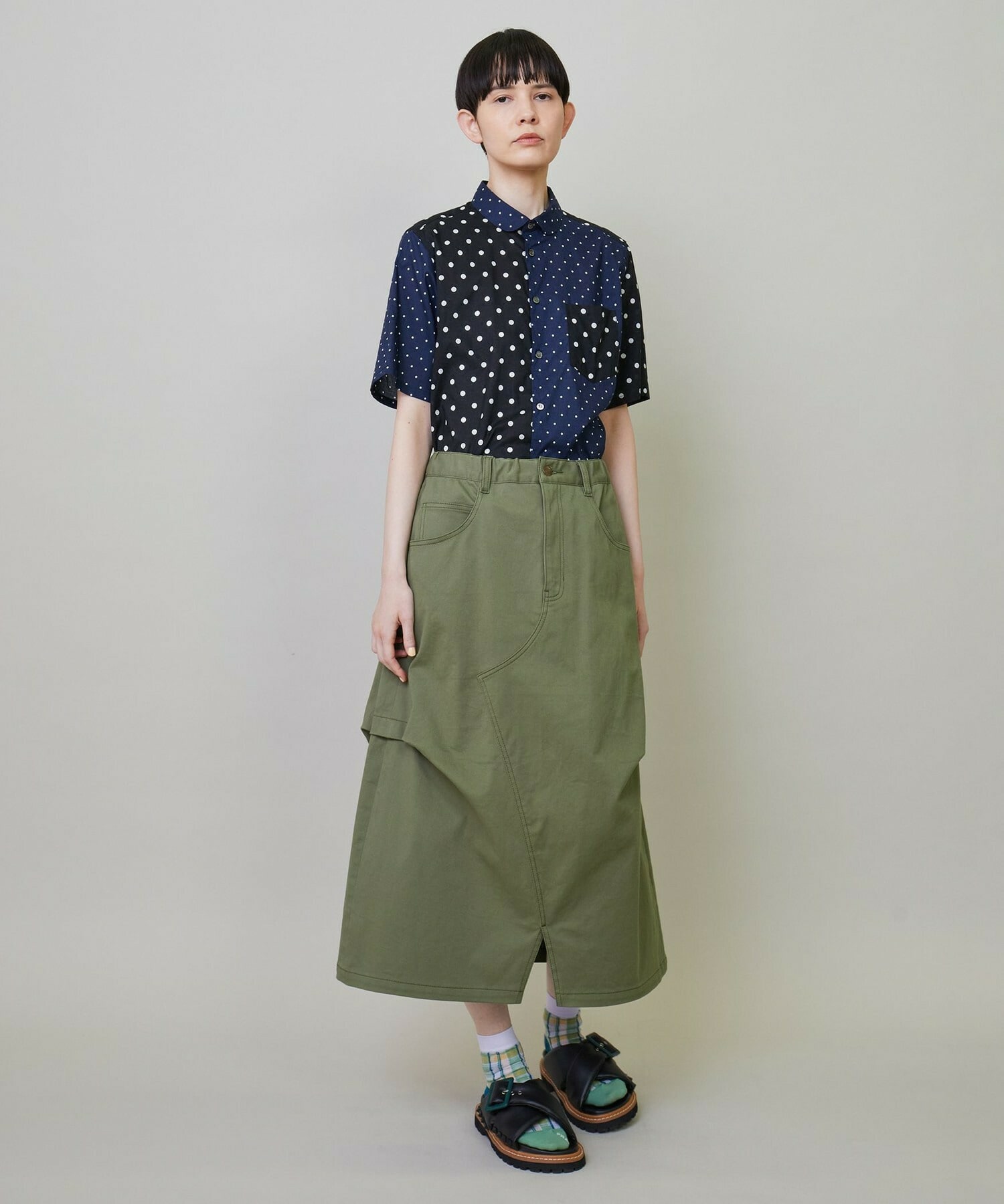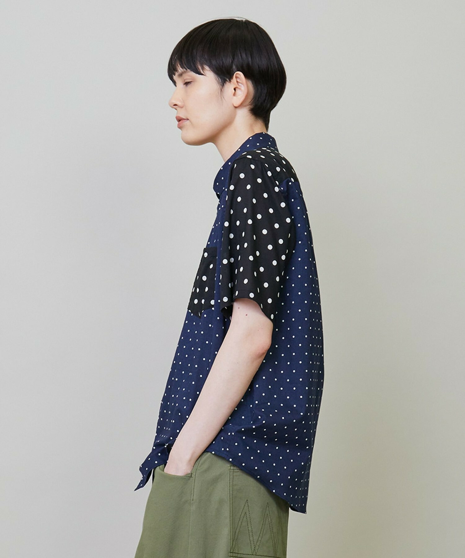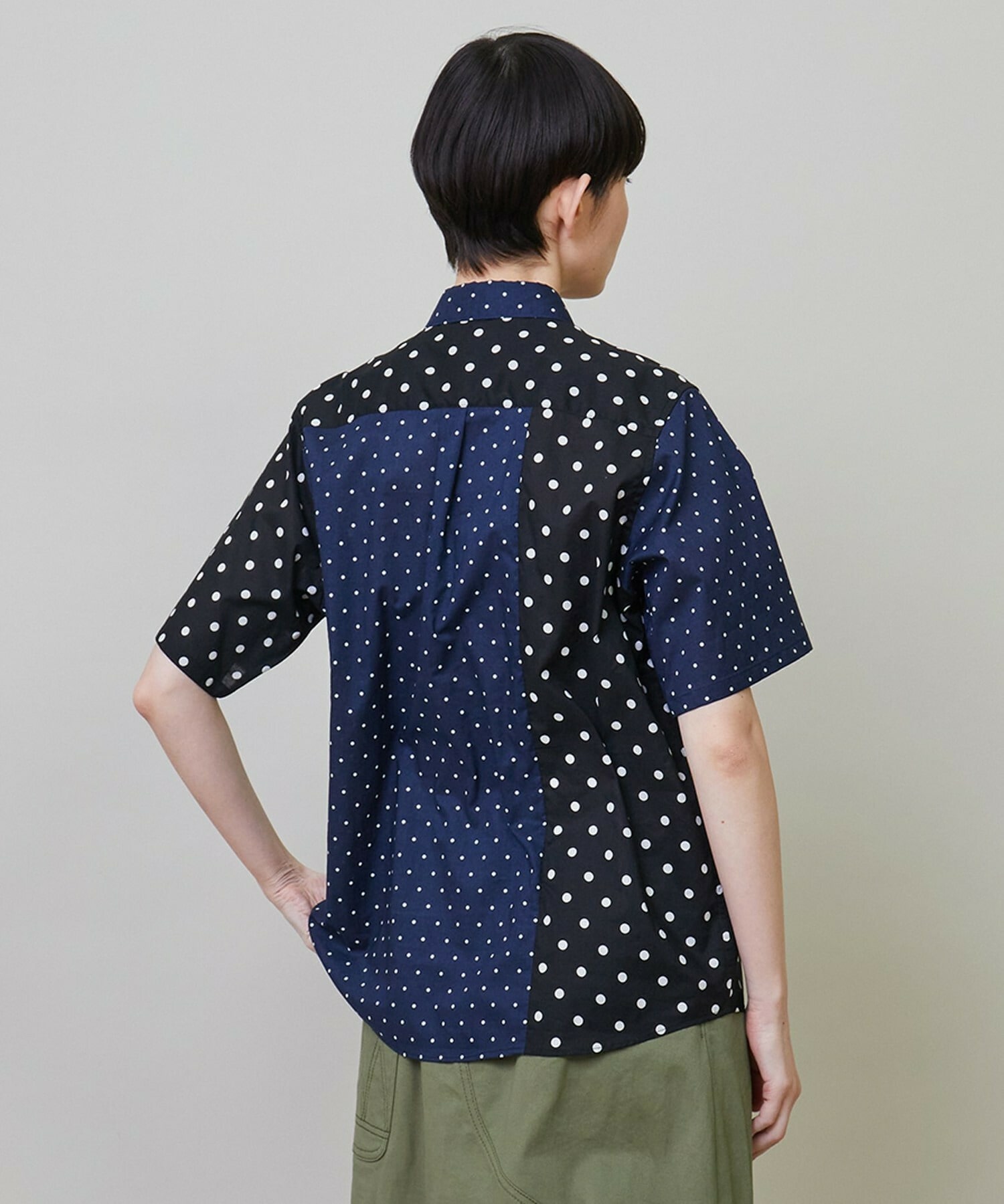 大胆に2種類の生地を使いながらも色のトーンを合わせることで馴染みの良い印象に仕上げています。