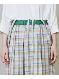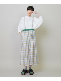 フロントに大きくとったタックで膨らみを出したスカートはアクセントのサスペンダーモチーフが効いています。