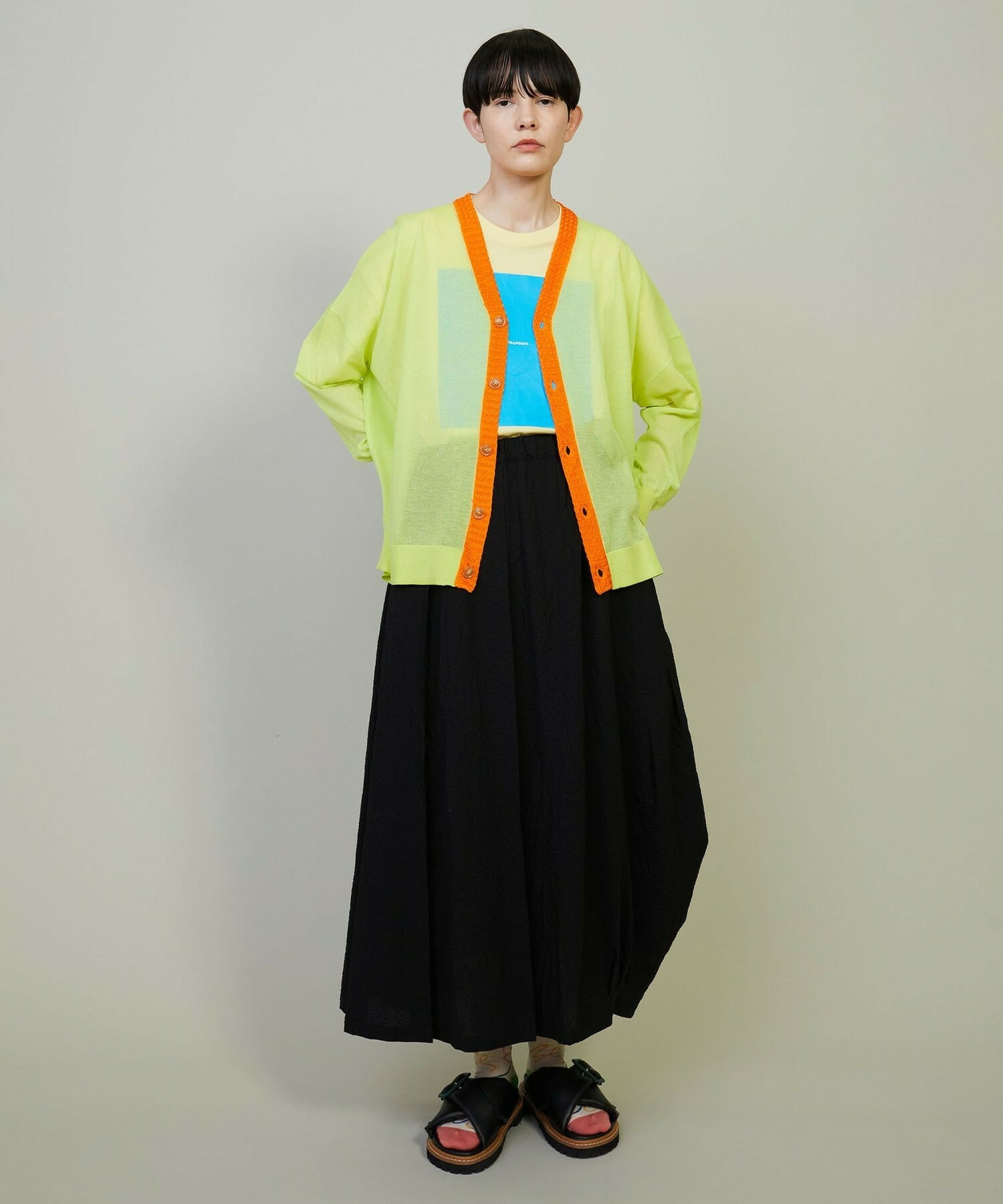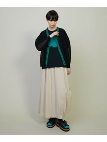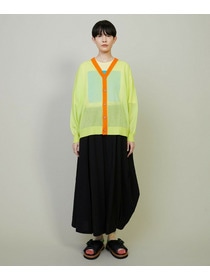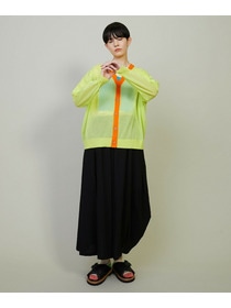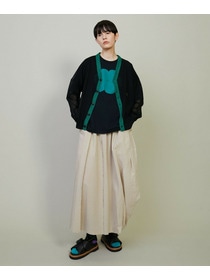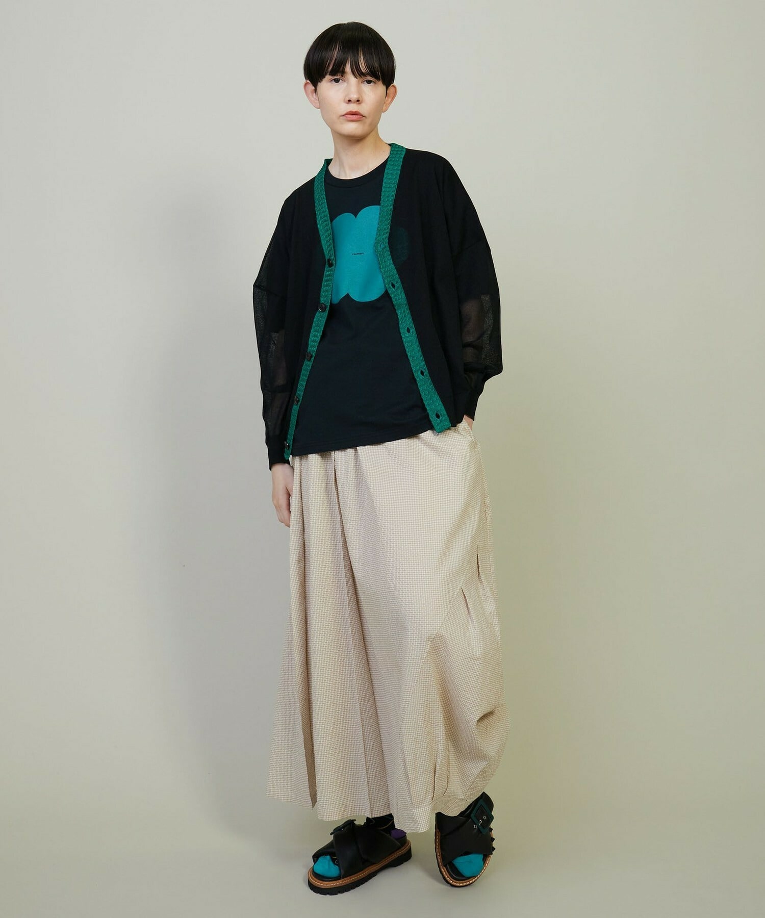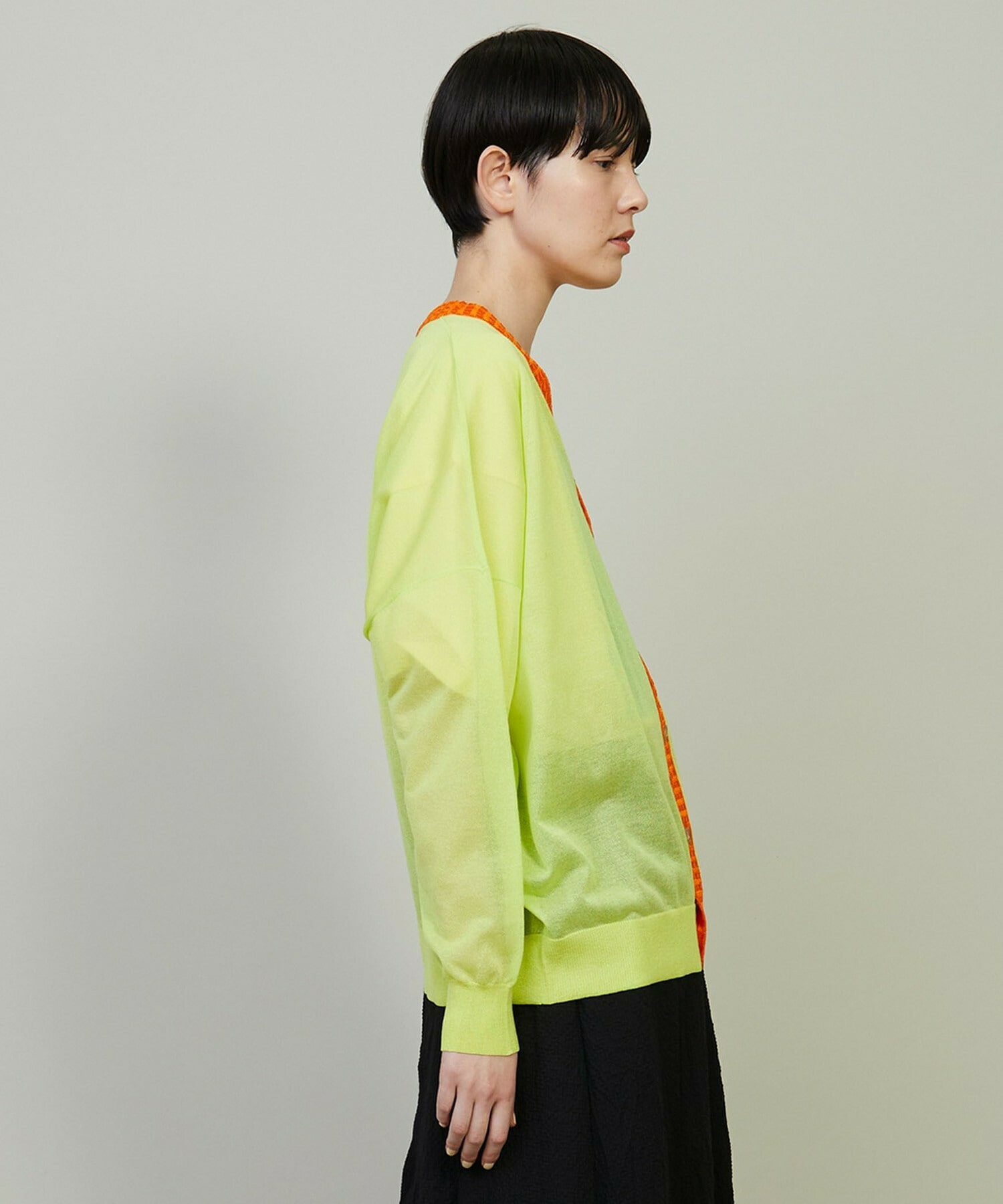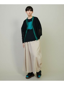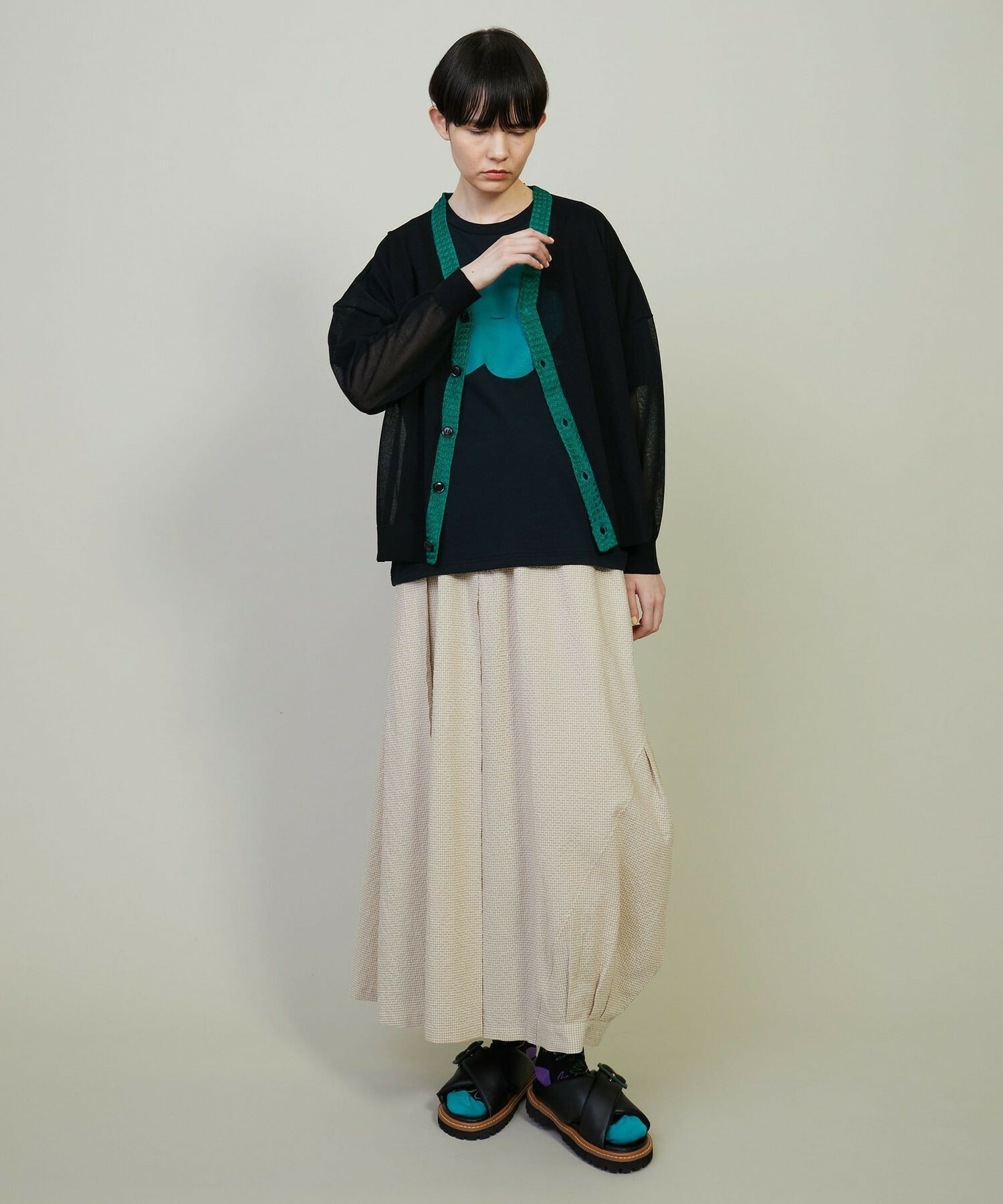 シアー感とサラッとした肌触りが特徴の天竺ベースの編み地に衿元には立体的な編み柄のケーブル編みを繊細に施してアクセントをつくっています。