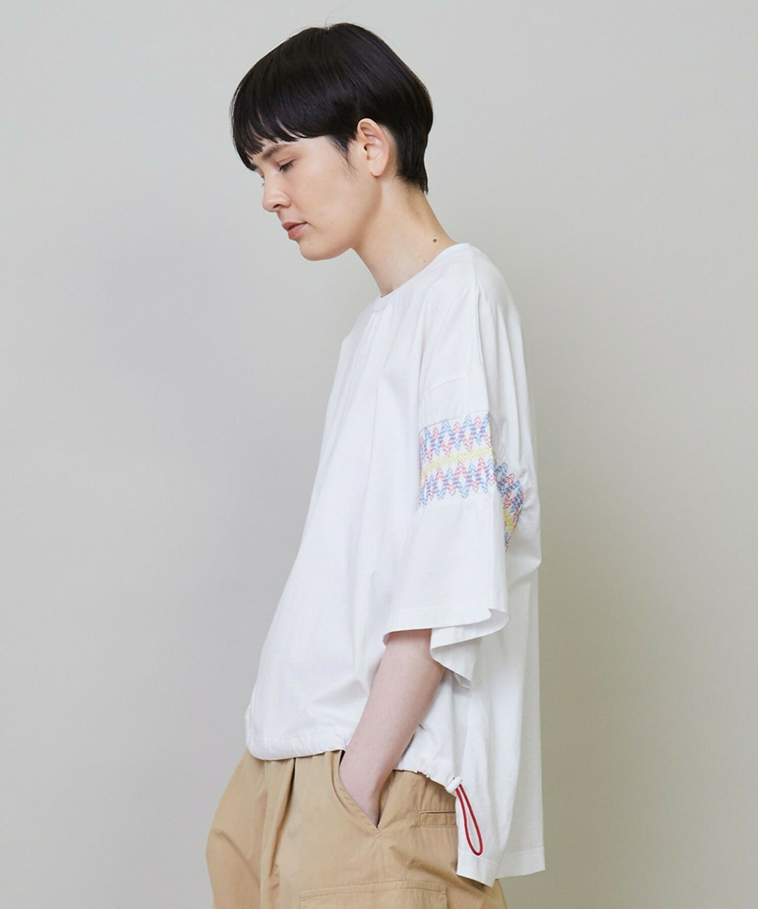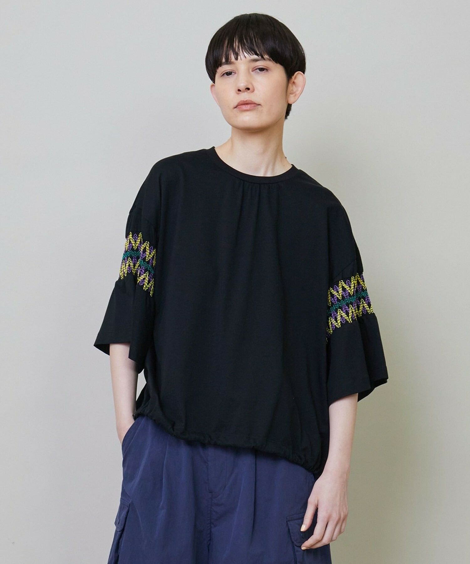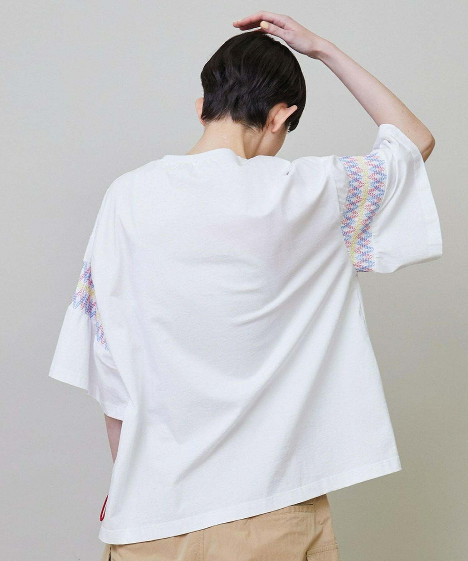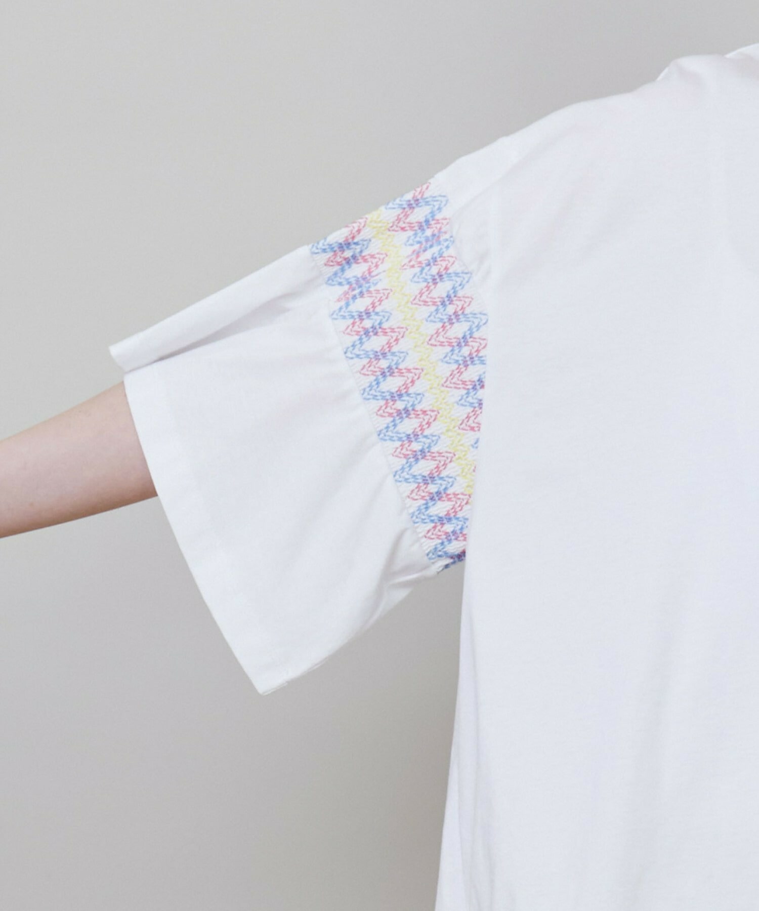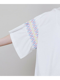 袖部分にスモッキング調のカラフルな機械刺繍を施したデザインカットソー。