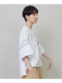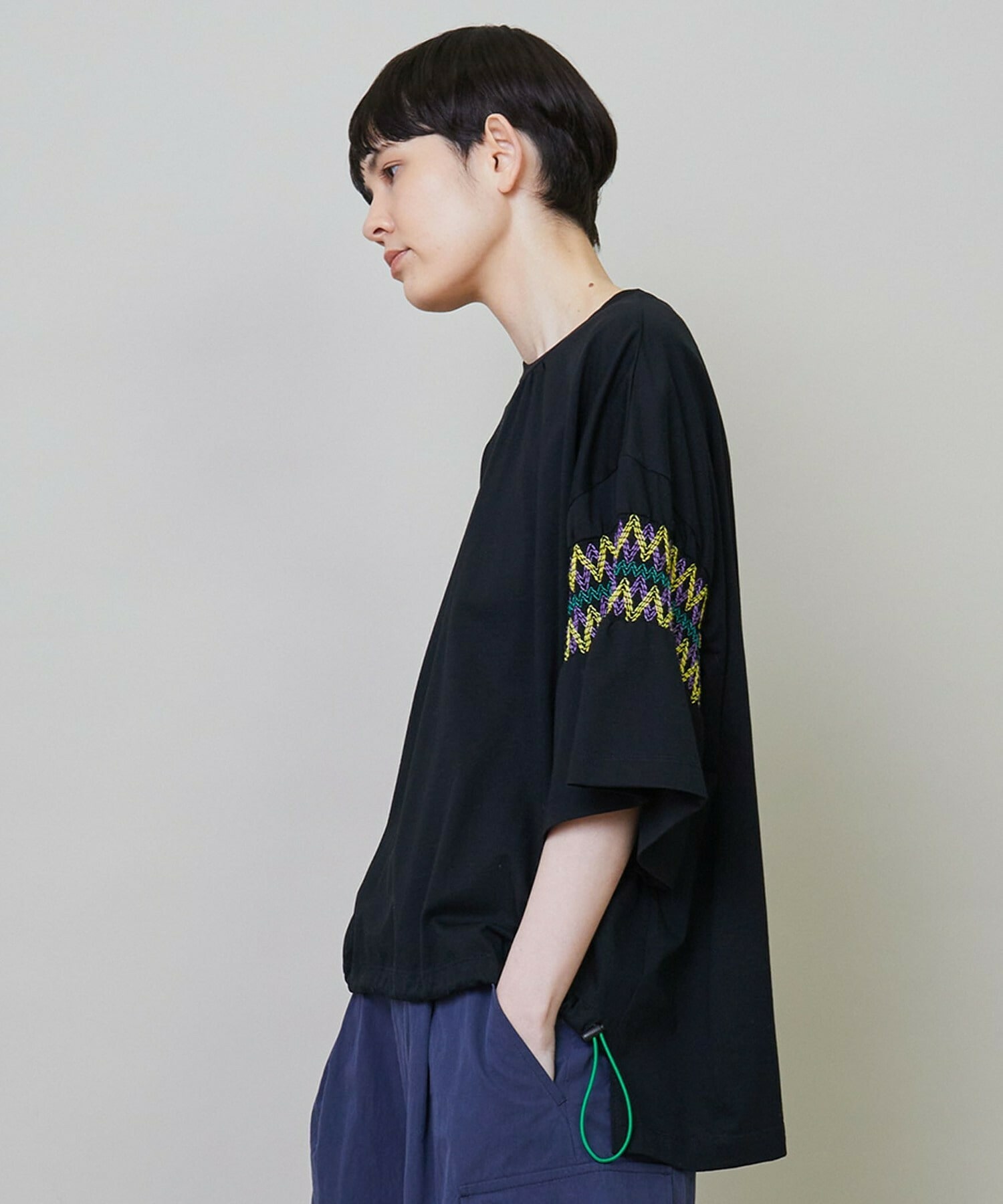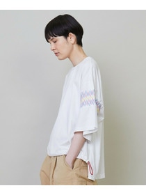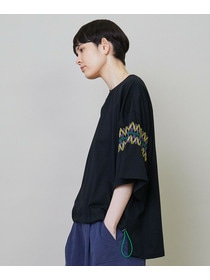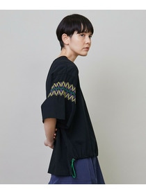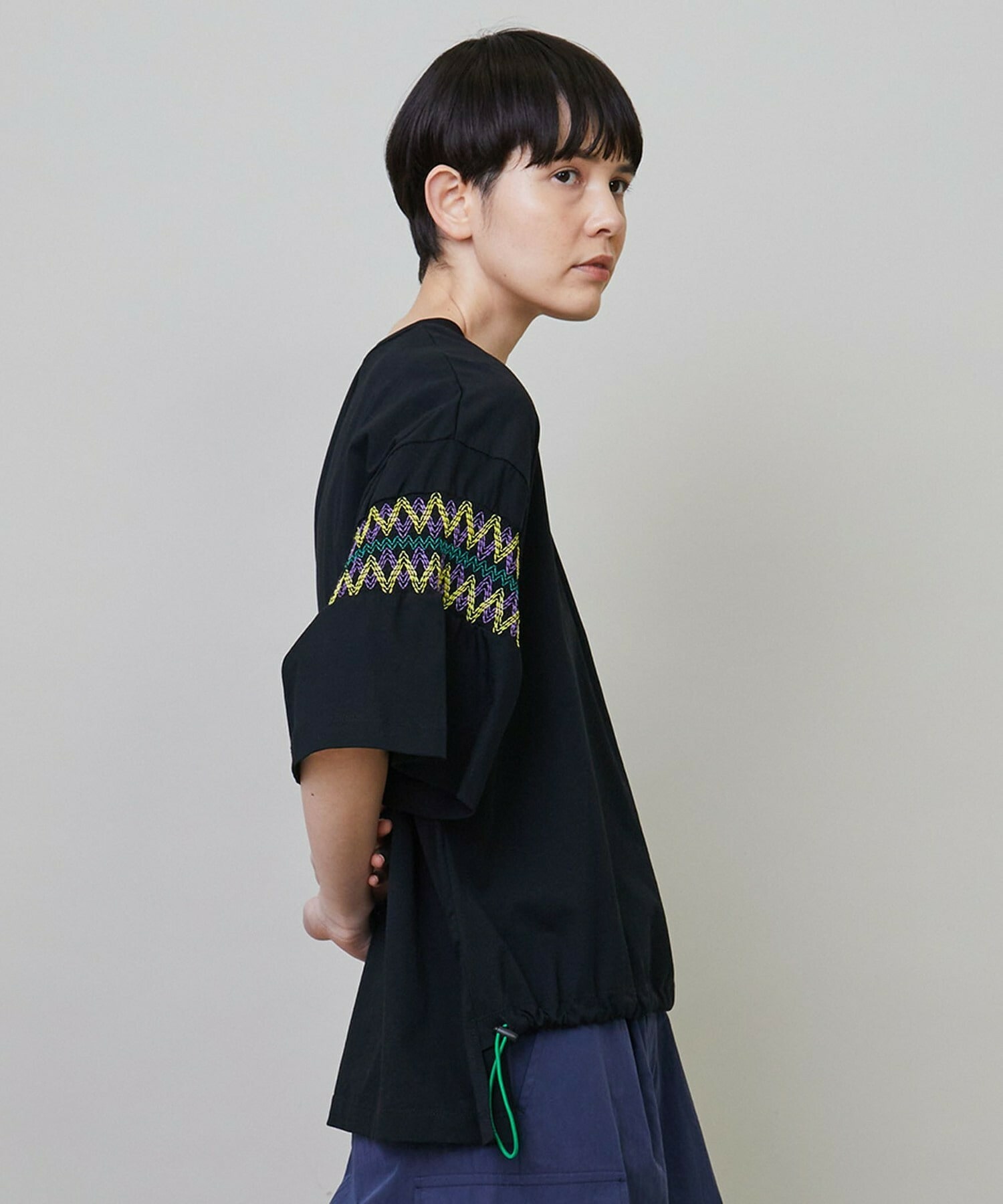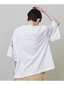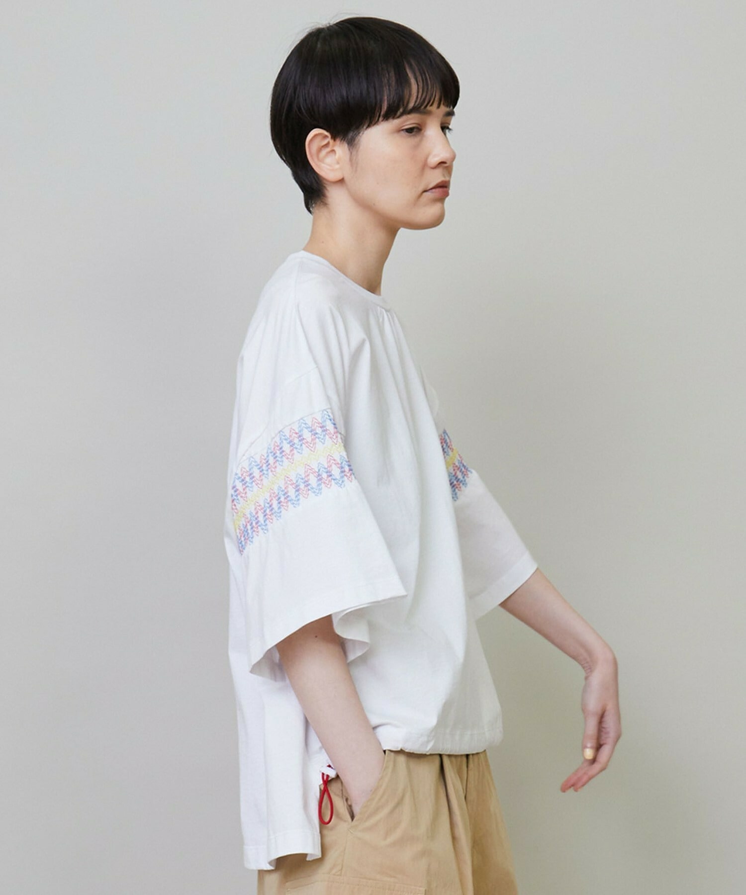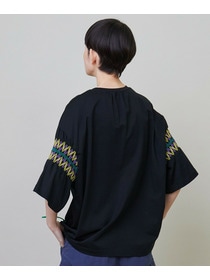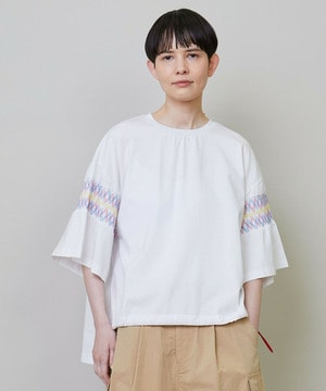 袖部分にスモッキング調のカラフルな機械刺繍を施したデザインカットソー。