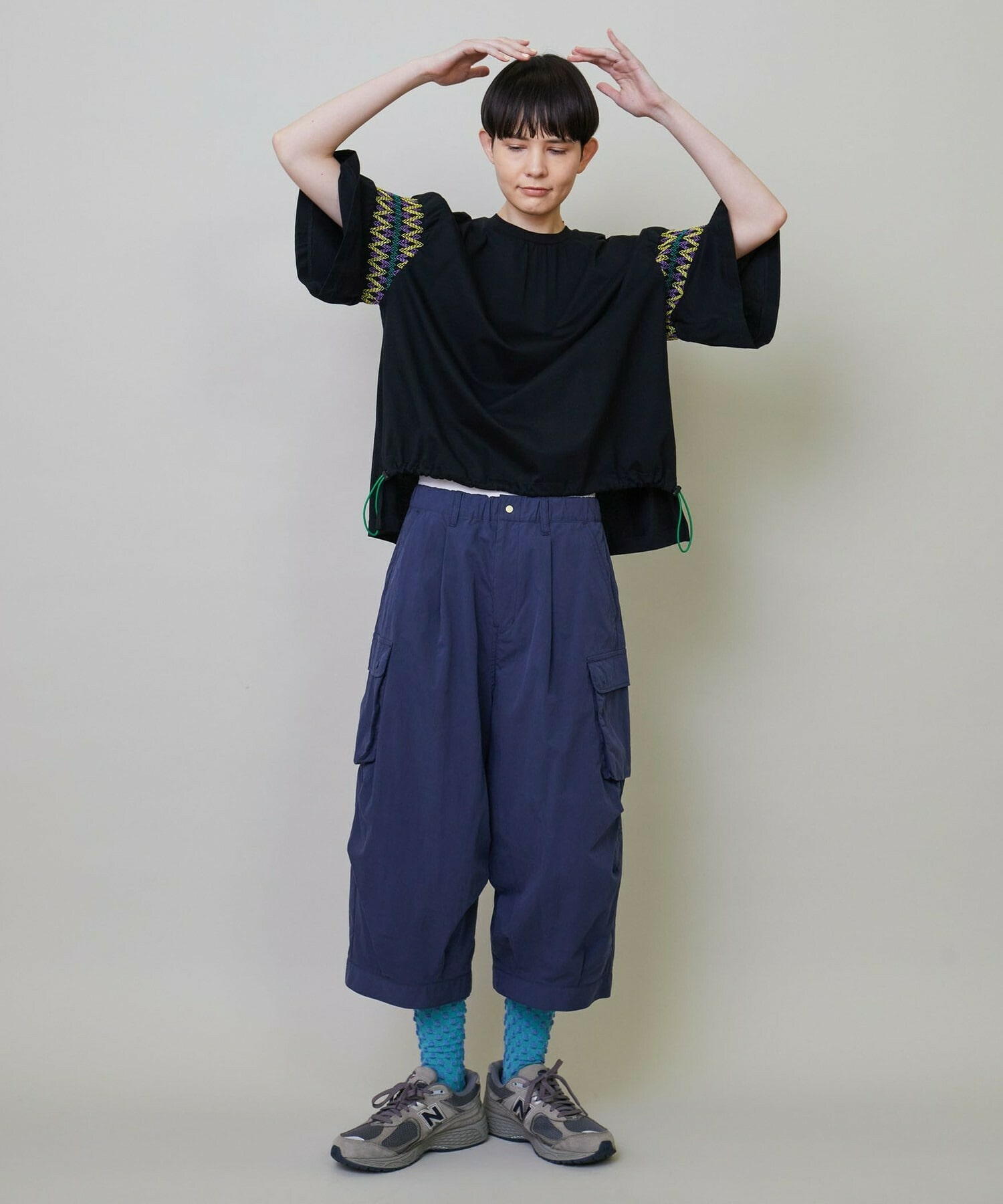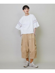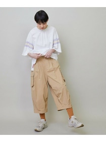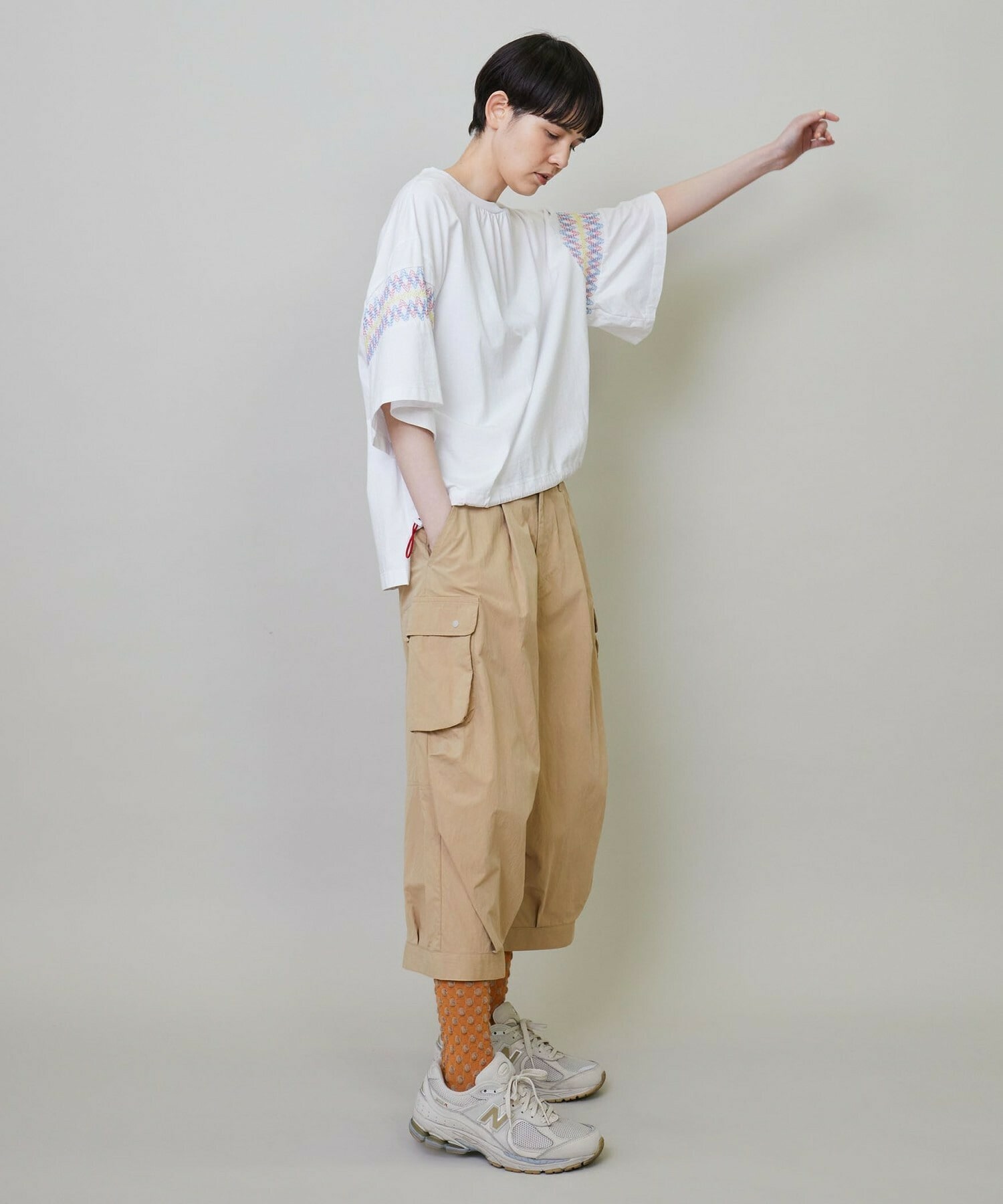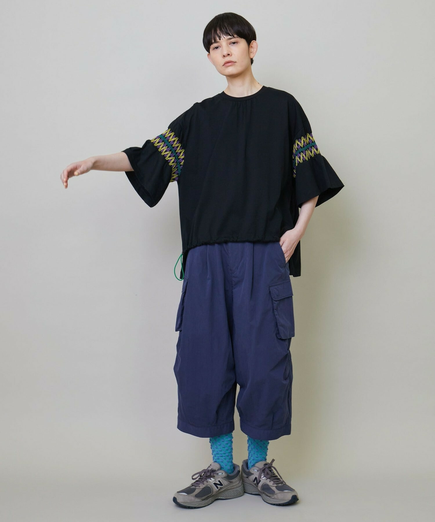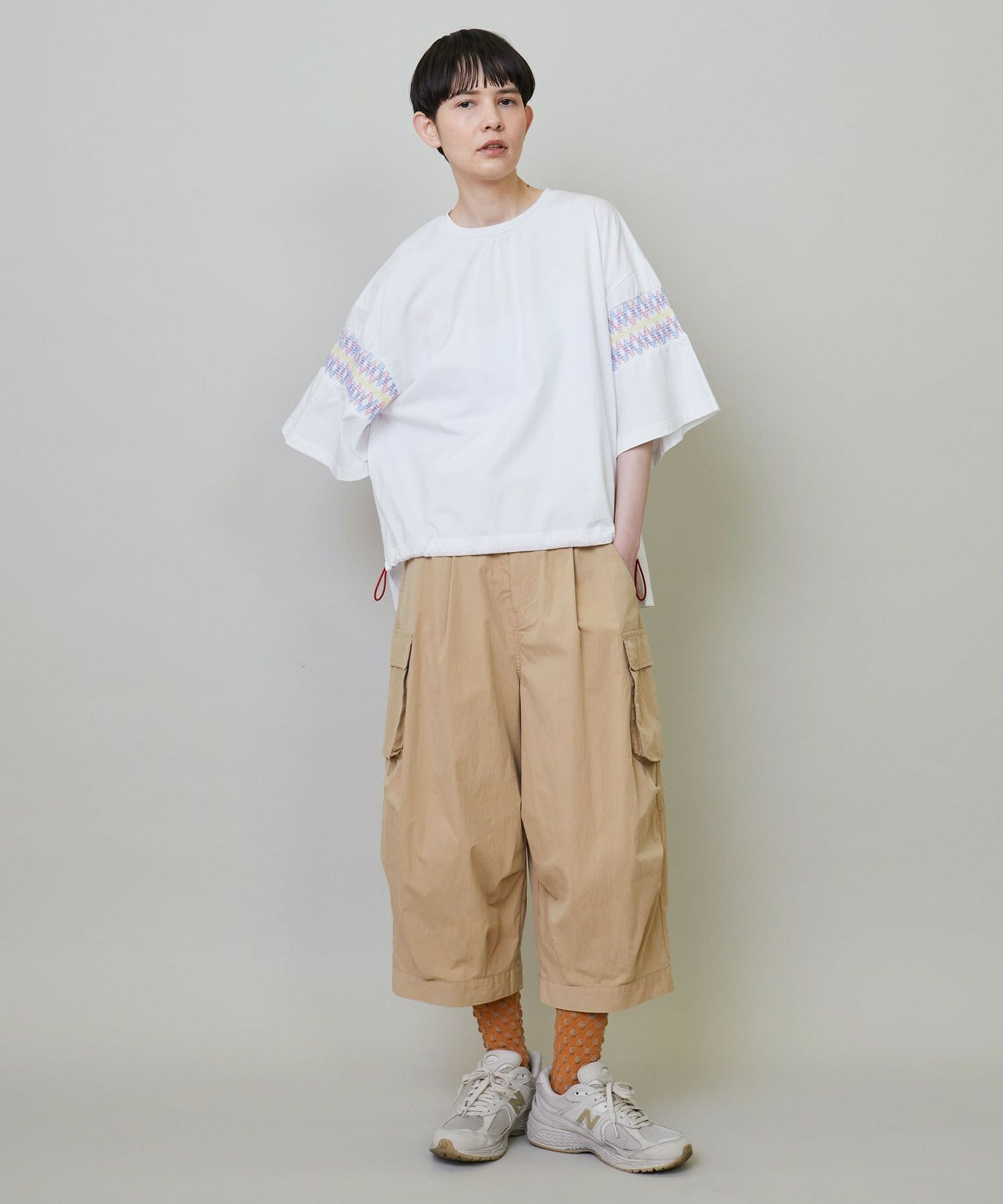 袖部分にスモッキング調のカラフルな機械刺繍を施したデザインカットソー。