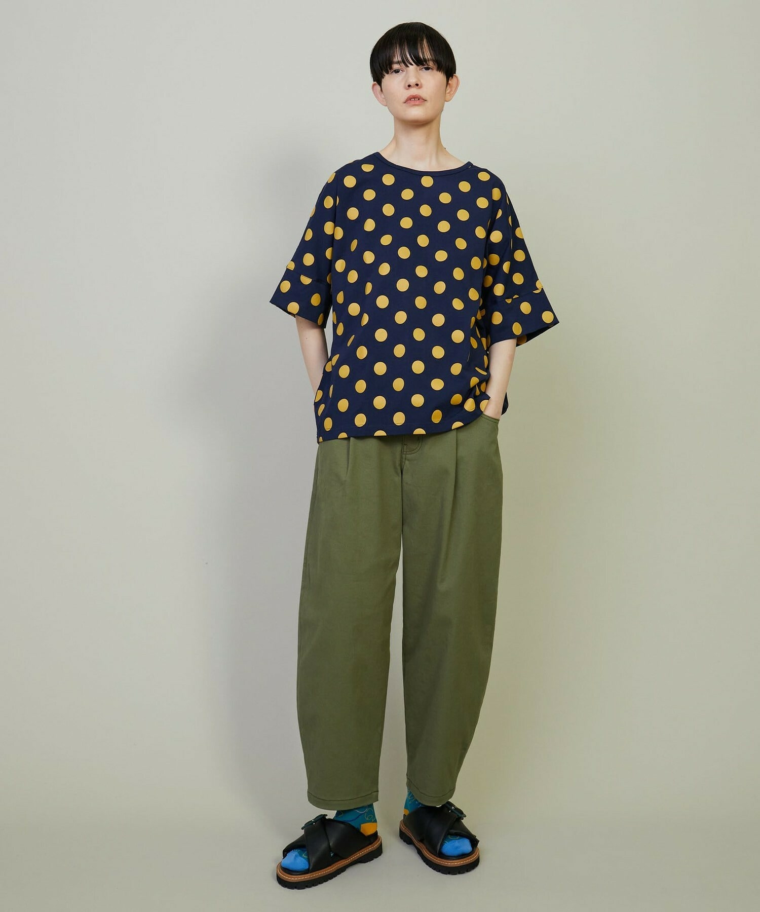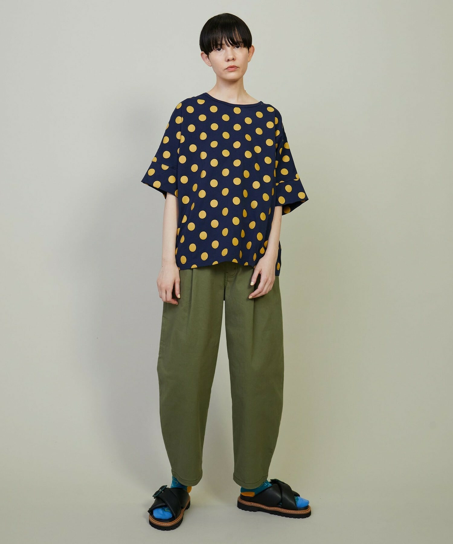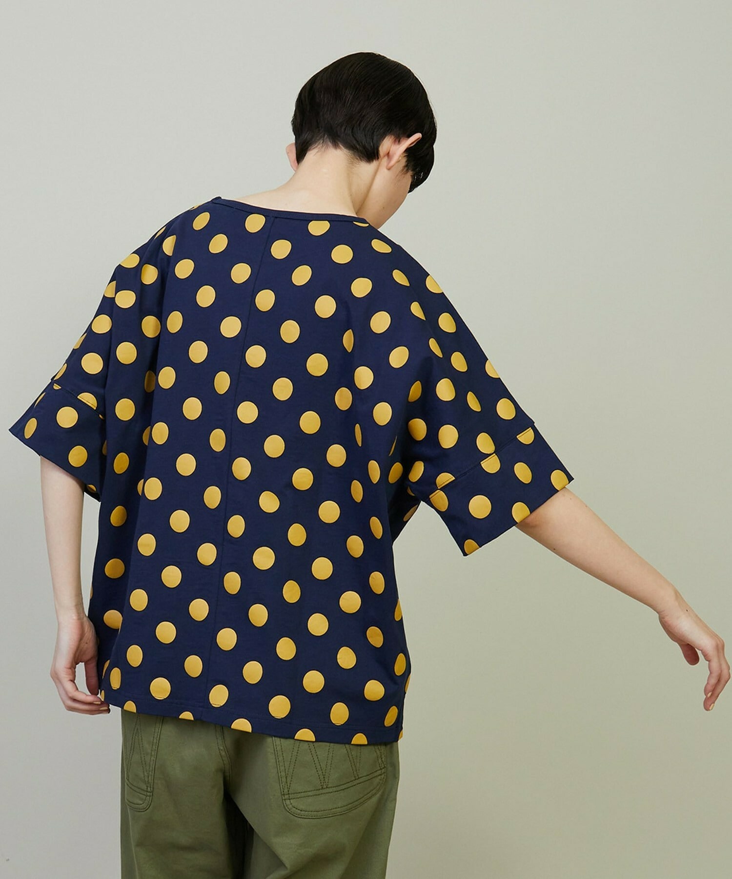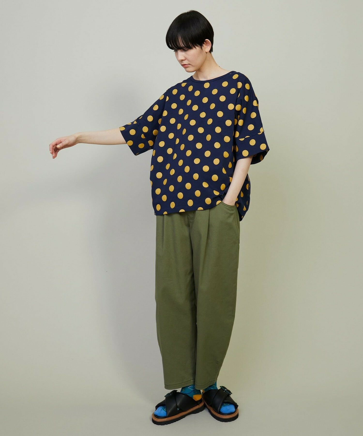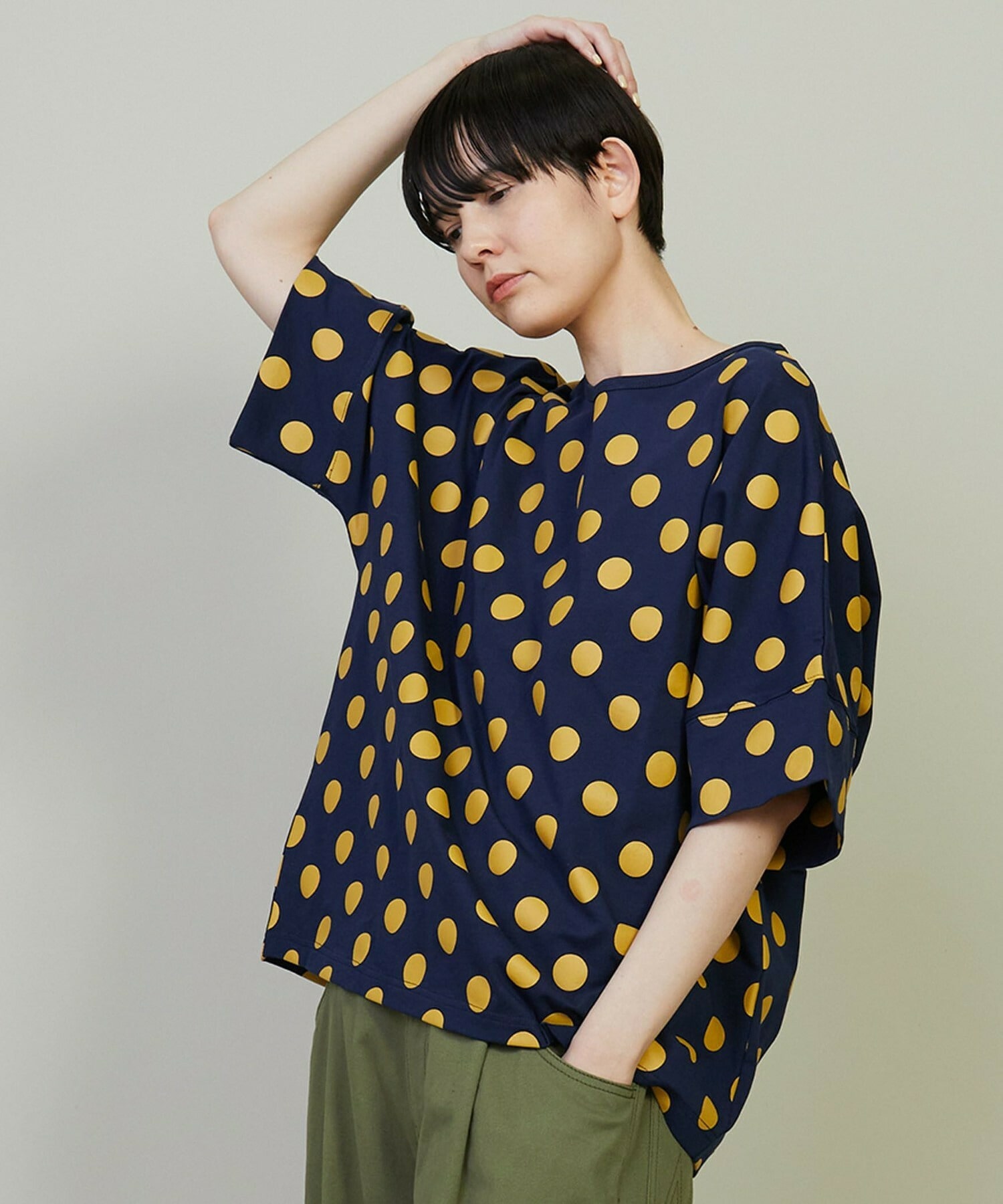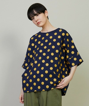 太幅のボーダー生地とオリジナルのドット柄をプリントした天竺素材。
