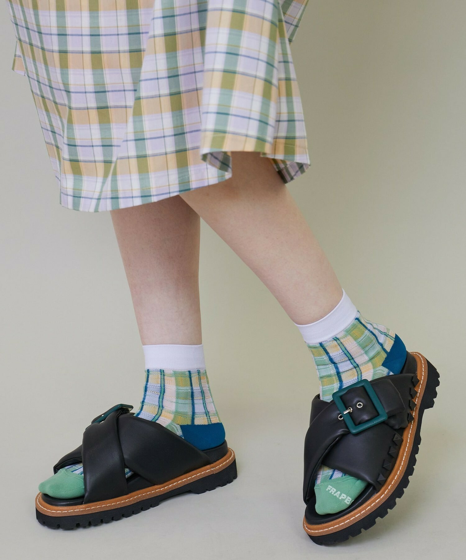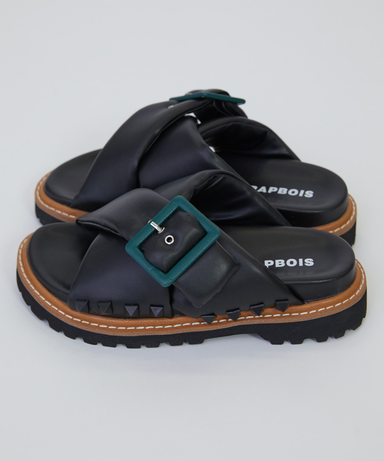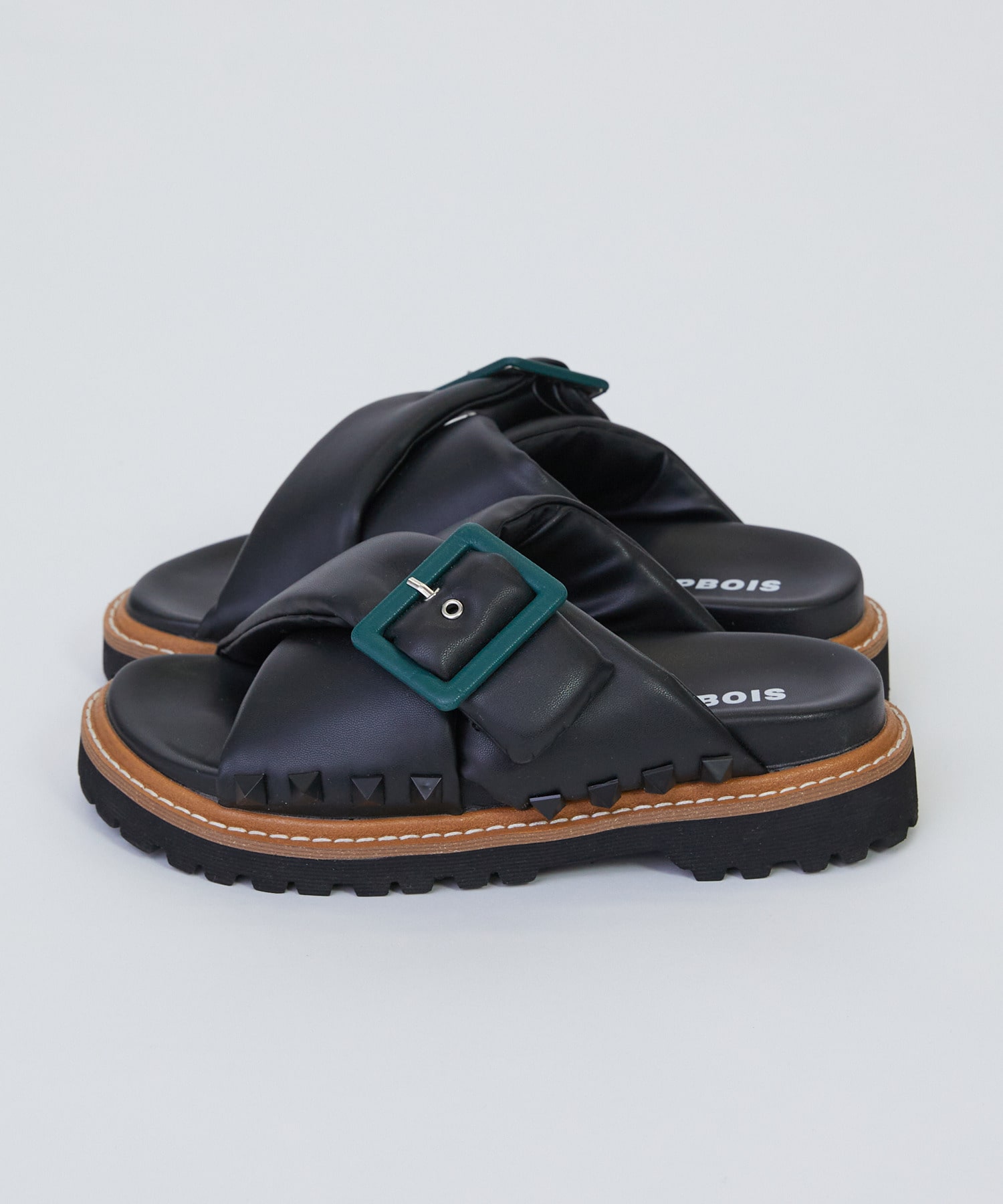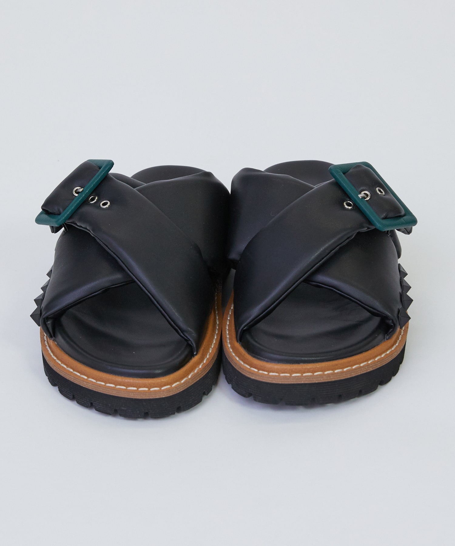 バックルのグリーンやサイドのピラミッドスタッズがシンプルな中にも程よいアクセントをつくっています。